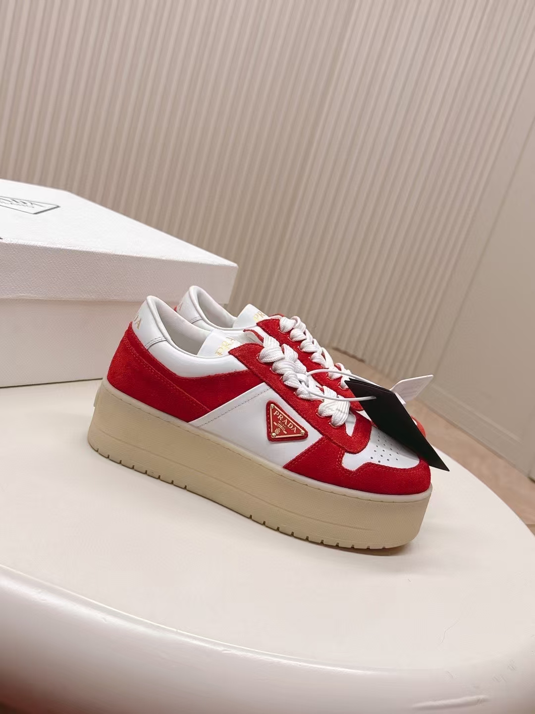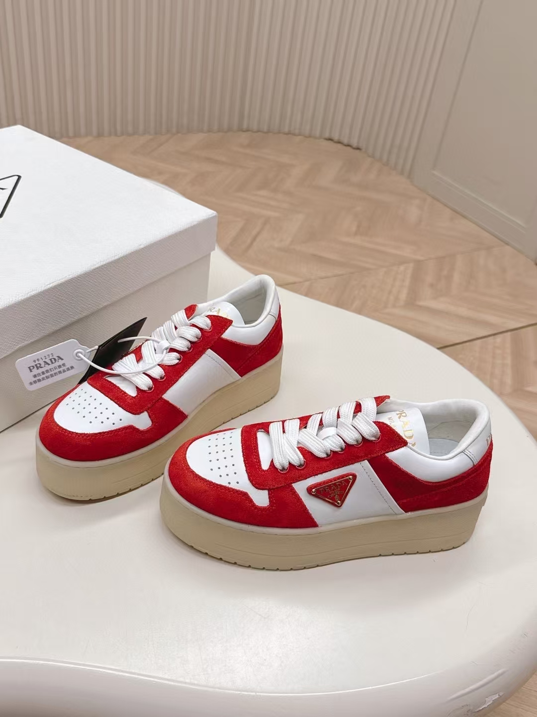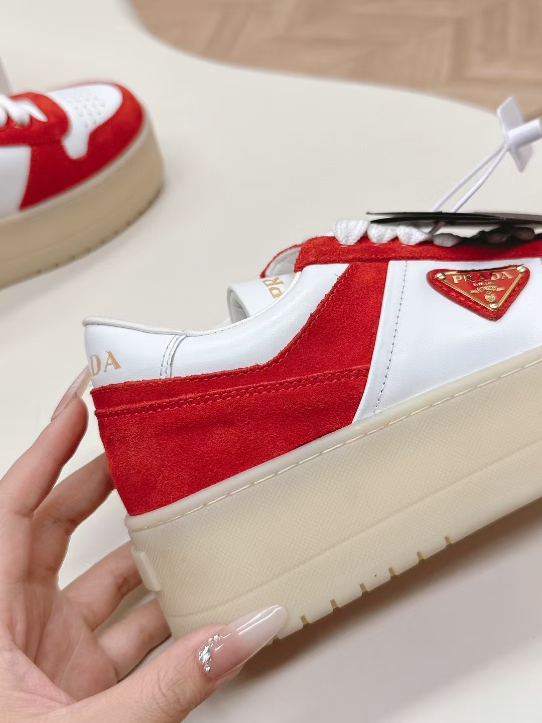 这款鞋子是AAAAA 1:1 质量 (非常棒). 使用了和原版一模一样的材料. 商标部分也保持了和普拉达/Prada一样. 图片拍摄是实物鞋子拍摄, 您所收到的实物保证和我们图片一模一样.