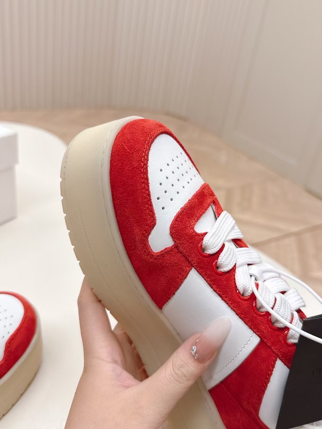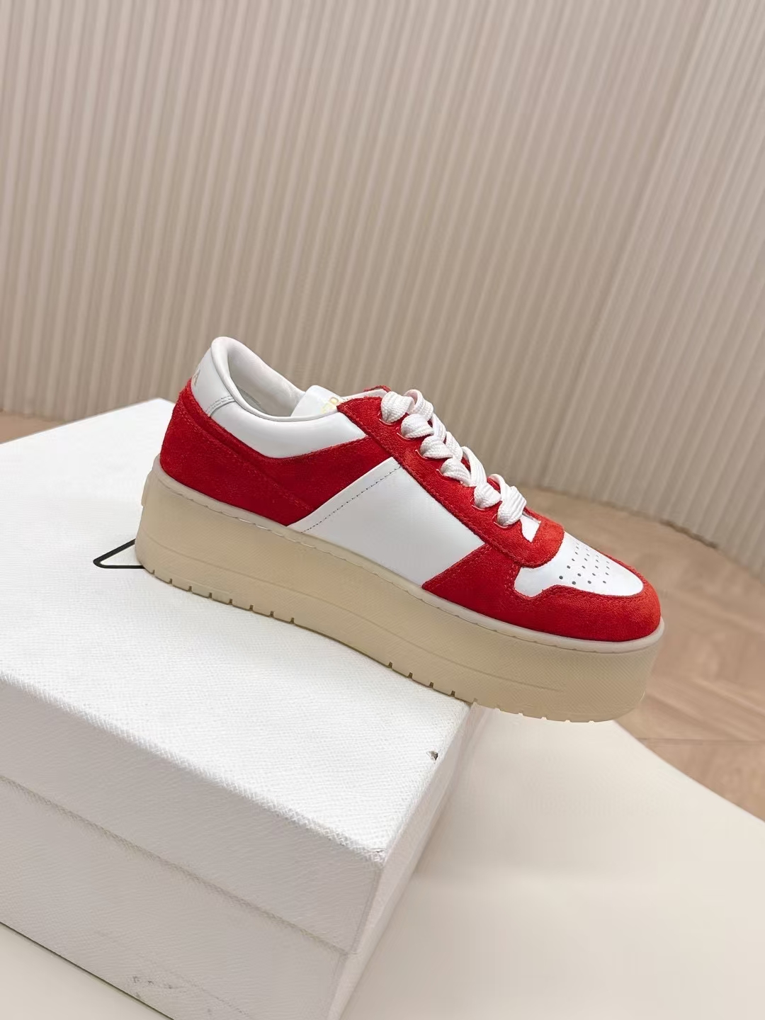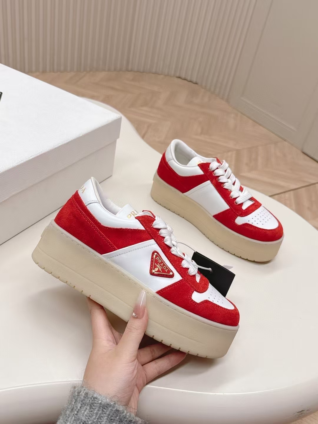 这款鞋子是AAAAA 1:1 质量 (非常棒). 使用了和原版一模一样的材料. 商标部分也保持了和普拉达/Prada一样. 图片拍摄是实物鞋子拍摄, 您所收到的实物保证和我们图片一模一样.