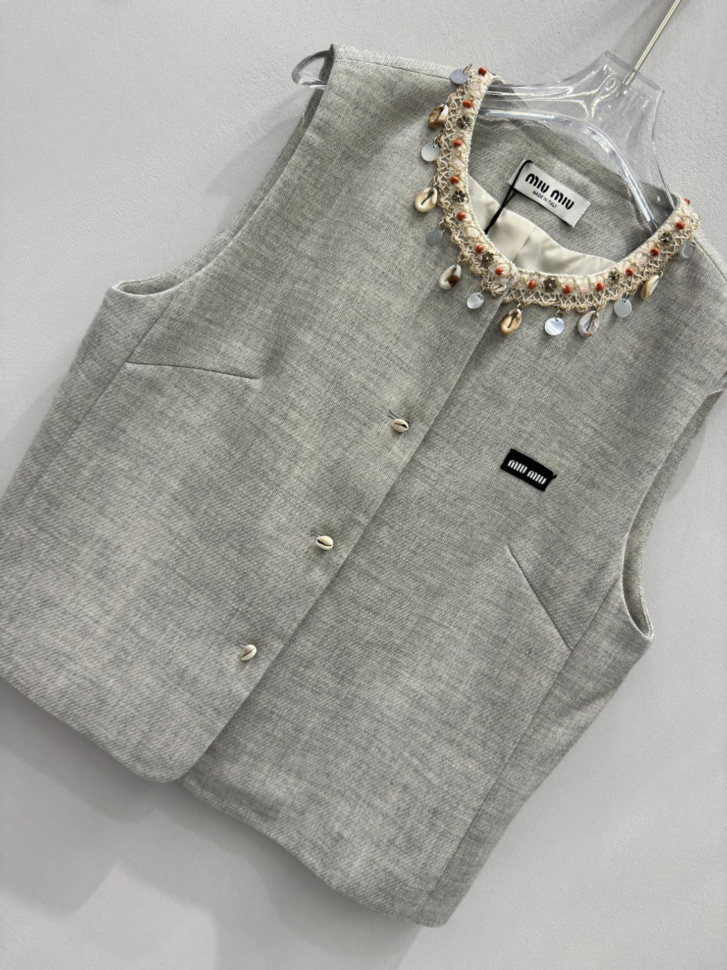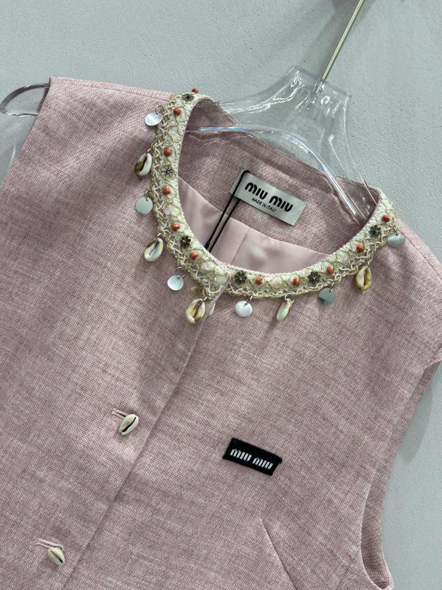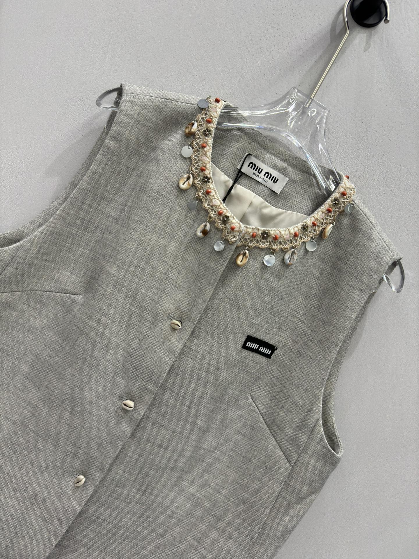 这款衣服是AAAAA 1:1 质量 (非常棒). 使用了和原版一模一样的材料. 商标部分也保持了和缪缪/Miu Miu一样. 图片拍摄是实物衣服拍摄, 您所收到的实物保证和我们图片一模一样.