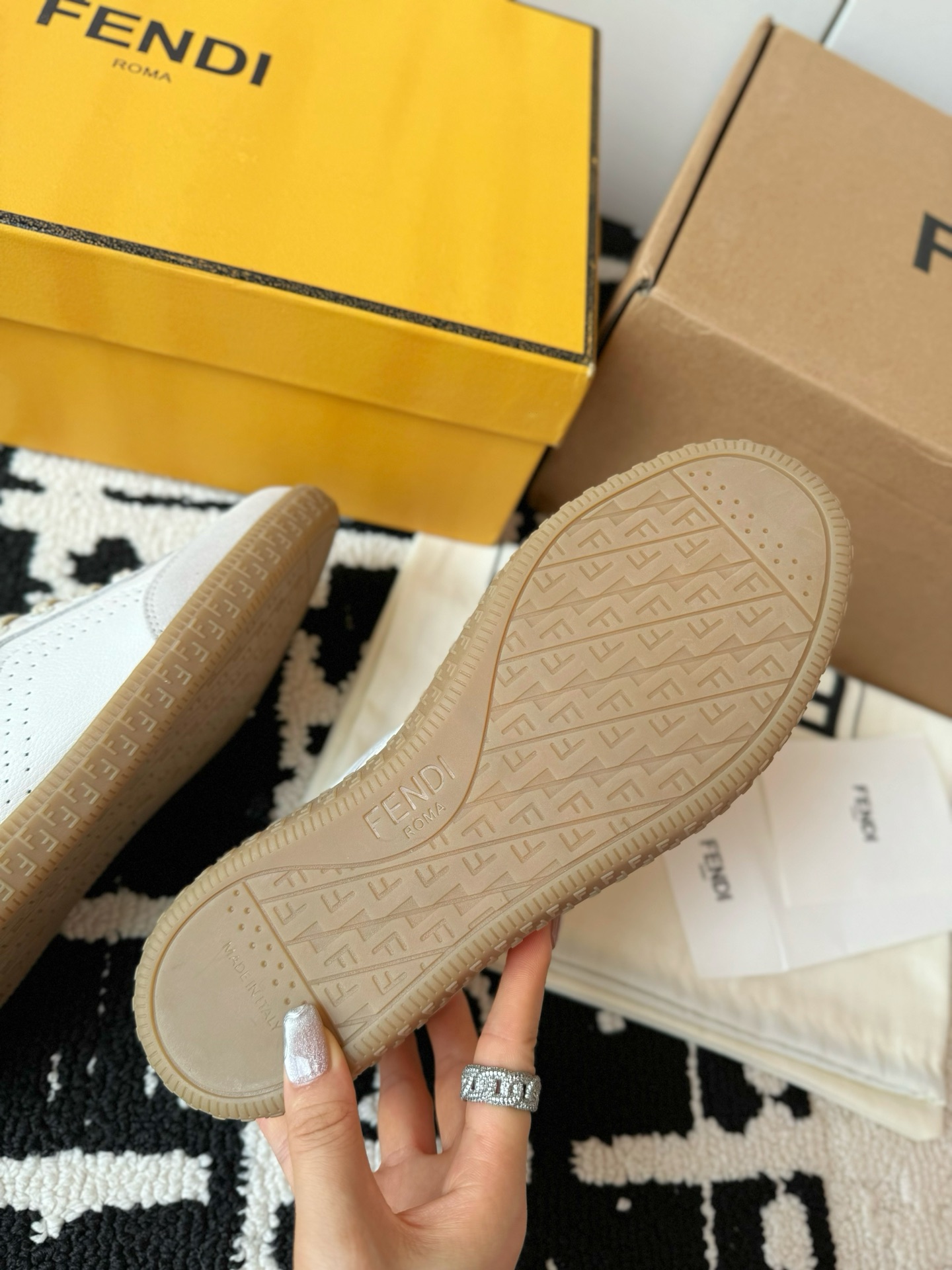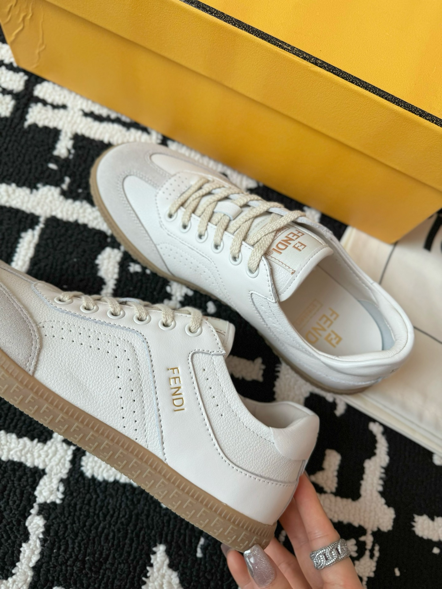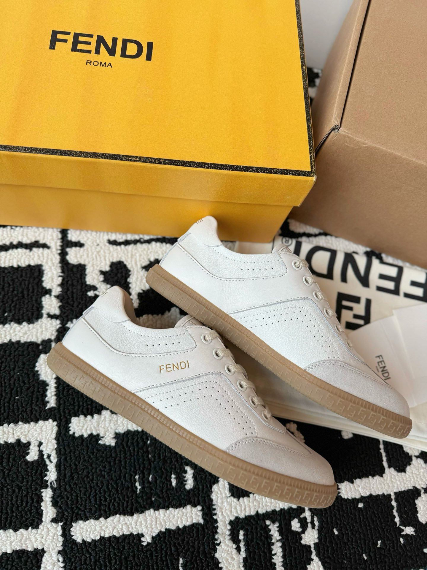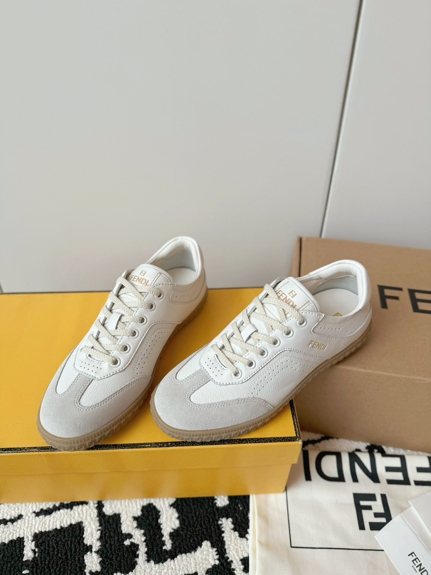 这款鞋子是AAAAA 1:1 质量 (非常棒). 使用了和原版一模一样的材料. 商标部分也保持了和芬迪/Fendi一样. 图片拍摄是实物鞋子拍摄, 您所收到的实物保证和我们图片一模一样.