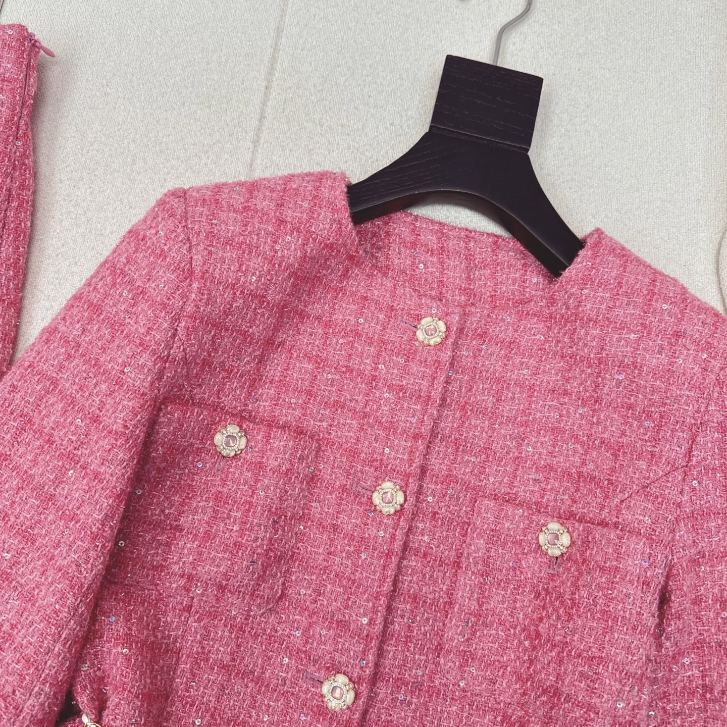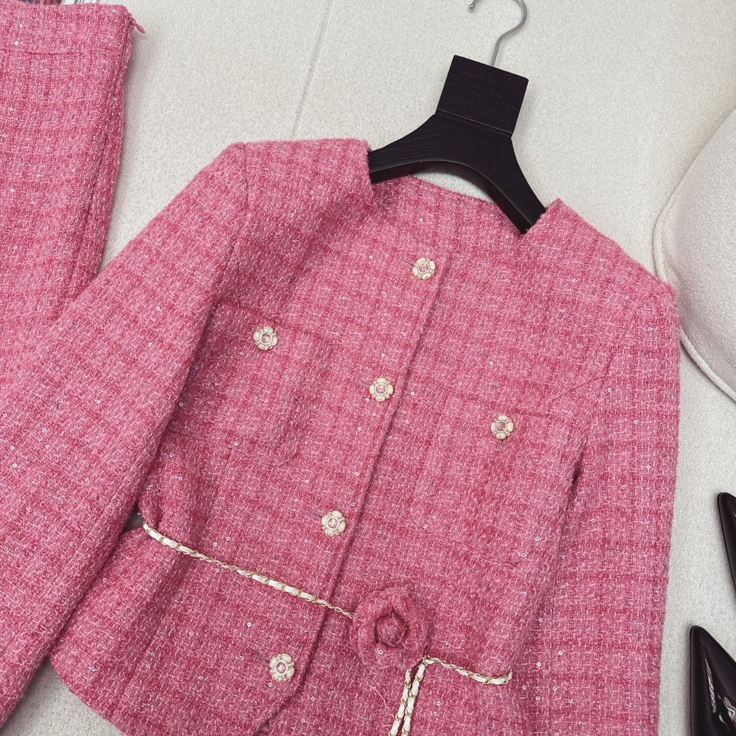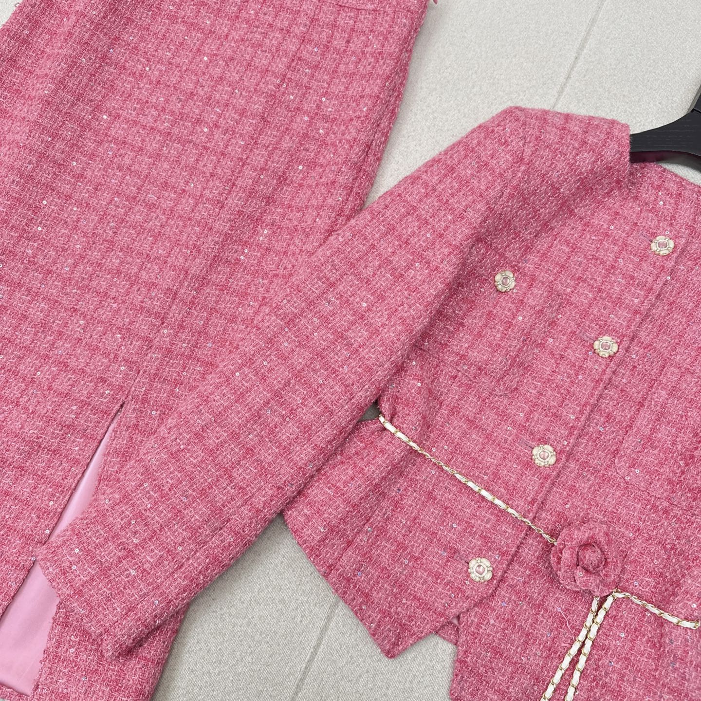 这款衣服是AAAAA 1:1 质量 (非常棒). 使用了和原版一模一样的材料. 商标部分也保持了和香奈儿/Chanel一样. 图片拍摄是实物衣服拍摄, 您所收到的实物保证和我们图片一模一样.