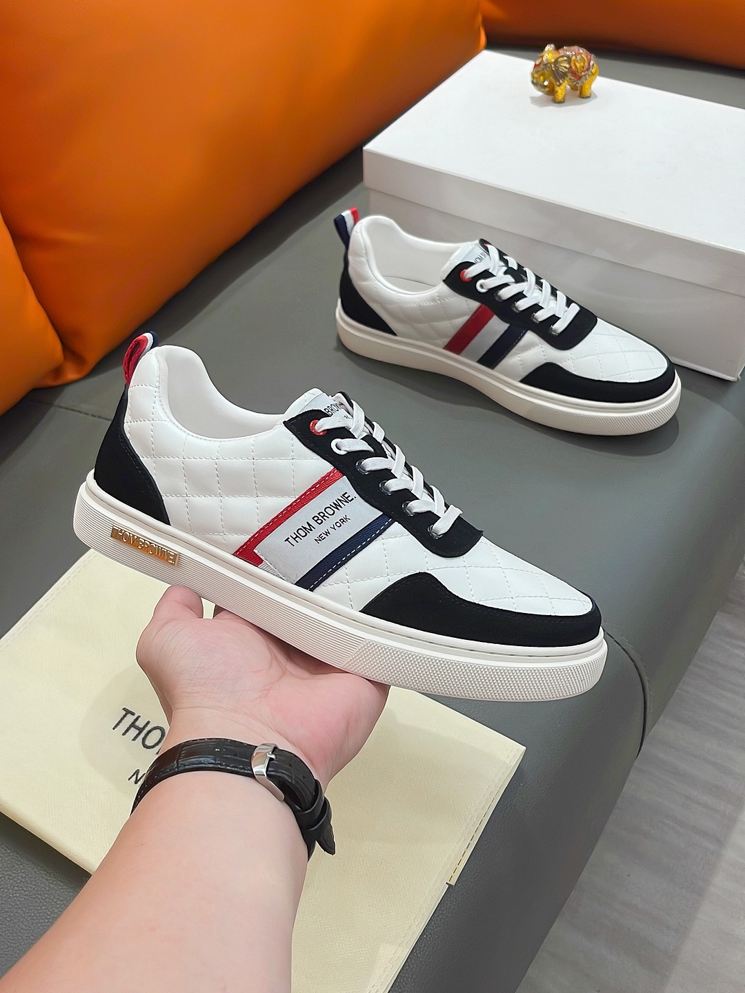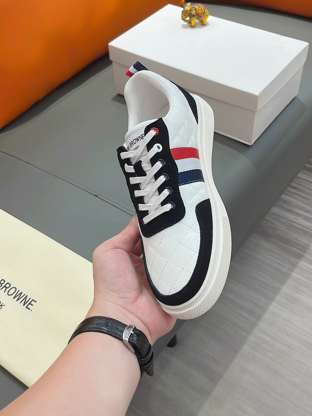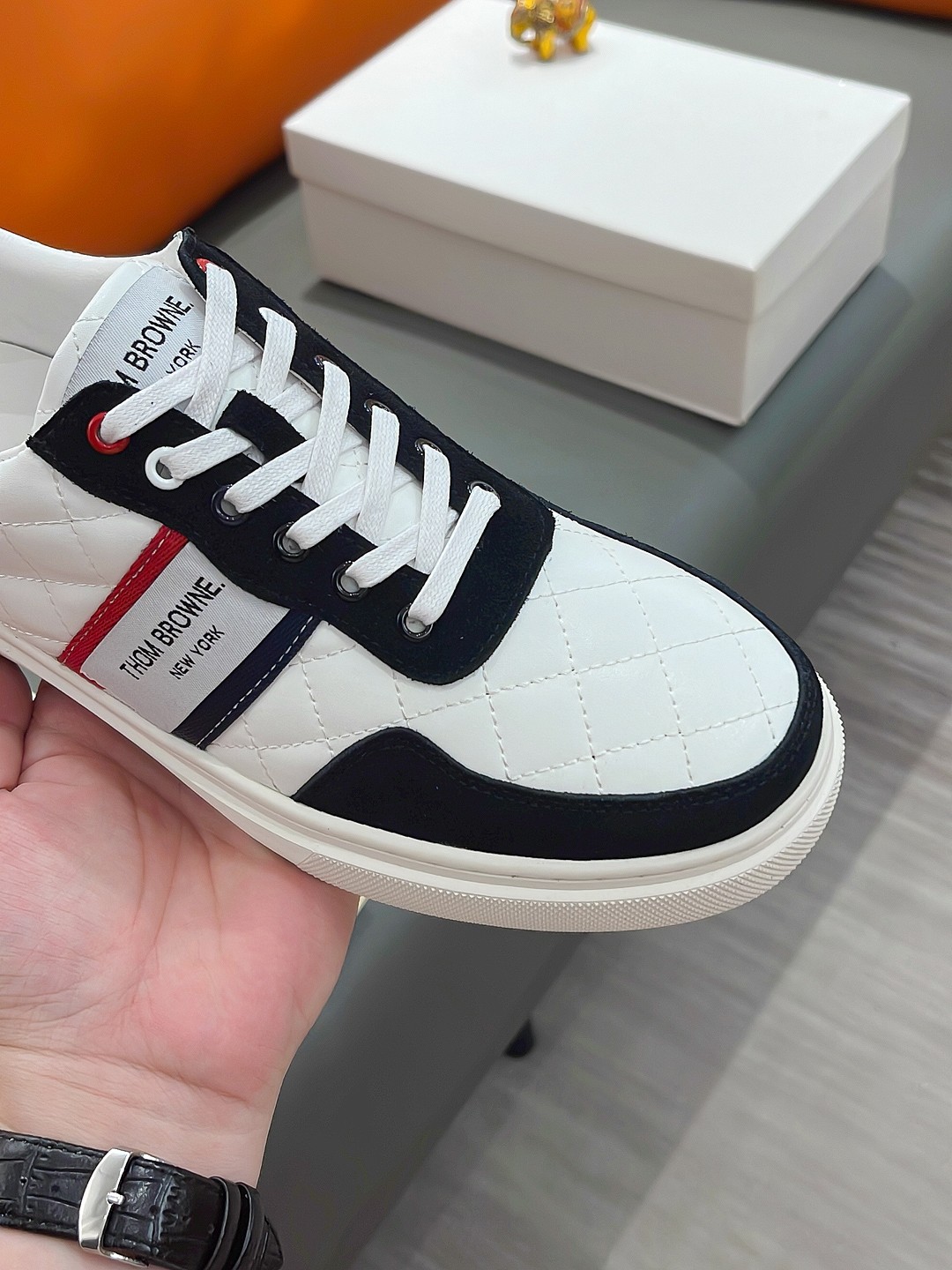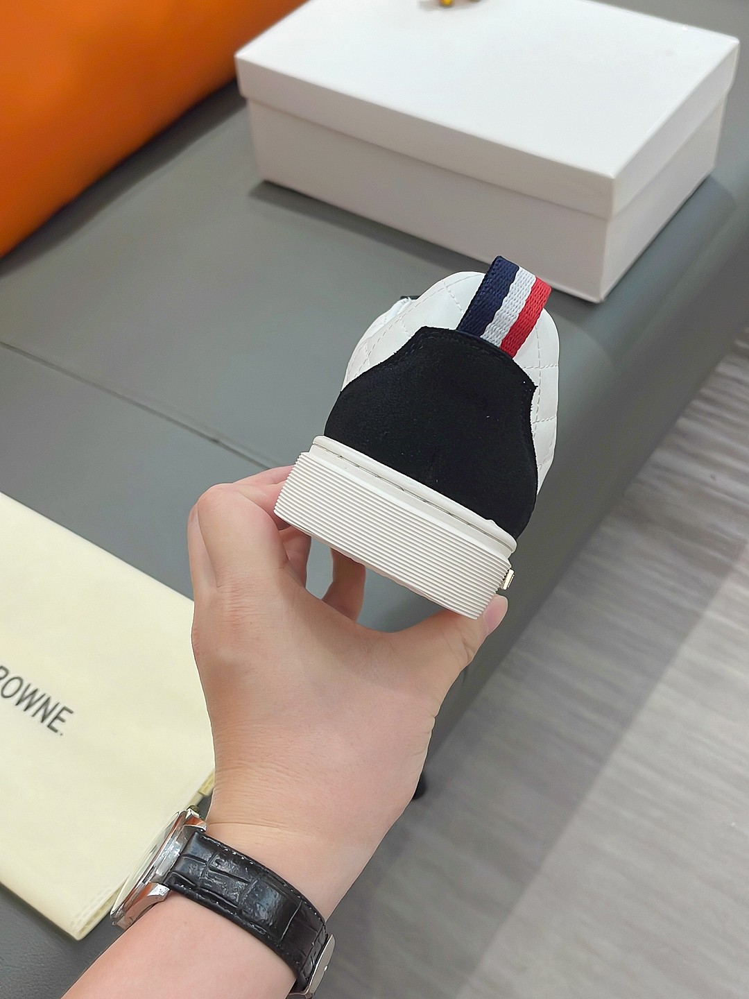 这款鞋子是AAAAA 1:1 质量 (非常棒). 使用了和原版一模一样的材料. 商标部分也保持了和汤姆布朗/Thom Browne一样. 图片拍摄是实物鞋子拍摄, 您所收到的实物保证和我们图片一模一样.