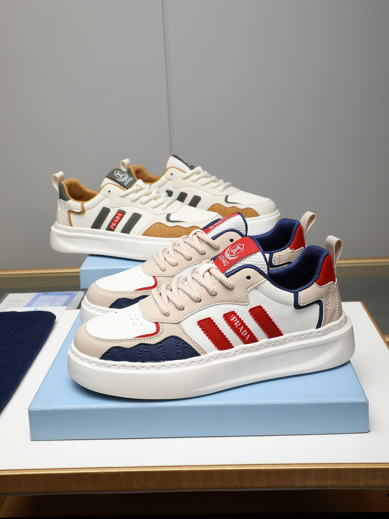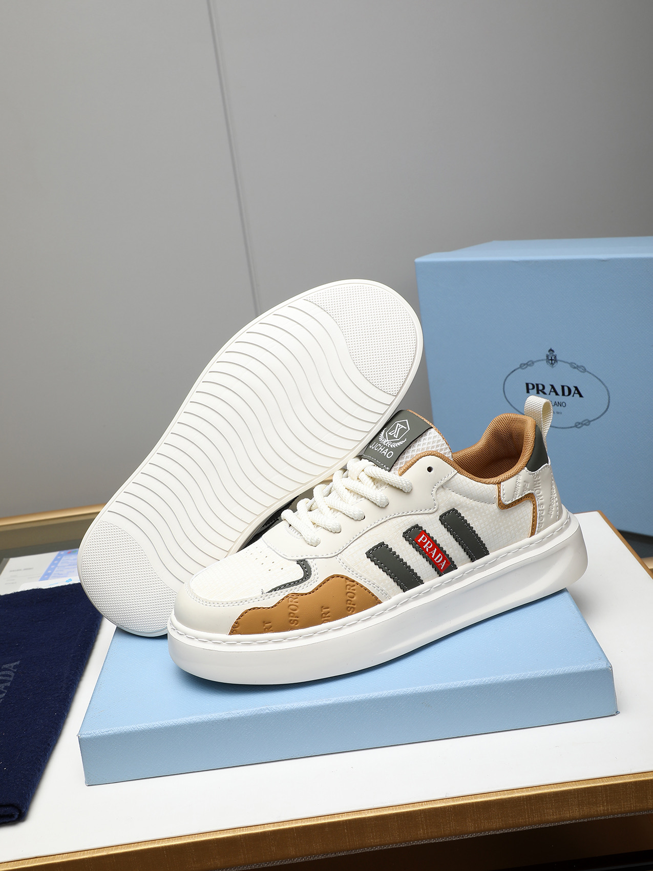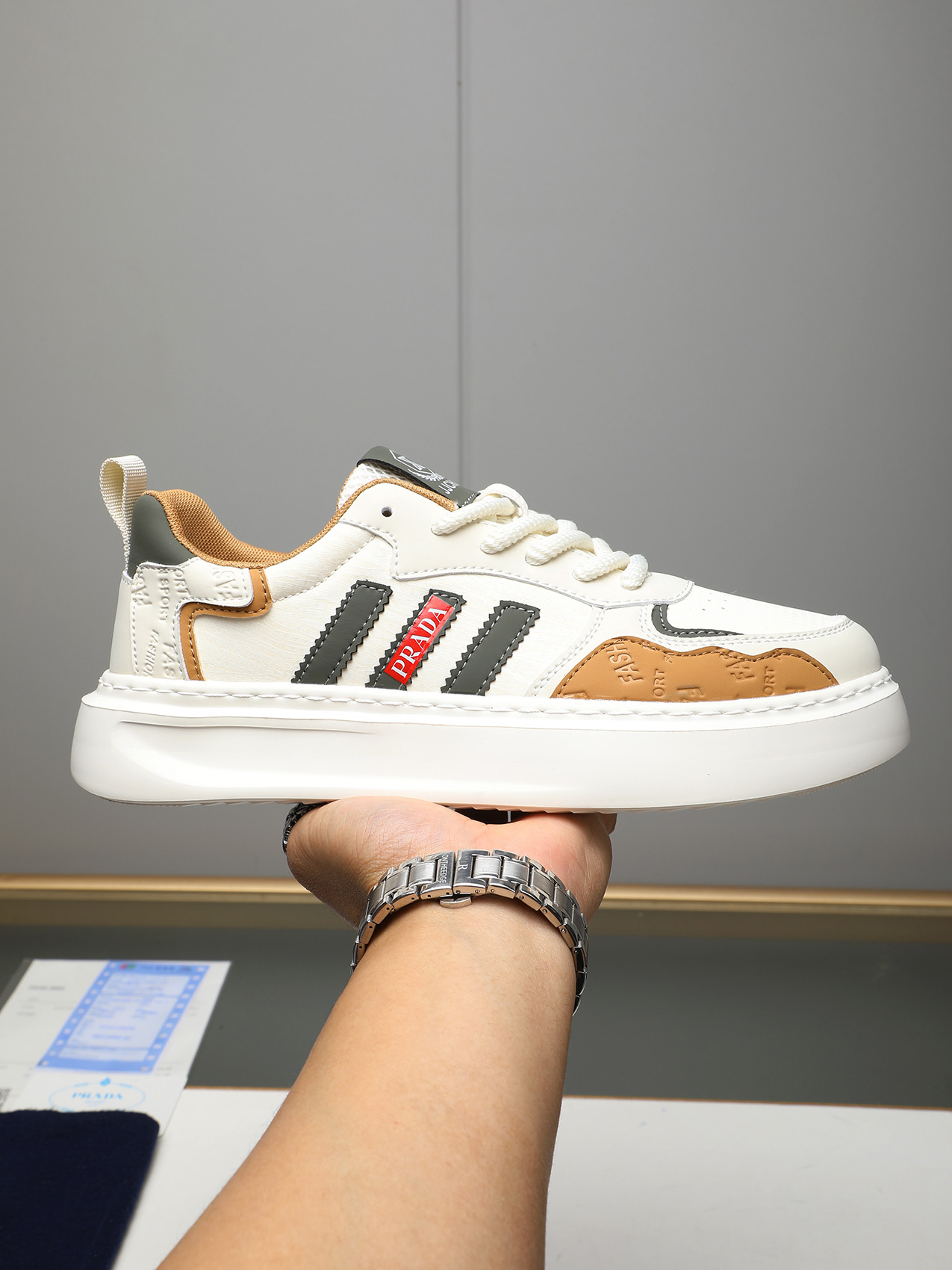 这款鞋子是AAAAA 1:1 质量 (非常棒). 使用了和原版一模一样的材料. 商标部分也保持了和普拉达/Prada一样. 图片拍摄是实物鞋子拍摄, 您所收到的实物保证和我们图片一模一样.