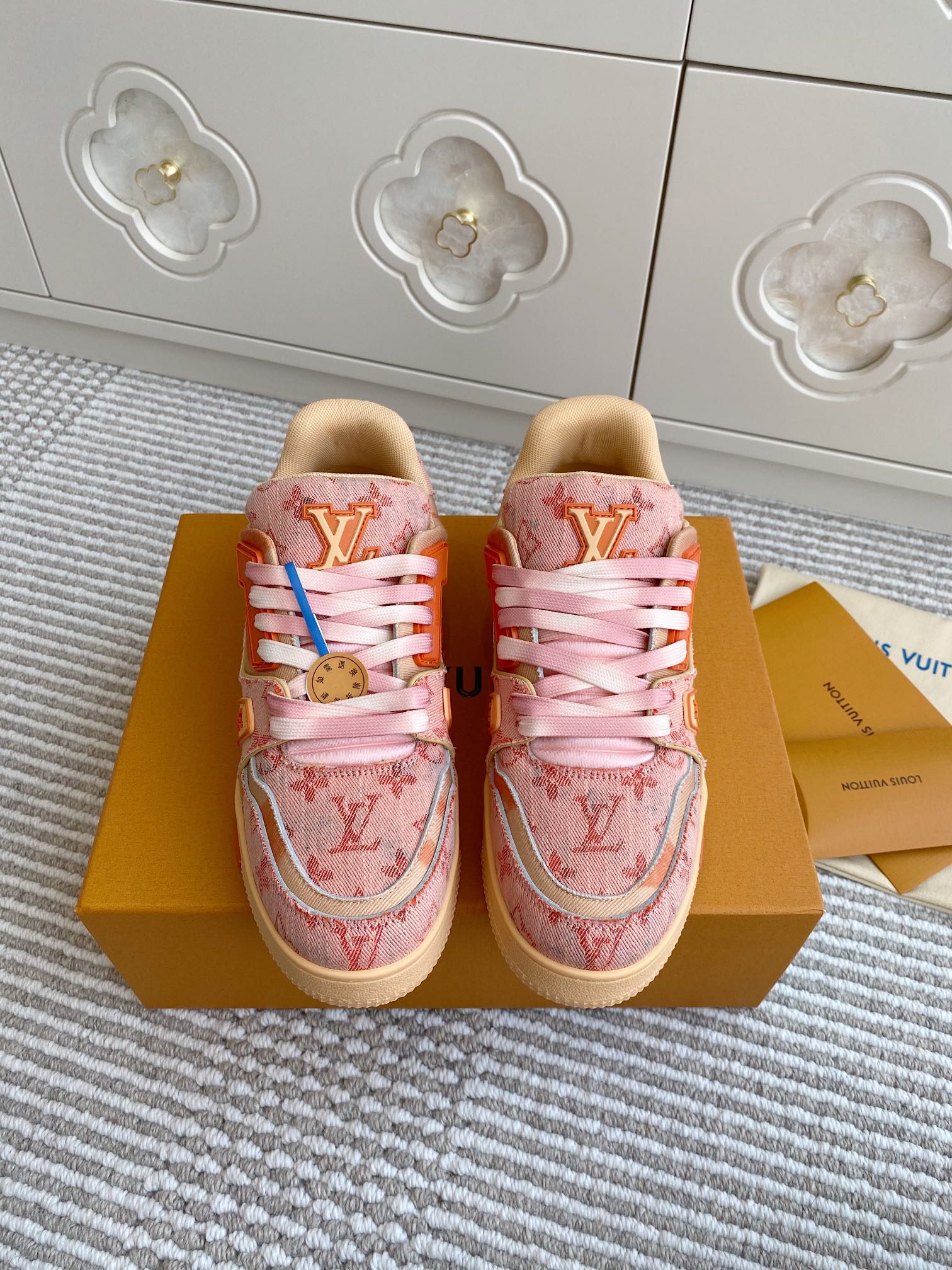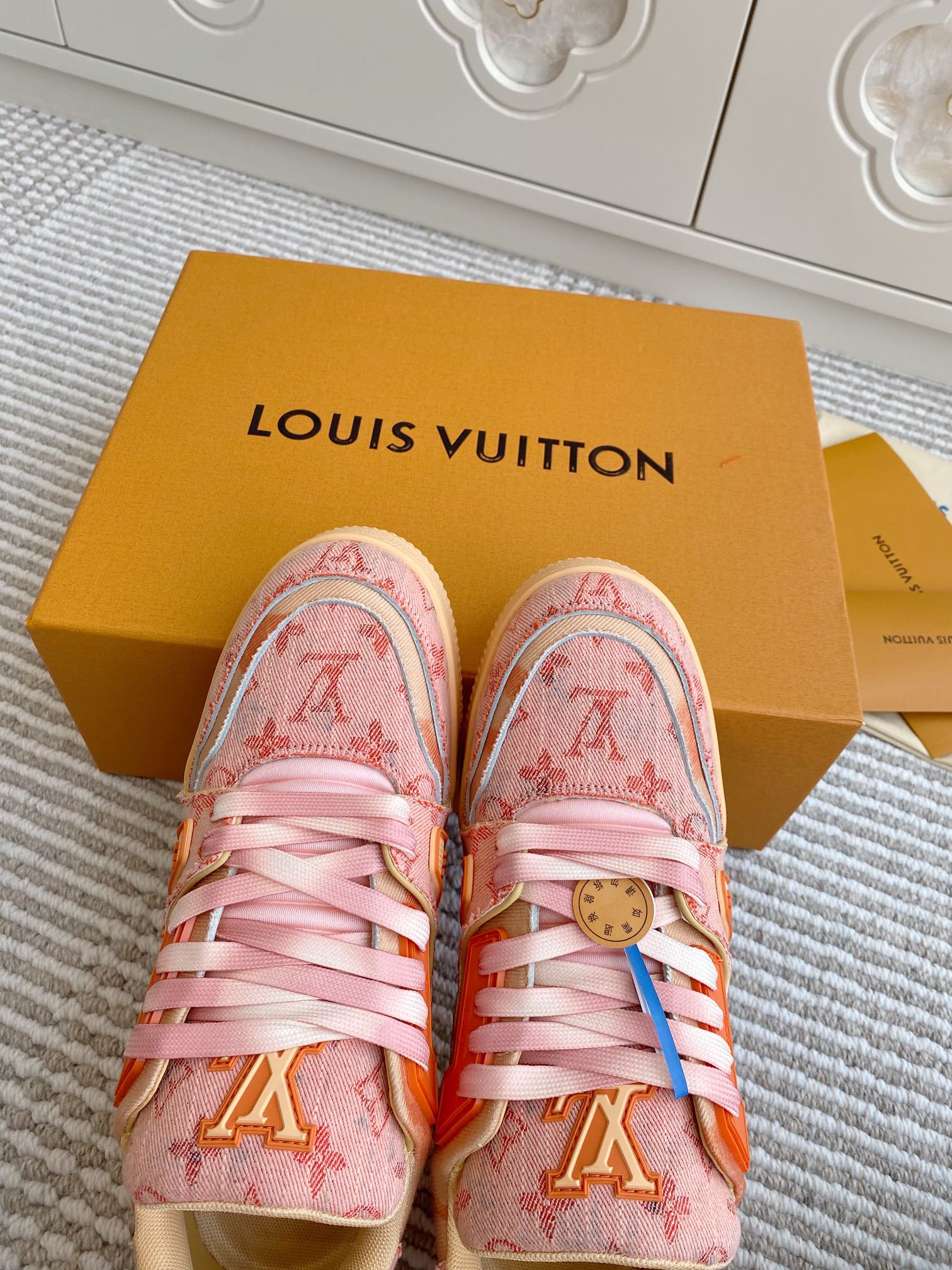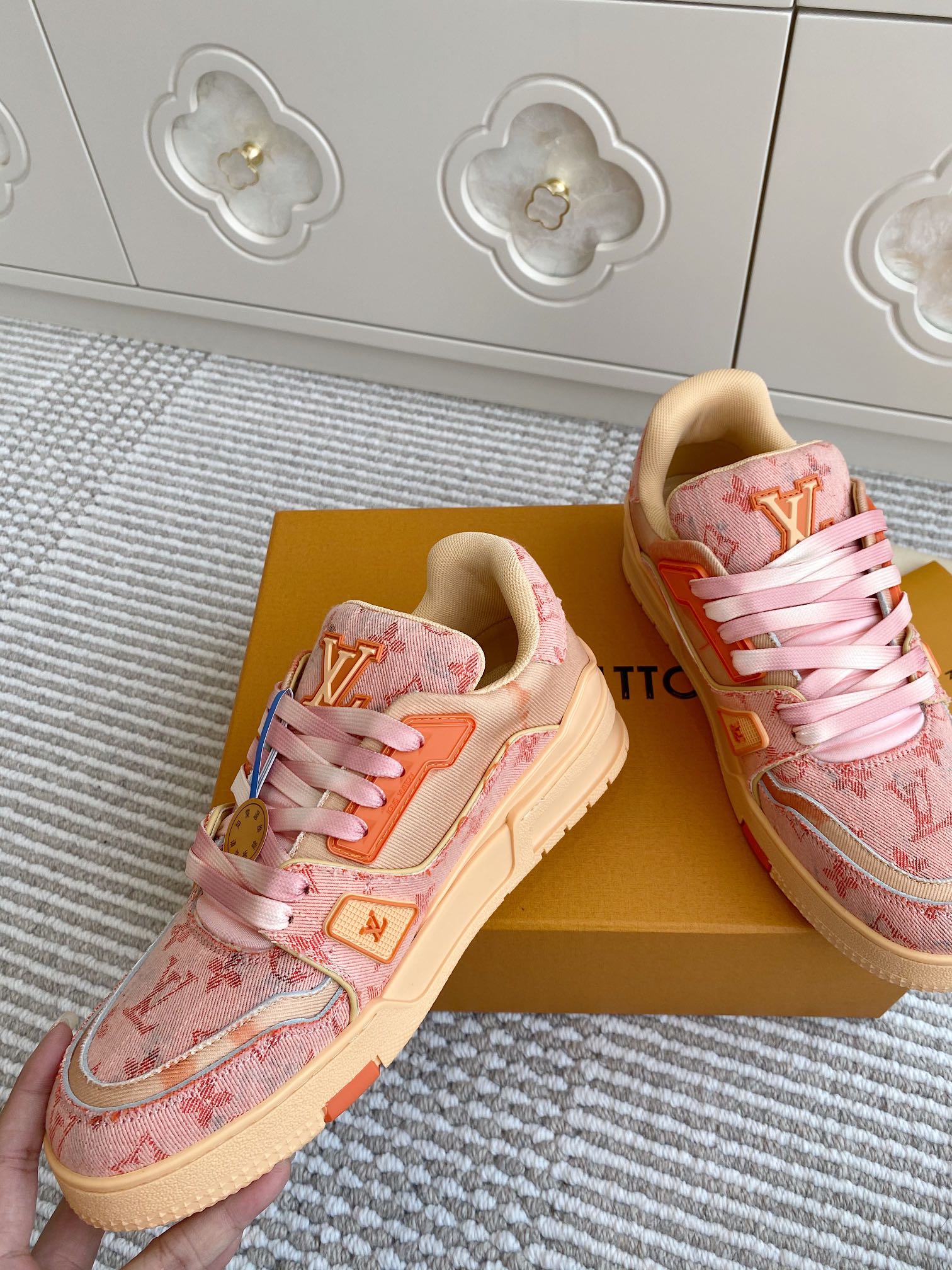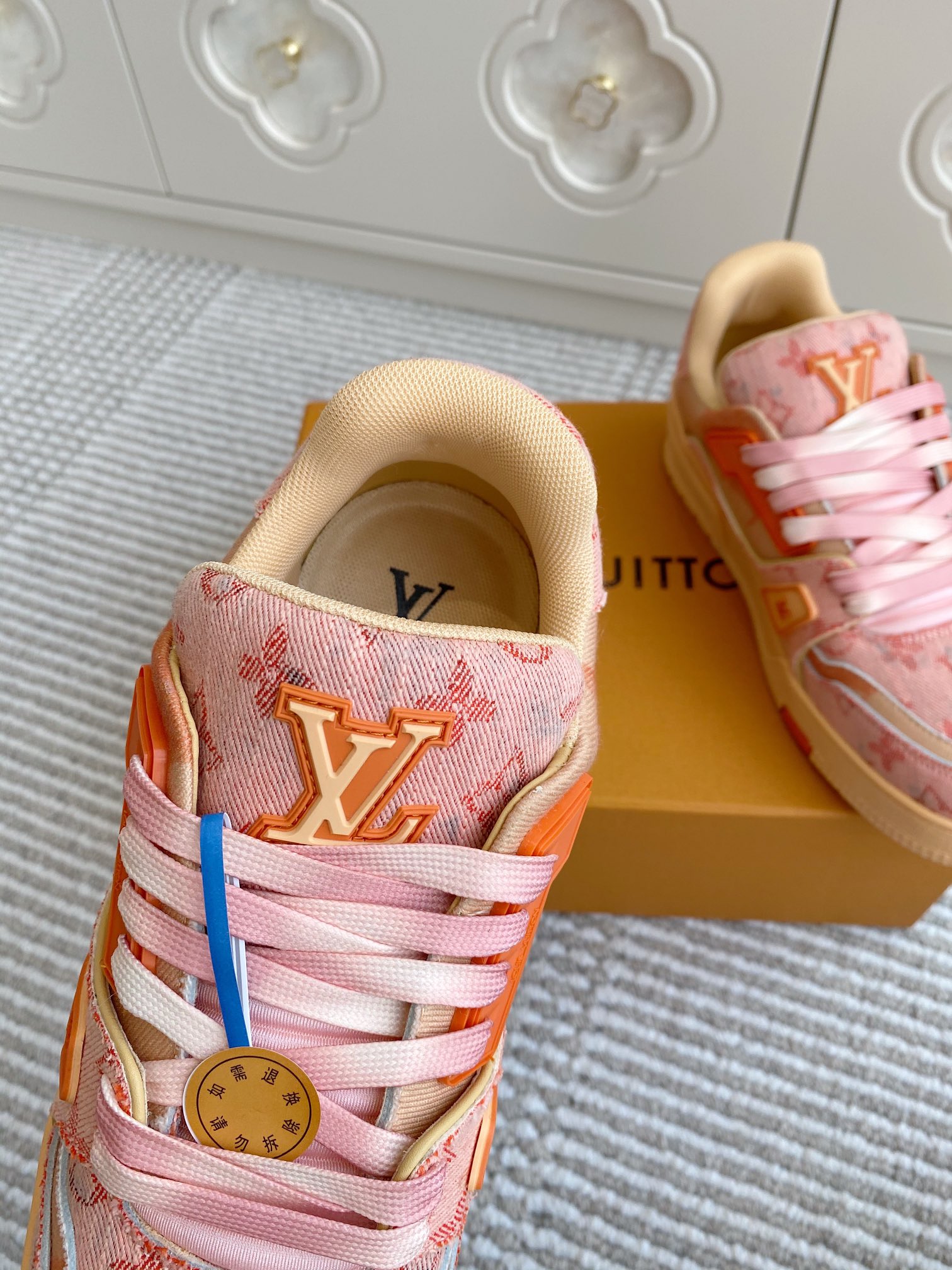 这款鞋子是AAAAA 1:1 质量 (非常棒). 使用了和原版一模一样的材料. 商标部分也保持了和路易威登/Louis Vuitton一样. 图片拍摄是实物鞋子拍摄, 您所收到的实物保证和我们图片一模一样.