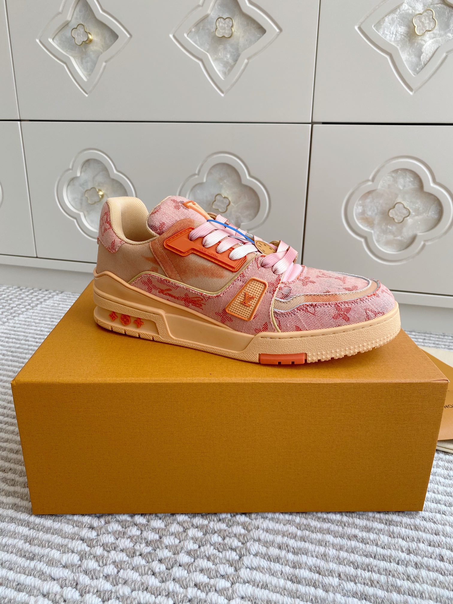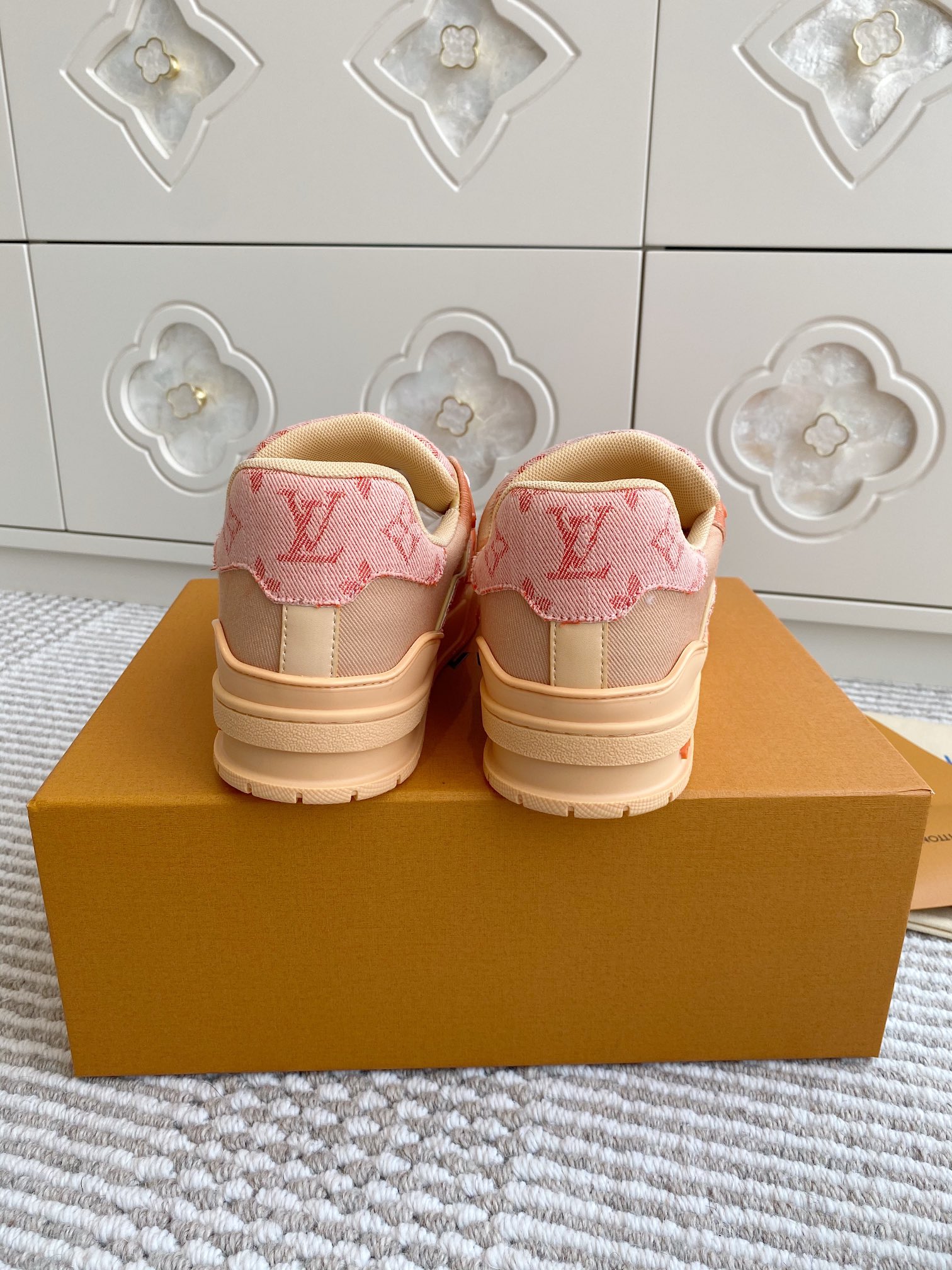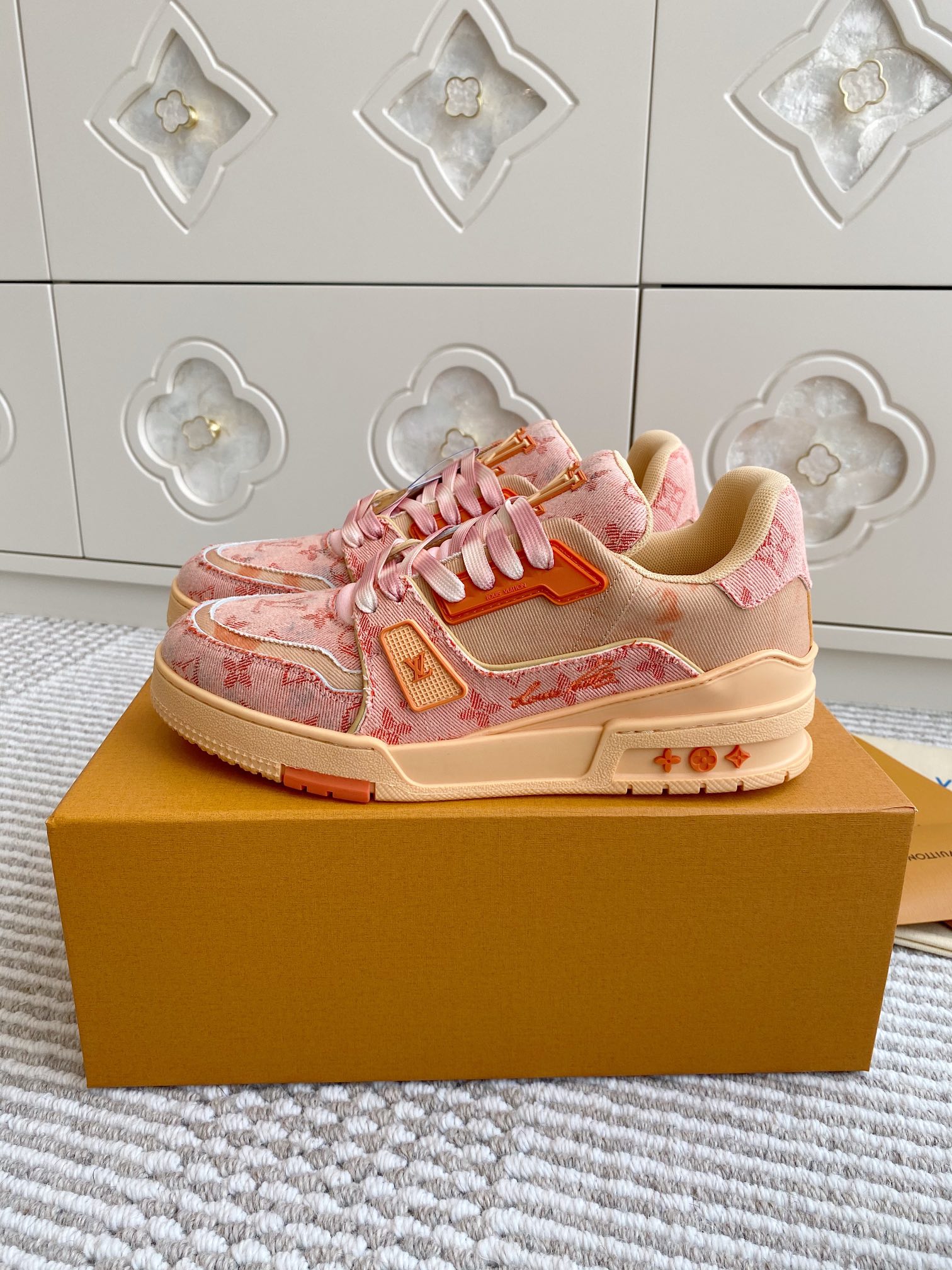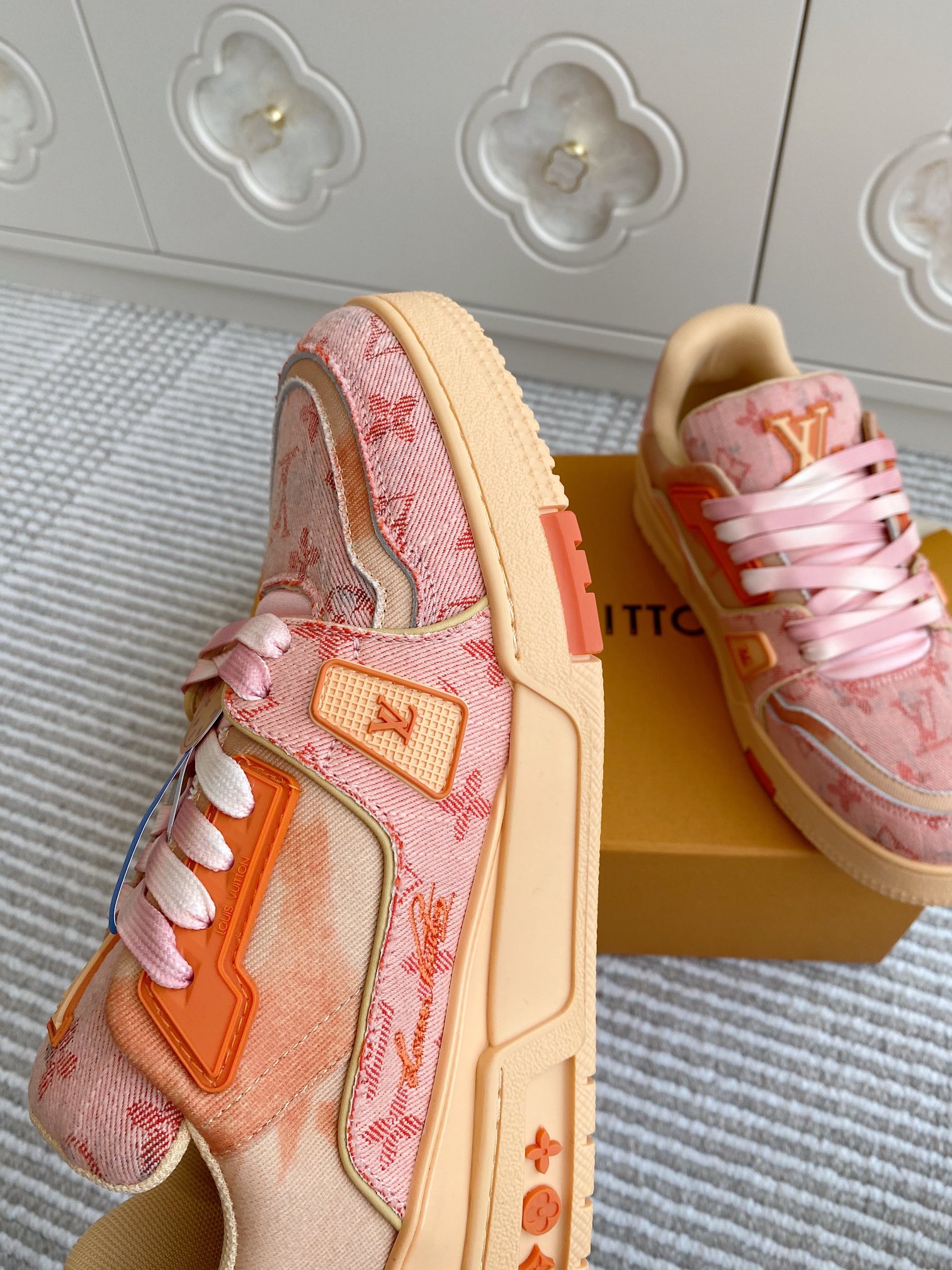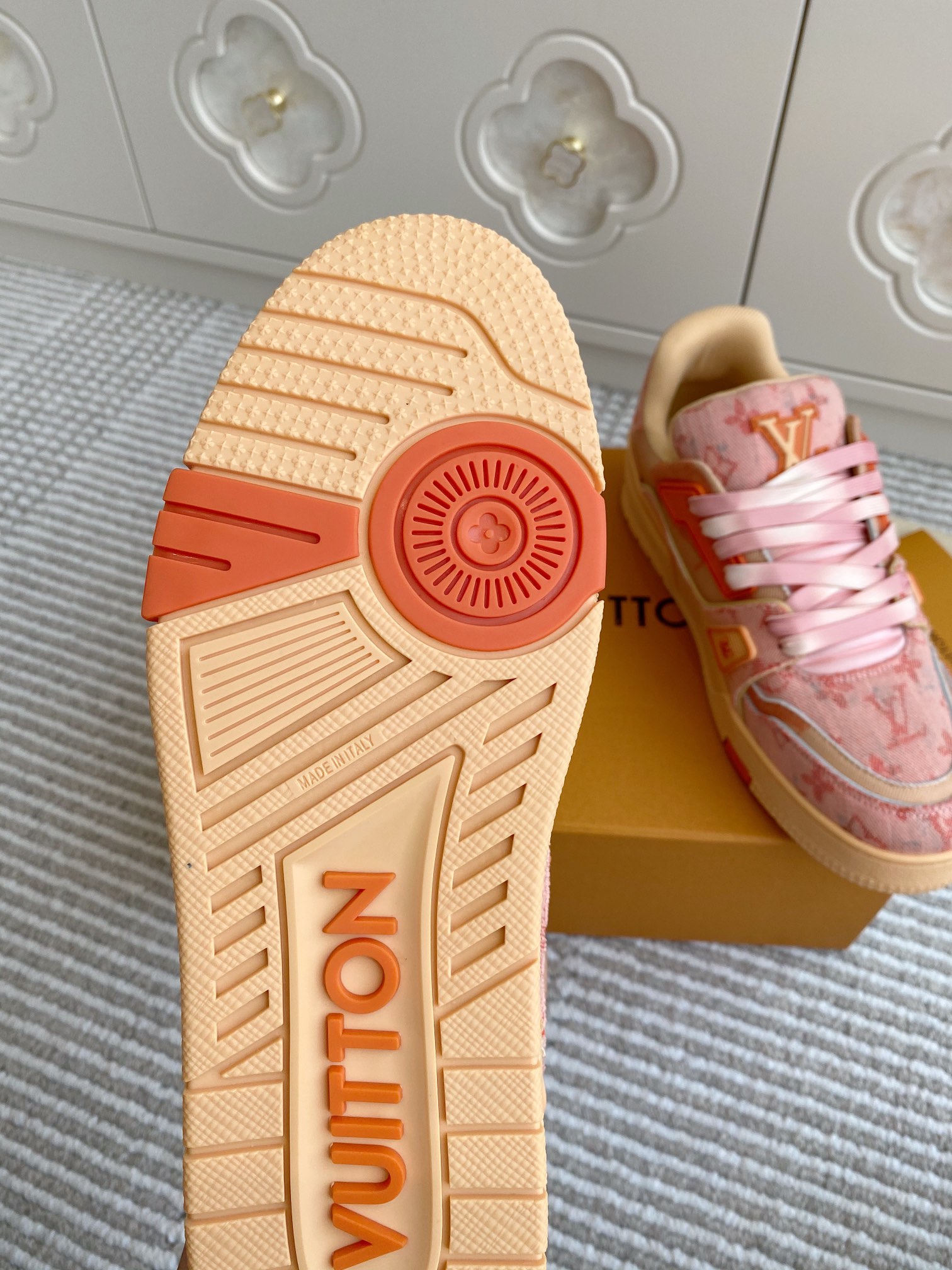 这款鞋子是AAAAA 1:1 质量 (非常棒). 使用了和原版一模一样的材料. 商标部分也保持了和路易威登/Louis Vuitton一样. 图片拍摄是实物鞋子拍摄, 您所收到的实物保证和我们图片一模一样.