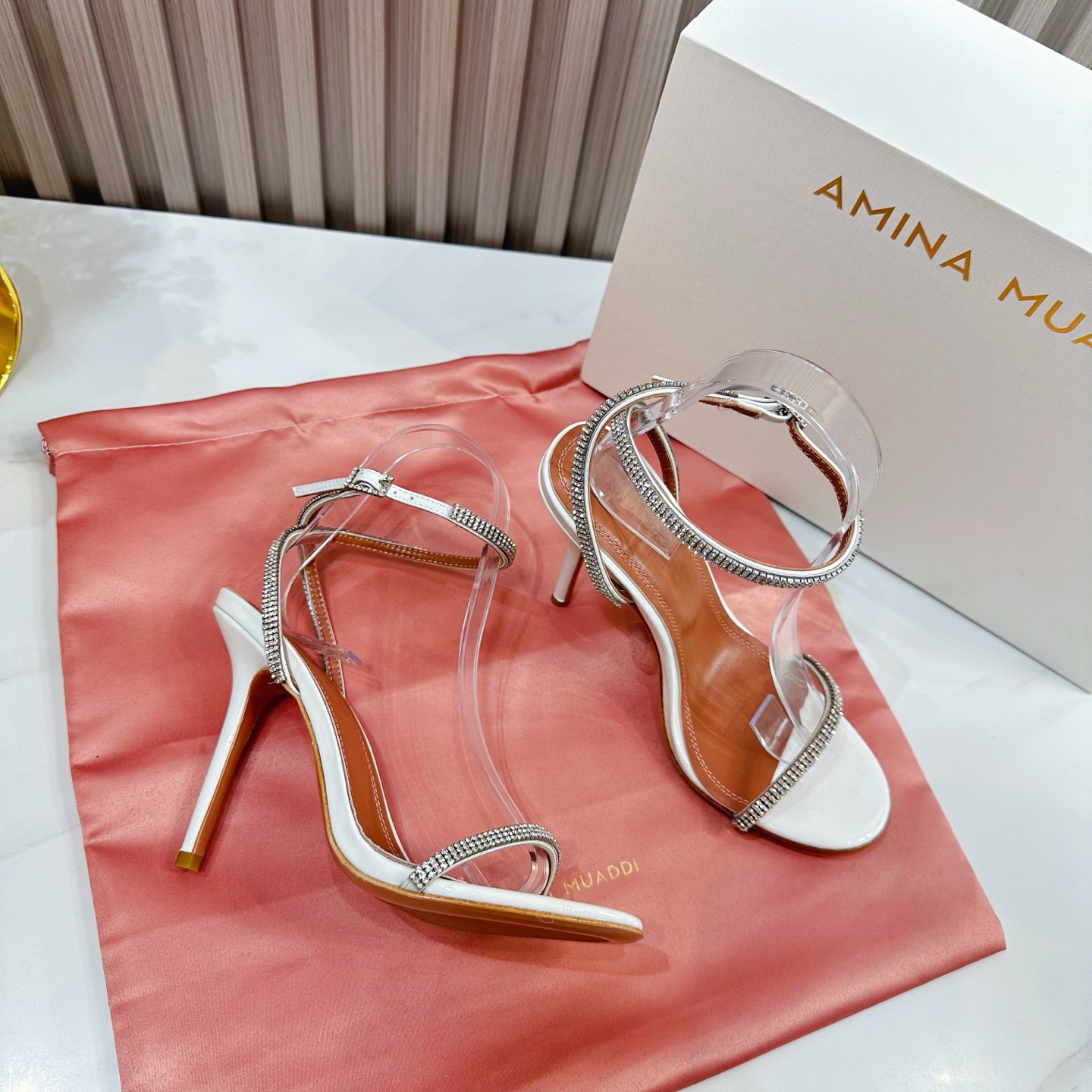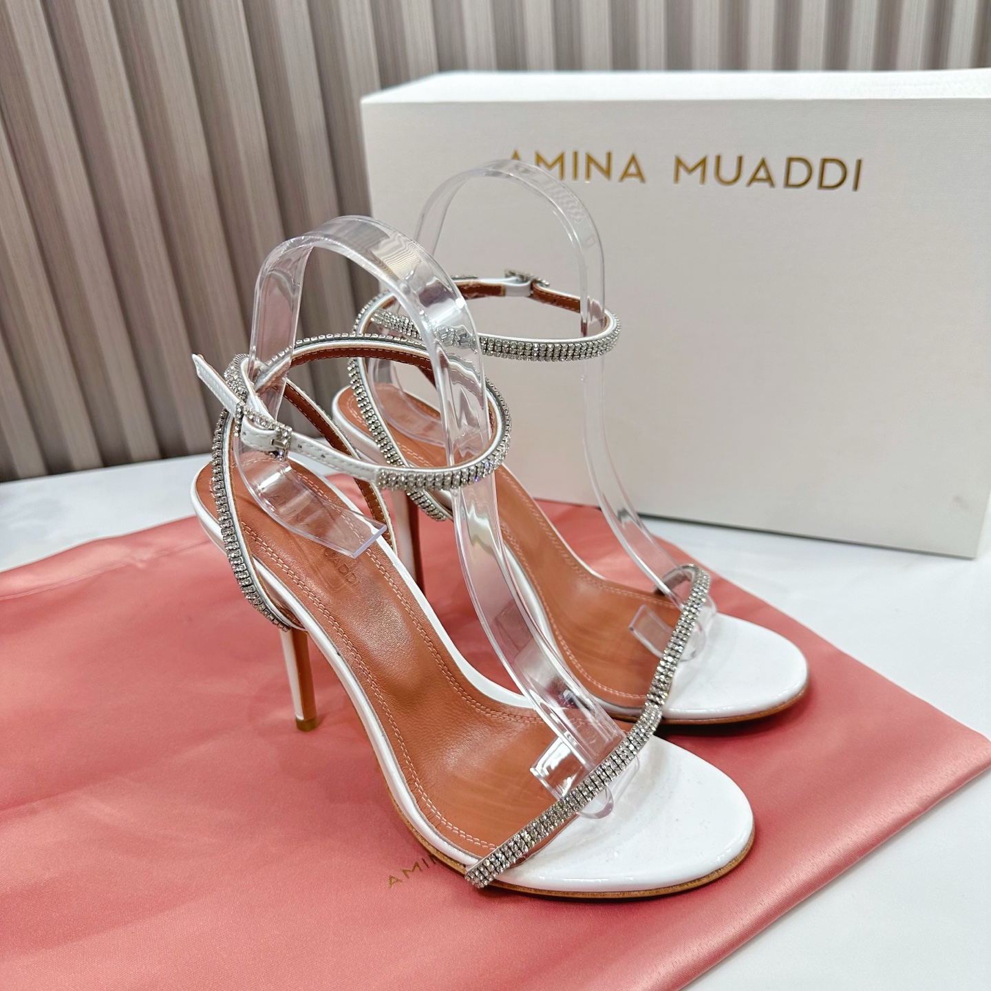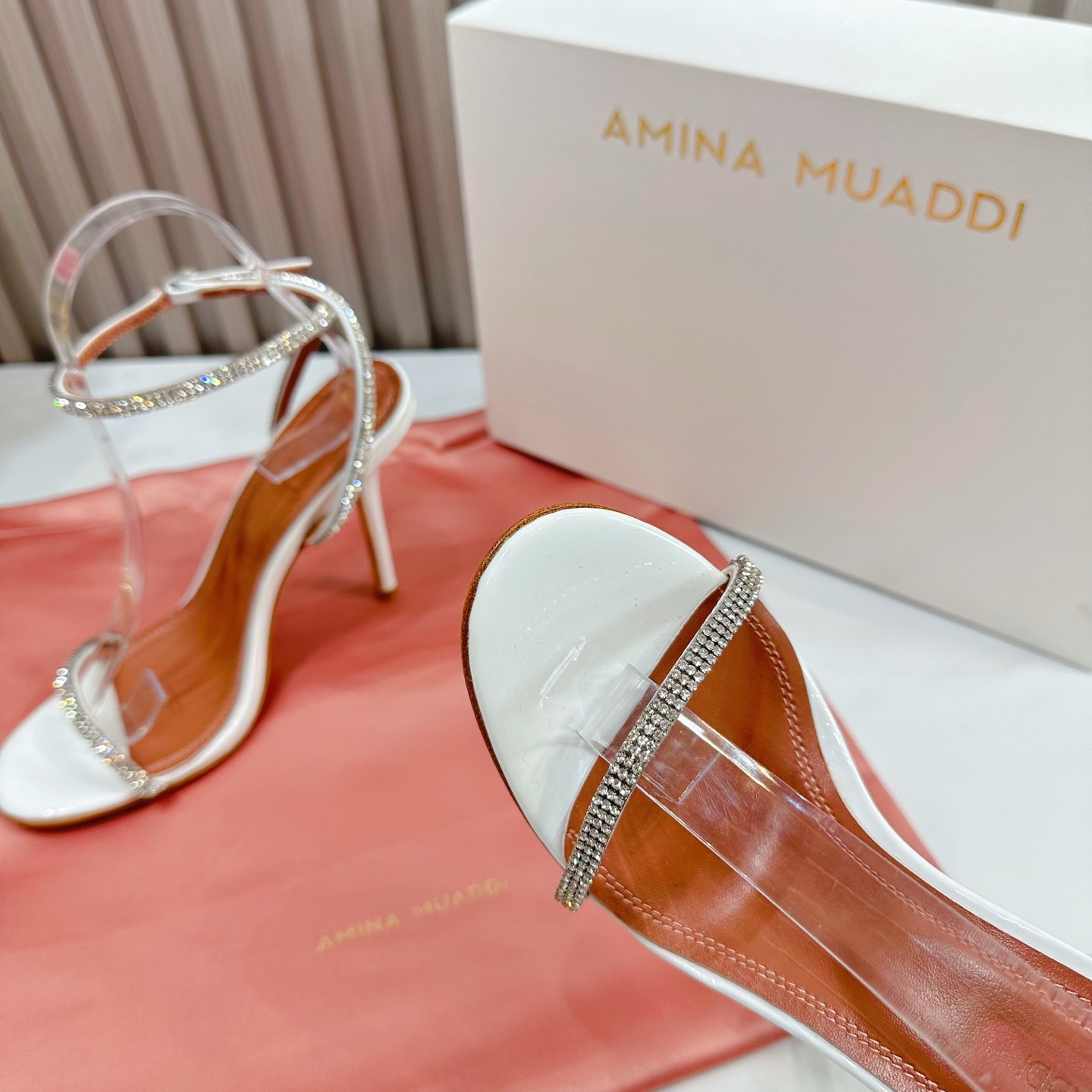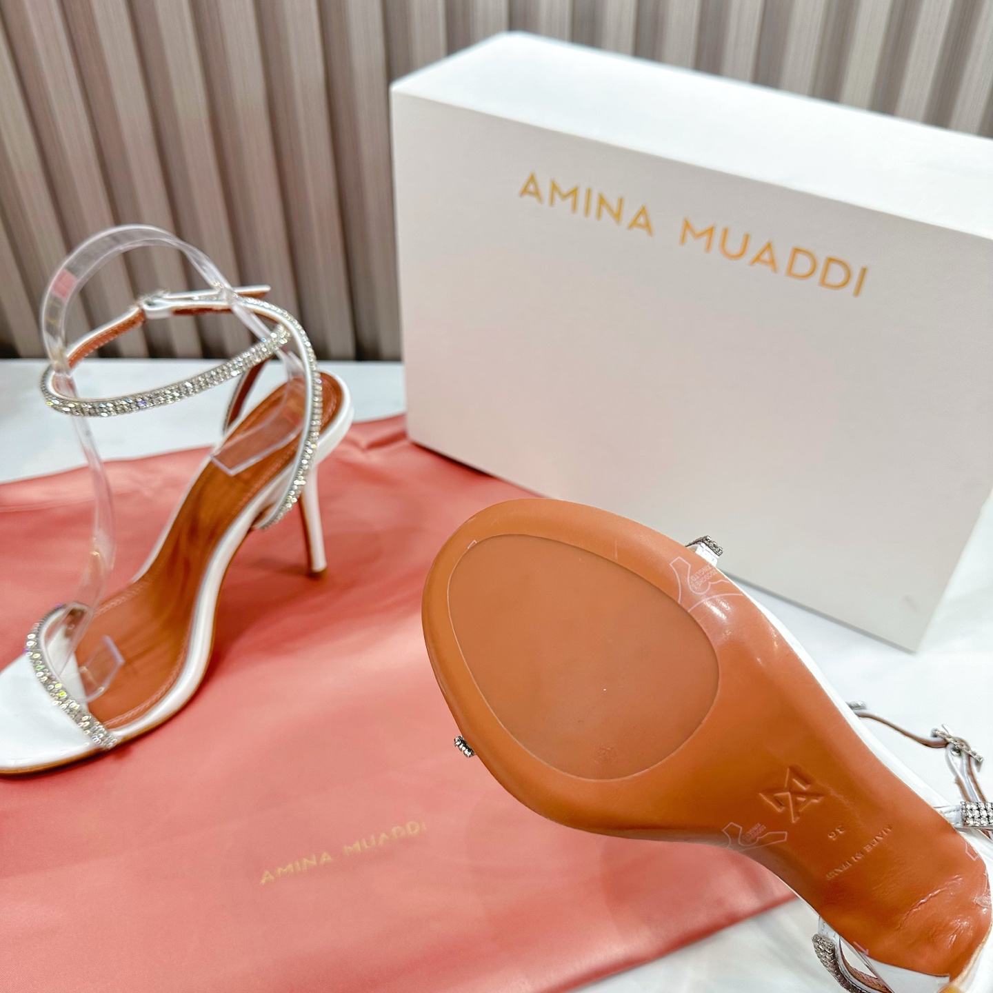 这款鞋子是AAAAA 1:1 质量 (非常棒). 使用了和原版一模一样的材料. 商标部分也保持了和Amina Muaddi一样. 图片拍摄是实物鞋子拍摄, 您所收到的实物保证和我们图片一模一样.