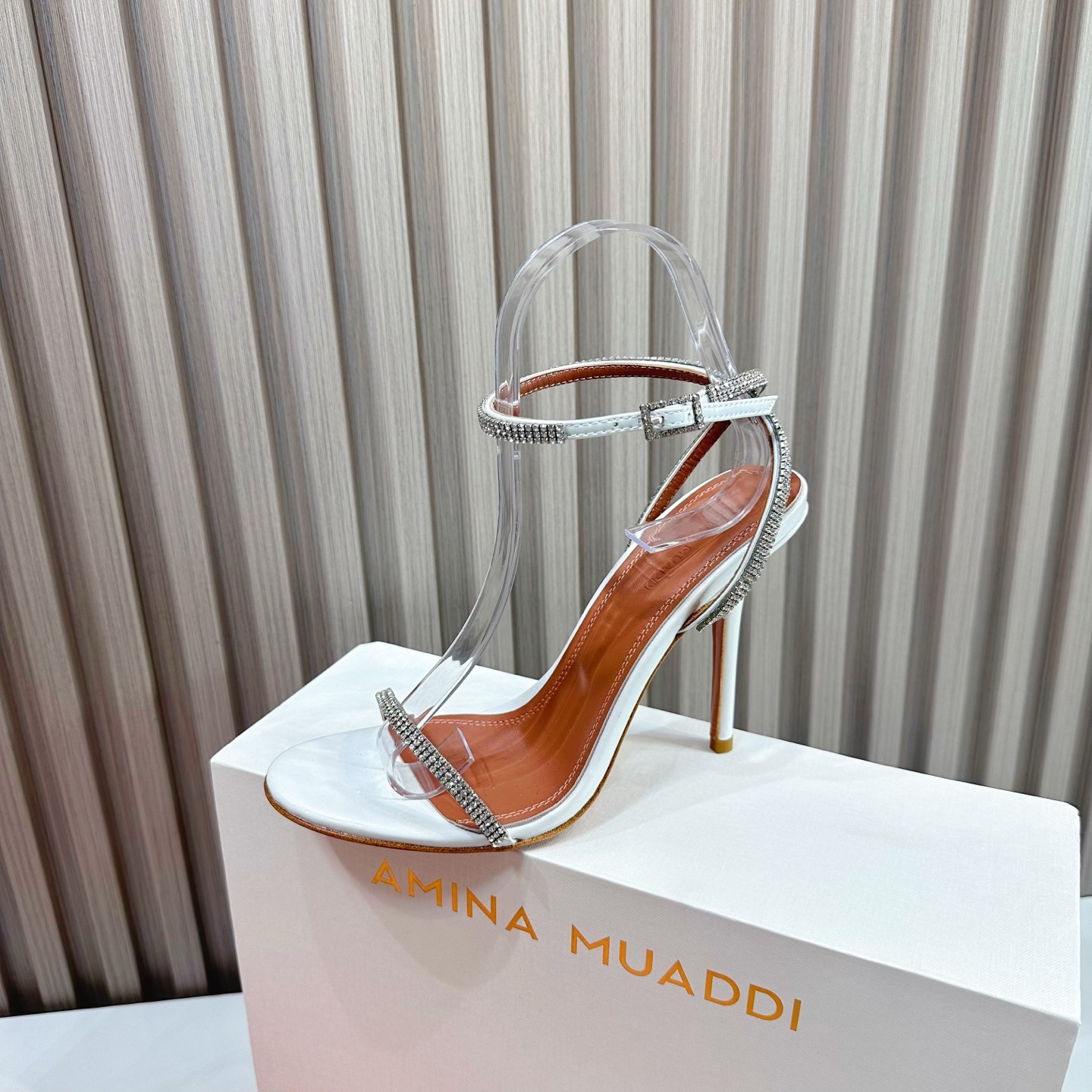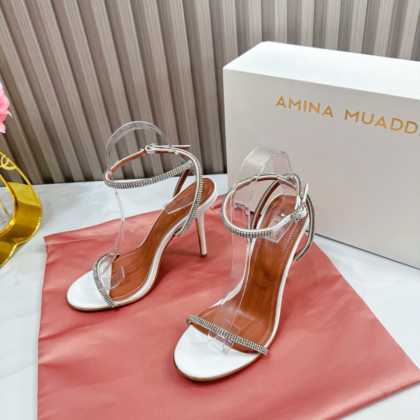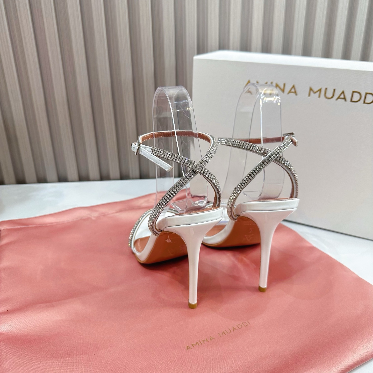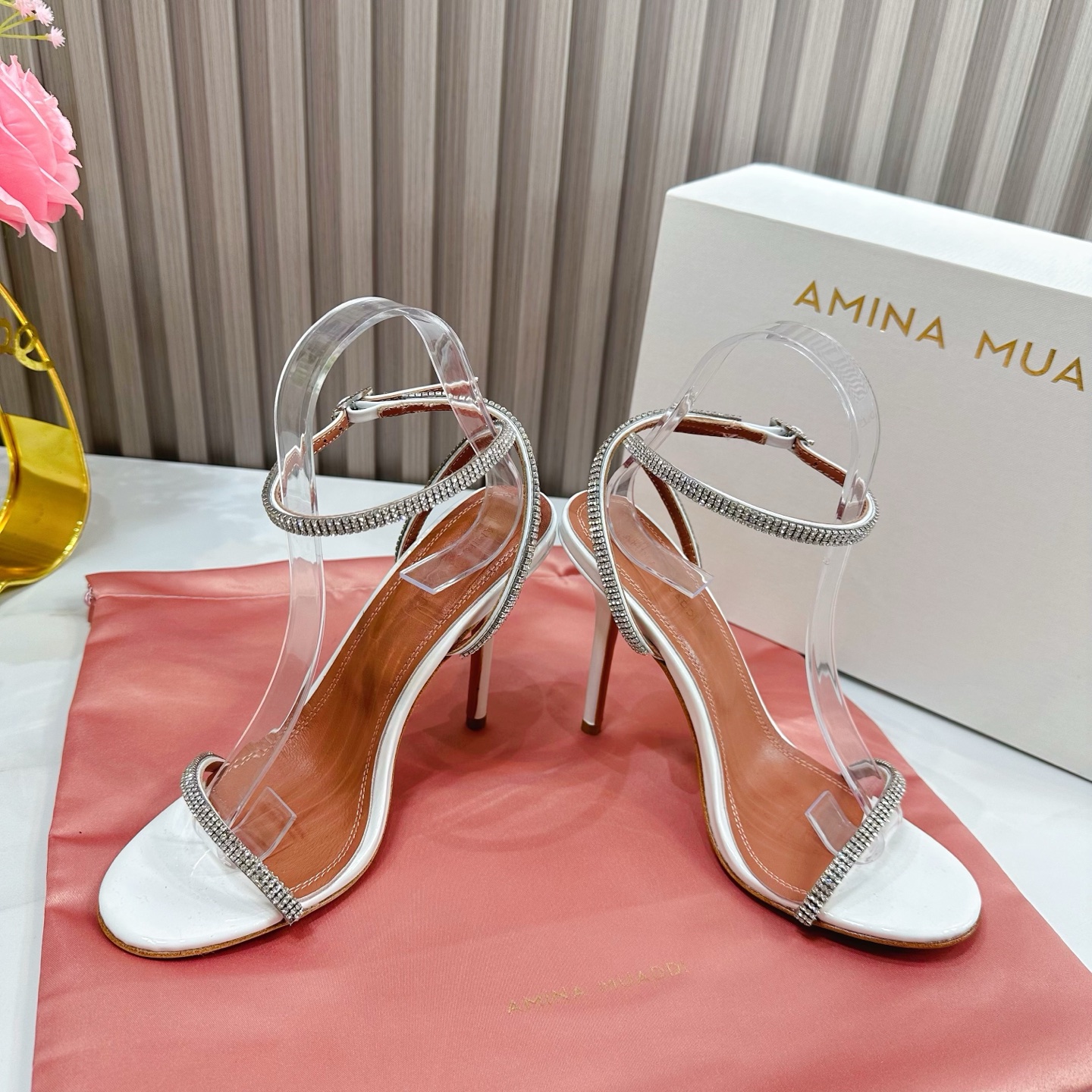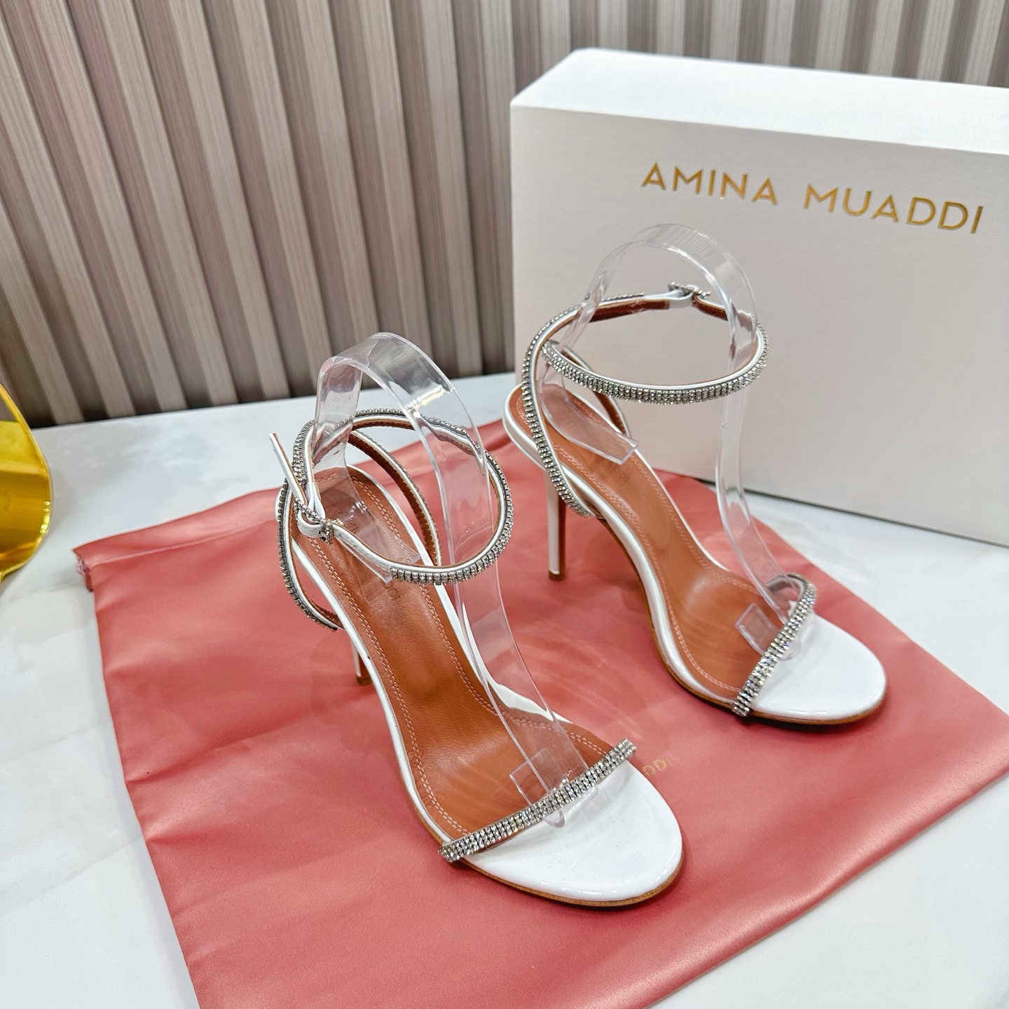 这款鞋子是AAAAA 1:1 质量 (非常棒). 使用了和原版一模一样的材料. 商标部分也保持了和Amina Muaddi一样. 图片拍摄是实物鞋子拍摄, 您所收到的实物保证和我们图片一模一样.