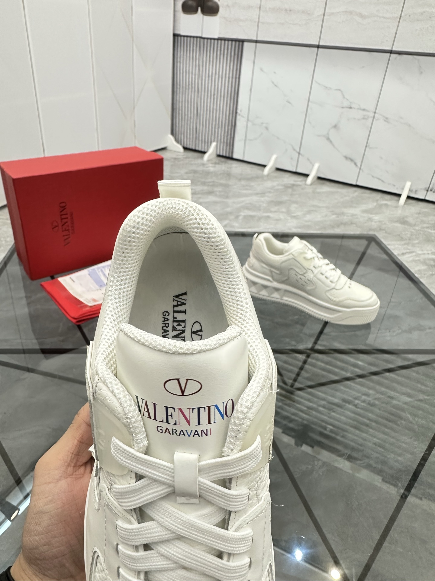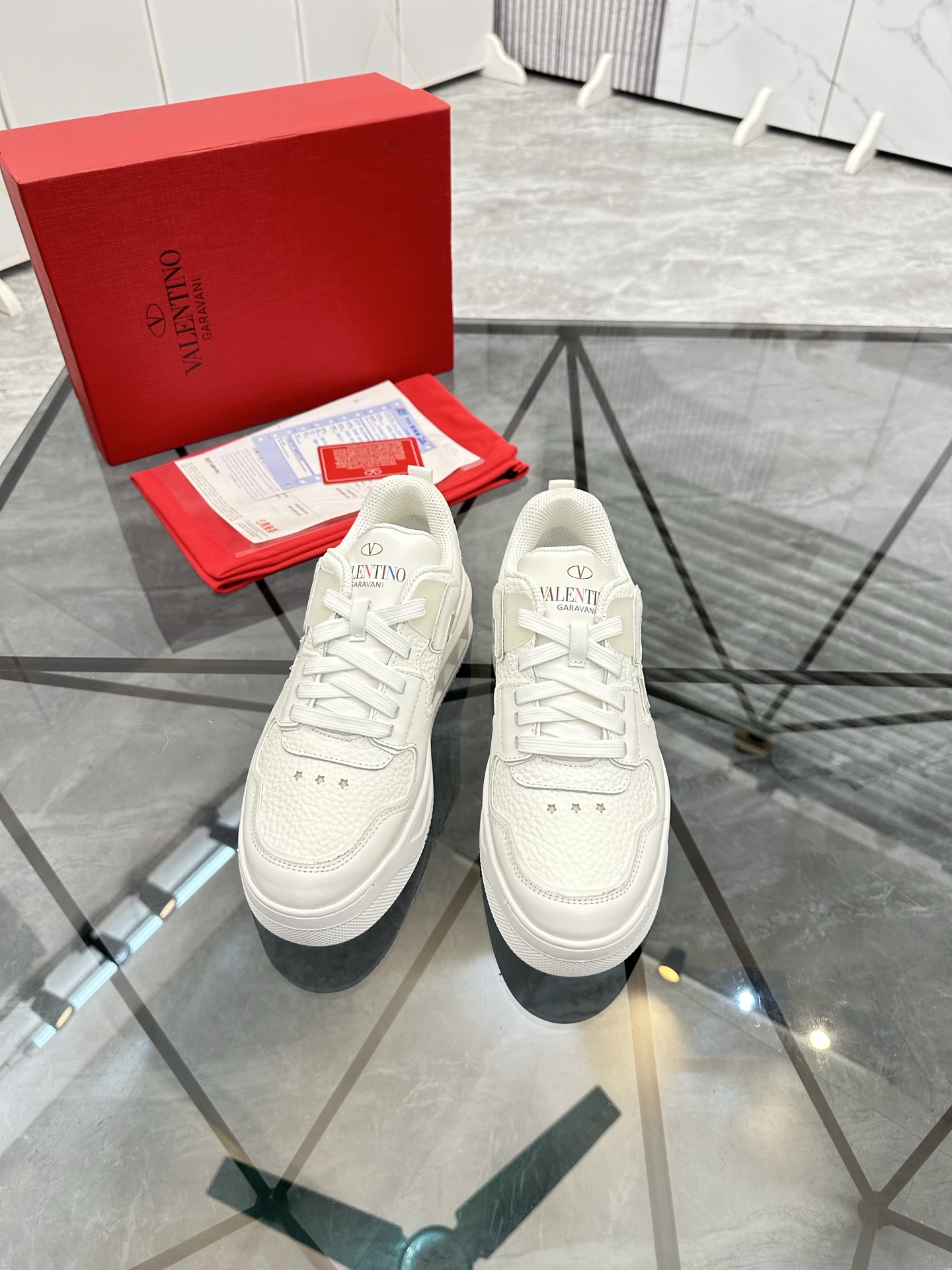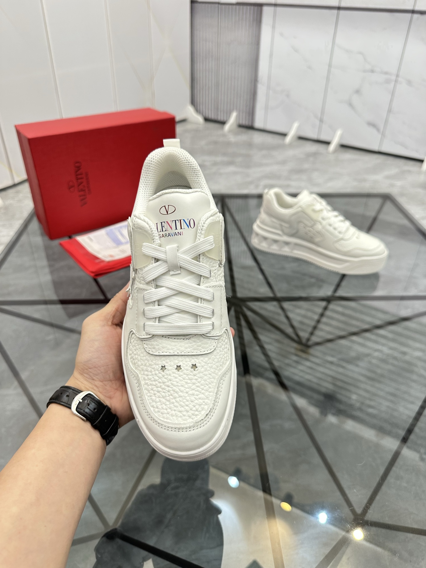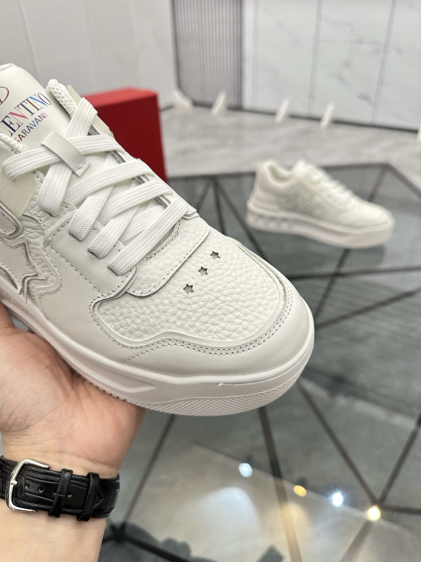 这款鞋子是AAAAA 1:1 质量 (非常棒). 使用了和原版一模一样的材料. 商标部分也保持了和华伦天奴/Valentino一样. 图片拍摄是实物鞋子拍摄, 您所收到的实物保证和我们图片一模一样.