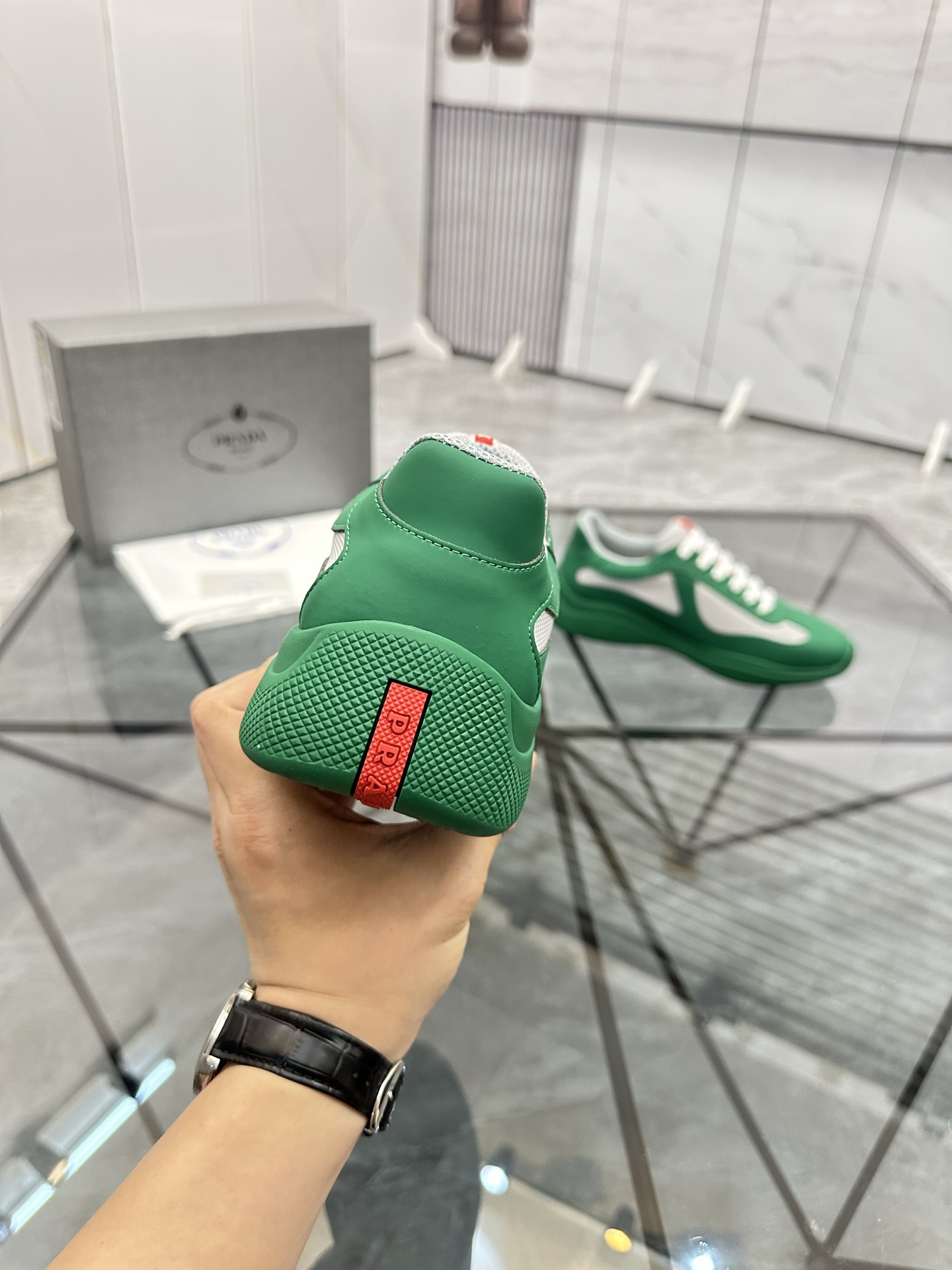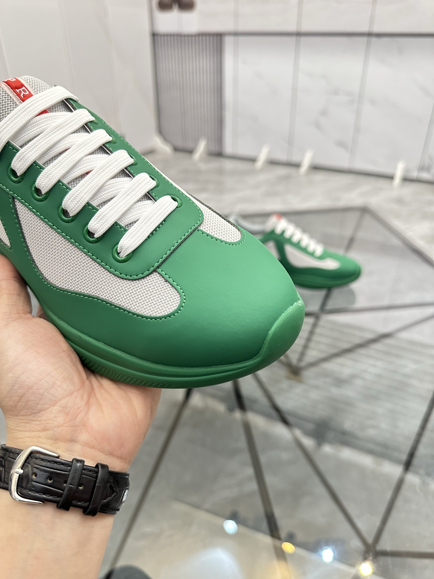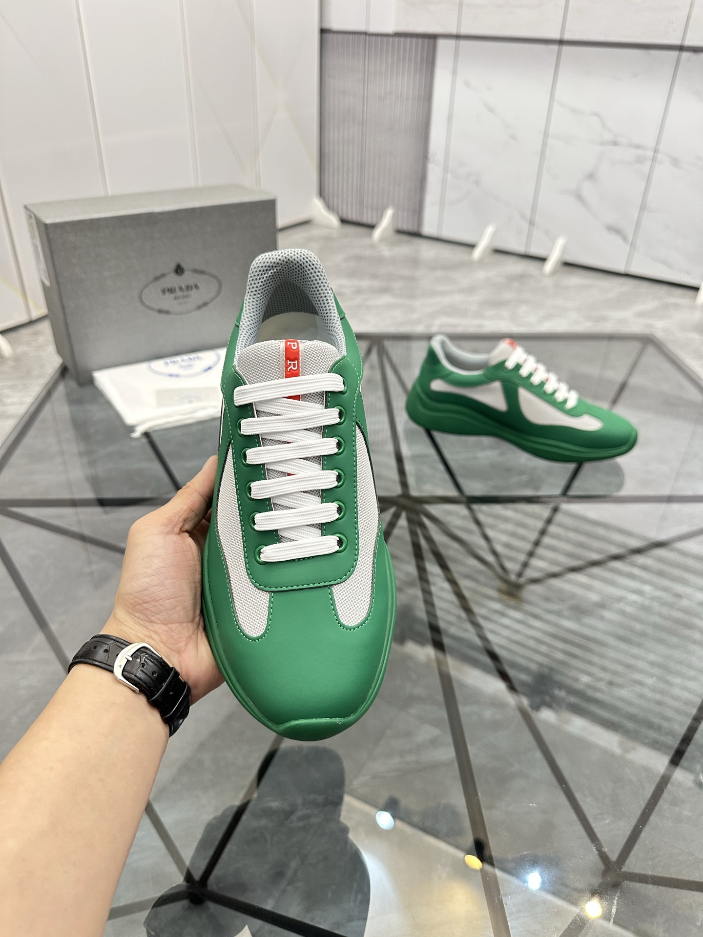 这款鞋子是AAAAA 1:1 质量 (非常棒). 使用了和原版一模一样的材料. 商标部分也保持了和普拉达/Prada一样. 图片拍摄是实物鞋子拍摄, 您所收到的实物保证和我们图片一模一样.