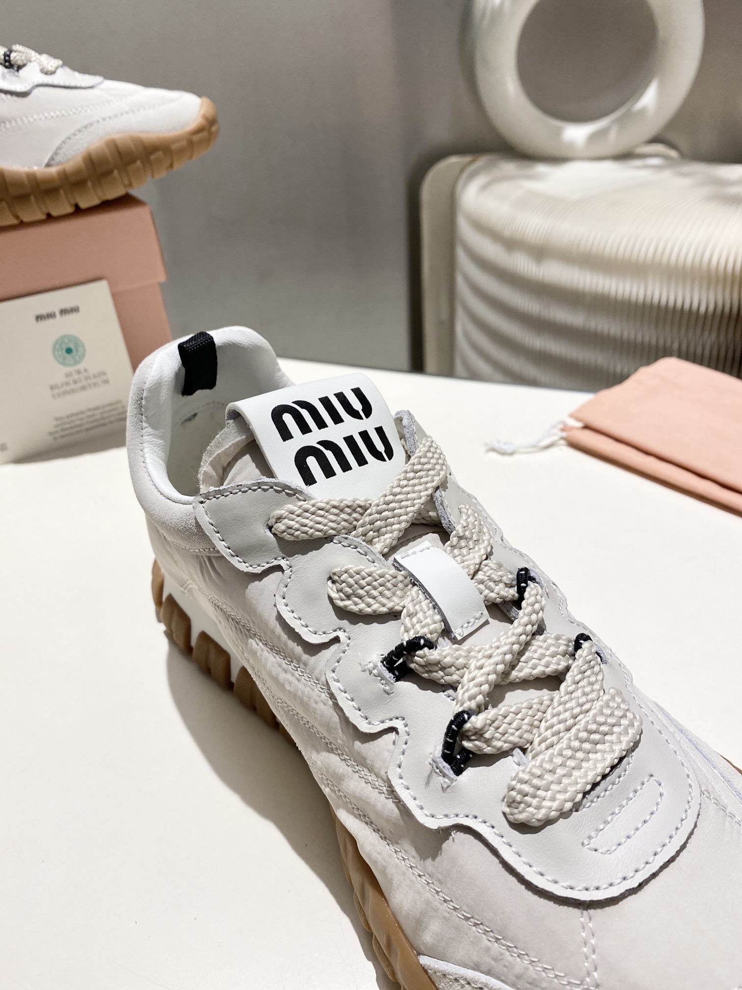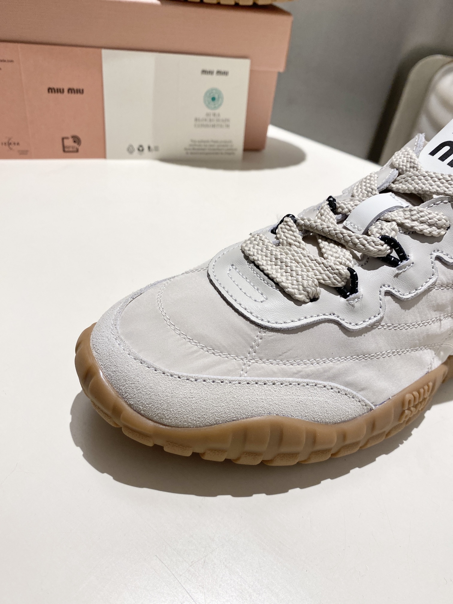 这款鞋子是AAAAA 1:1 质量 (非常棒). 使用了和原版一模一样的材料. 商标部分也保持了和缪缪/Miu Miu一样. 图片拍摄是实物鞋子拍摄, 您所收到的实物保证和我们图片一模一样.
