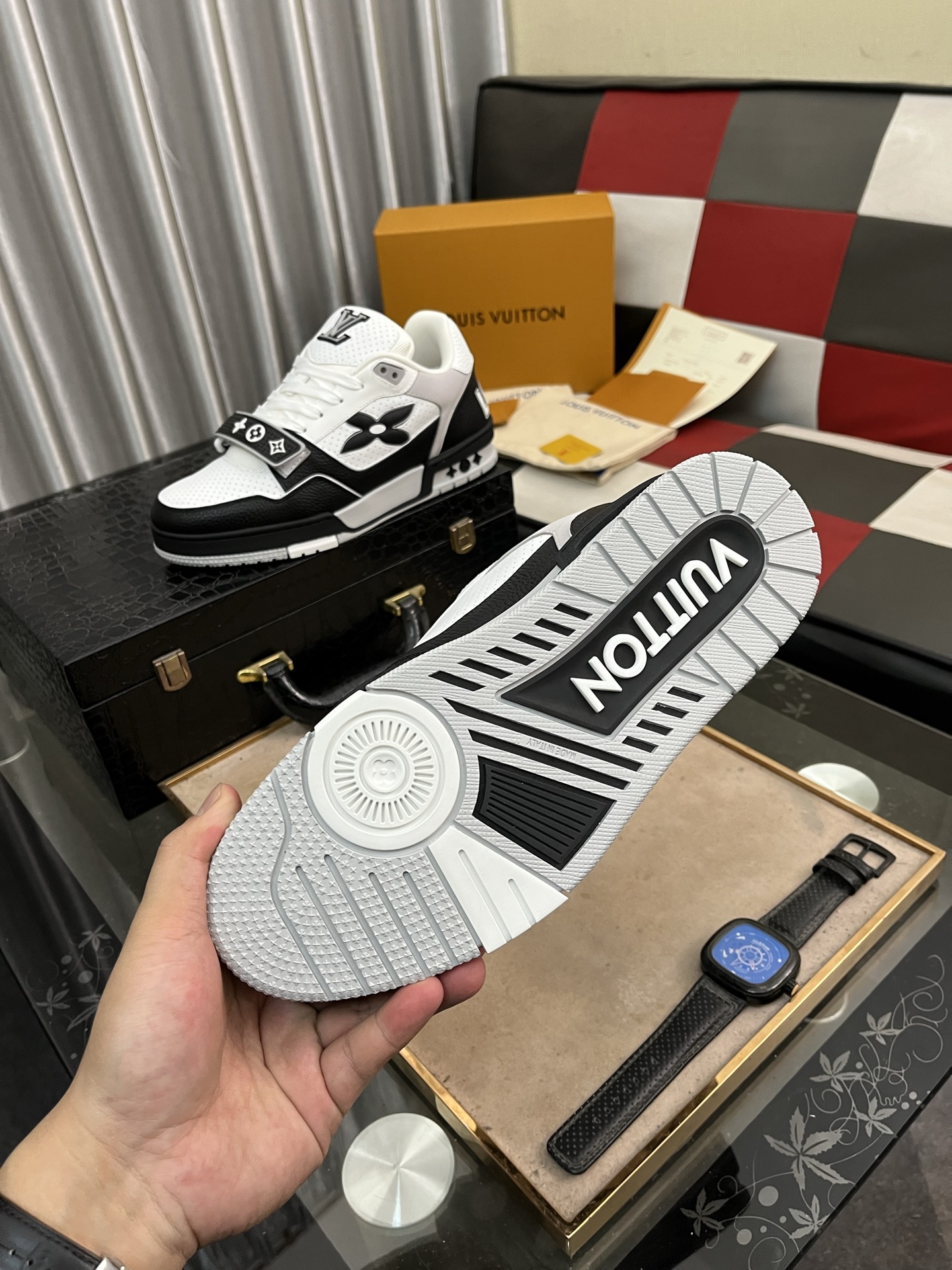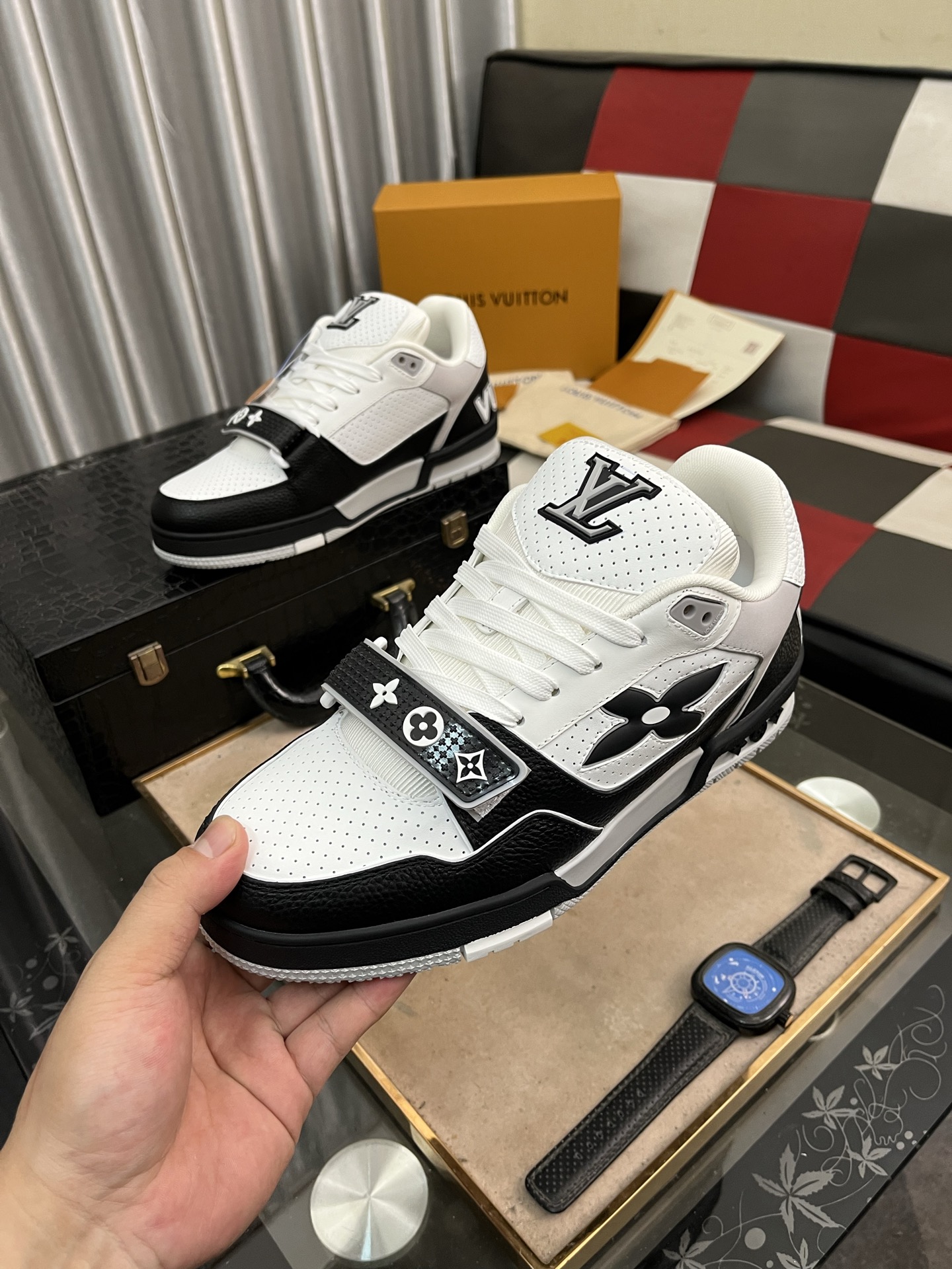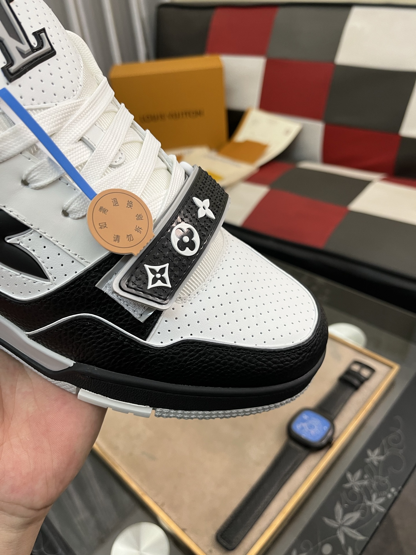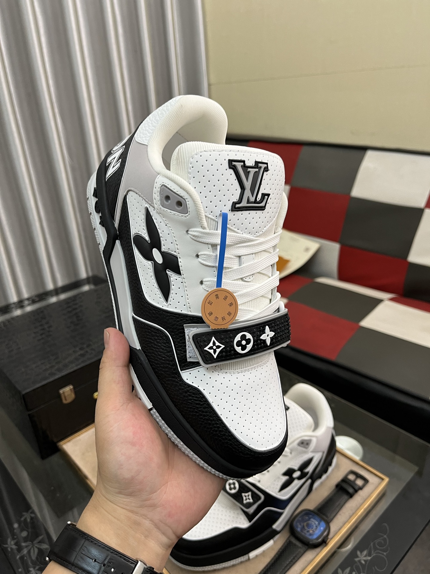 这款鞋子是AAAAA 1:1 质量 (非常棒). 使用了和原版一模一样的材料. 商标部分也保持了和路易威登/Louis Vuitton一样. 图片拍摄是实物鞋子拍摄, 您所收到的实物保证和我们图片一模一样.