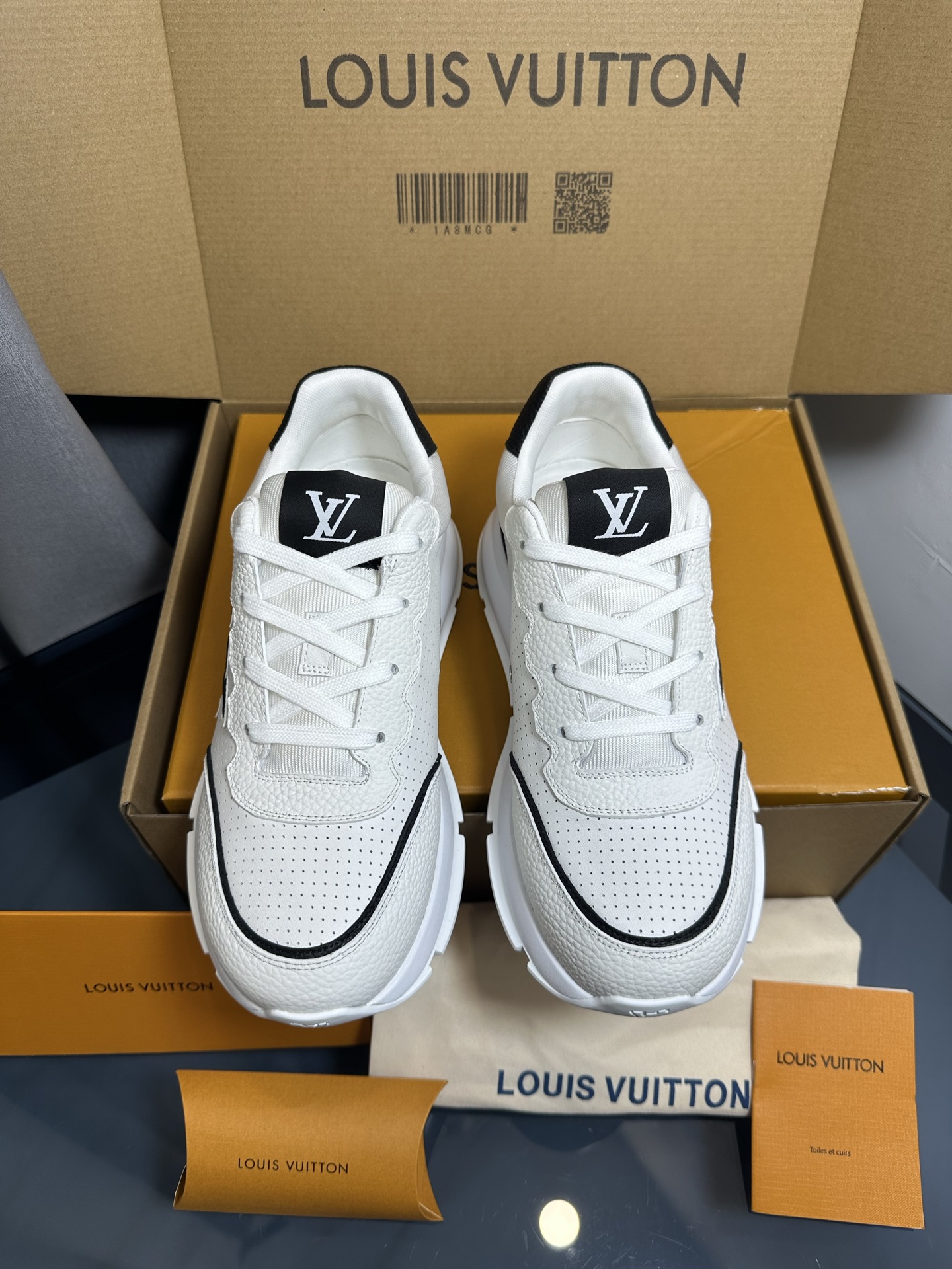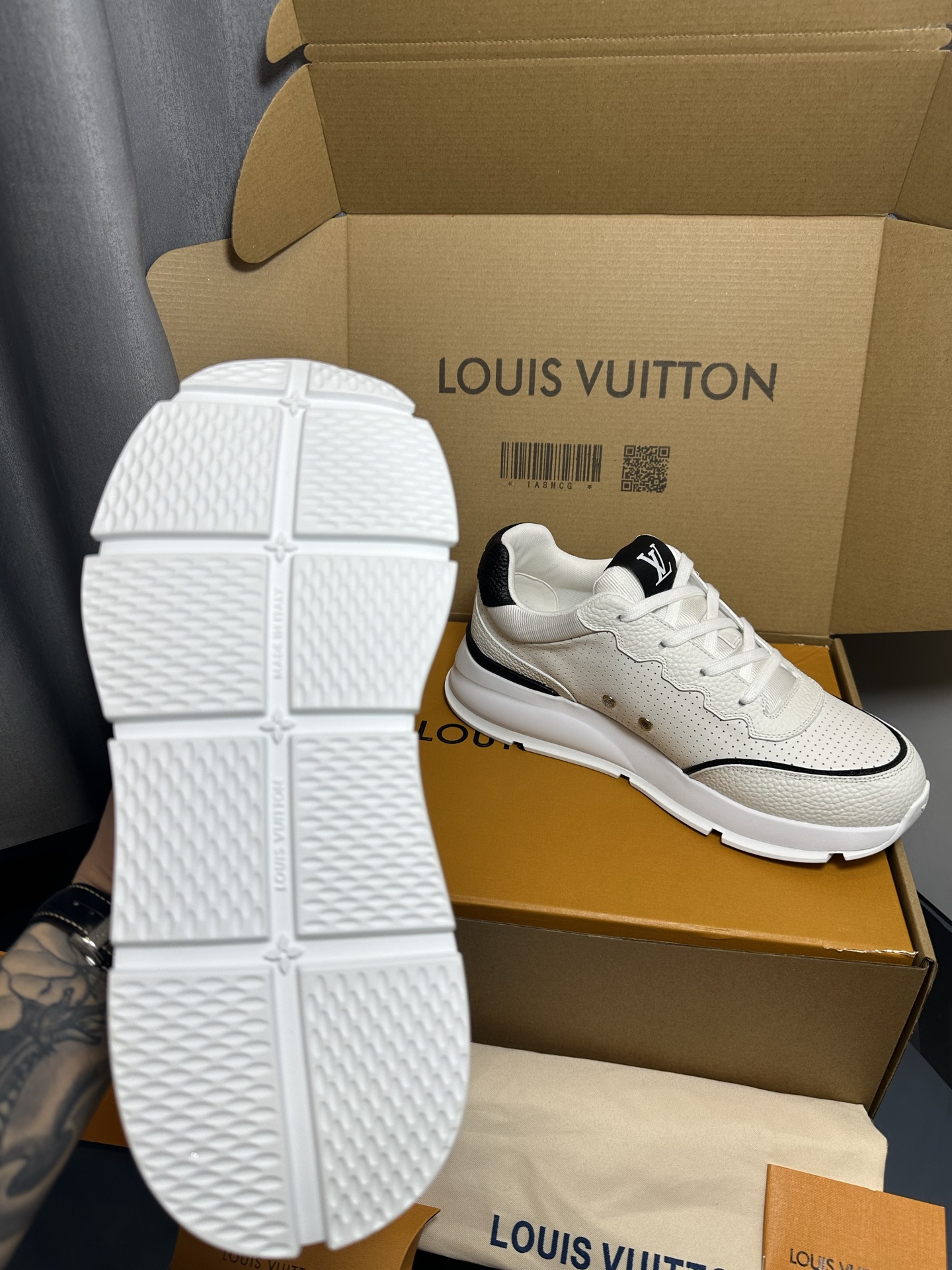 这款鞋子是AAAAA 1:1 质量 (非常棒). 使用了和原版一模一样的材料. 商标部分也保持了和路易威登/Louis Vuitton一样. 图片拍摄是实物鞋子拍摄, 您所收到的实物保证和我们图片一模一样.