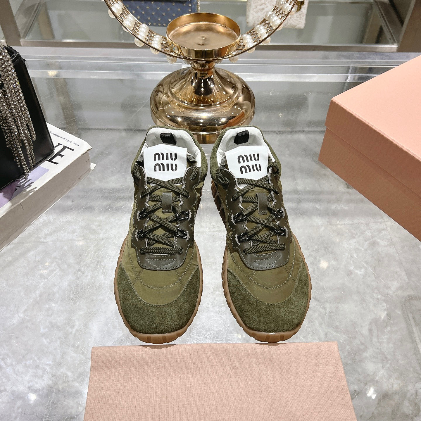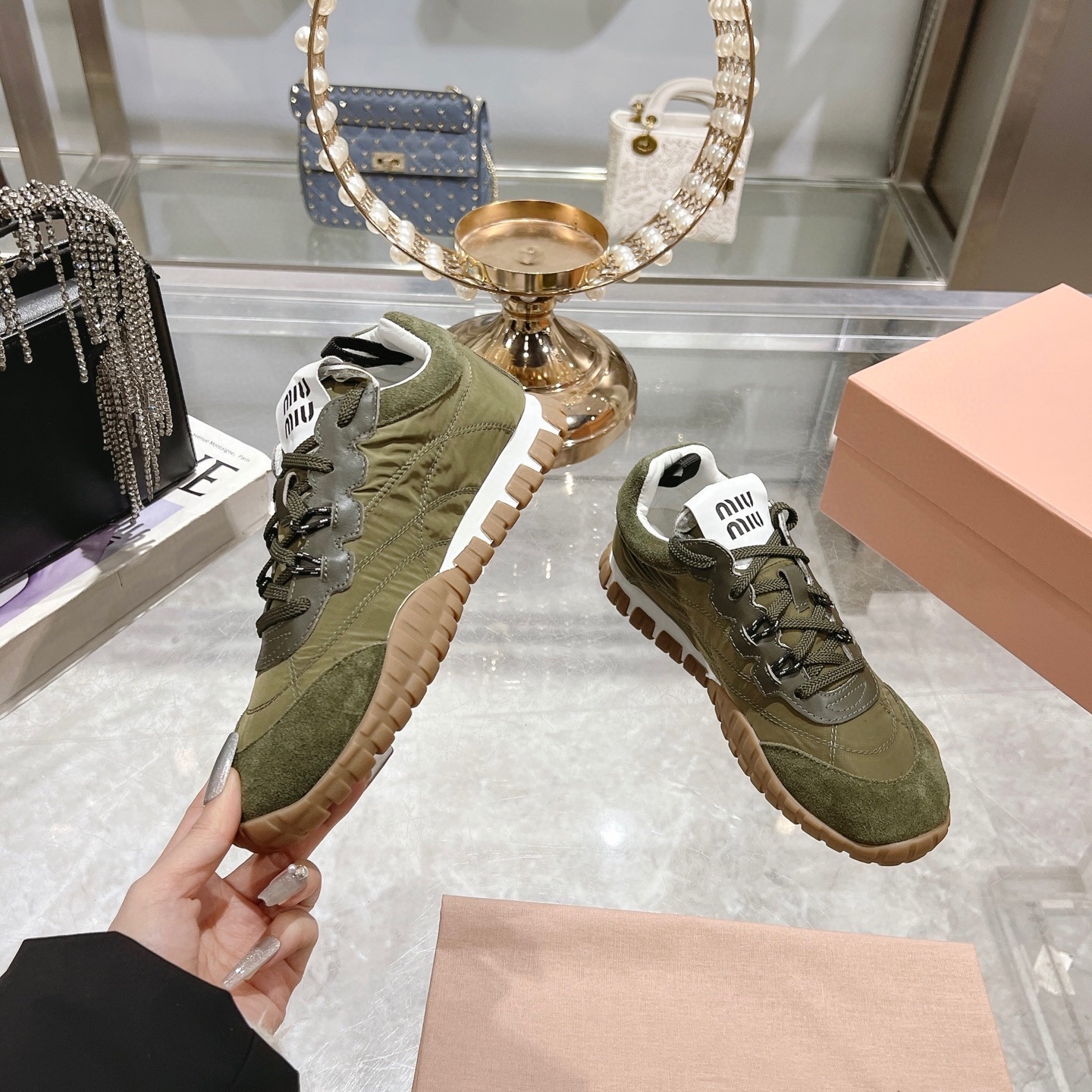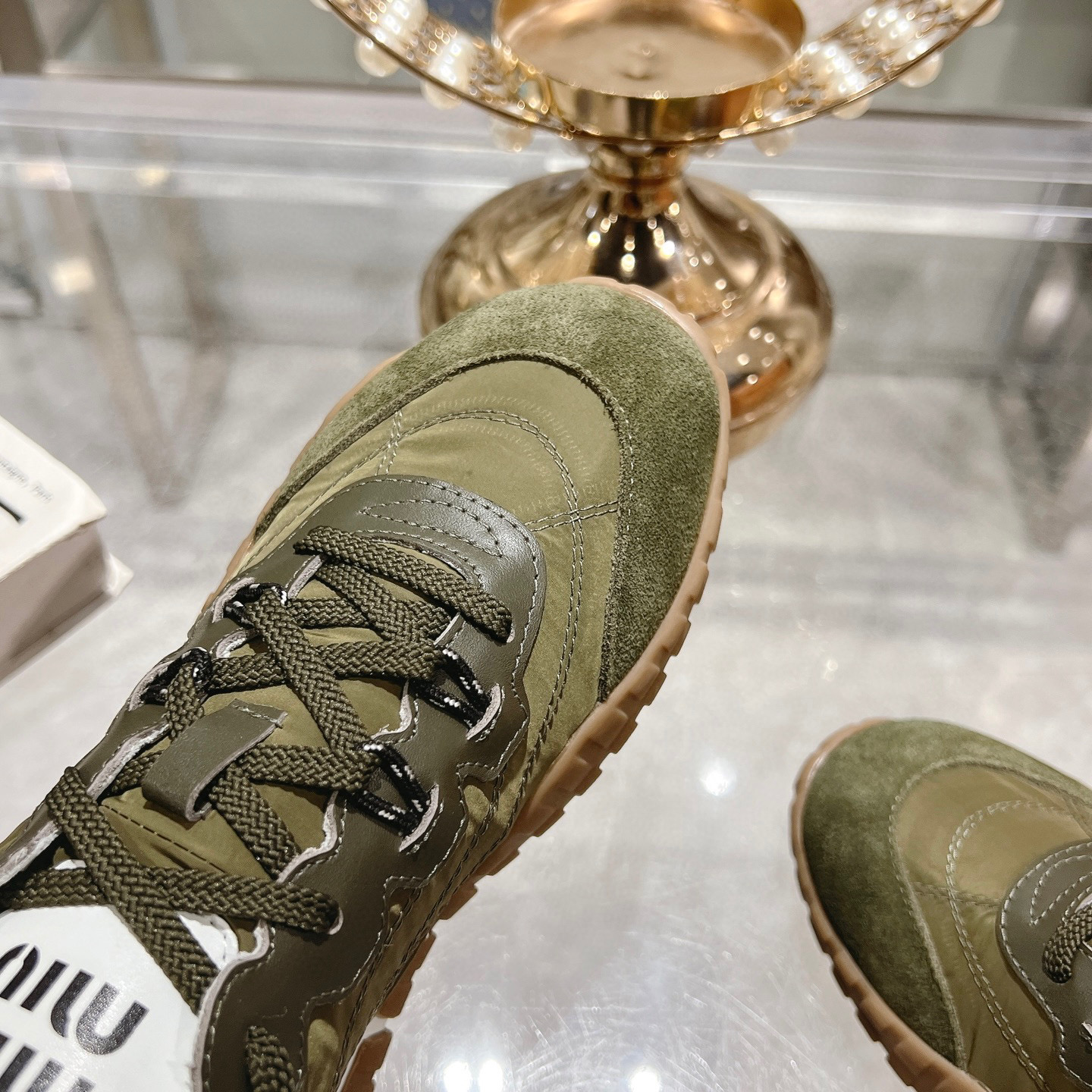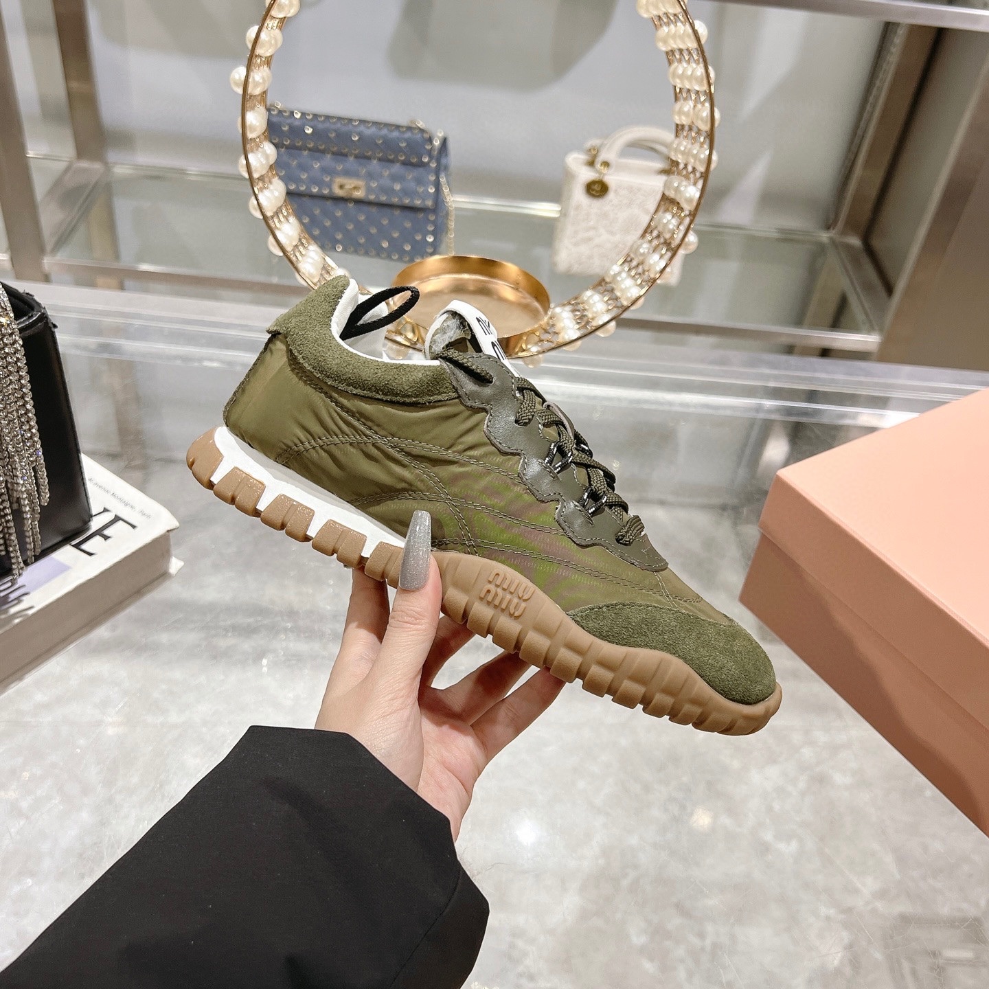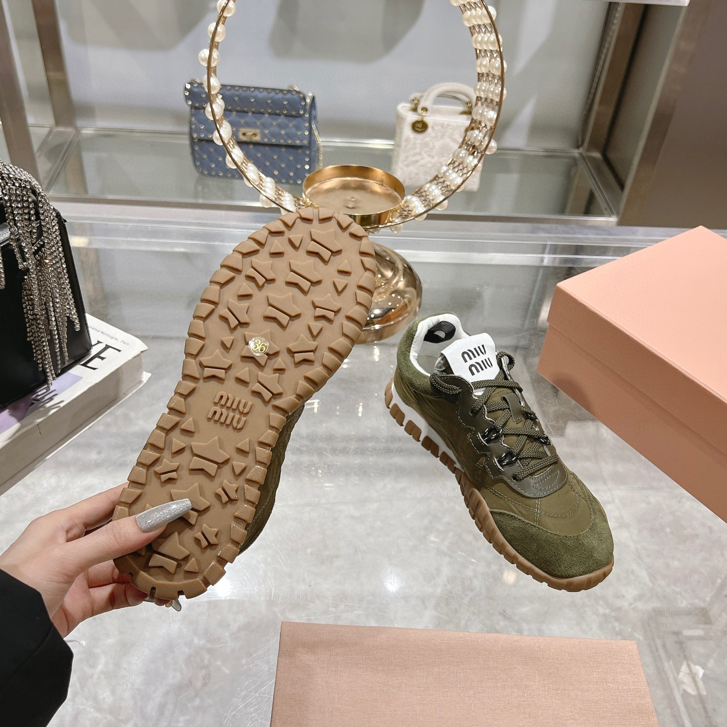 这款鞋子是AAAAA 1:1 质量 (非常棒). 使用了和原版一模一样的材料. 商标部分也保持了和缪缪/Miu Miu一样. 图片拍摄是实物鞋子拍摄, 您所收到的实物保证和我们图片一模一样.