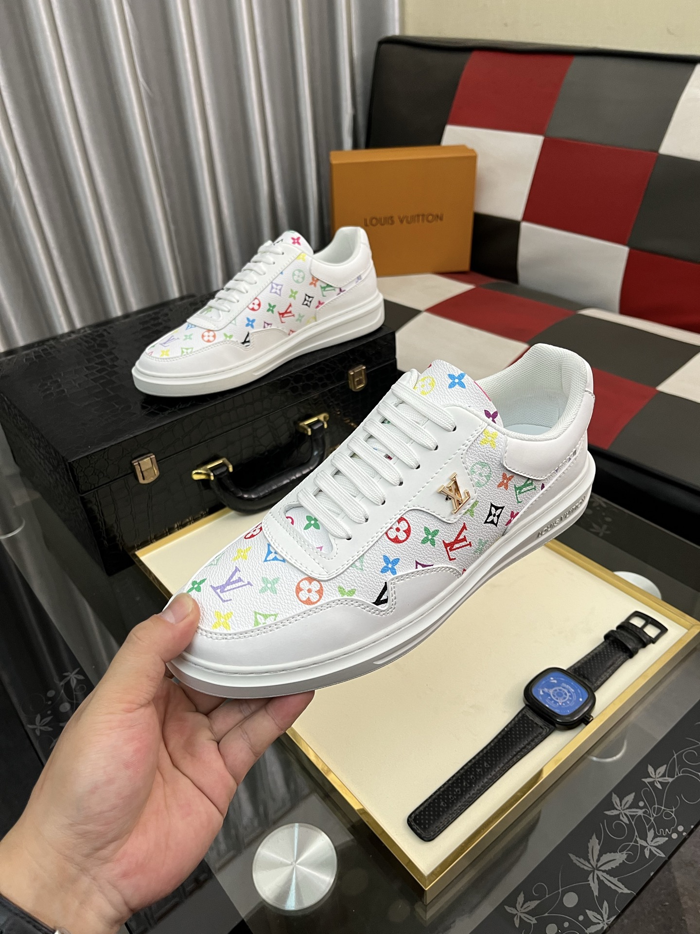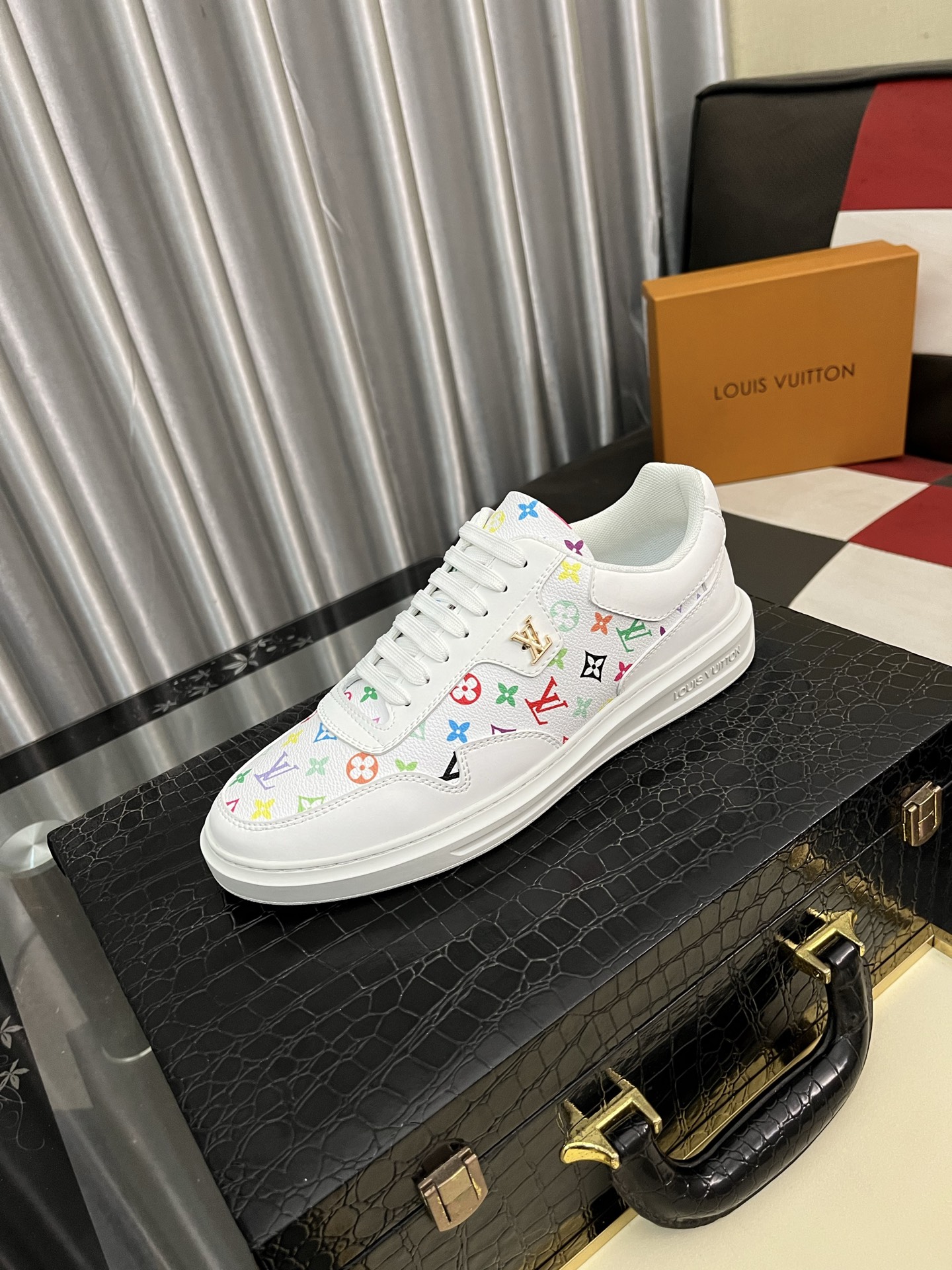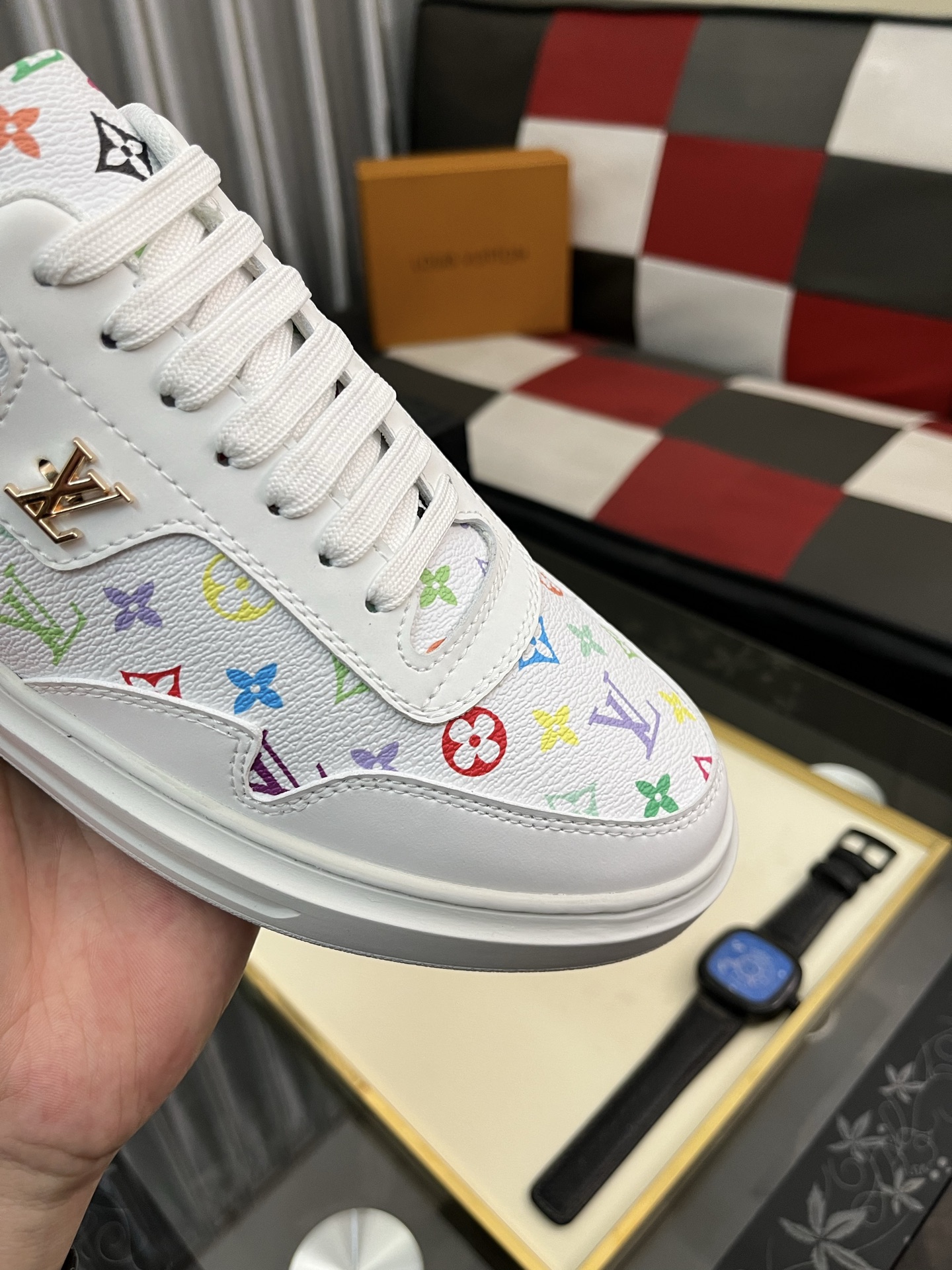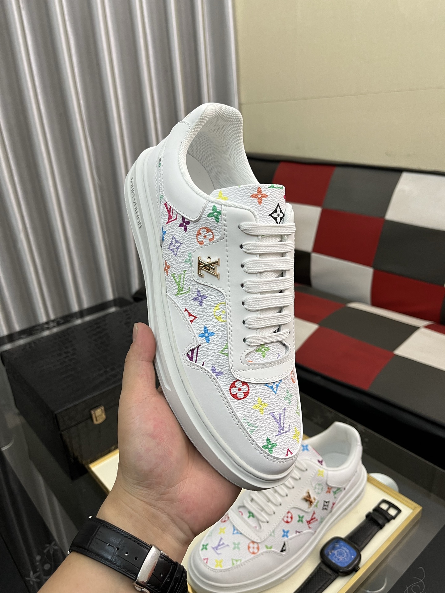 这款鞋子是AAAAA 1:1 质量 (非常棒). 使用了和原版一模一样的材料. 商标部分也保持了和路易威登/Louis Vuitton一样. 图片拍摄是实物鞋子拍摄, 您所收到的实物保证和我们图片一模一样.