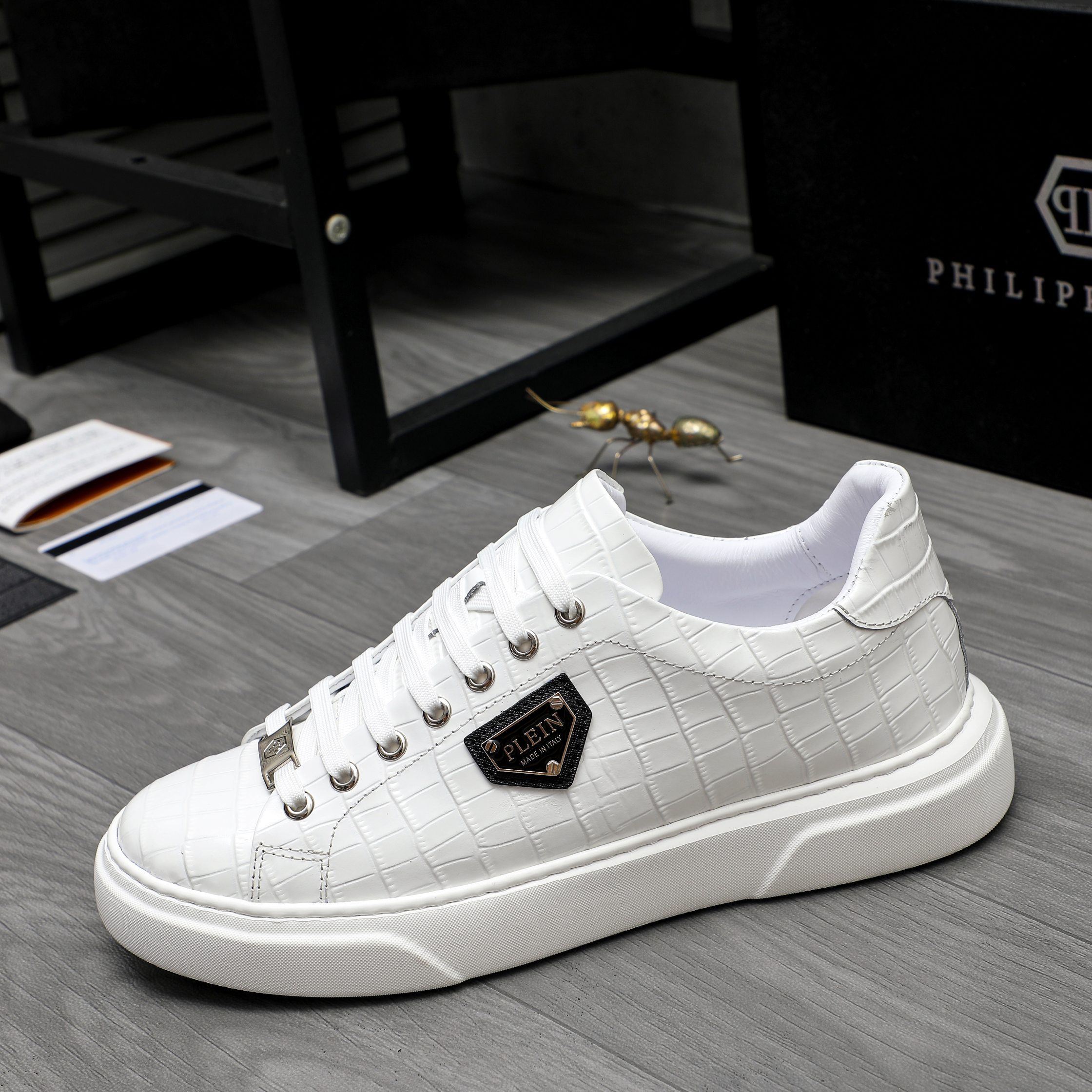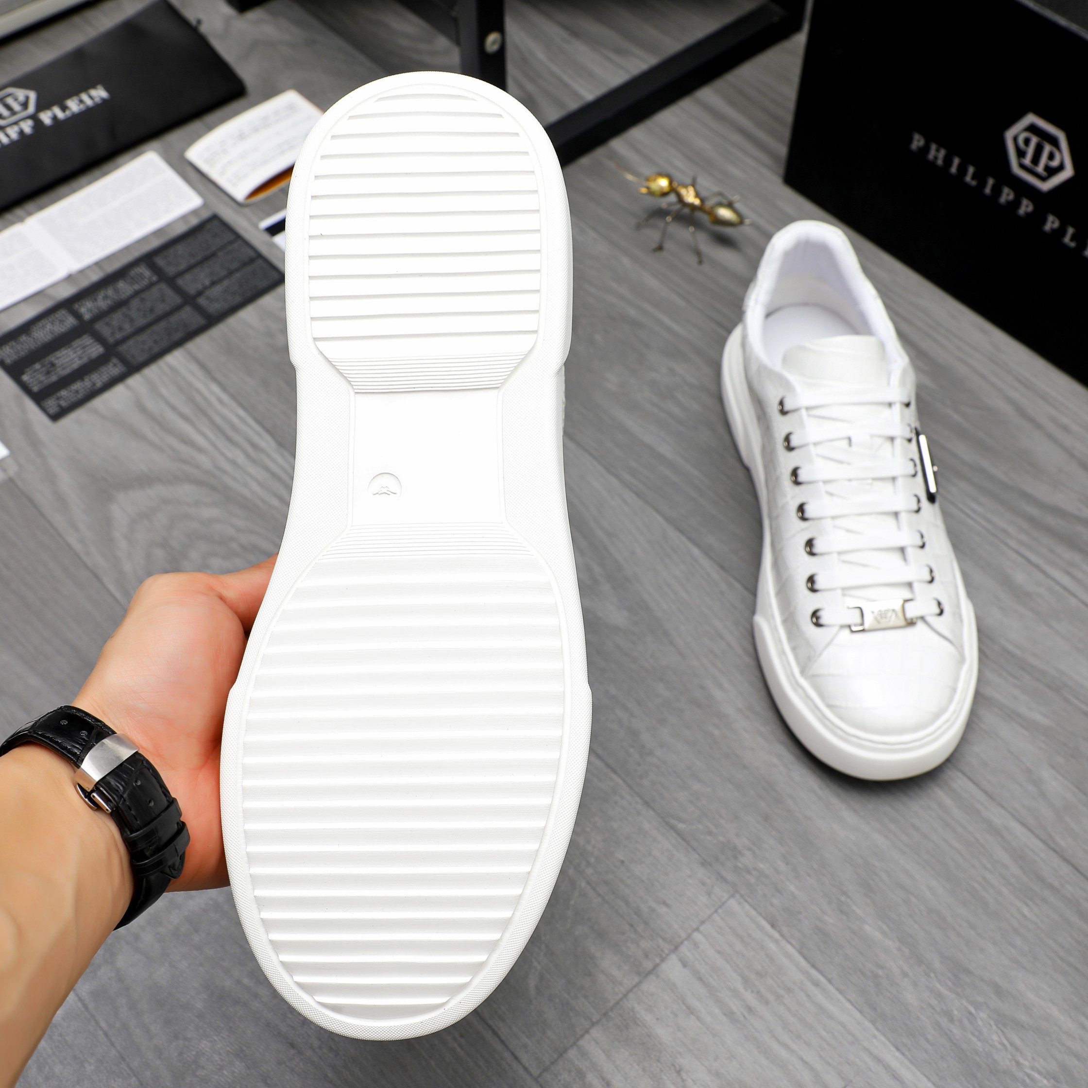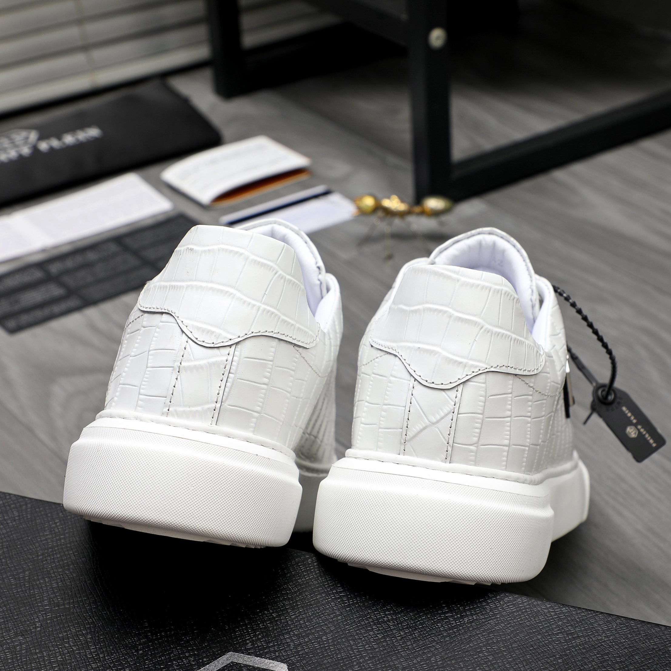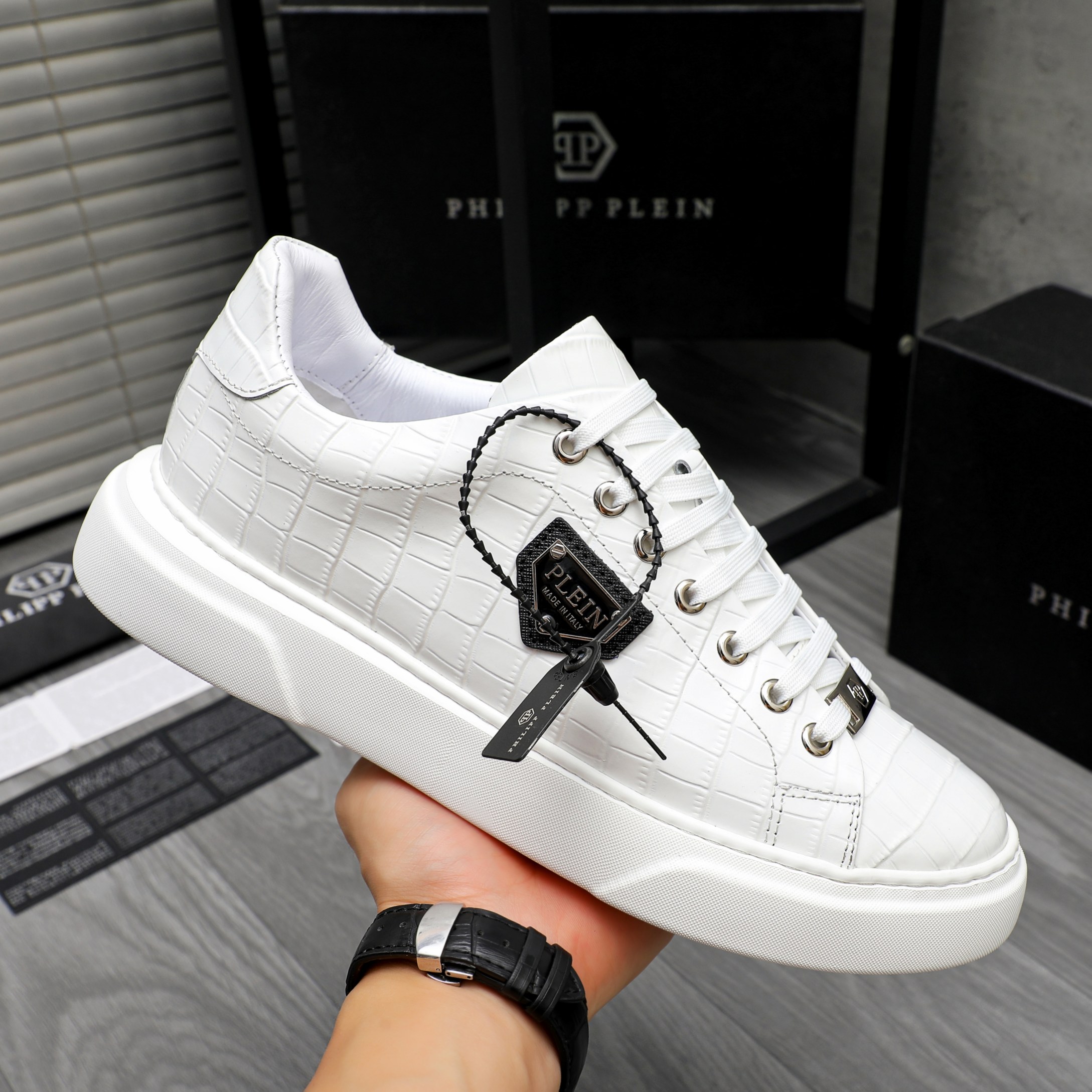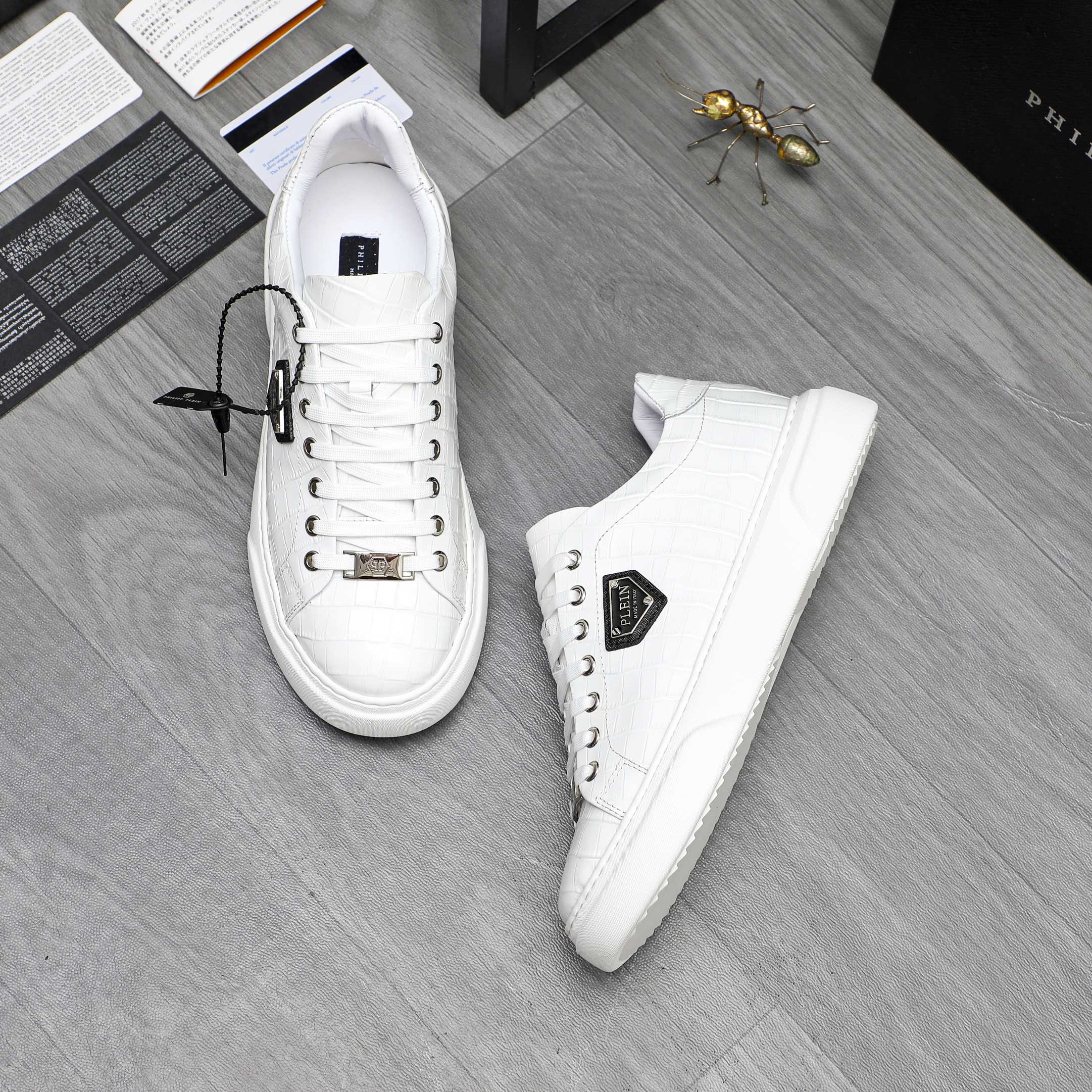 这款鞋子是AAAAA 1:1 质量 (非常棒). 使用了和原版一模一样的材料. 商标部分也保持了和菲利普·普林/Philipp Plein一样. 图片拍摄是实物鞋子拍摄, 您所收到的实物保证和我们图片一模一样.