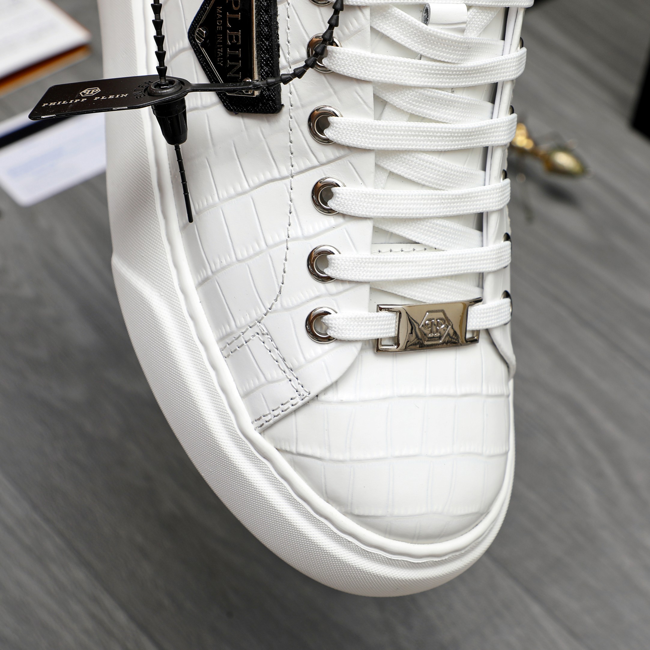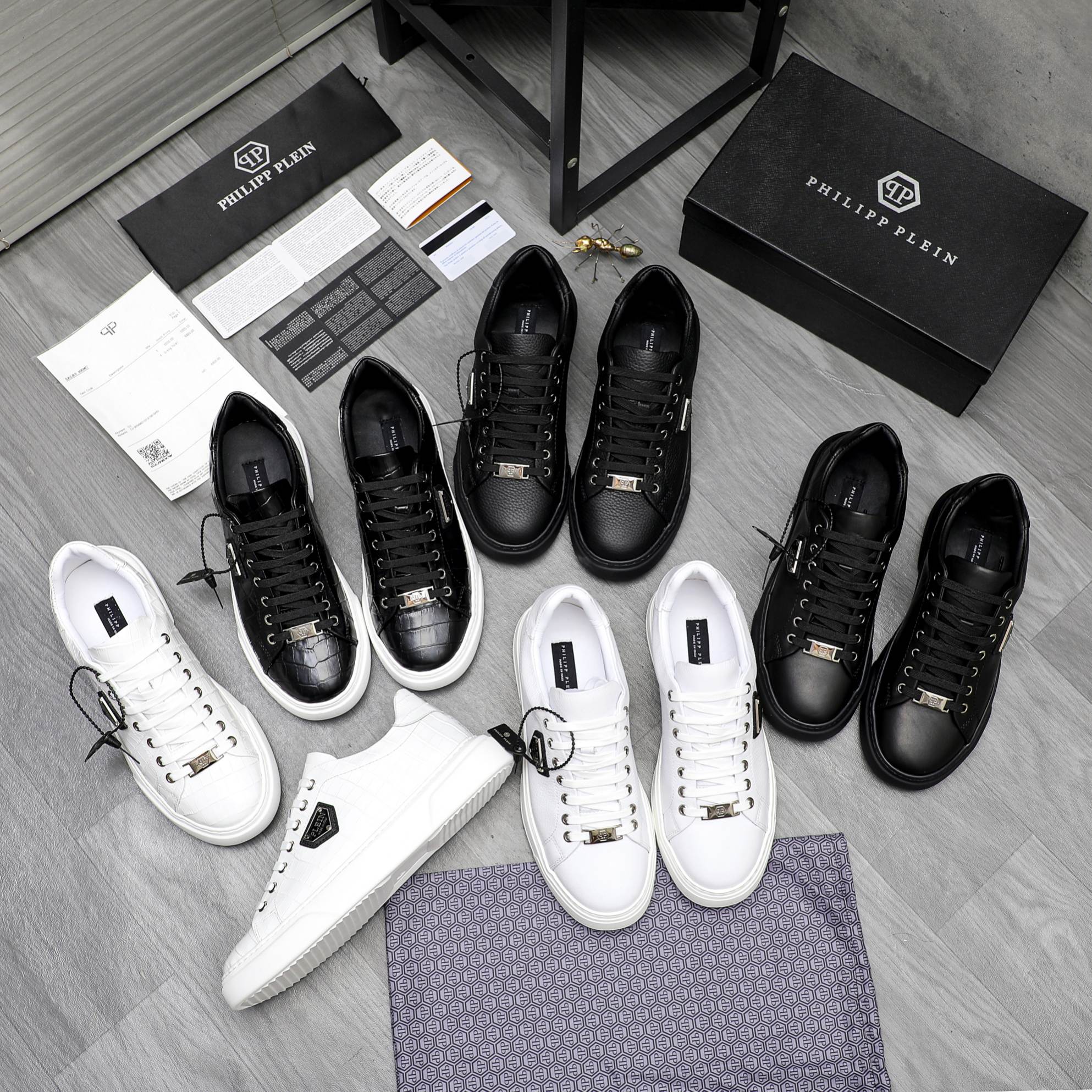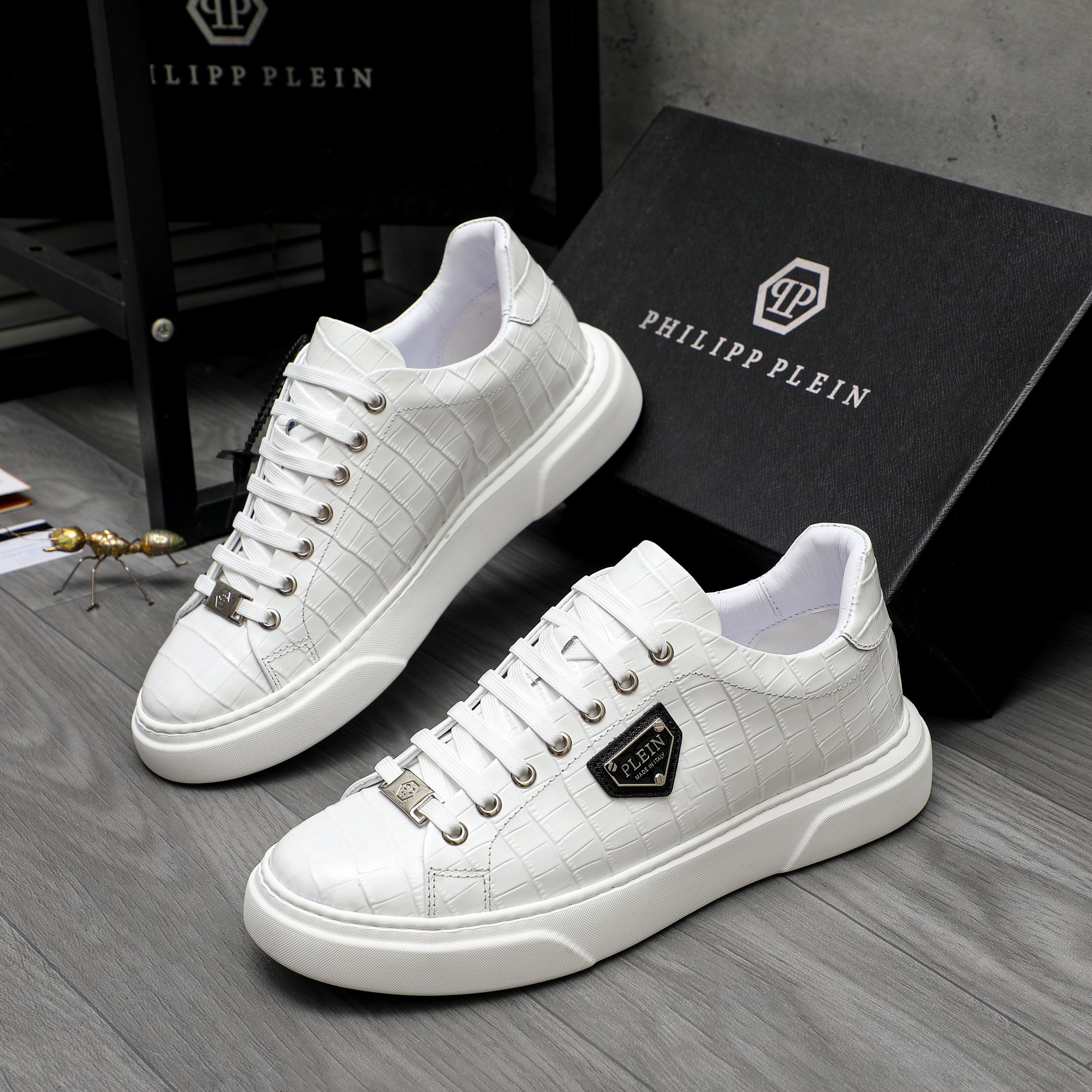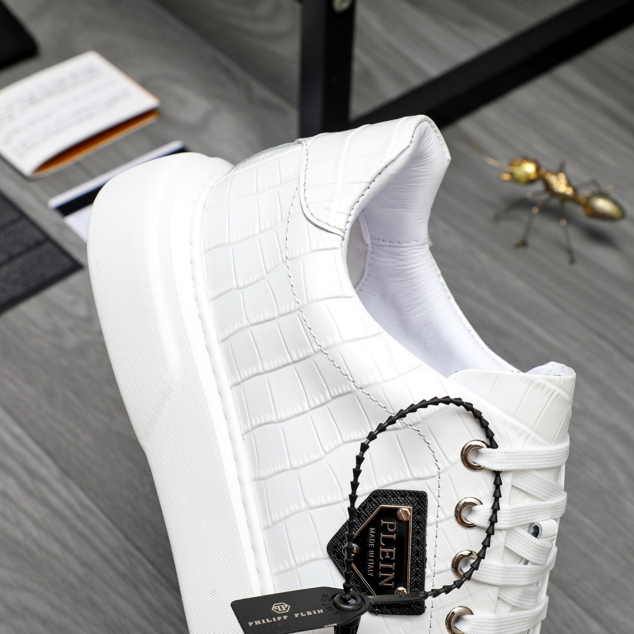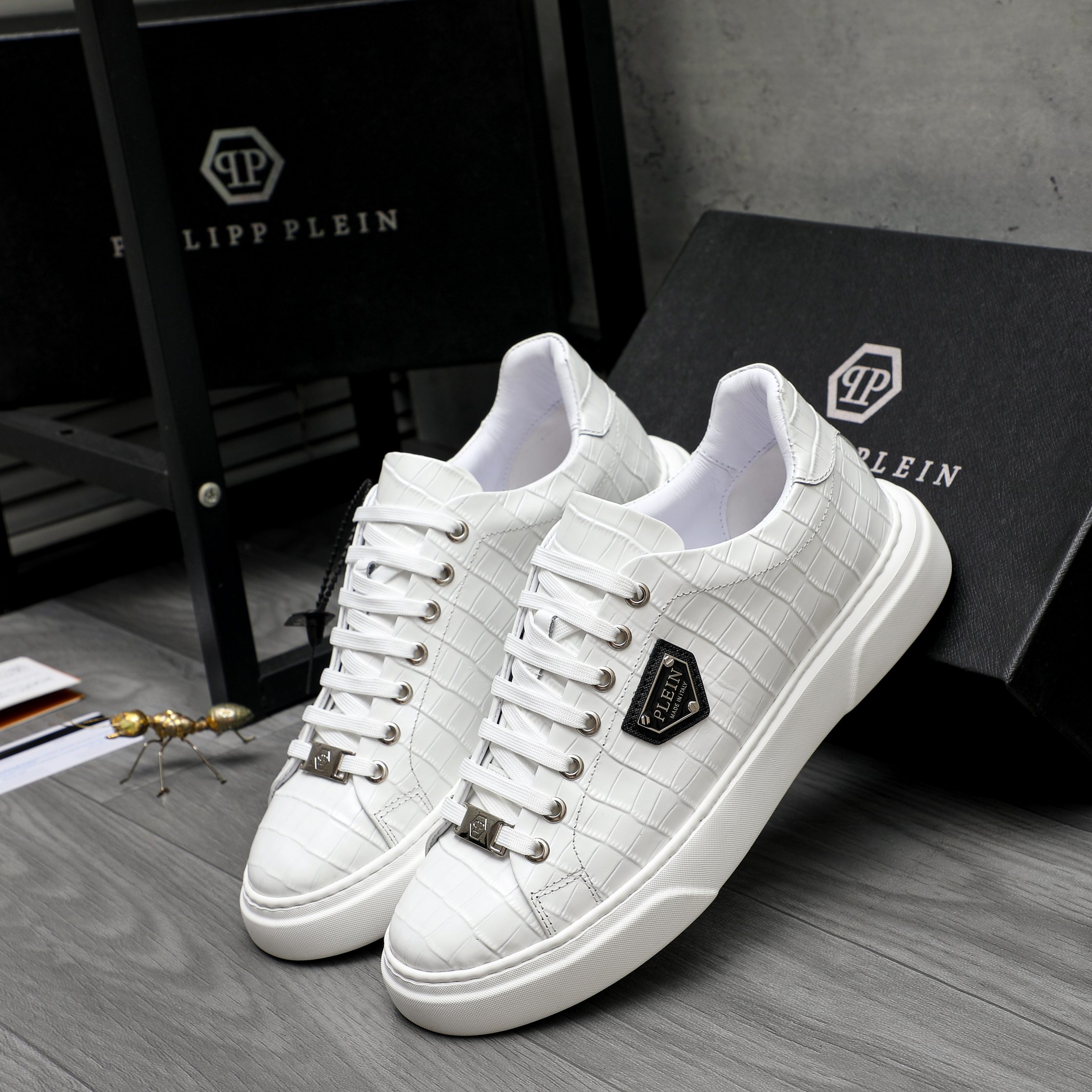 这款鞋子是AAAAA 1:1 质量 (非常棒). 使用了和原版一模一样的材料. 商标部分也保持了和菲利普·普林/Philipp Plein一样. 图片拍摄是实物鞋子拍摄, 您所收到的实物保证和我们图片一模一样.