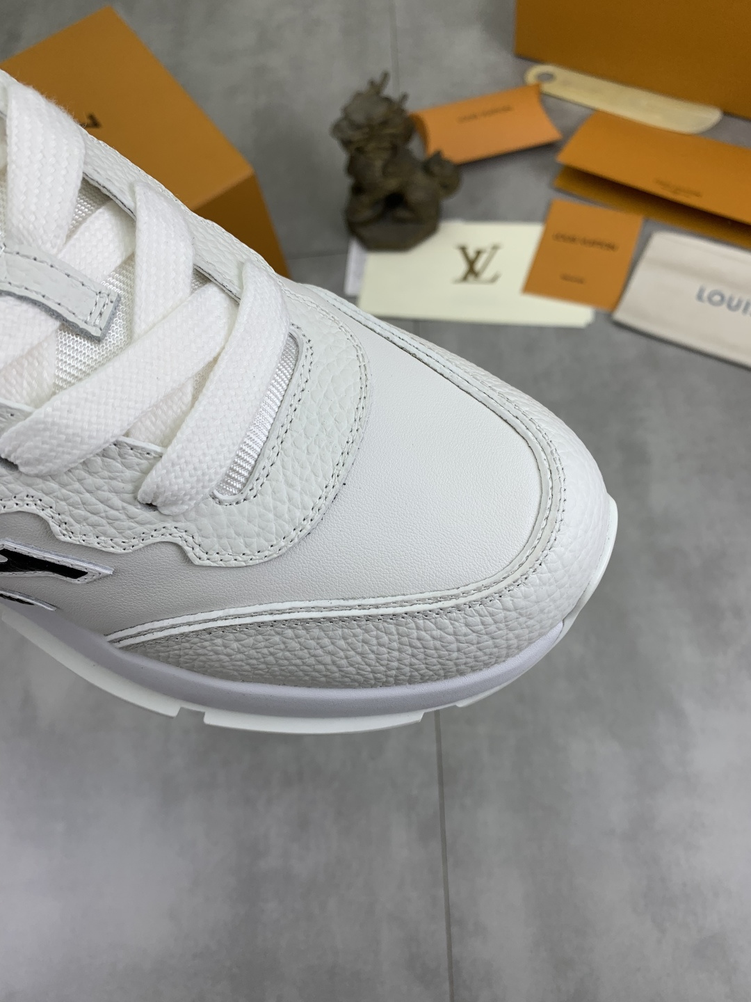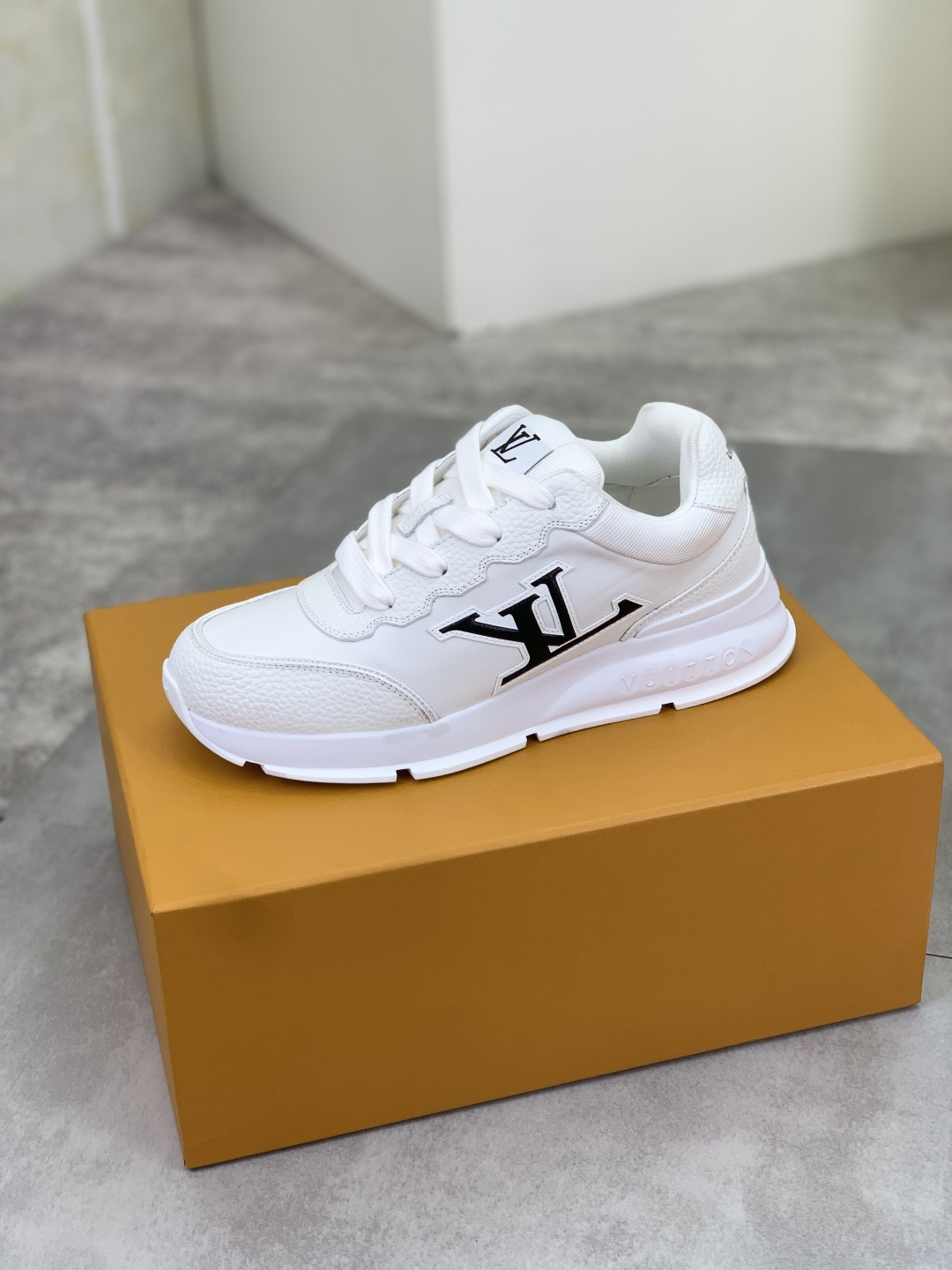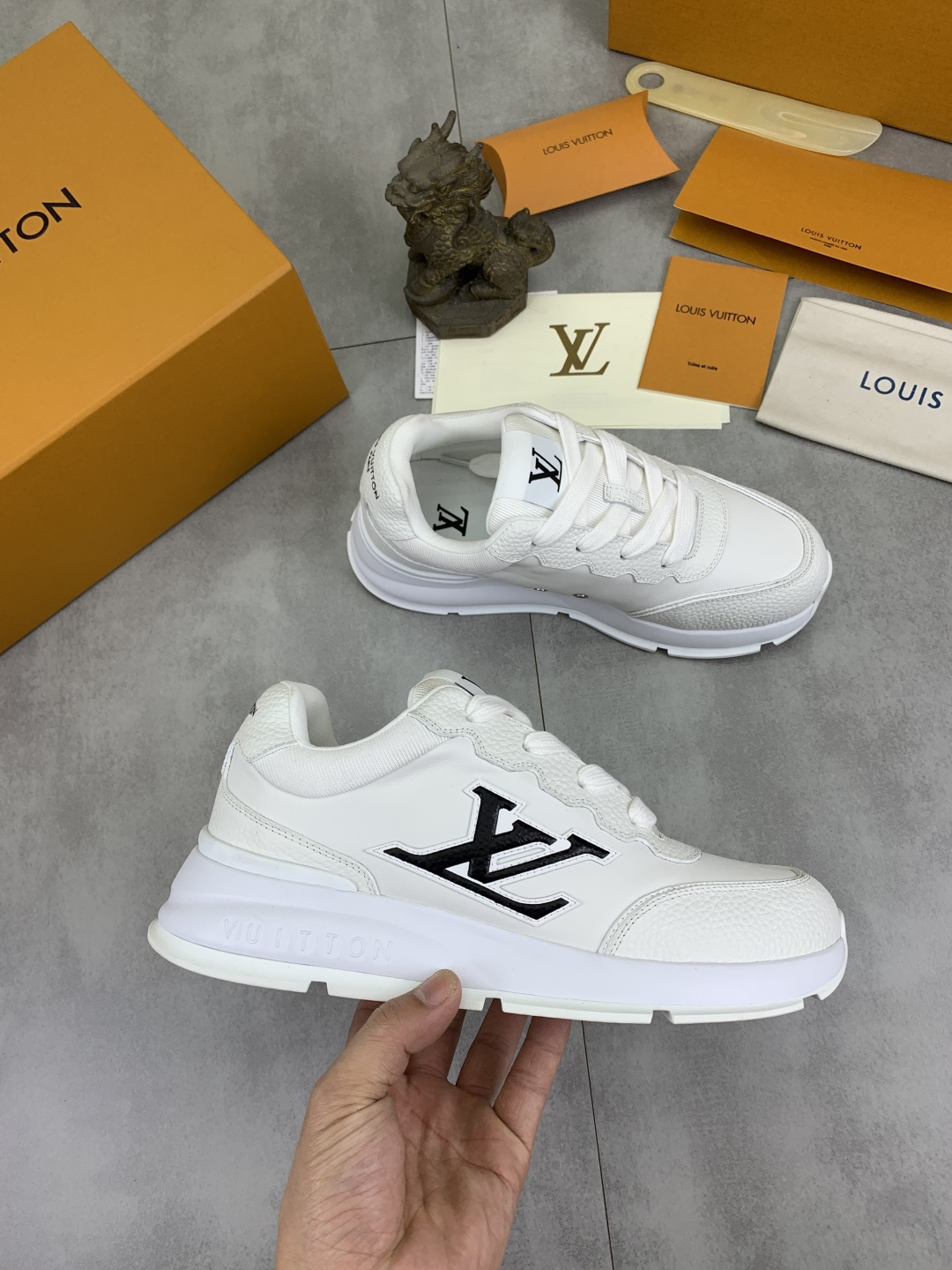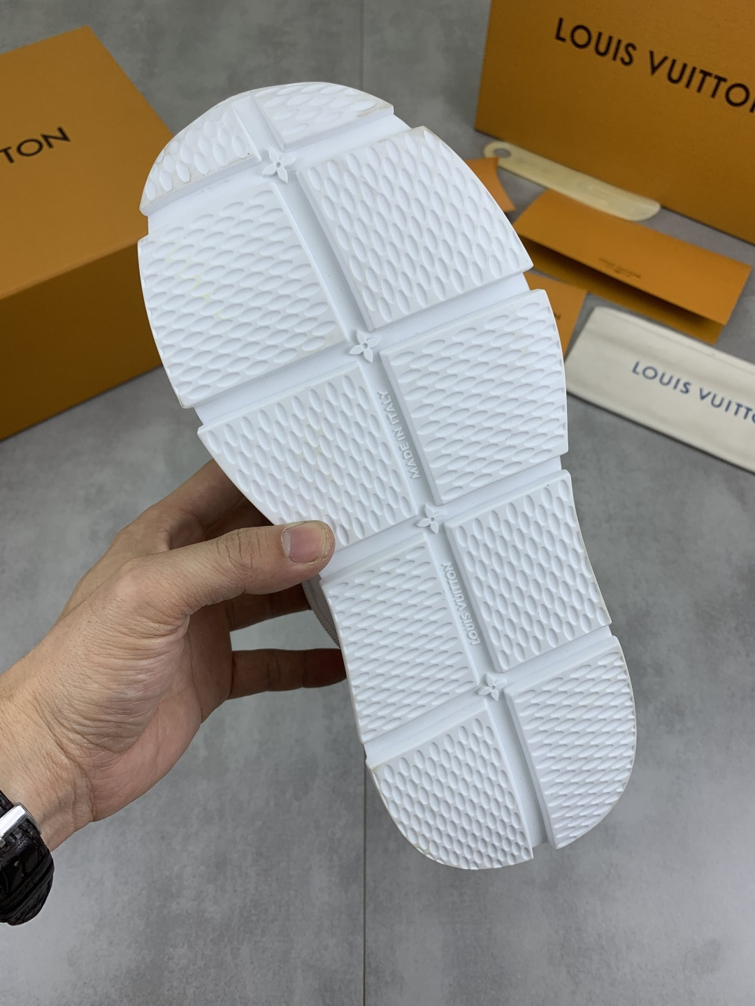 这款鞋子是AAAAA 1:1 质量 (非常棒). 使用了和原版一模一样的材料. 商标部分也保持了和路易威登/Louis Vuitton一样. 图片拍摄是实物鞋子拍摄, 您所收到的实物保证和我们图片一模一样.