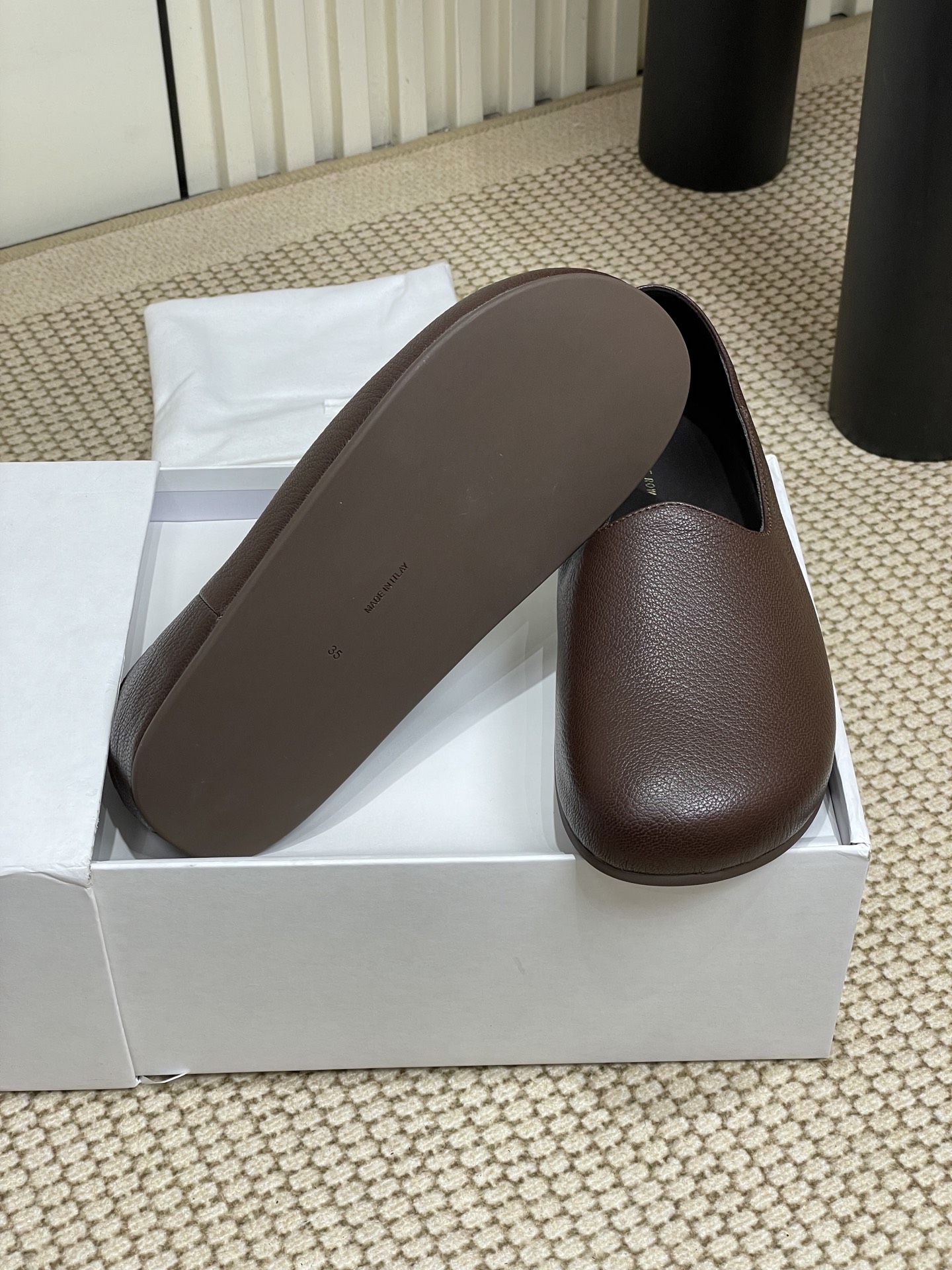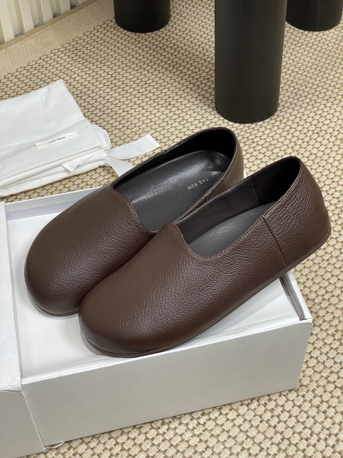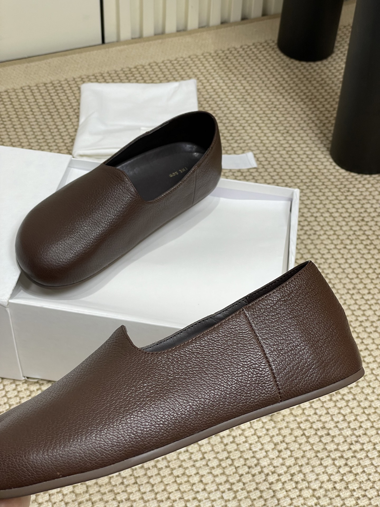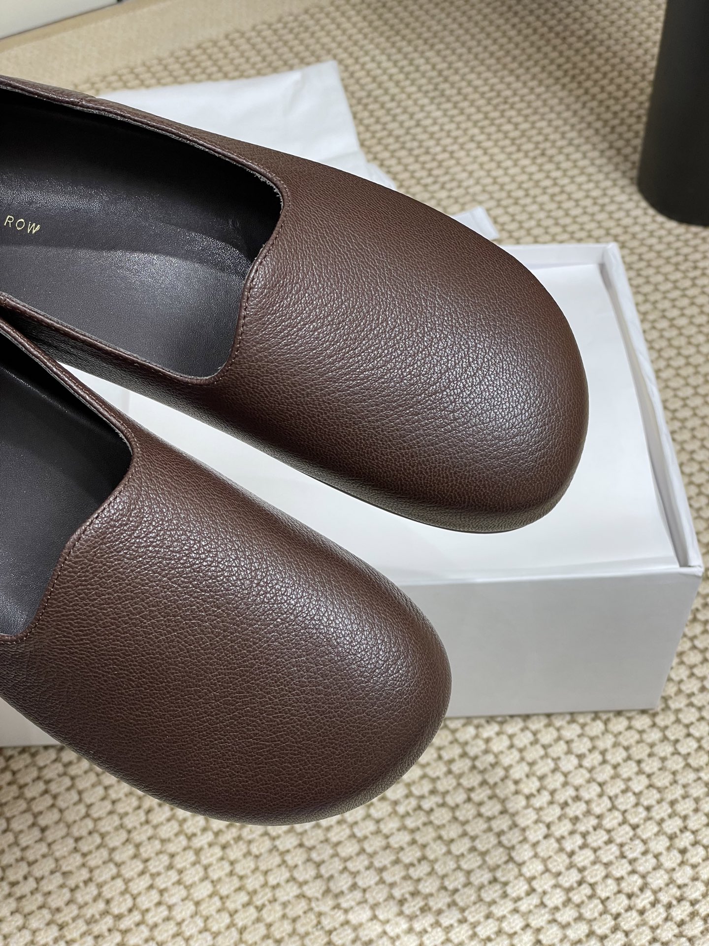 这款鞋子是AAAAA 1:1 质量 (非常棒). 使用了和原版一模一样的材料. 商标部分也保持了和The Row一样. 图片拍摄是实物鞋子拍摄, 您所收到的实物保证和我们图片一模一样.