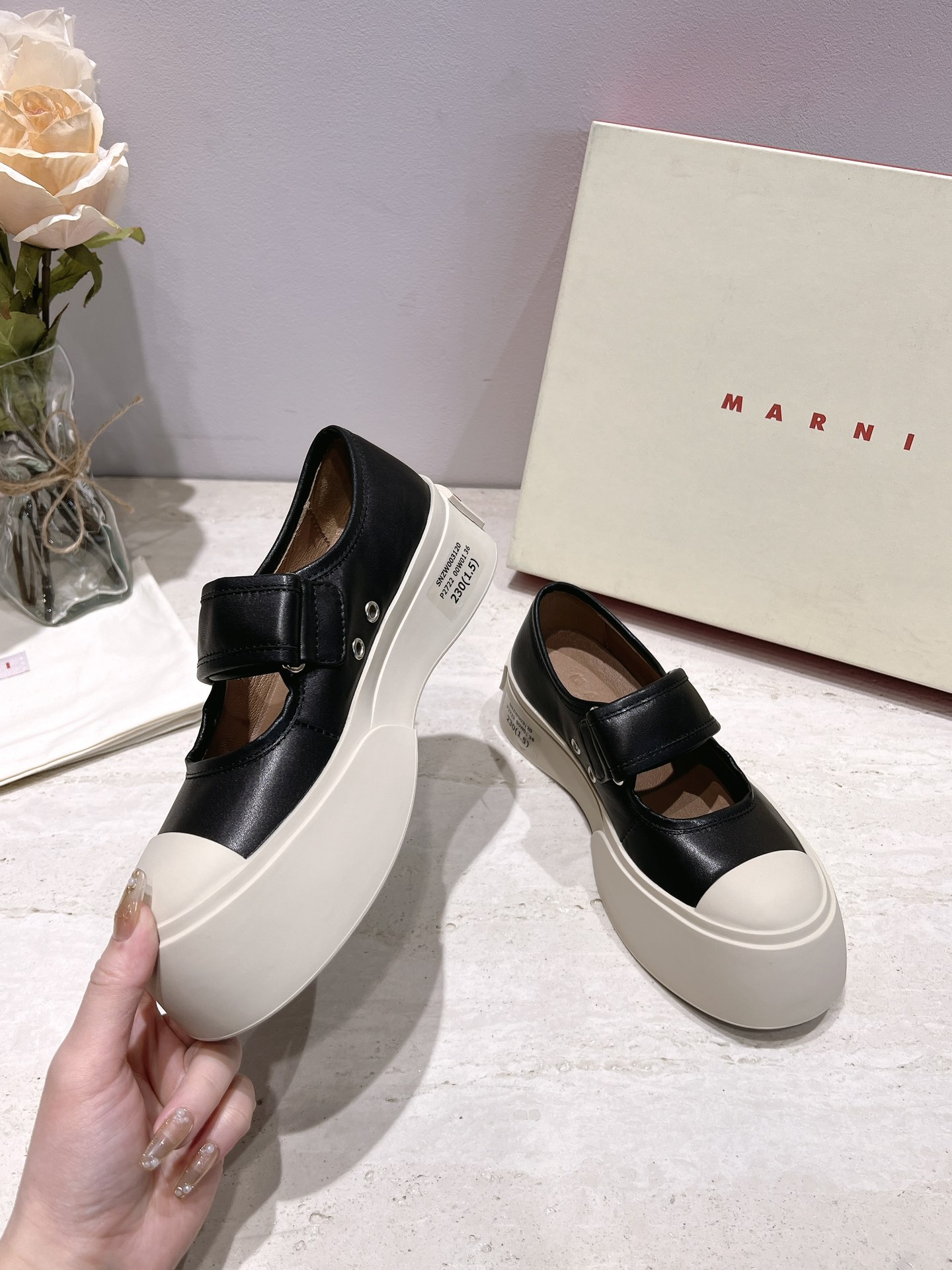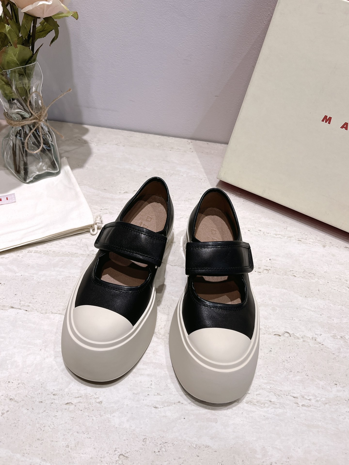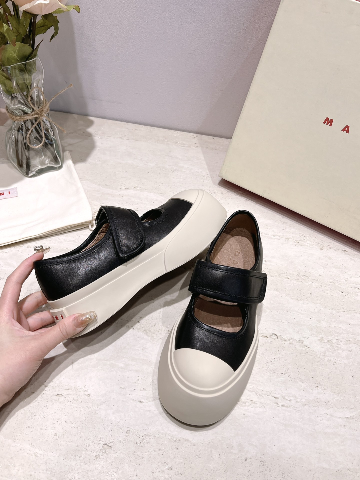 这款鞋子是AAAAA 1:1 质量 (非常棒). 使用了和原版一模一样的材料. 商标部分也保持了和马尔尼/Marni一样. 图片拍摄是实物鞋子拍摄, 您所收到的实物保证和我们图片一模一样.