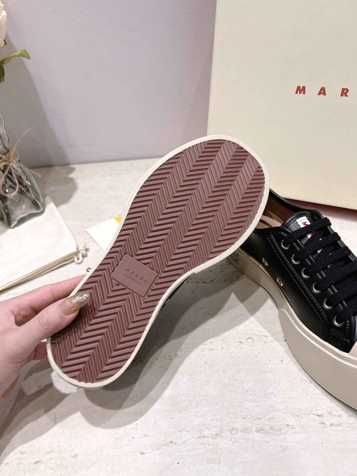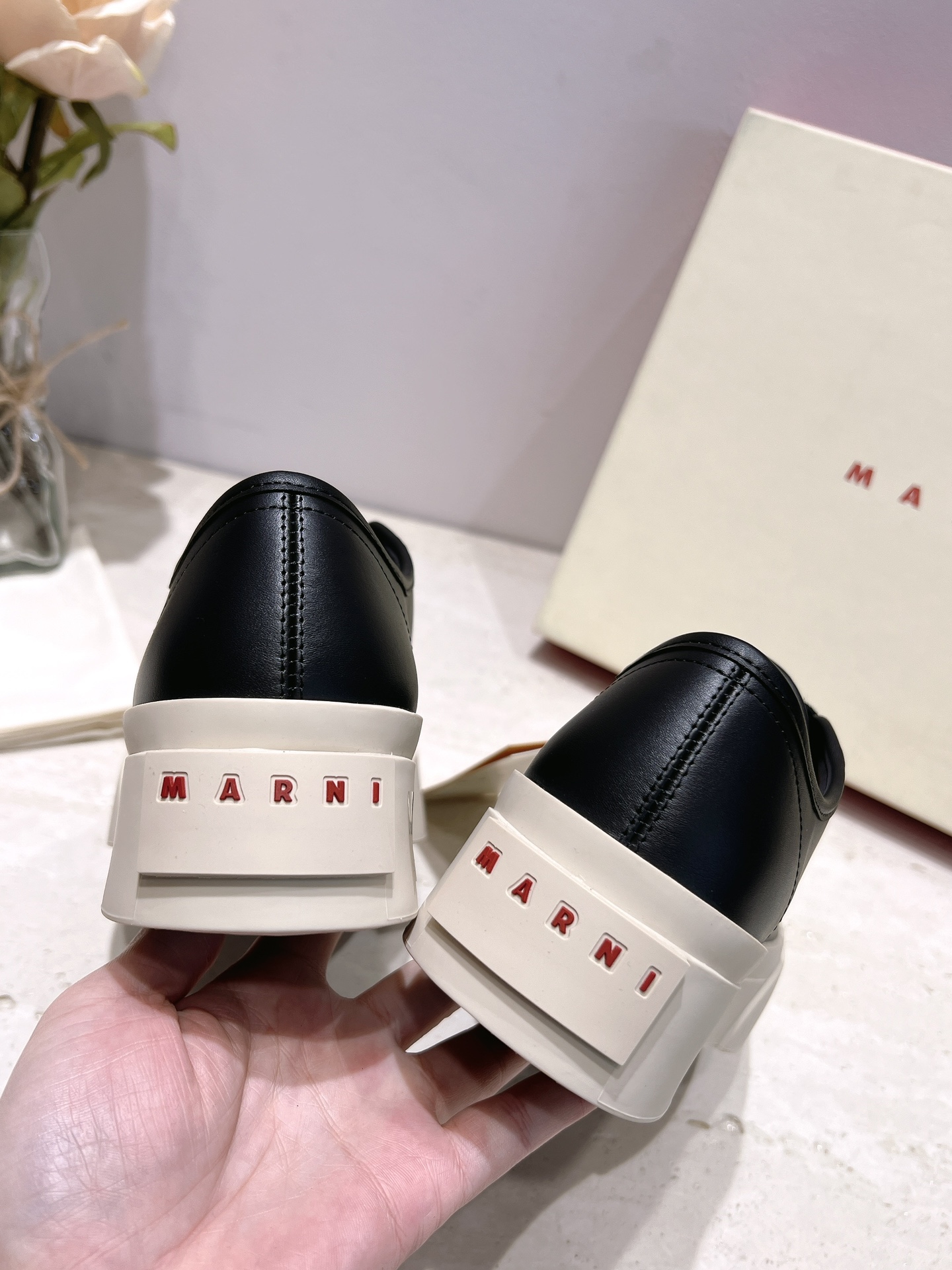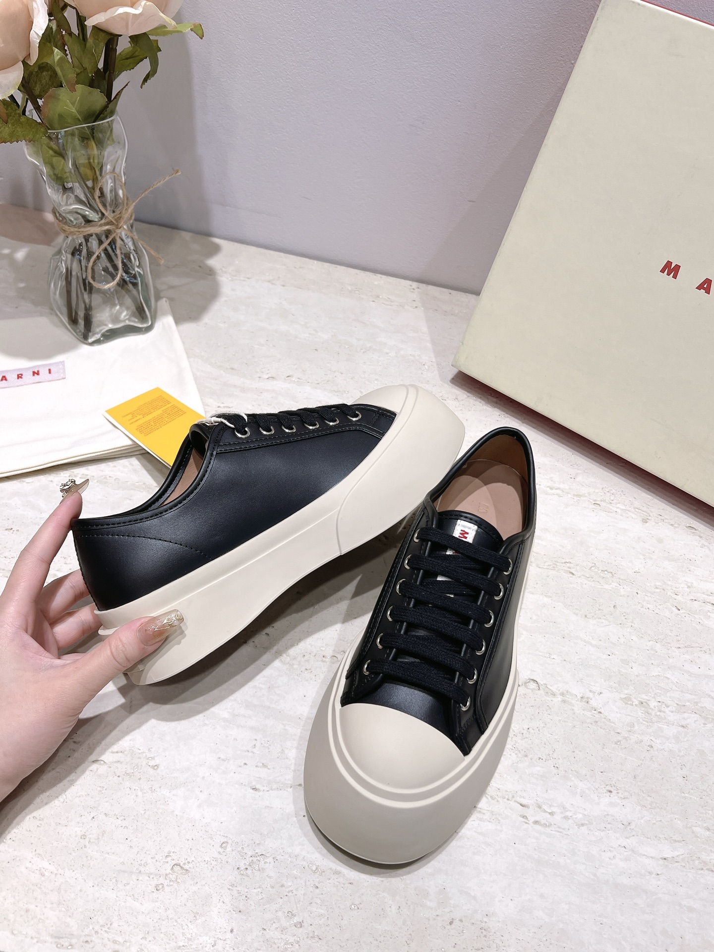 这款鞋子是AAAAA 1:1 质量 (非常棒). 使用了和原版一模一样的材料. 商标部分也保持了和马尔尼/Marni一样. 图片拍摄是实物鞋子拍摄, 您所收到的实物保证和我们图片一模一样.
