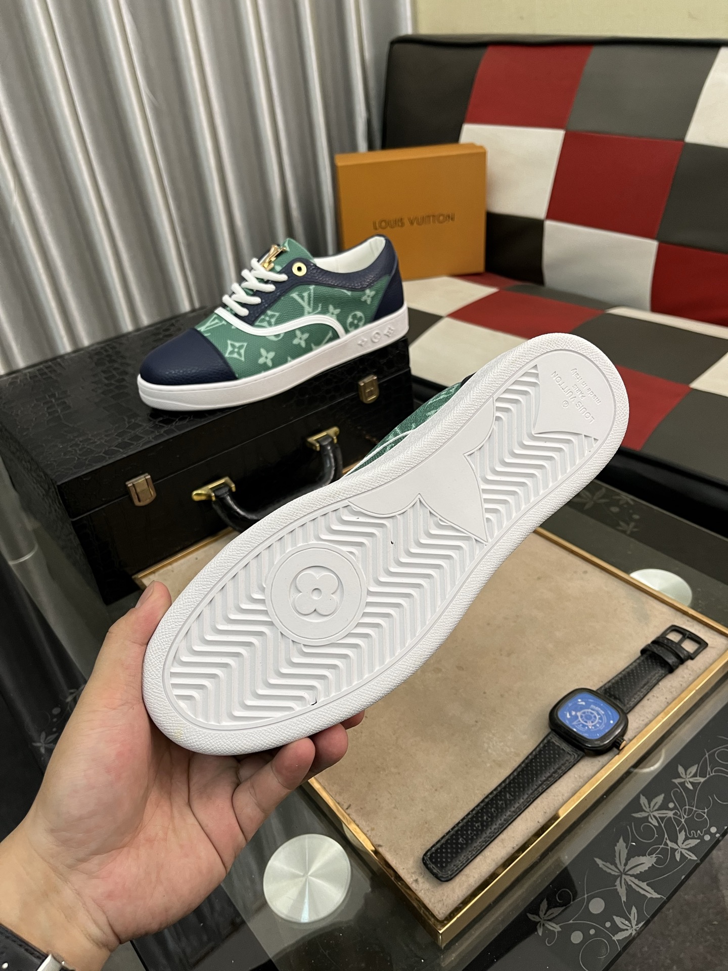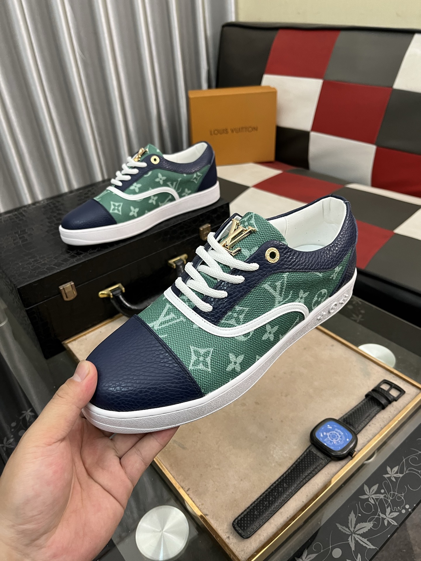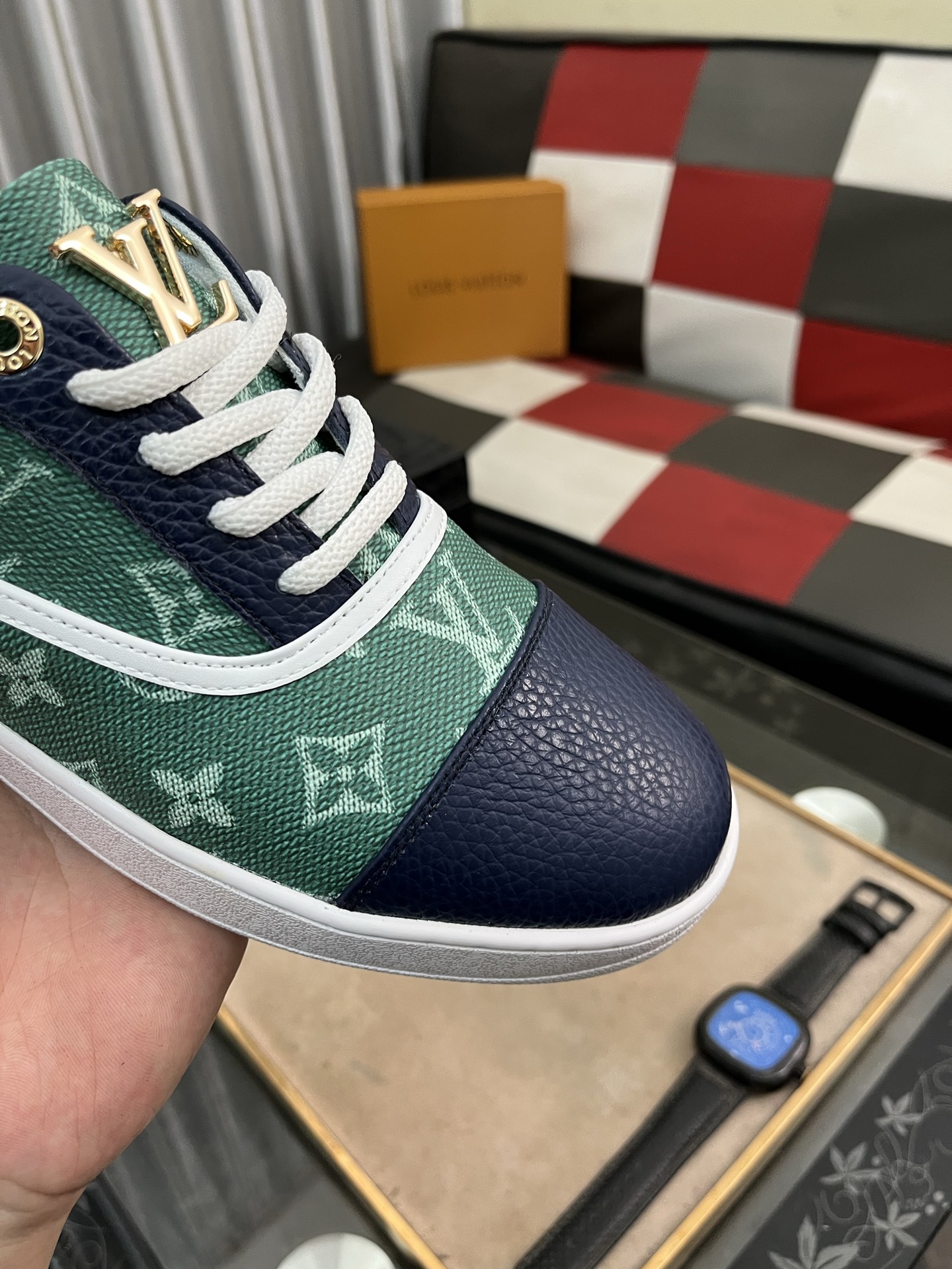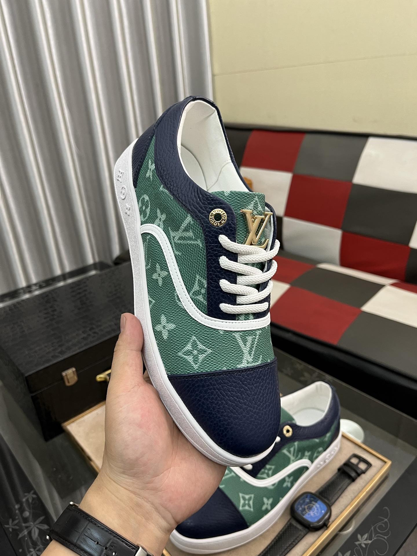 这款鞋子是AAAAA 1:1 质量 (非常棒). 使用了和原版一模一样的材料. 商标部分也保持了和路易威登/Louis Vuitton一样. 图片拍摄是实物鞋子拍摄, 您所收到的实物保证和我们图片一模一样.