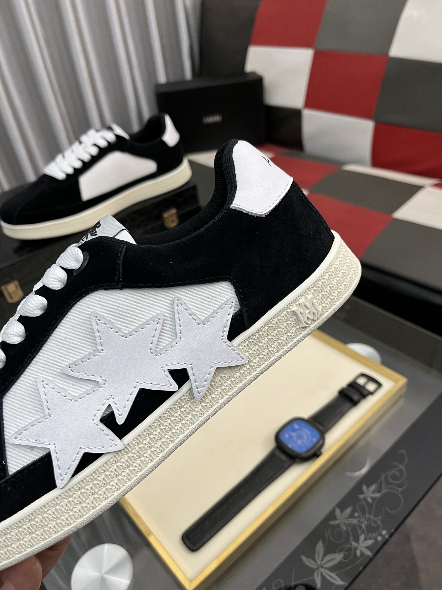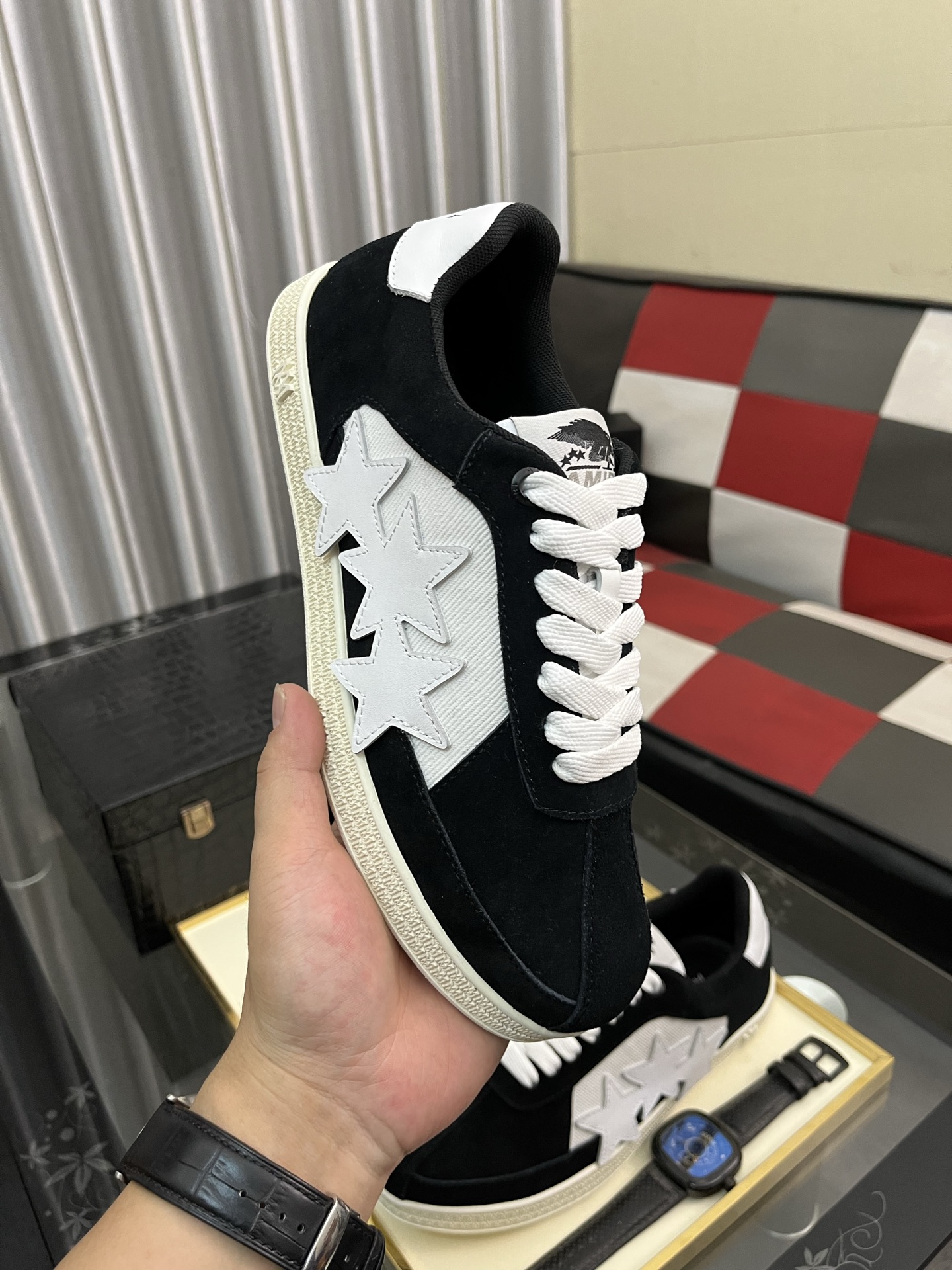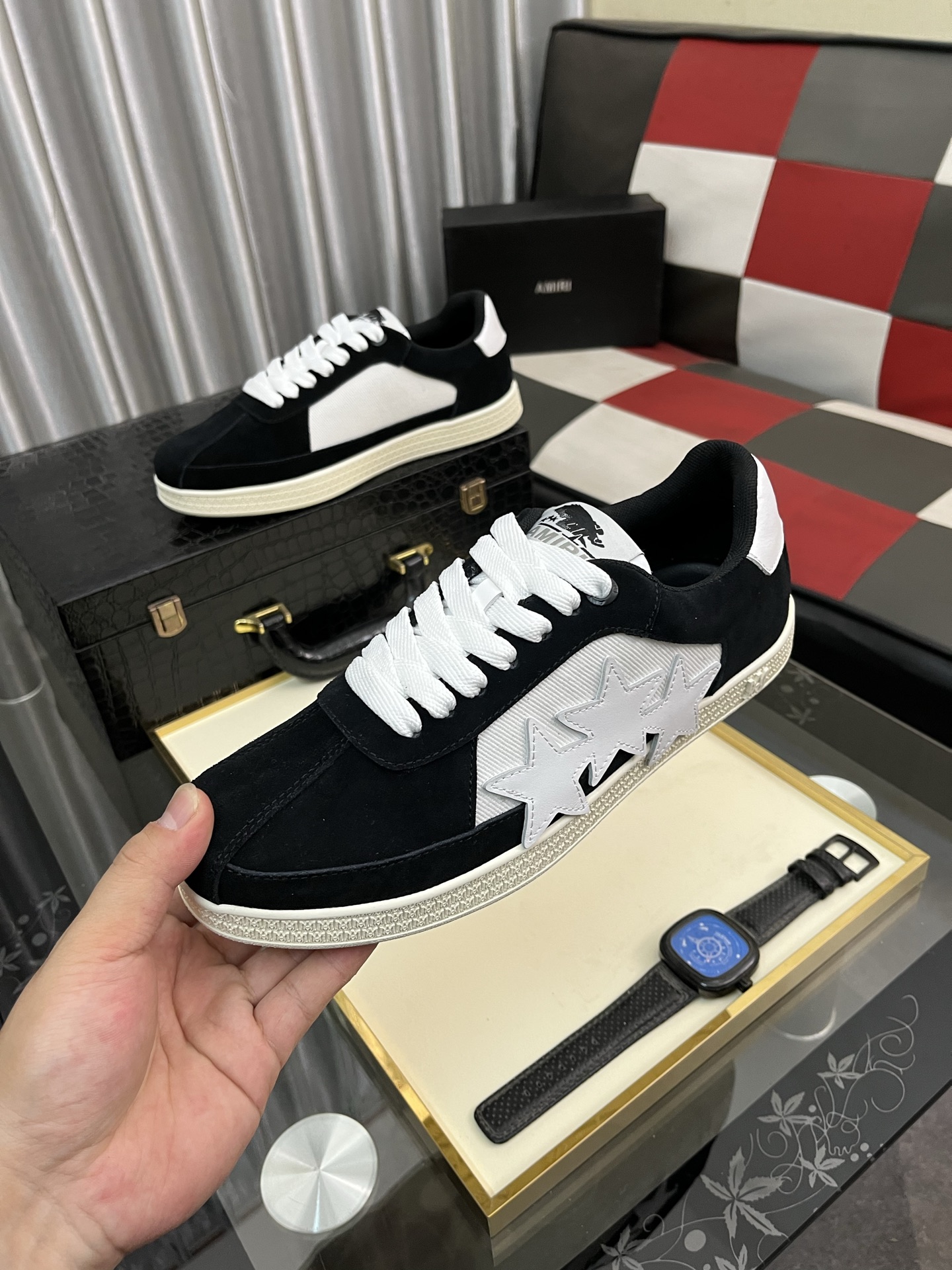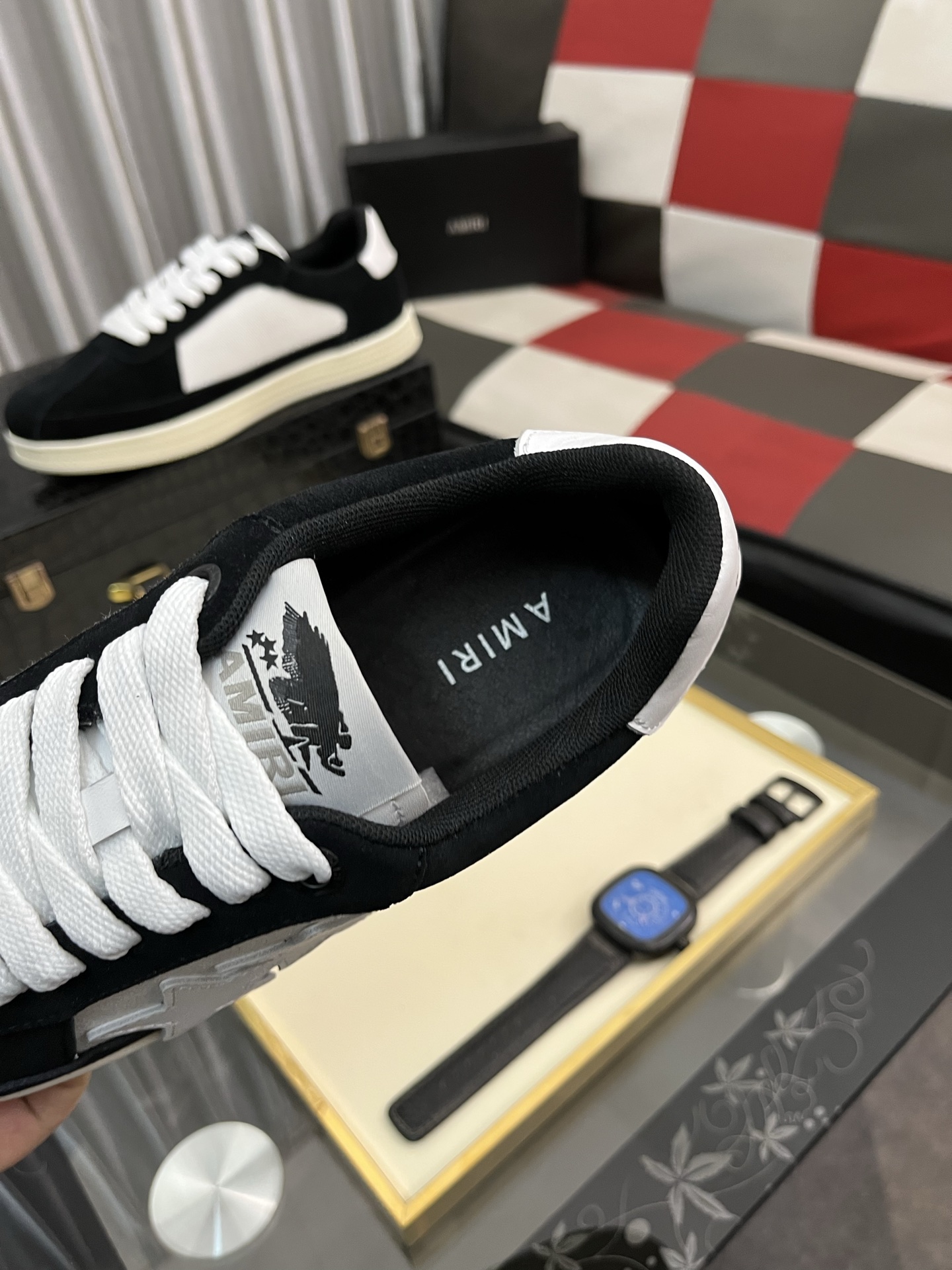 这款鞋子是AAAAA 1:1 质量 (非常棒). 使用了和原版一模一样的材料. 商标部分也保持了和AMIRI一样. 图片拍摄是实物鞋子拍摄, 您所收到的实物保证和我们图片一模一样.