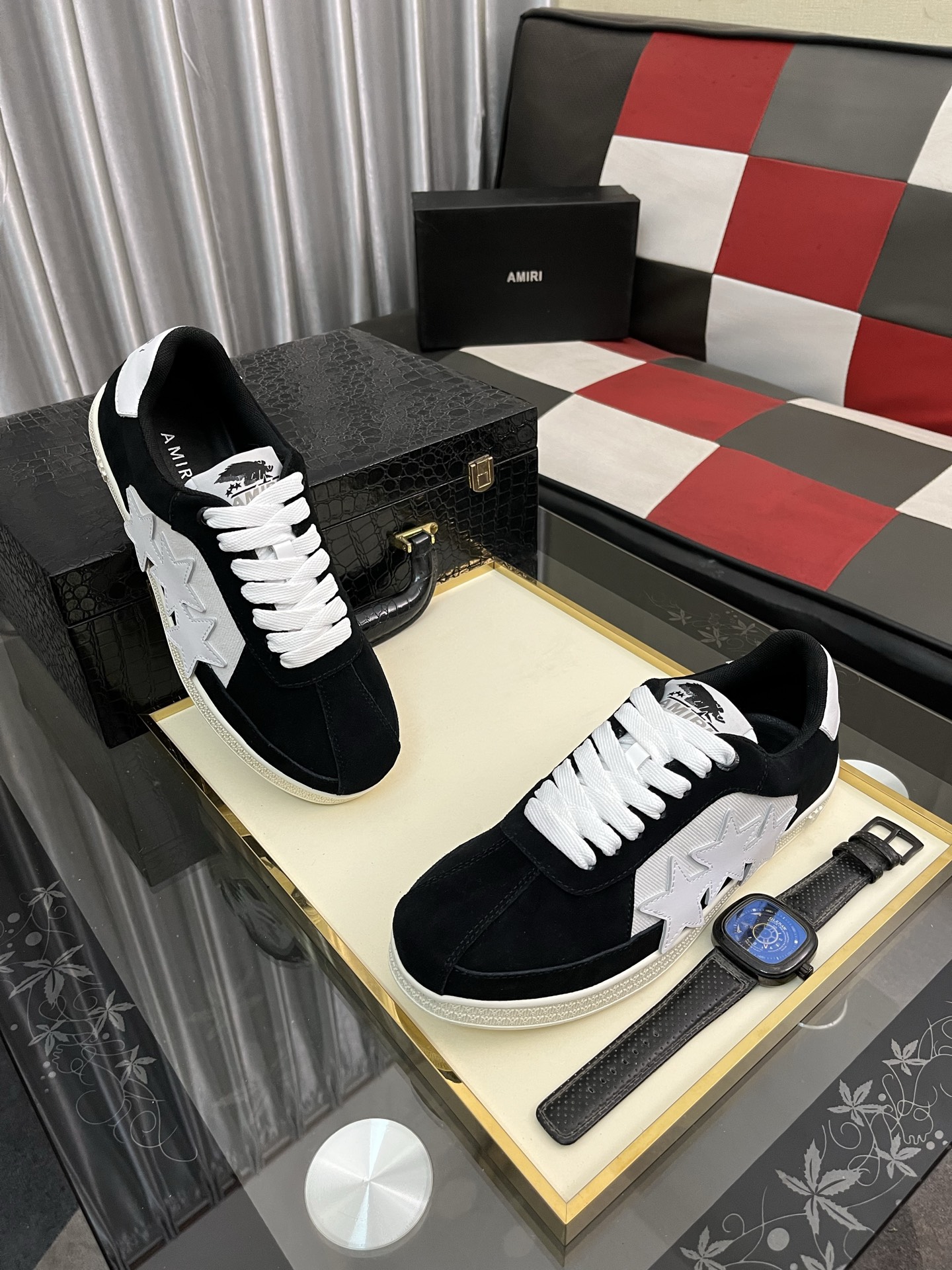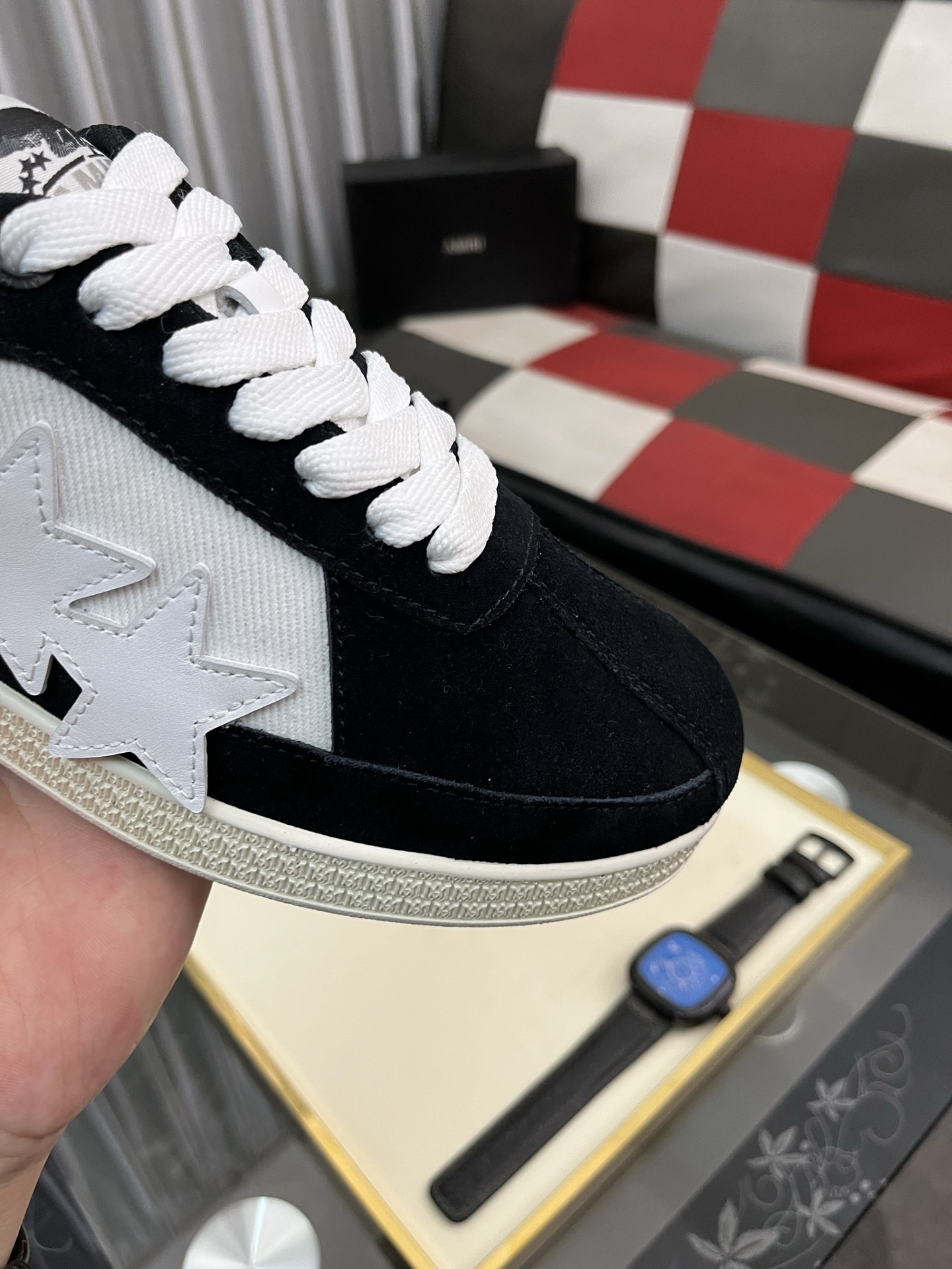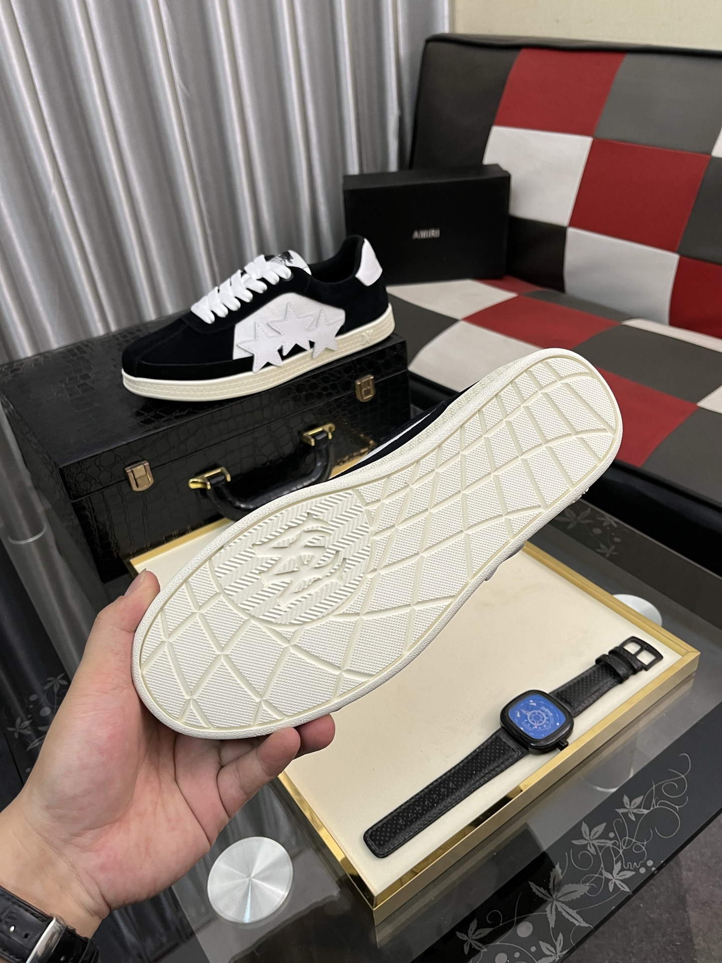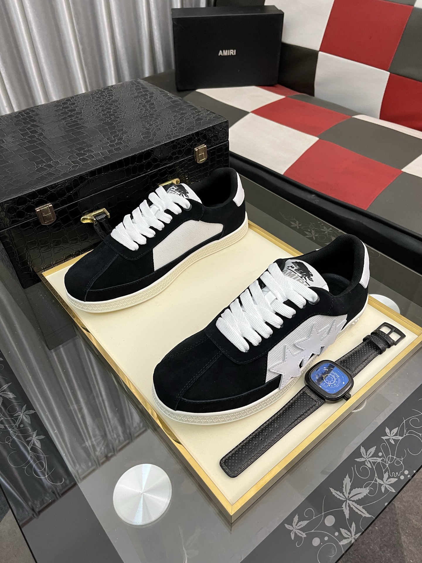 这款鞋子是AAAAA 1:1 质量 (非常棒). 使用了和原版一模一样的材料. 商标部分也保持了和AMIRI一样. 图片拍摄是实物鞋子拍摄, 您所收到的实物保证和我们图片一模一样.