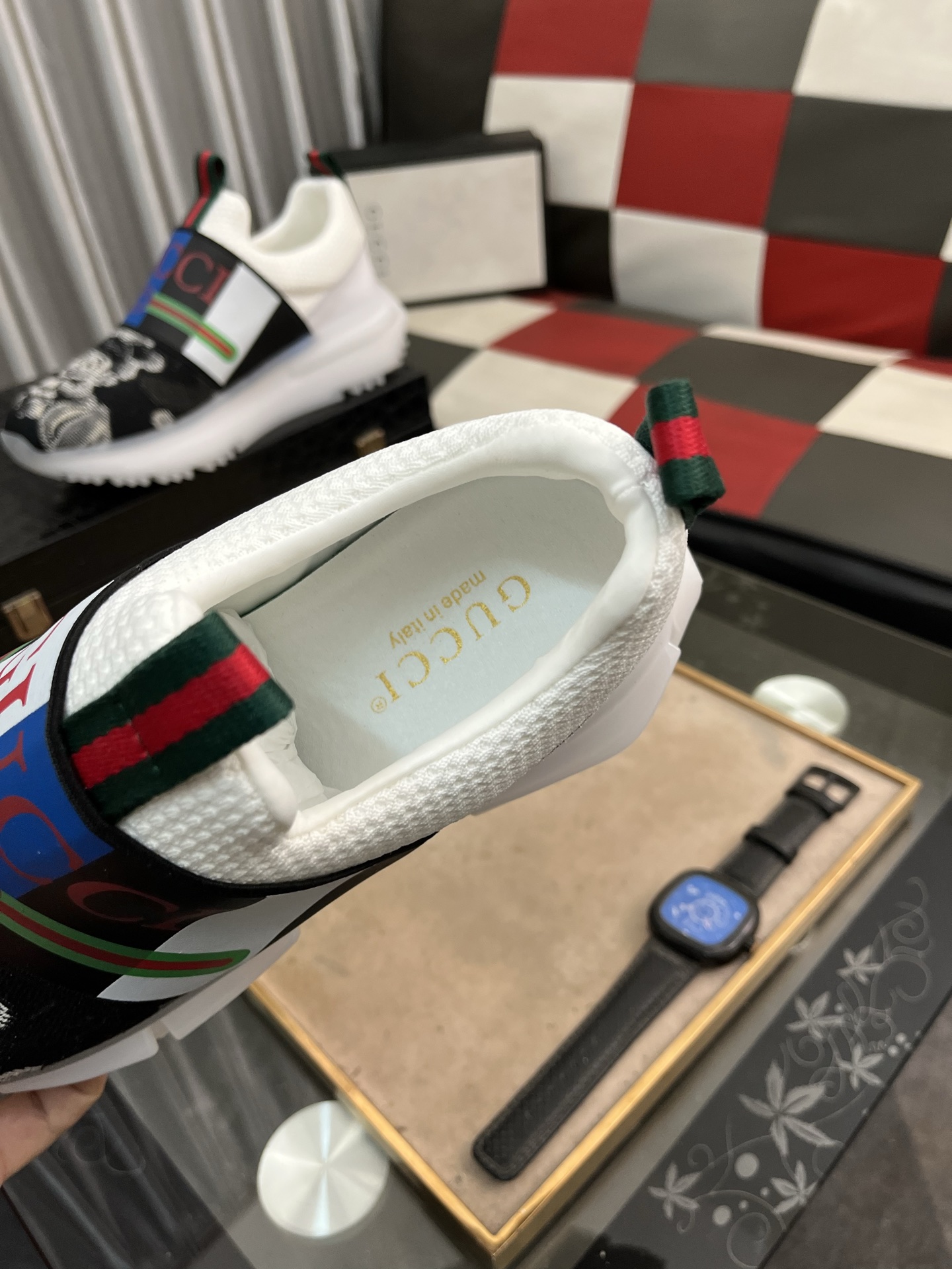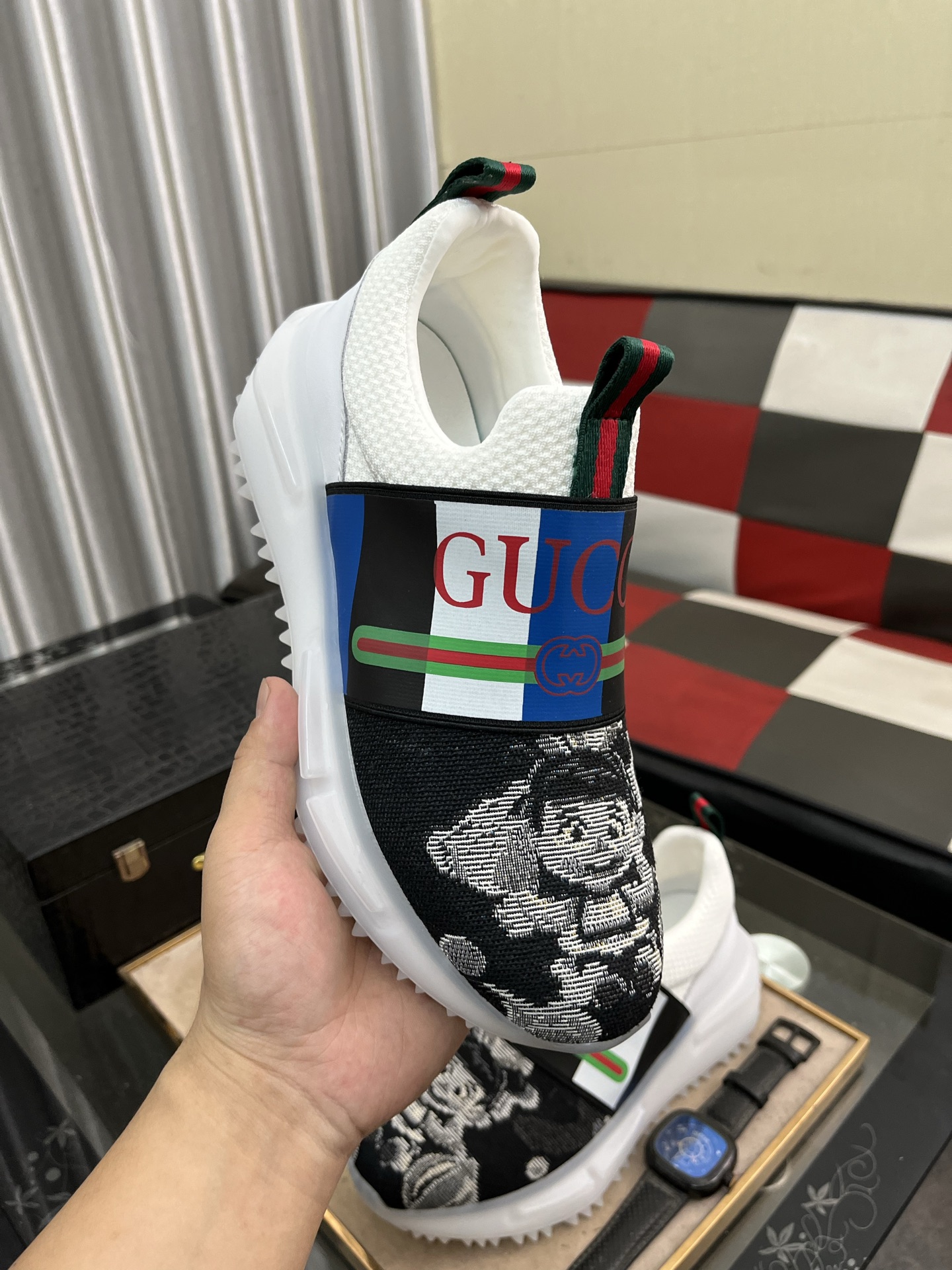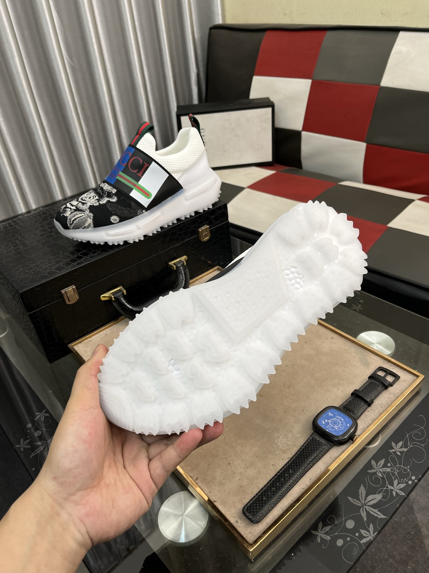 这款鞋子是AAAAA 1:1 质量 (非常棒). 使用了和原版一模一样的材料. 商标部分也保持了和古奇/Gucci一样. 图片拍摄是实物鞋子拍摄, 您所收到的实物保证和我们图片一模一样.