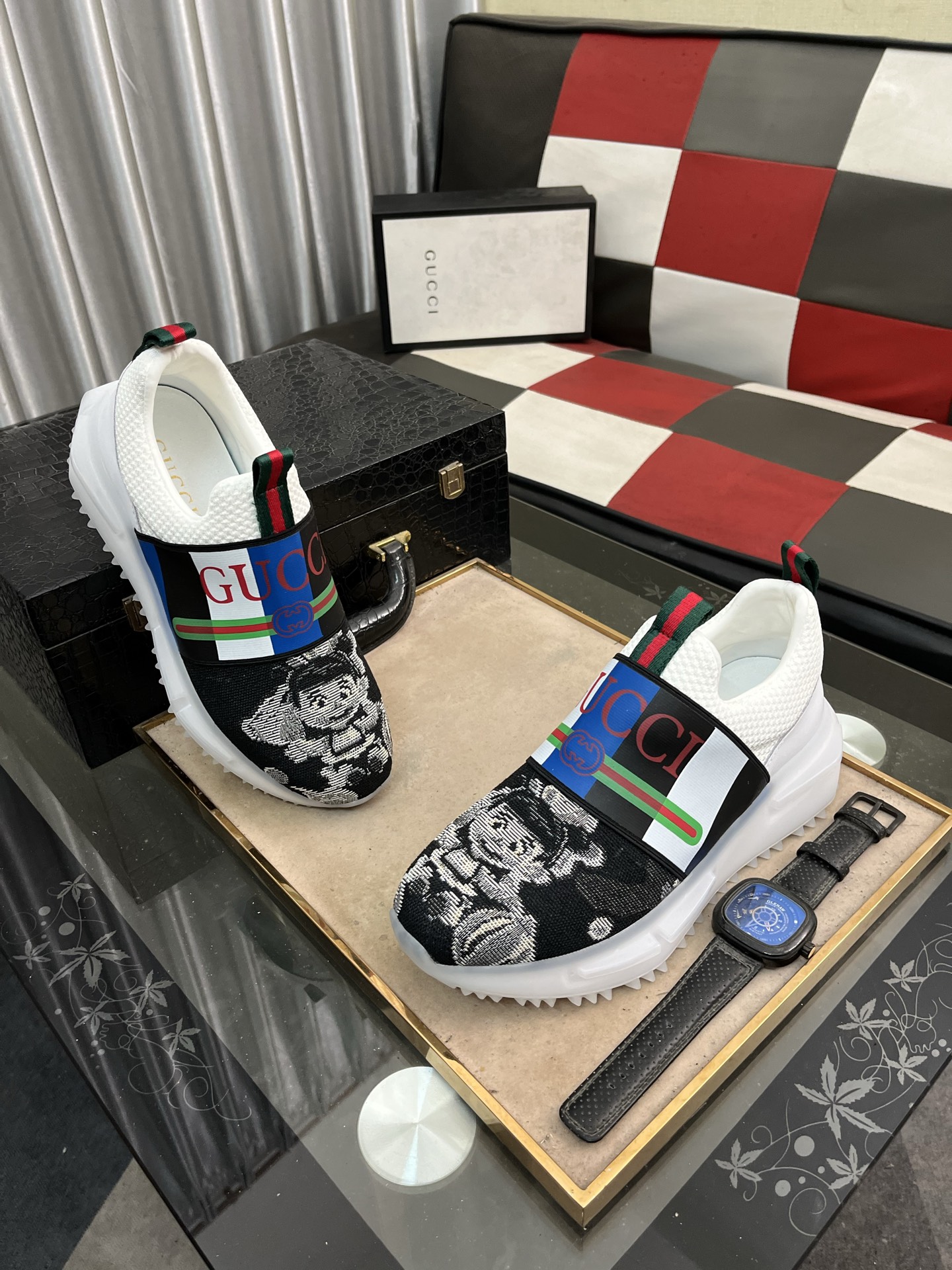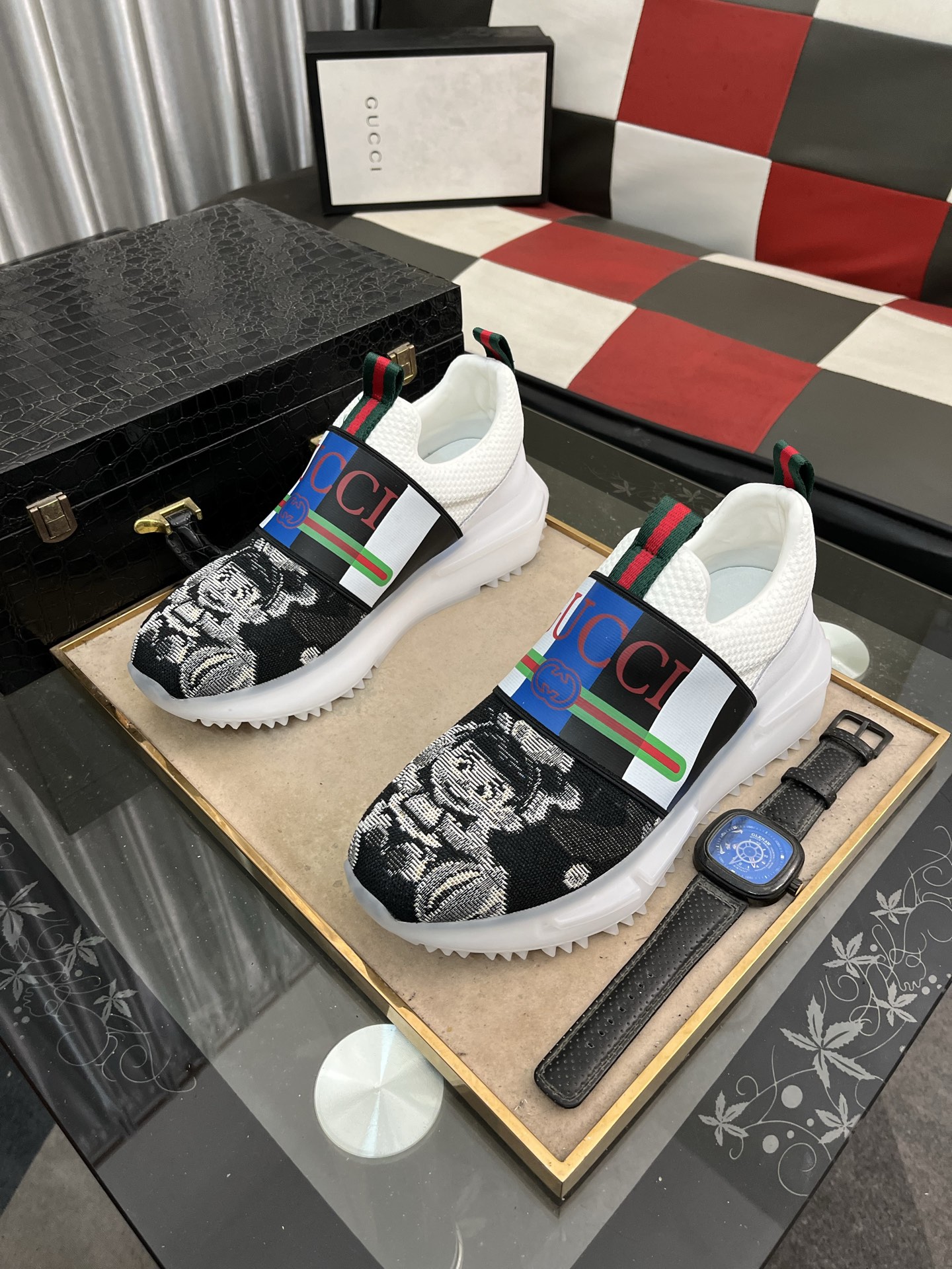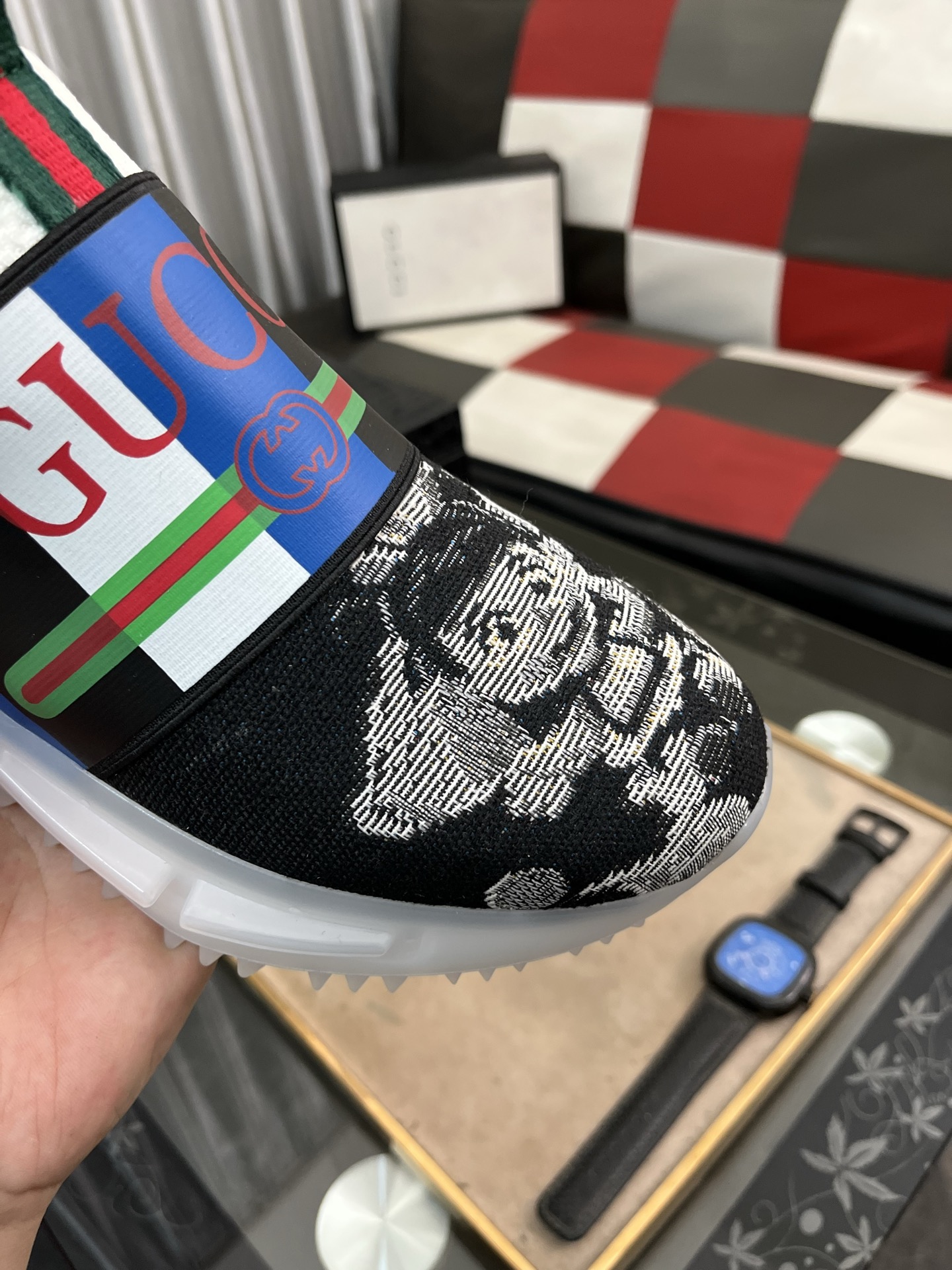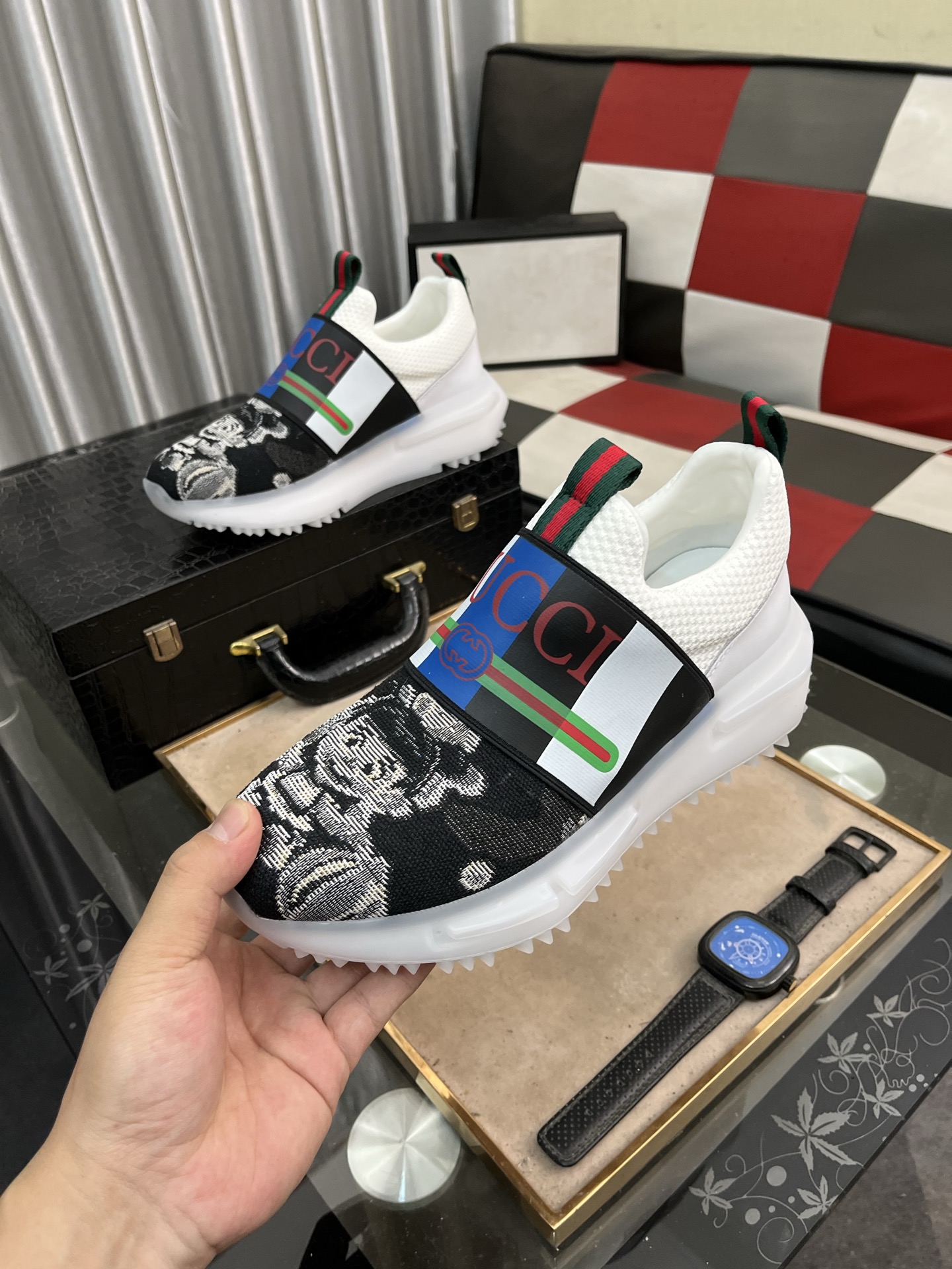 这款鞋子是AAAAA 1:1 质量 (非常棒). 使用了和原版一模一样的材料. 商标部分也保持了和古奇/Gucci一样. 图片拍摄是实物鞋子拍摄, 您所收到的实物保证和我们图片一模一样.