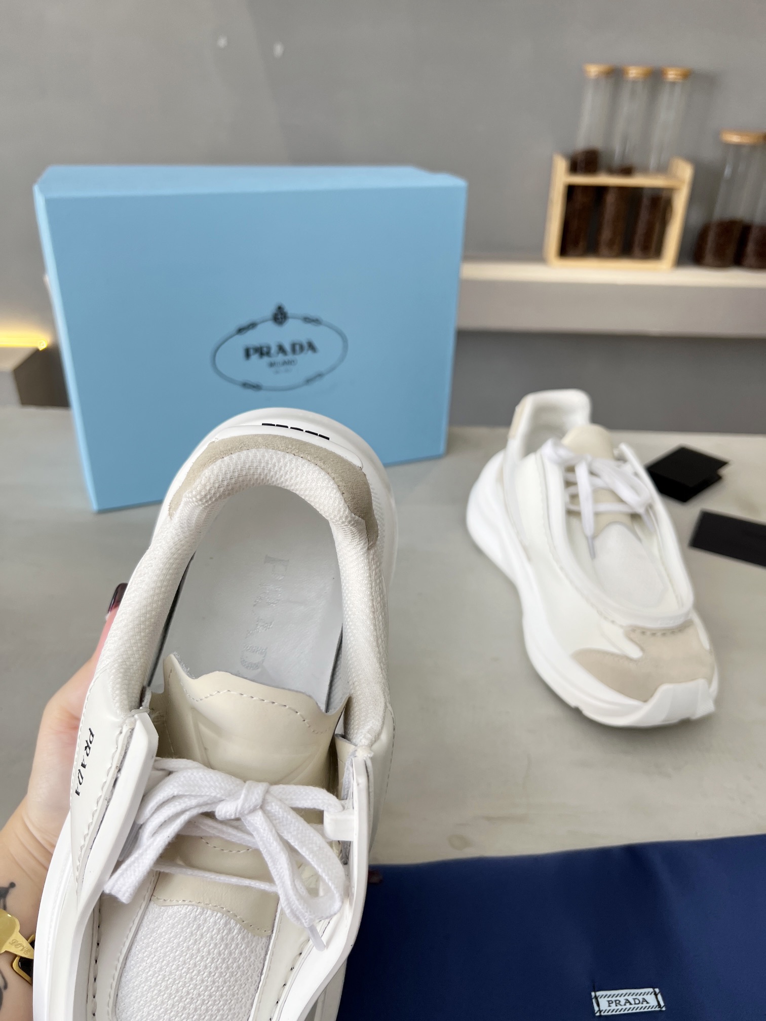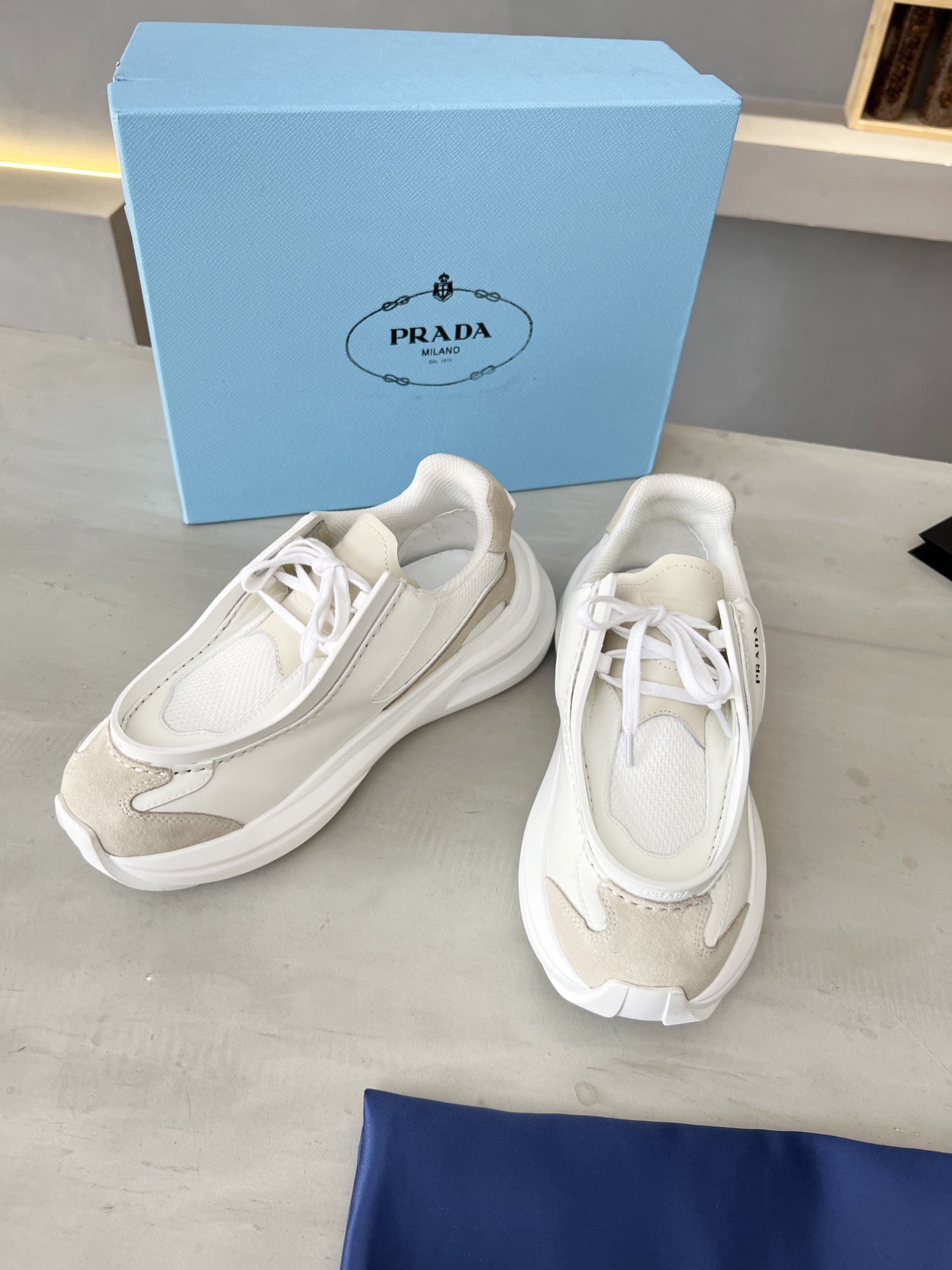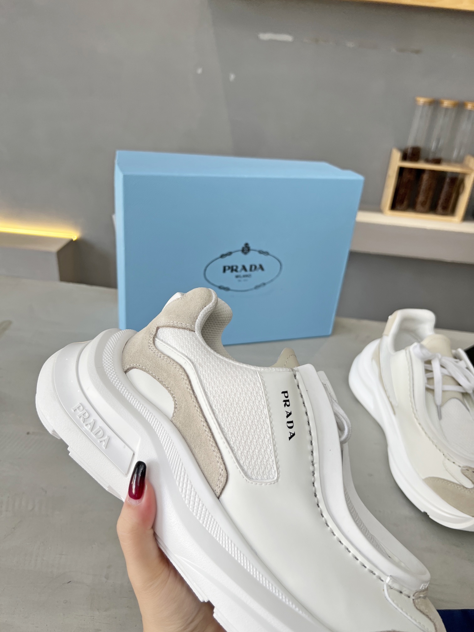 这款鞋子是AAAAA 1:1 质量 (非常棒). 使用了和原版一模一样的材料. 商标部分也保持了和普拉达/Prada一样. 图片拍摄是实物鞋子拍摄, 您所收到的实物保证和我们图片一模一样.