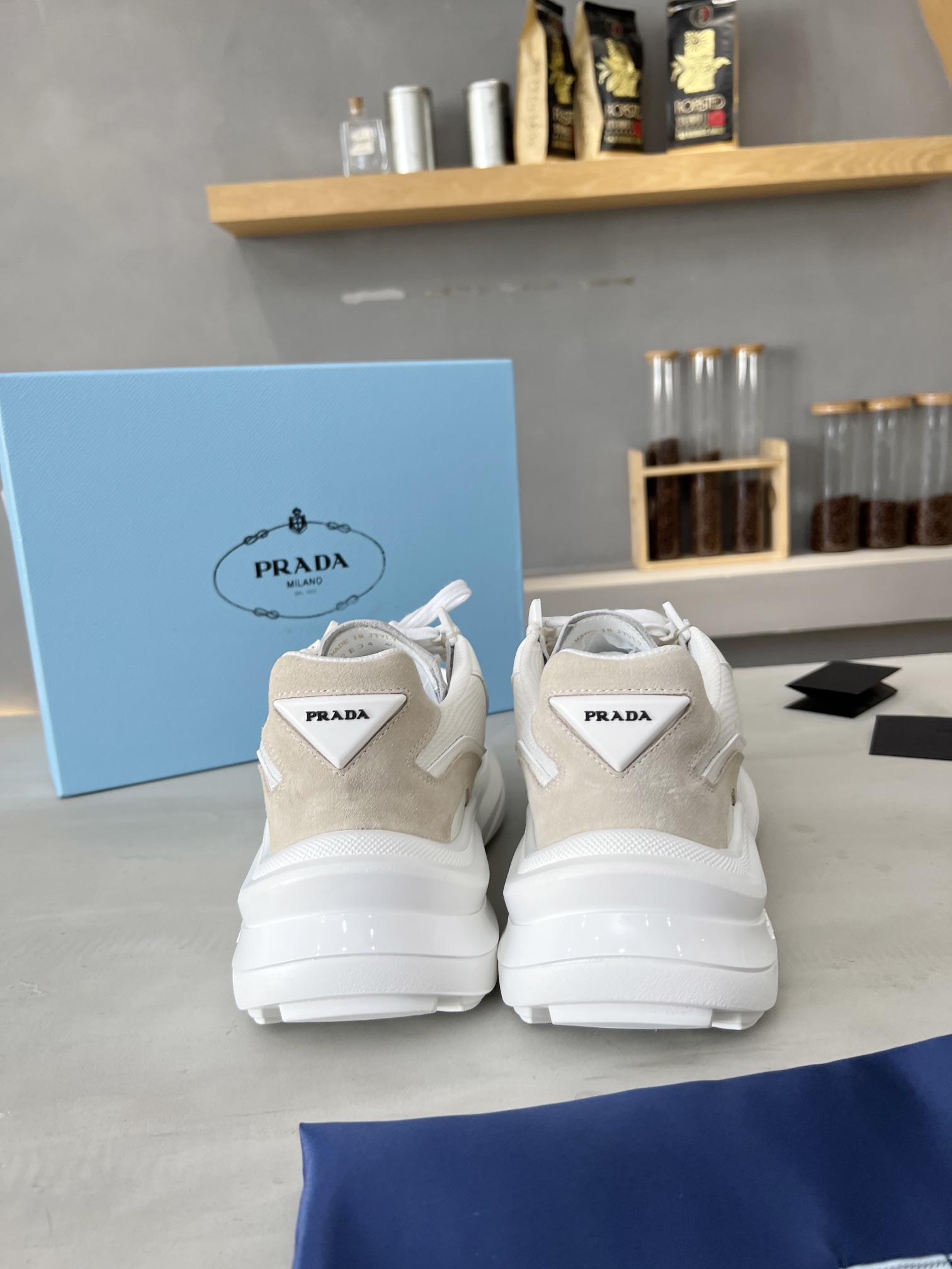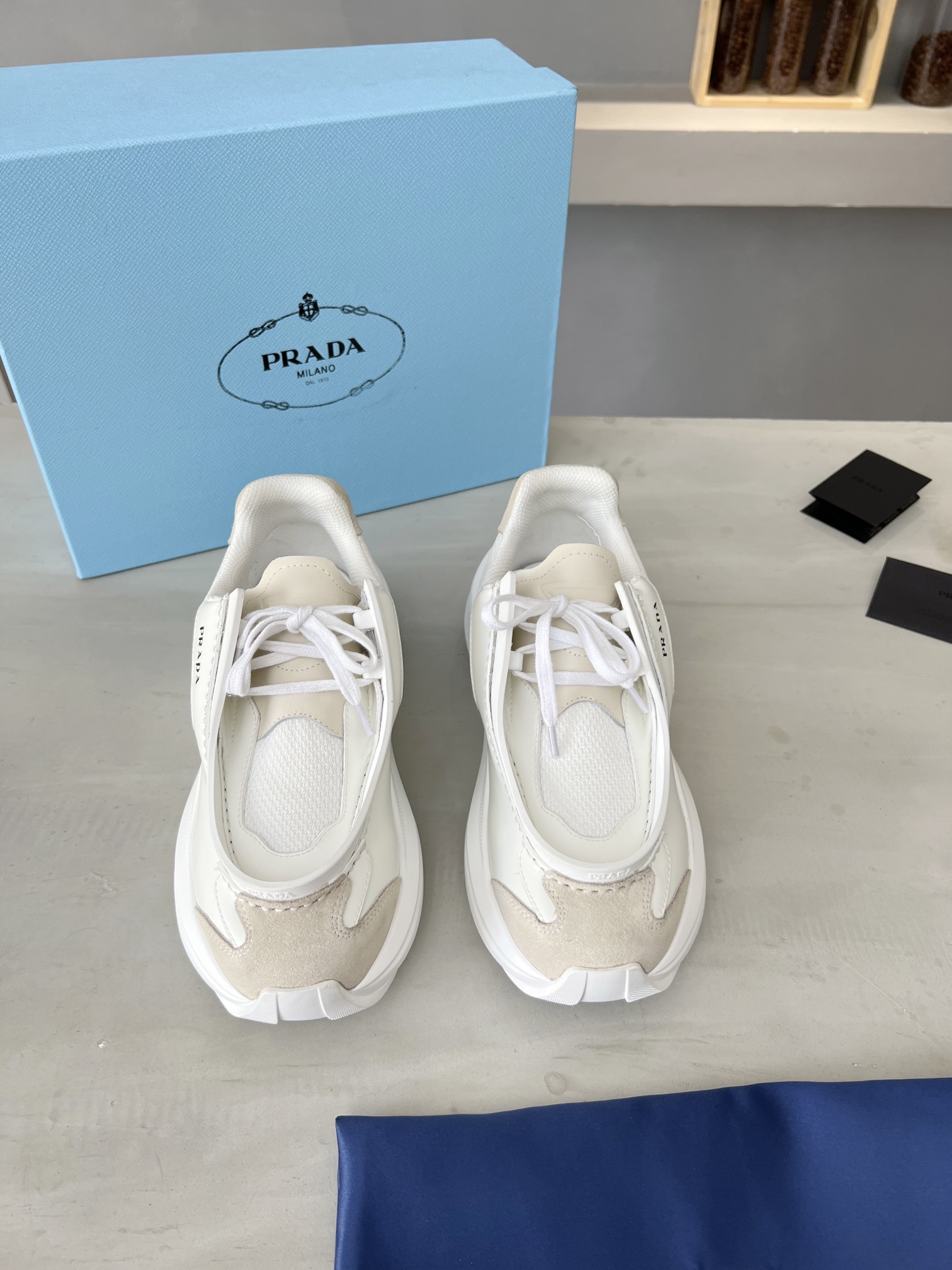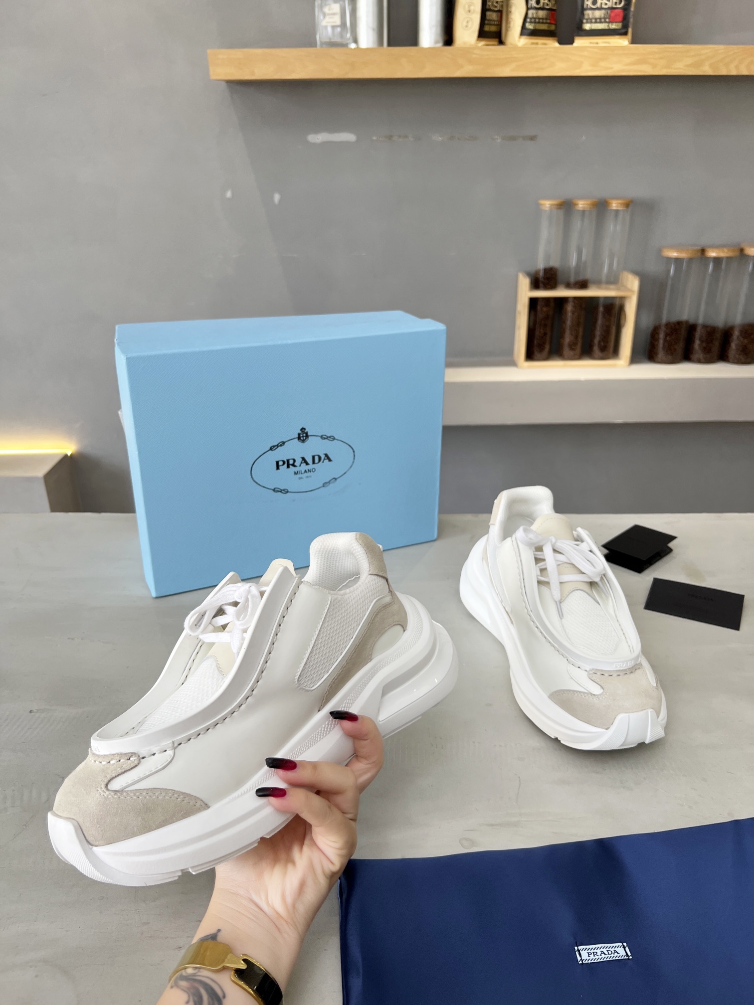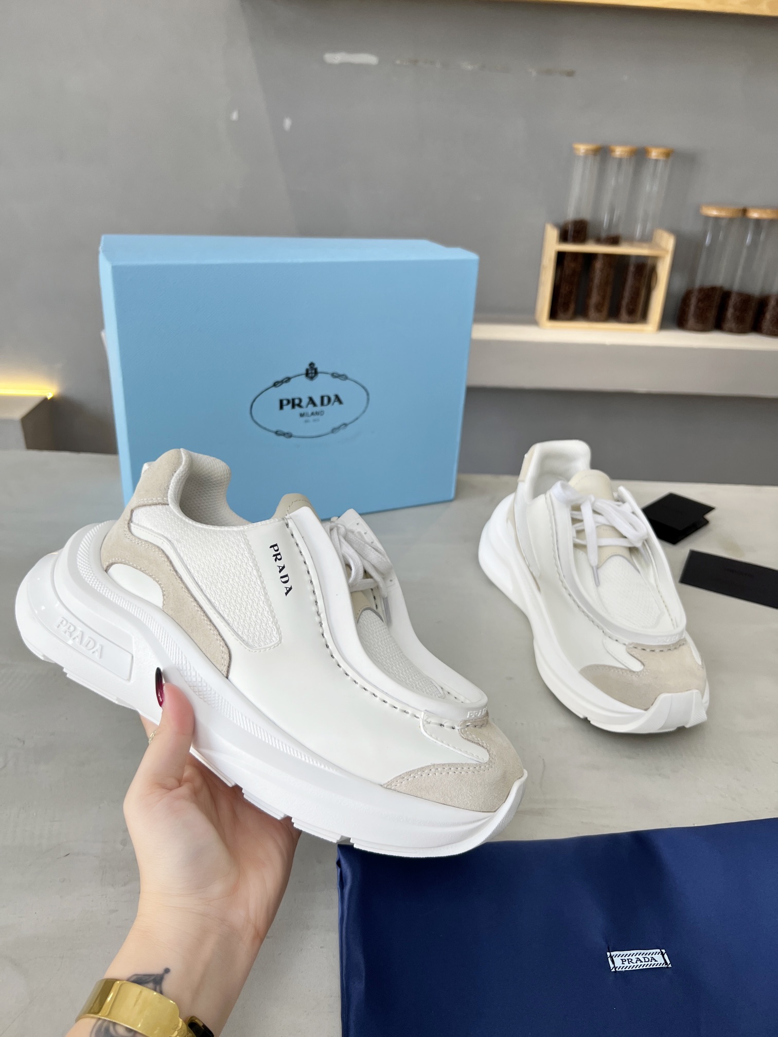 这款鞋子是AAAAA 1:1 质量 (非常棒). 使用了和原版一模一样的材料. 商标部分也保持了和普拉达/Prada一样. 图片拍摄是实物鞋子拍摄, 您所收到的实物保证和我们图片一模一样.
