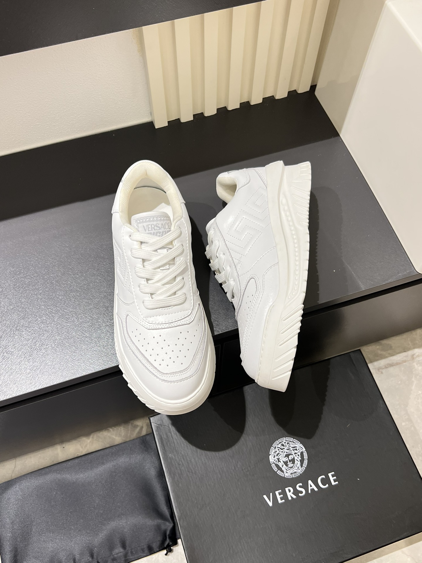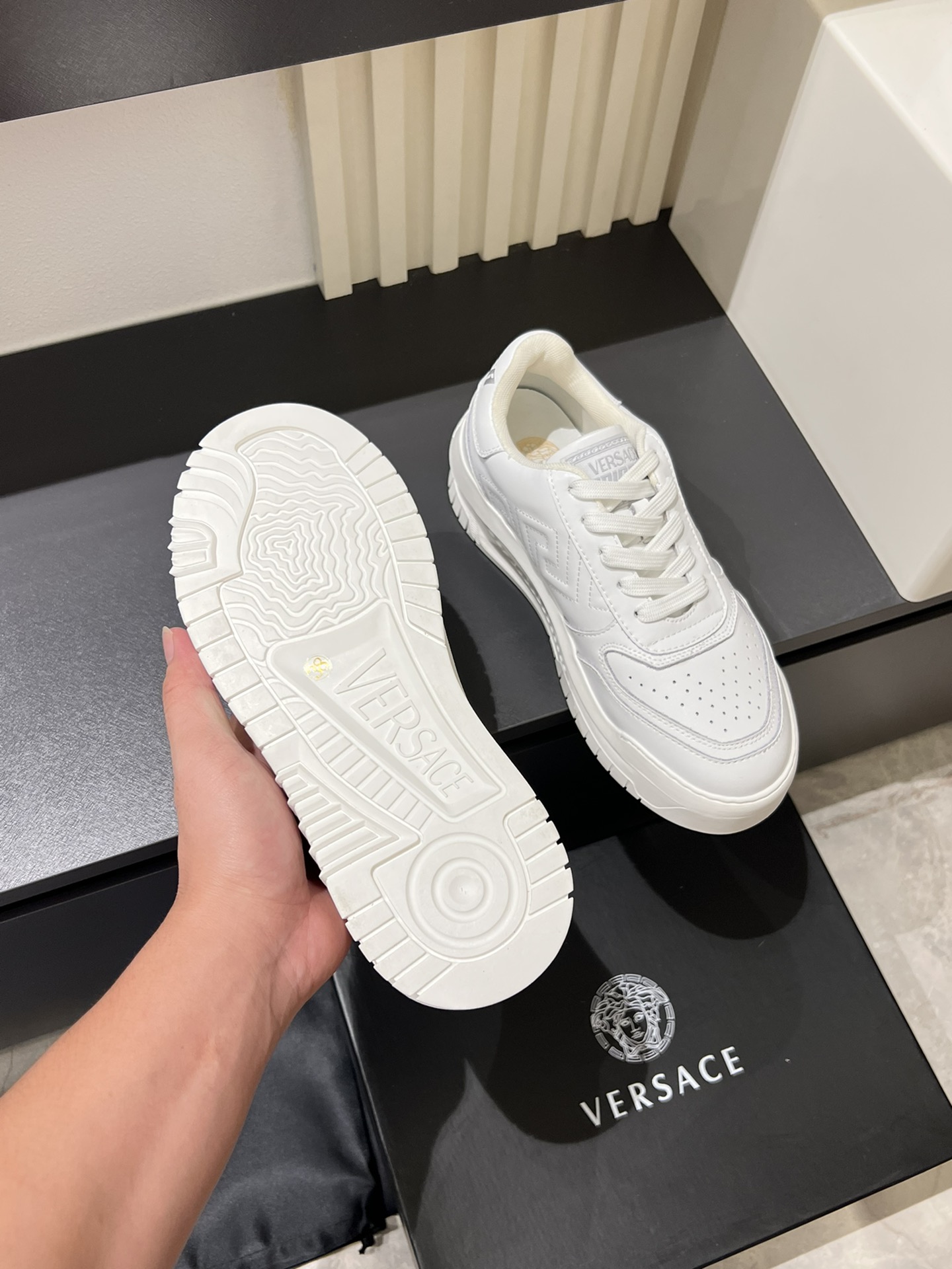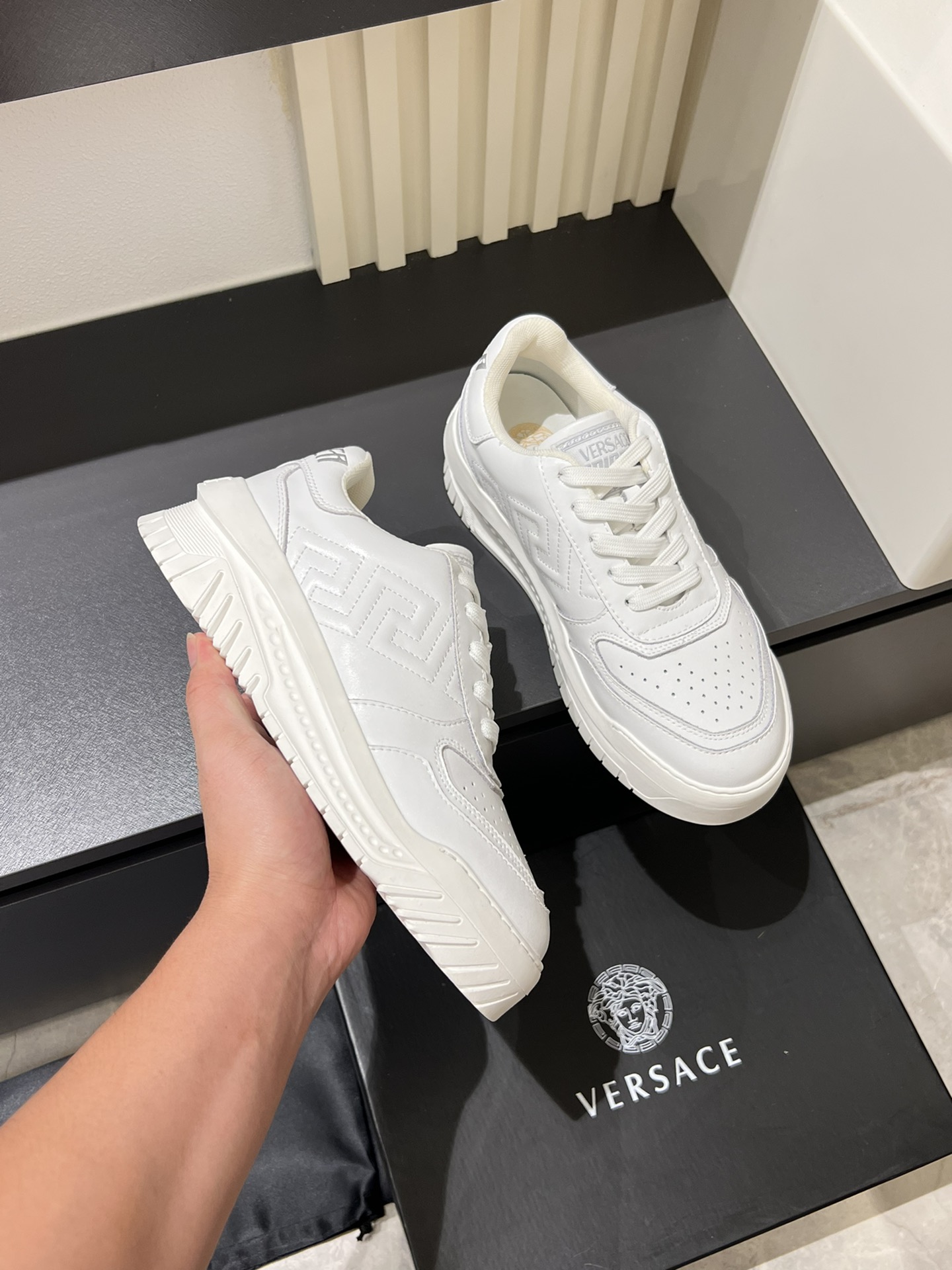 这款鞋子是AAAAA 1:1 质量 (非常棒). 使用了和原版一模一样的材料. 商标部分也保持了和范思哲/Versace一样. 图片拍摄是实物鞋子拍摄, 您所收到的实物保证和我们图片一模一样.