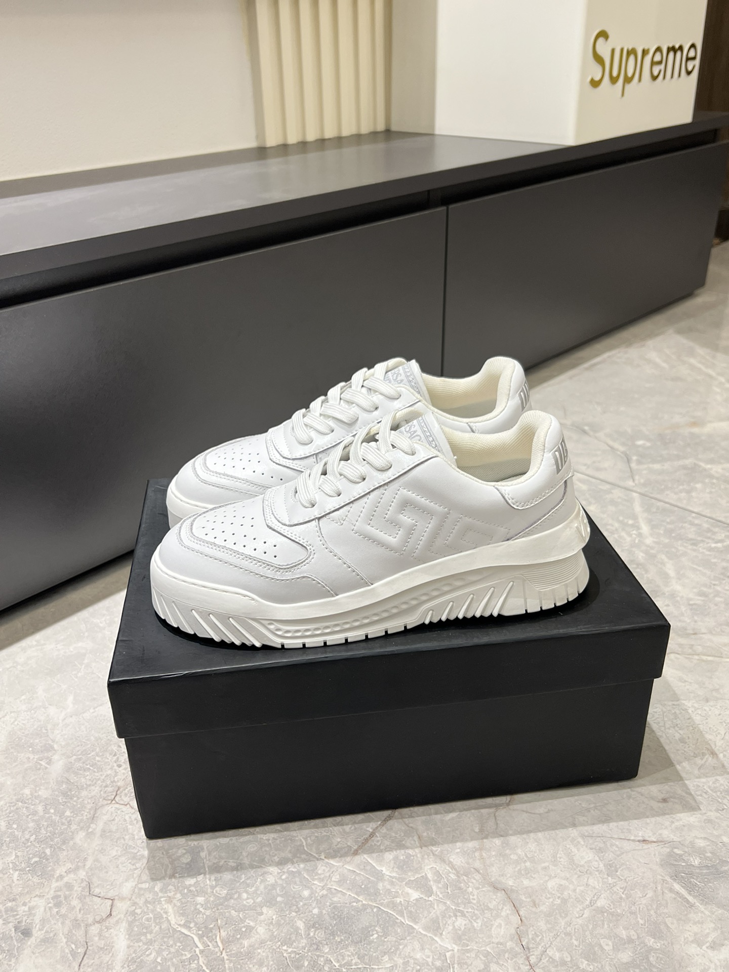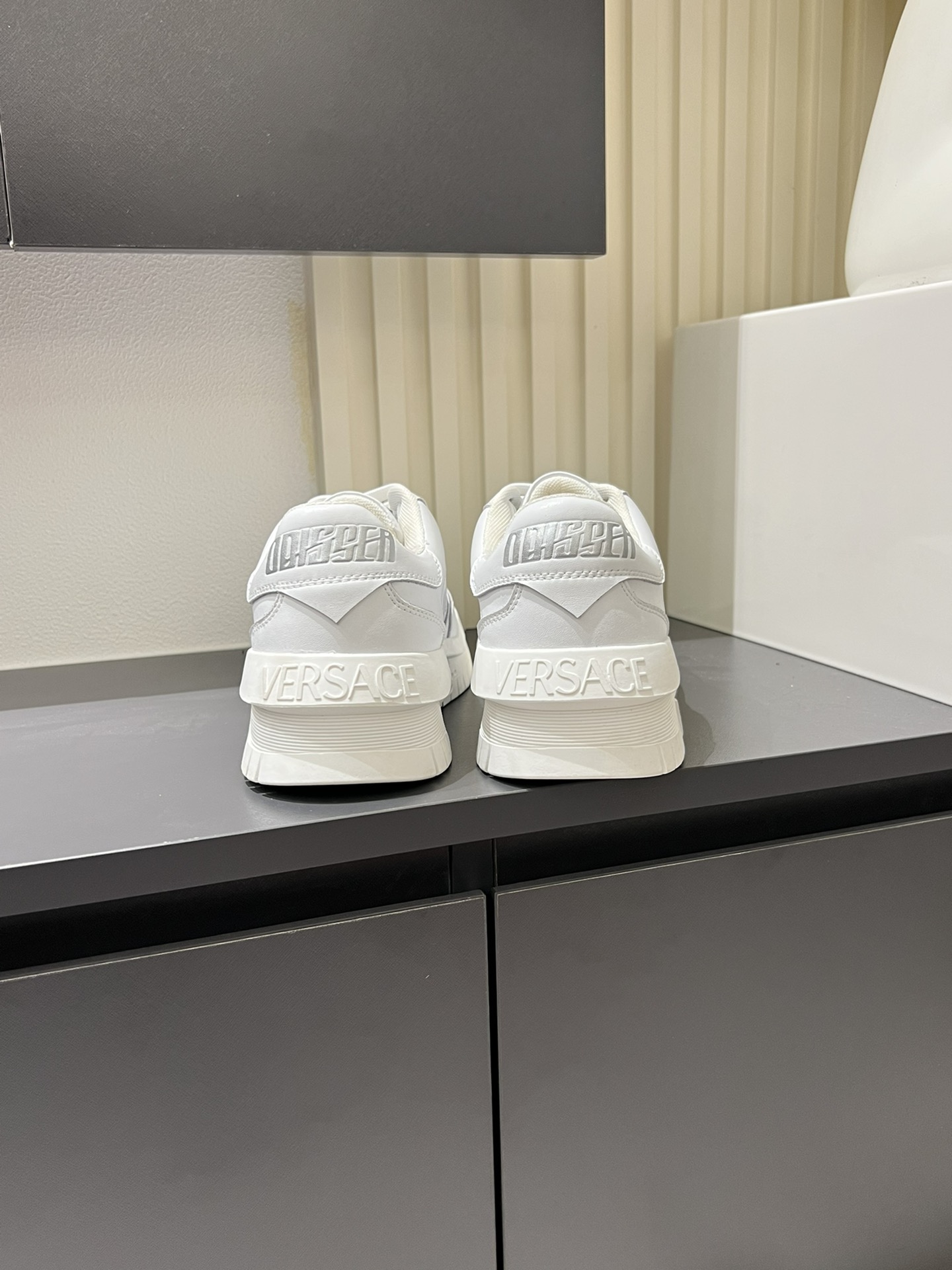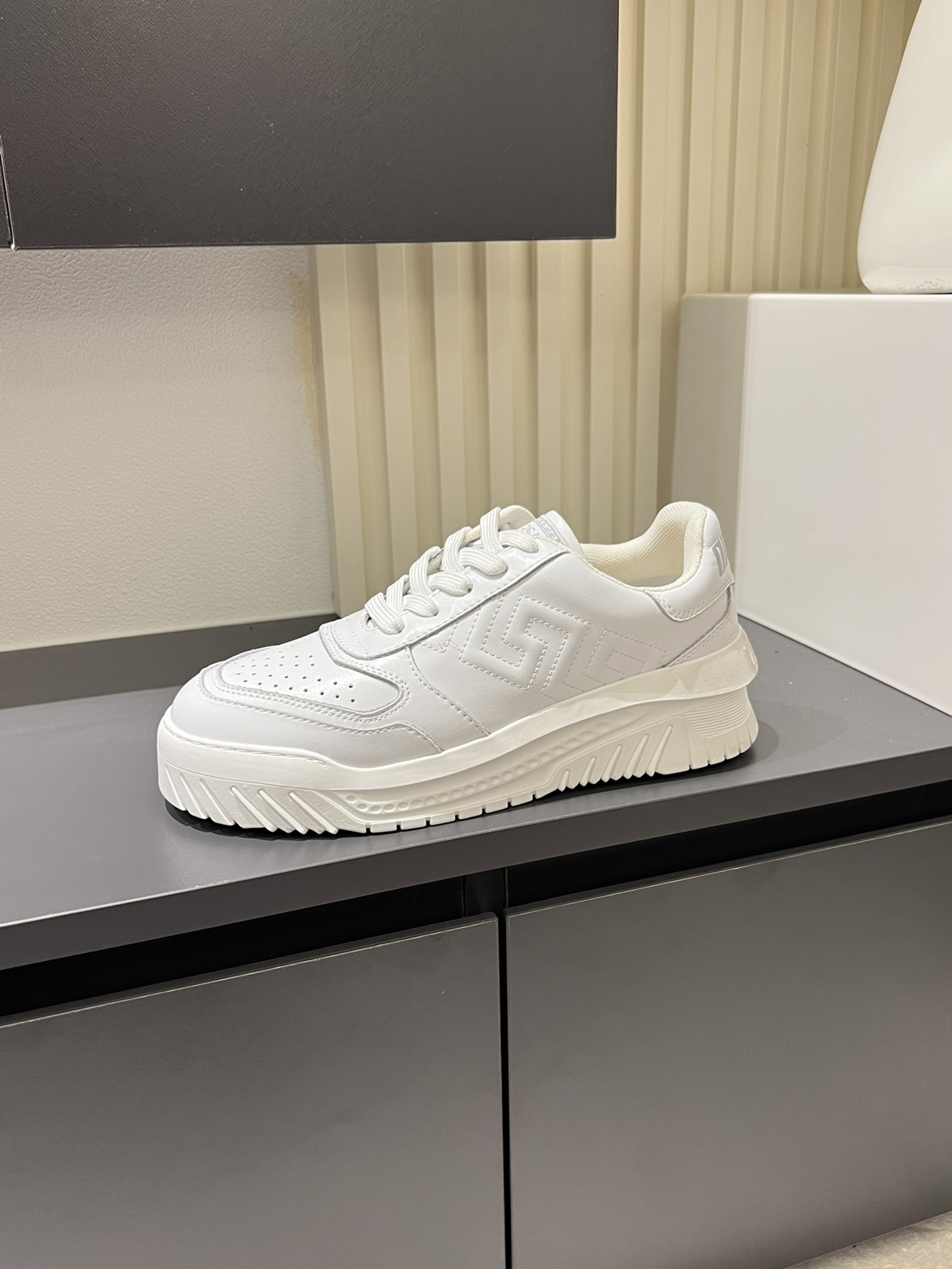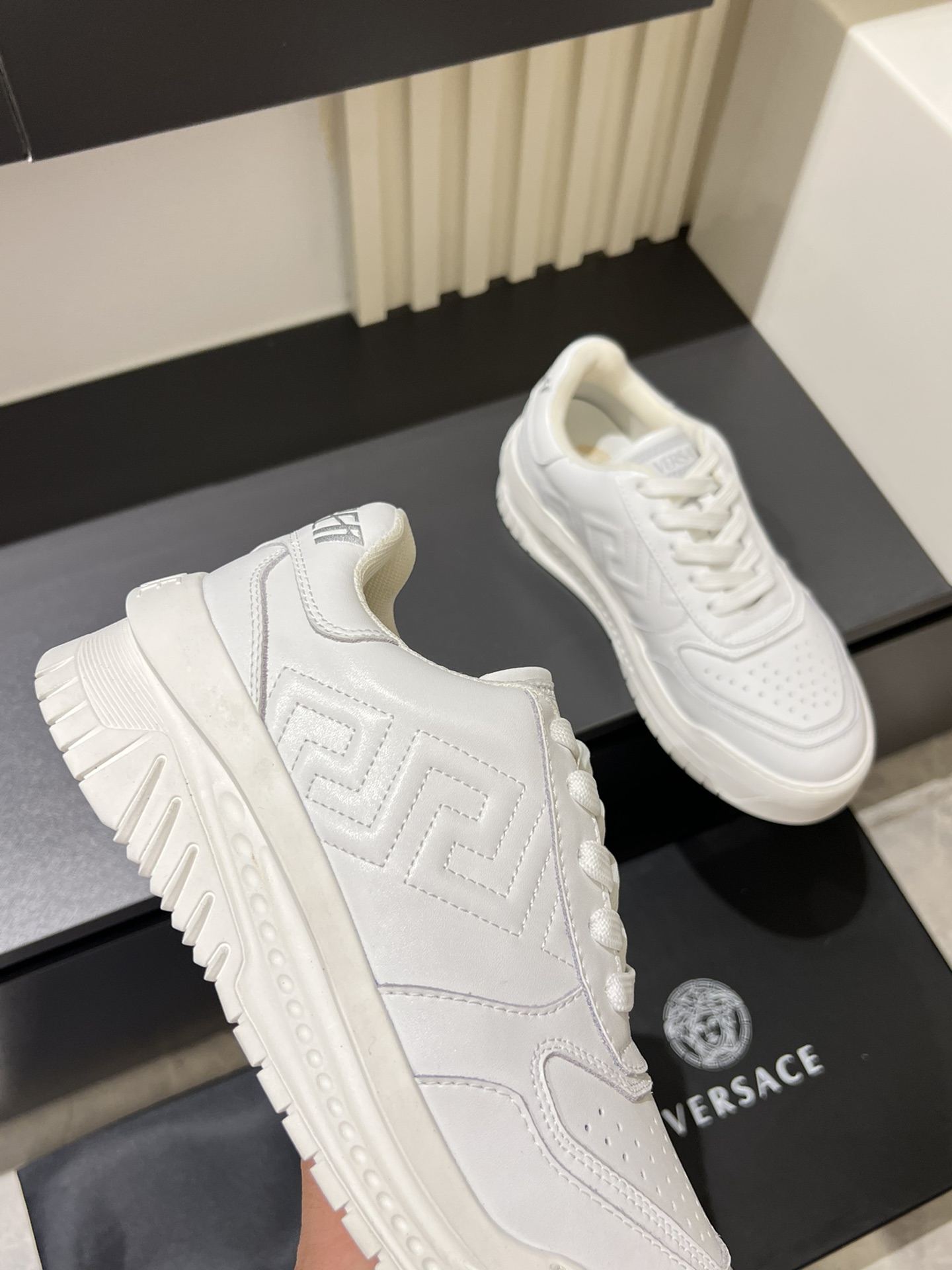 这款鞋子是AAAAA 1:1 质量 (非常棒). 使用了和原版一模一样的材料. 商标部分也保持了和范思哲/Versace一样. 图片拍摄是实物鞋子拍摄, 您所收到的实物保证和我们图片一模一样.