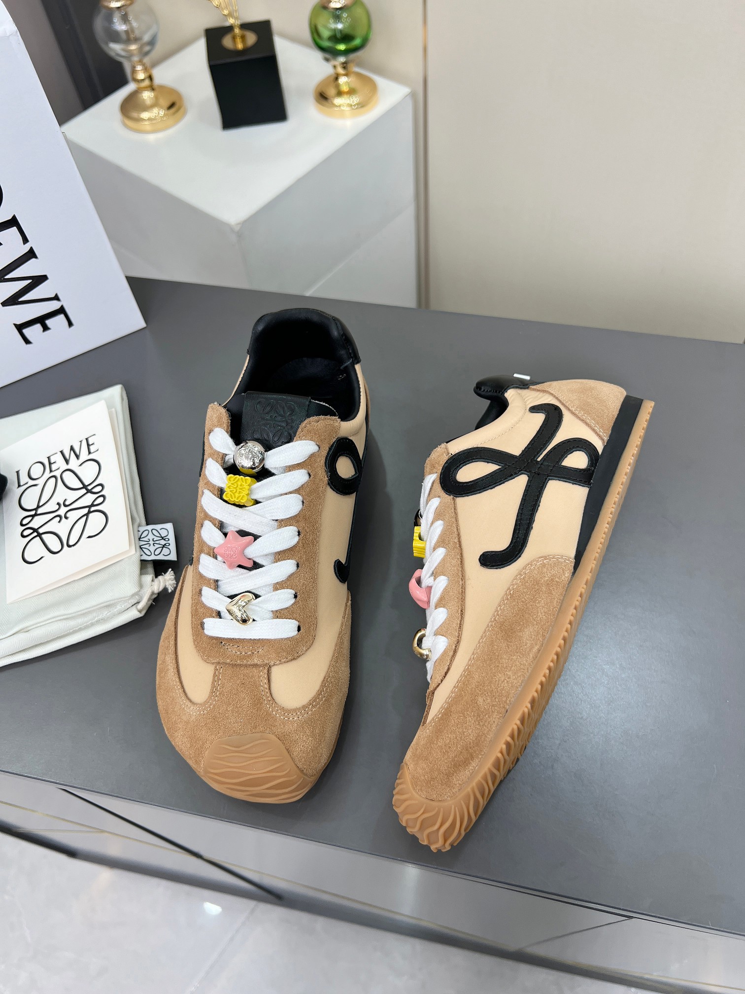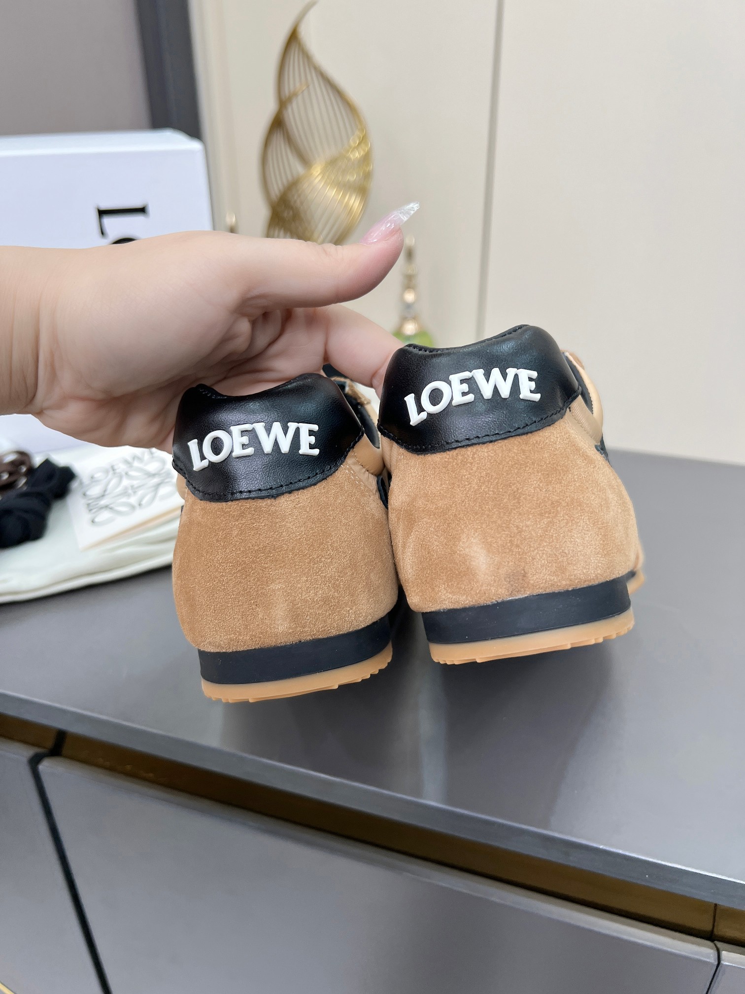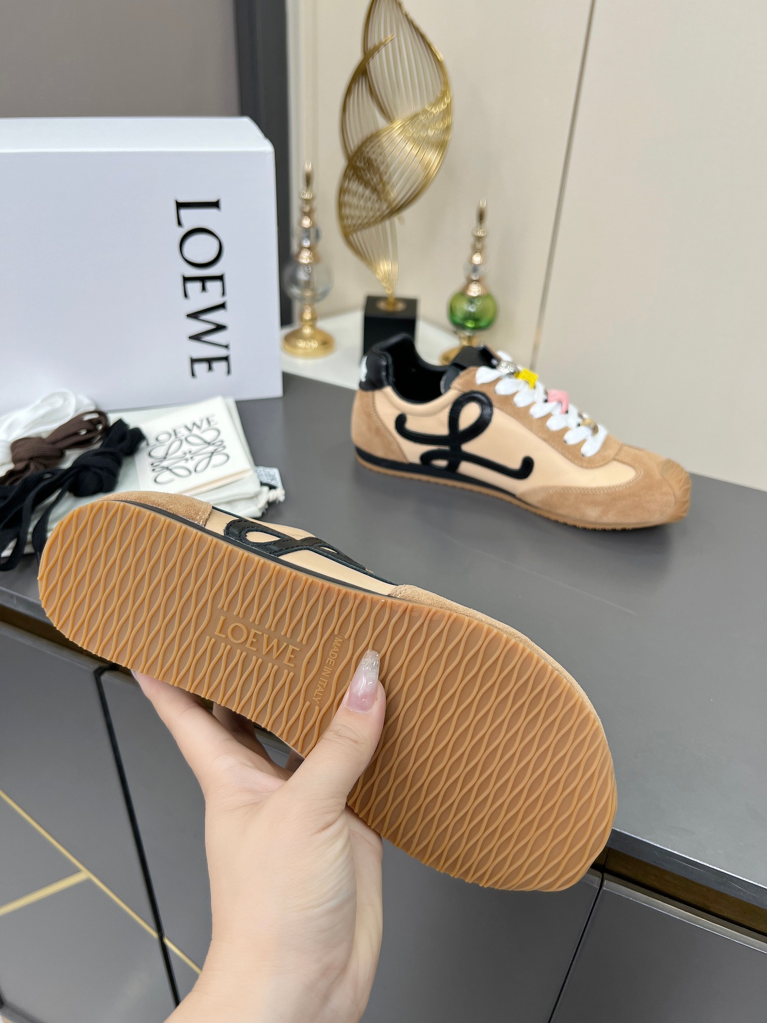 这款鞋子是AAAAA 1:1 质量 (非常棒). 使用了和原版一模一样的材料. 商标部分也保持了和罗意威/Loewe一样. 图片拍摄是实物鞋子拍摄, 您所收到的实物保证和我们图片一模一样.