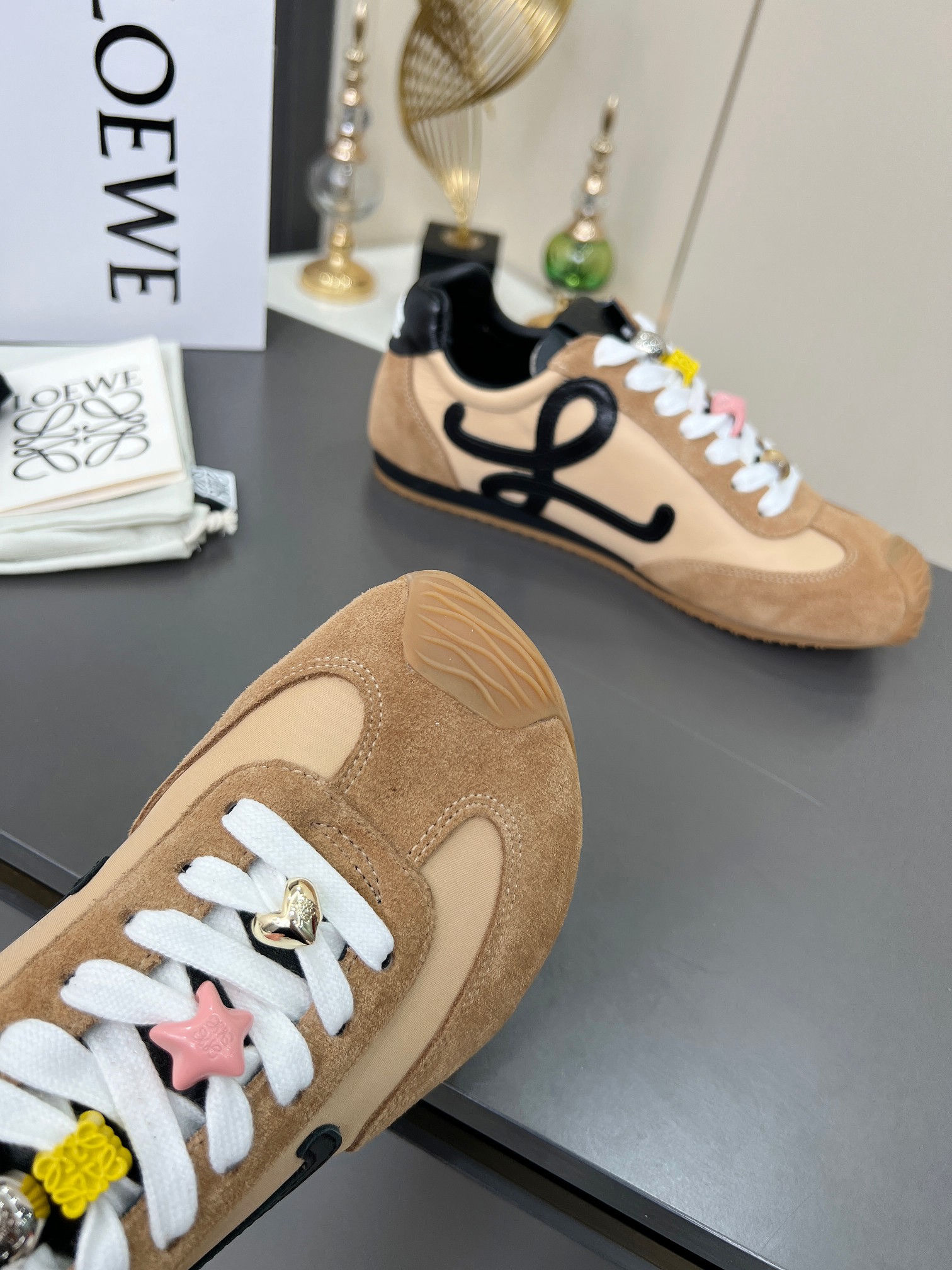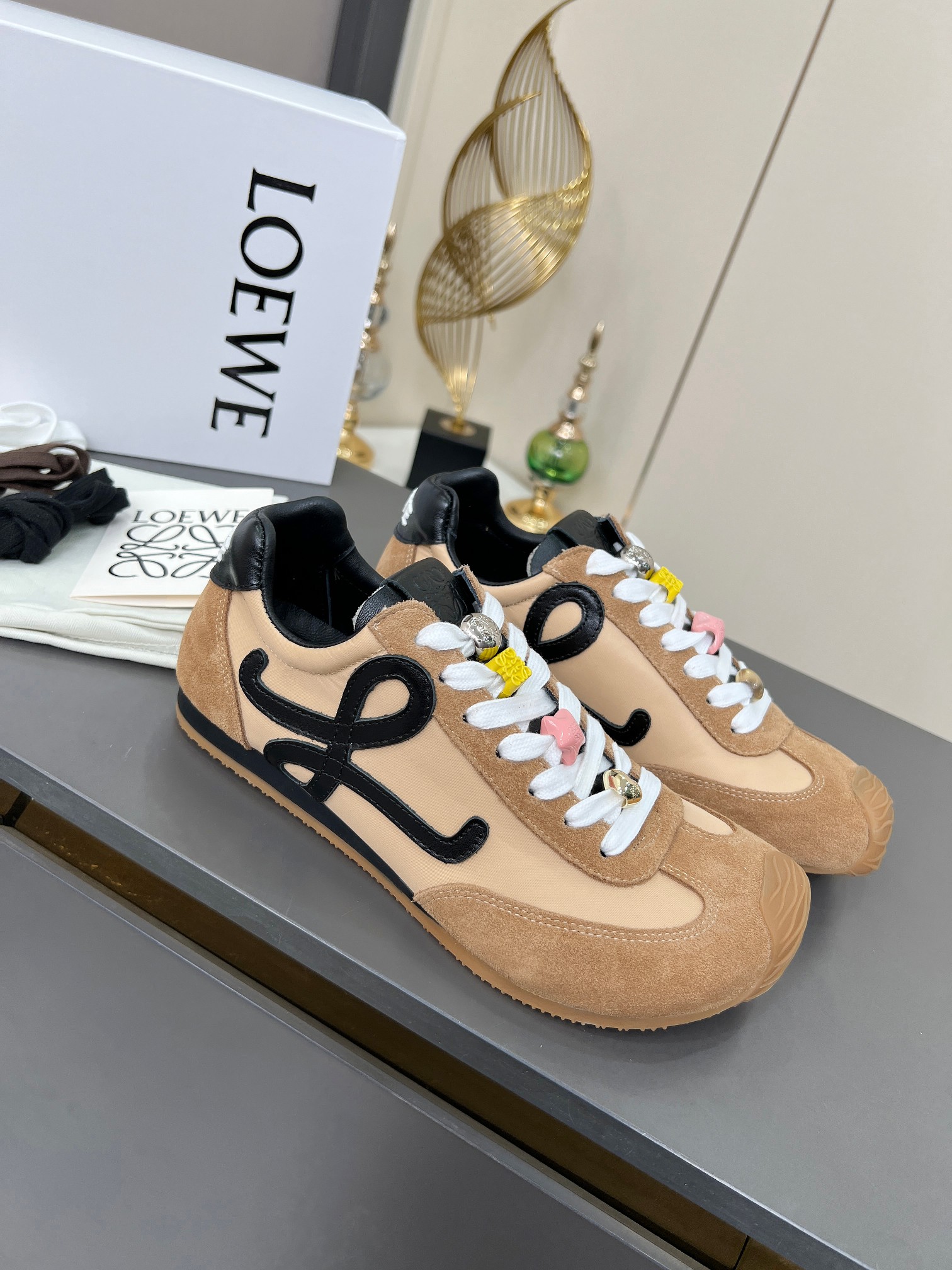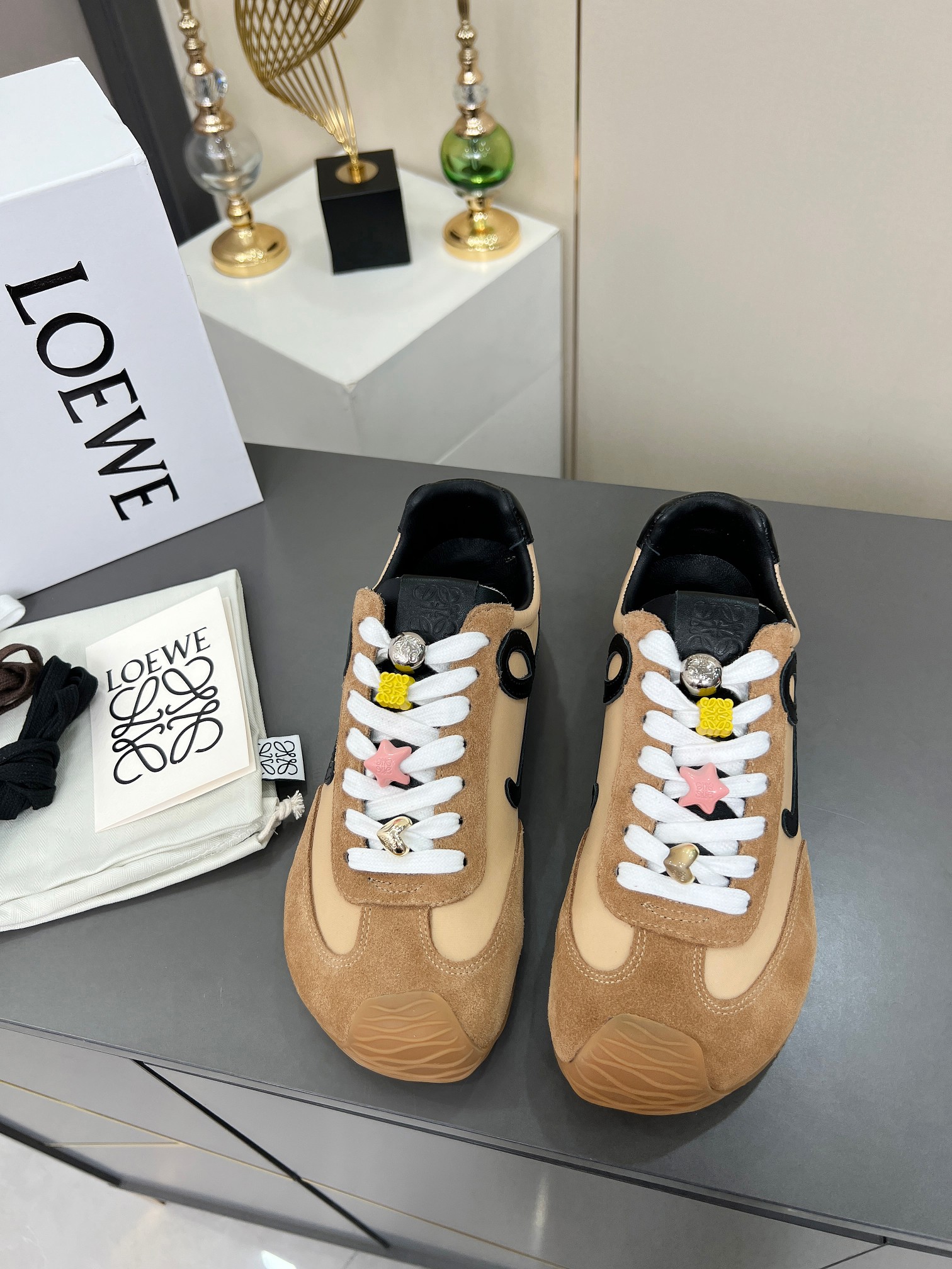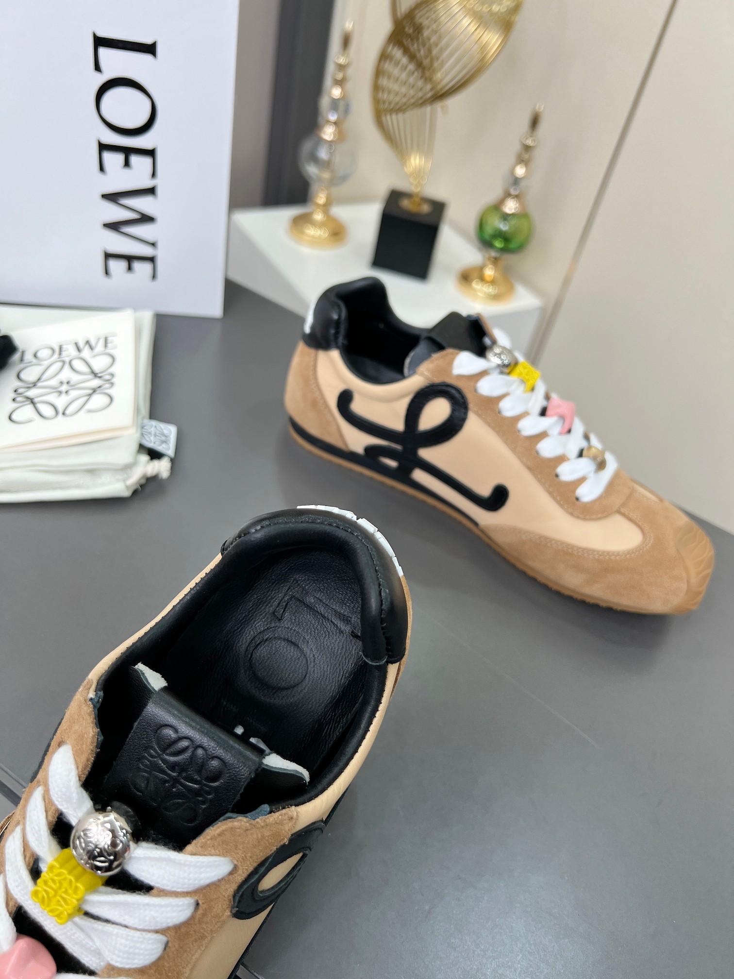 这款鞋子是AAAAA 1:1 质量 (非常棒). 使用了和原版一模一样的材料. 商标部分也保持了和罗意威/Loewe一样. 图片拍摄是实物鞋子拍摄, 您所收到的实物保证和我们图片一模一样.