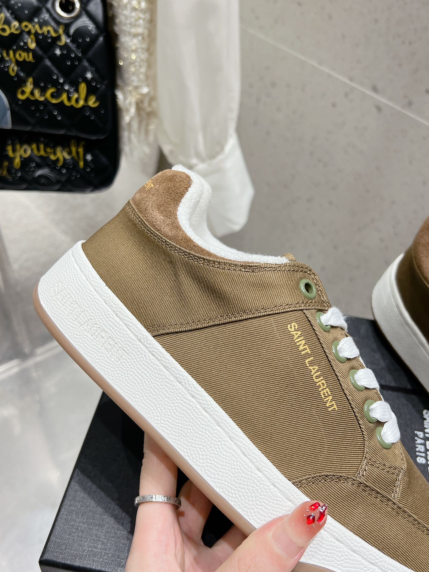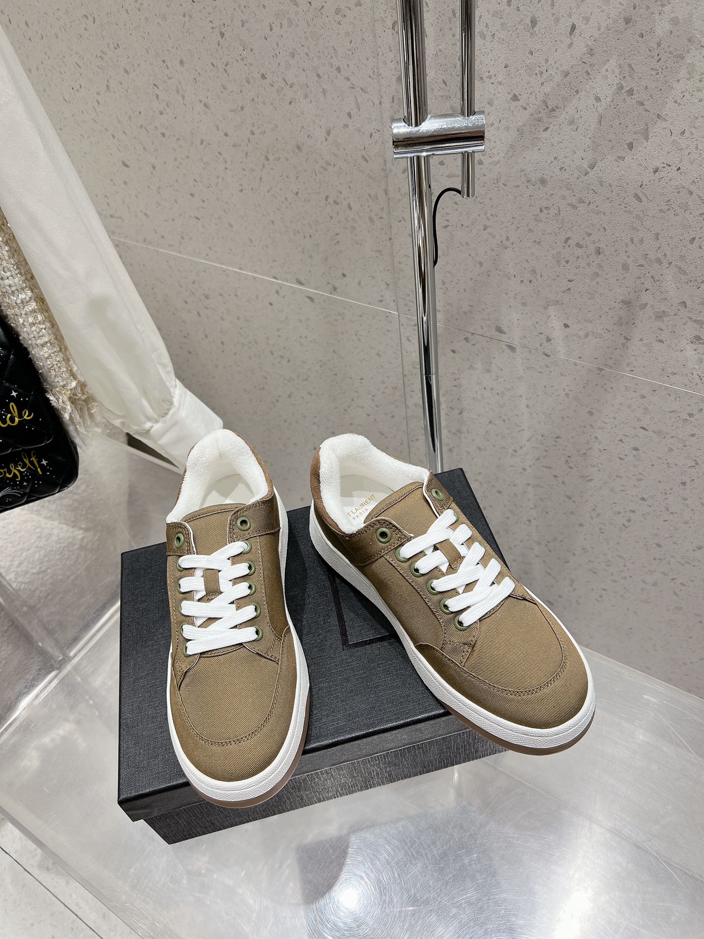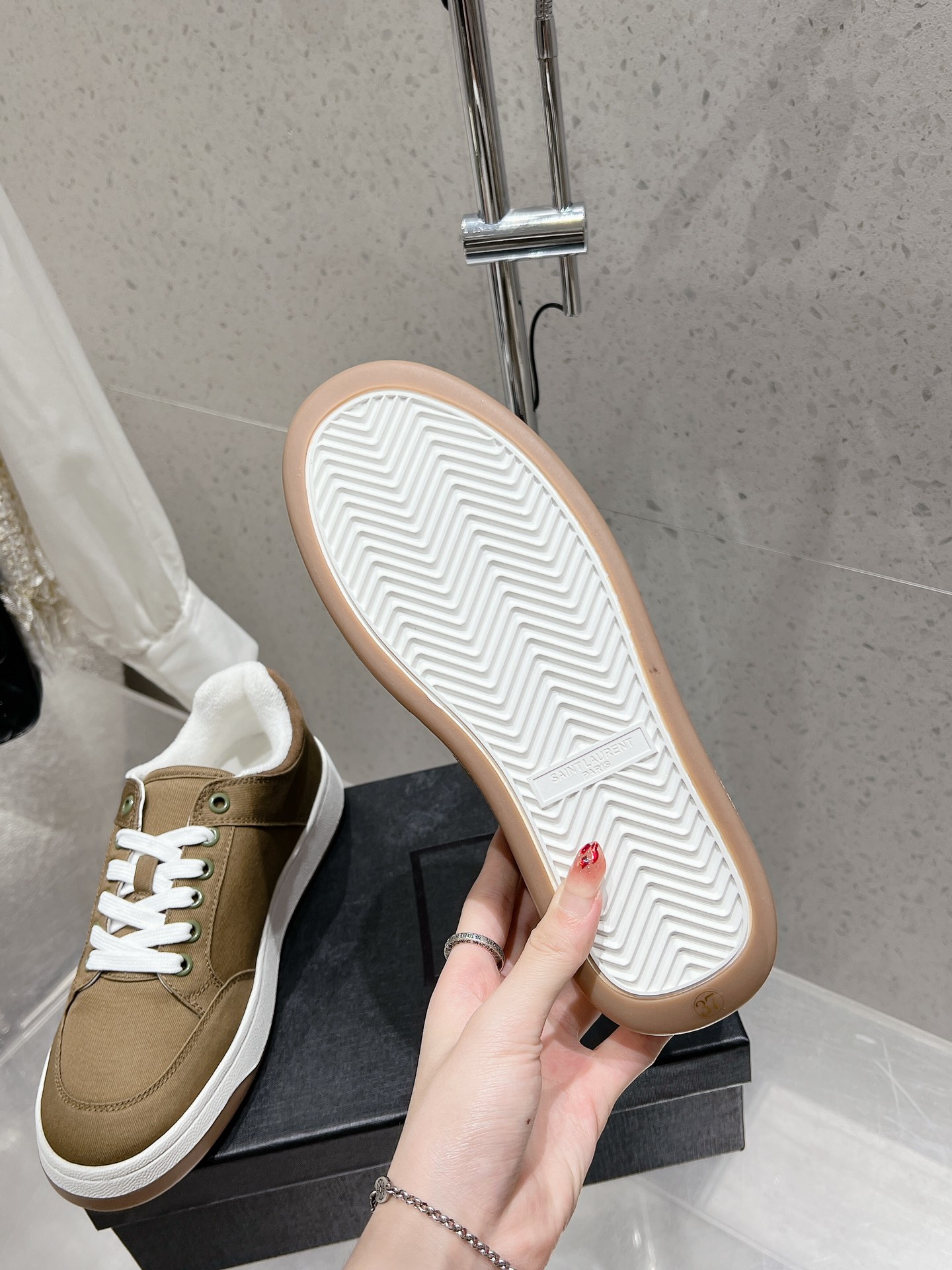 这款鞋子是AAAAA 1:1 质量 (非常棒). 使用了和原版一模一样的材料. 商标部分也保持了和圣罗兰/Saint Laurent一样. 图片拍摄是实物鞋子拍摄, 您所收到的实物保证和我们图片一模一样.