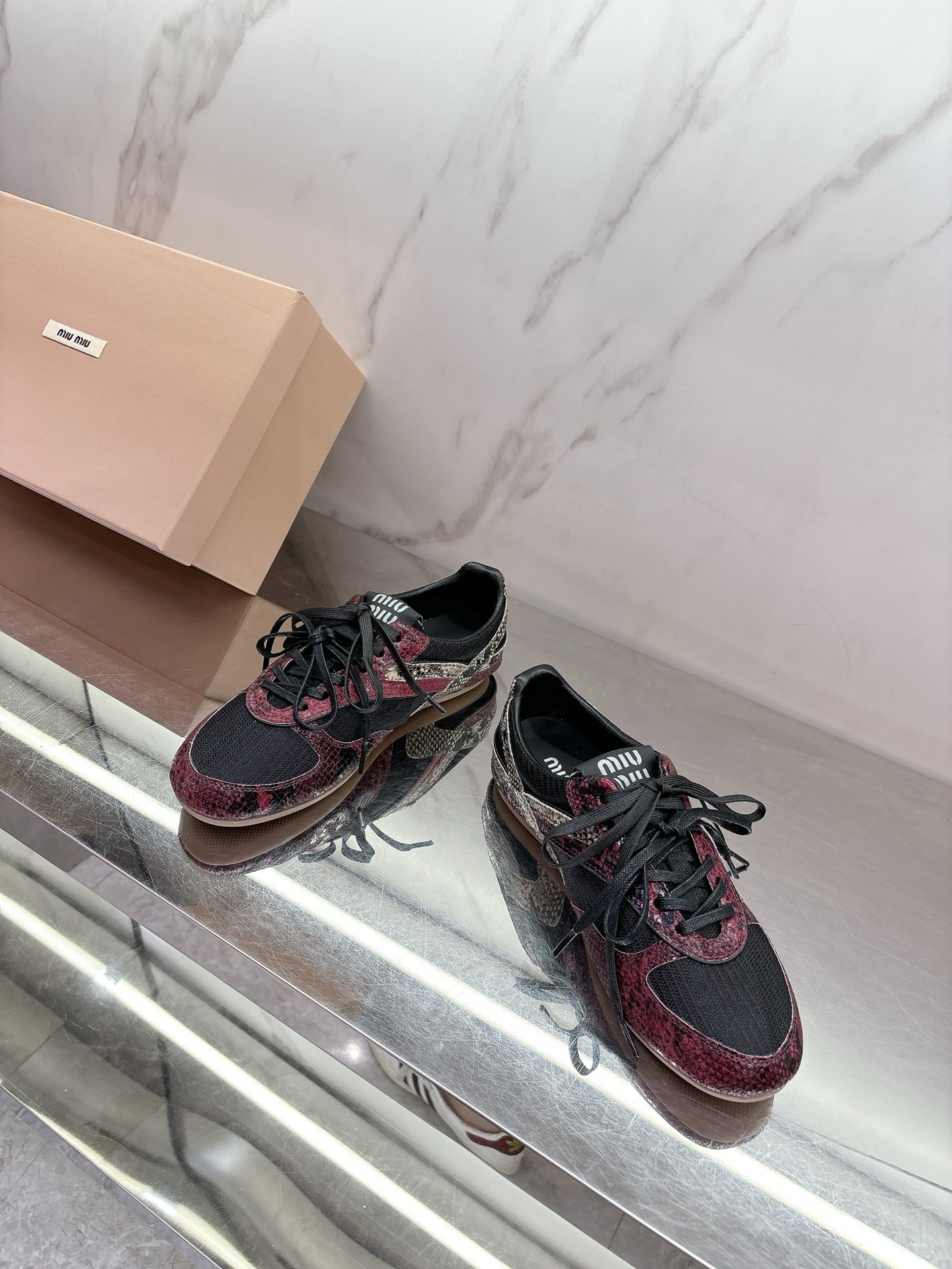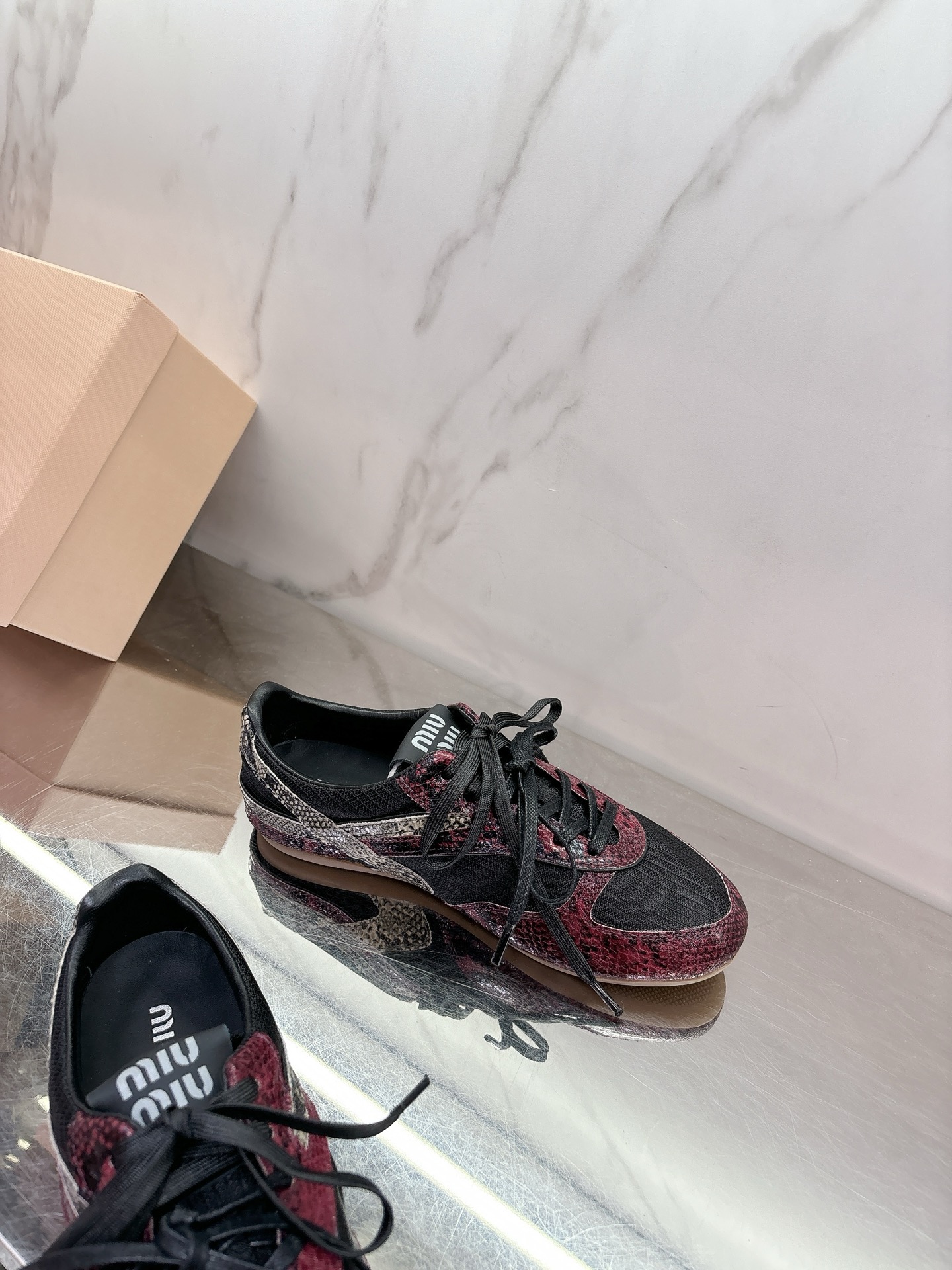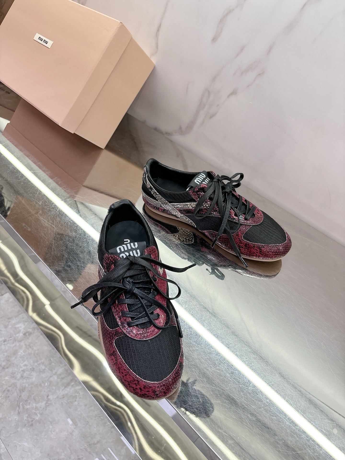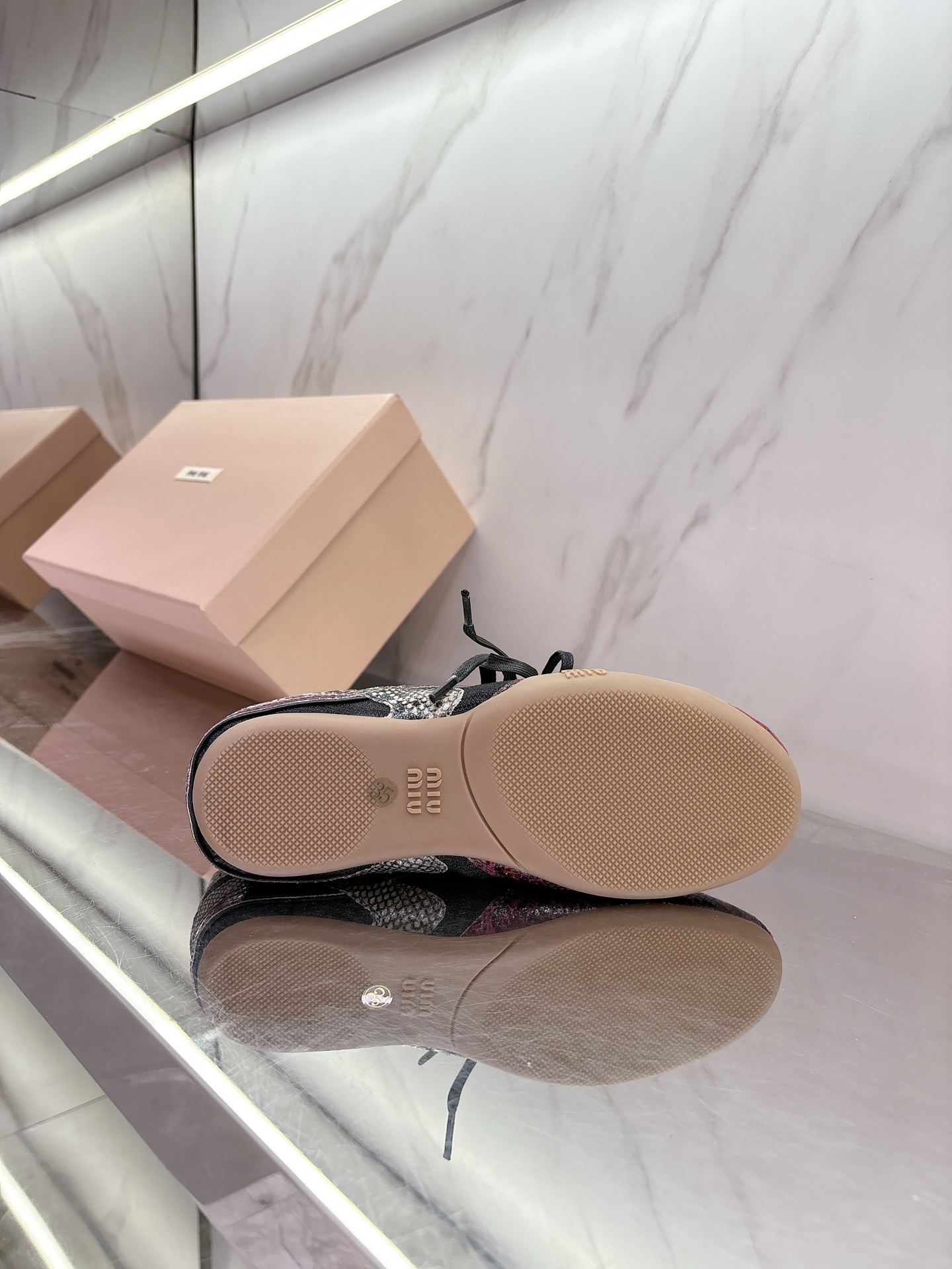 这款鞋子是AAAAA 1:1 质量 (非常棒). 使用了和原版一模一样的材料. 商标部分也保持了和缪缪/Miu Miu一样. 图片拍摄是实物鞋子拍摄, 您所收到的实物保证和我们图片一模一样.
