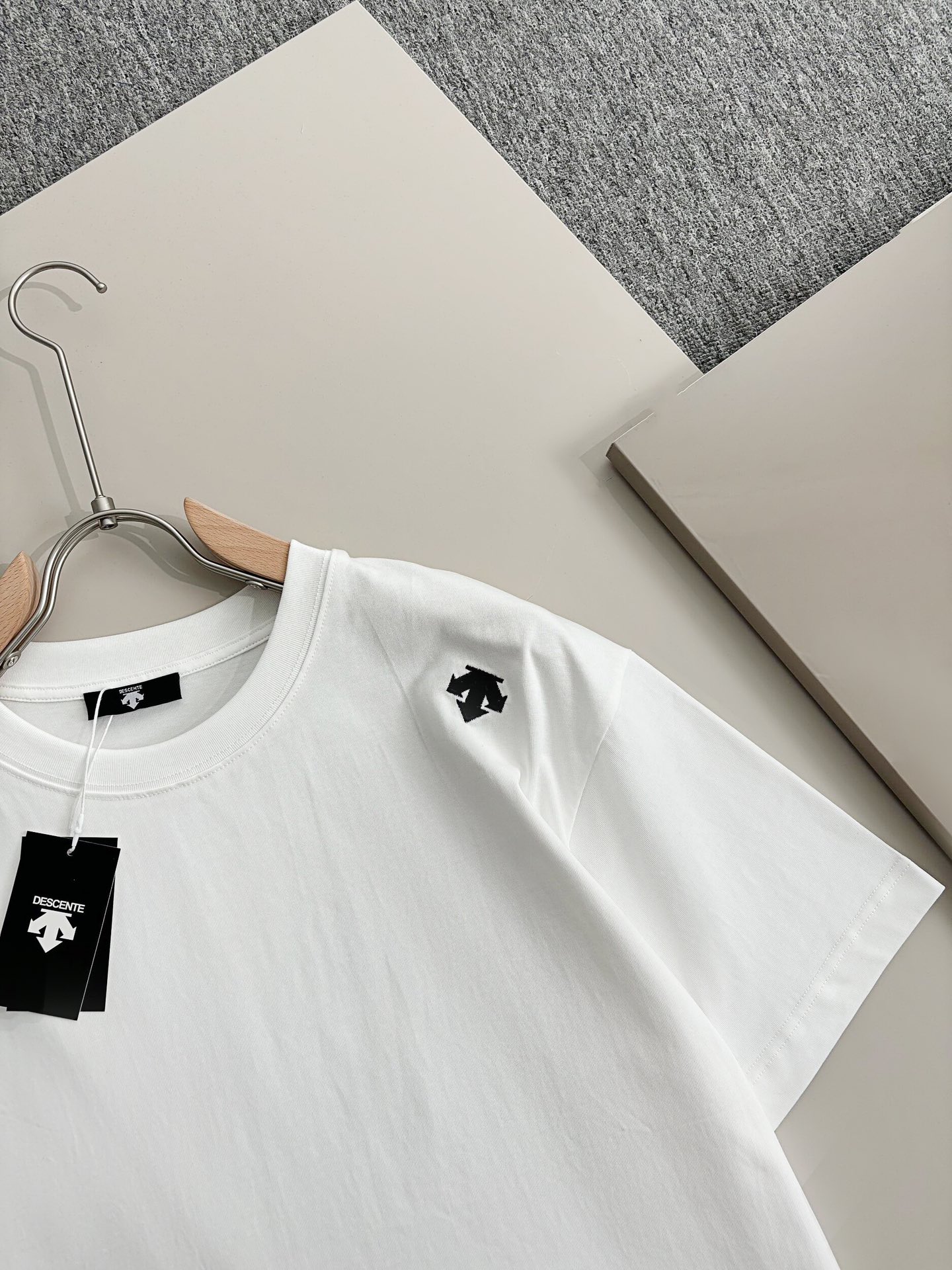 这款衣服是AAAAA 1:1 质量 (非常棒). 使用了和原版一模一样的材料. 商标部分也保持了和Descente一样. 图片拍摄是实物衣服拍摄, 您所收到的实物保证和我们图片一模一样.