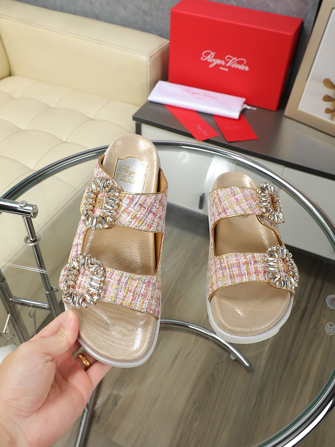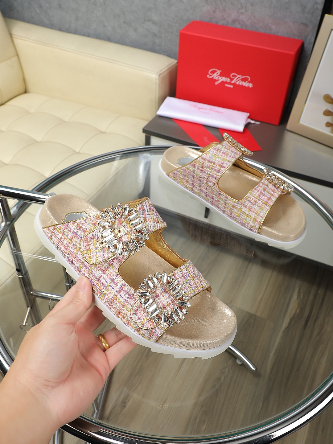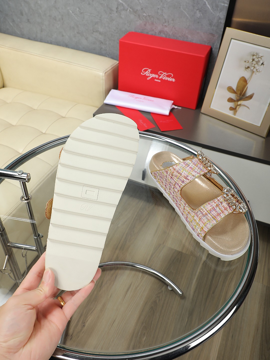 这款鞋子是AAAAA 1:1 质量 (非常棒). 使用了和原版一模一样的材料. 商标部分也保持了和罗杰维维耶/Roger Vivier一样. 图片拍摄是实物鞋子拍摄, 您所收到的实物保证和我们图片一模一样.