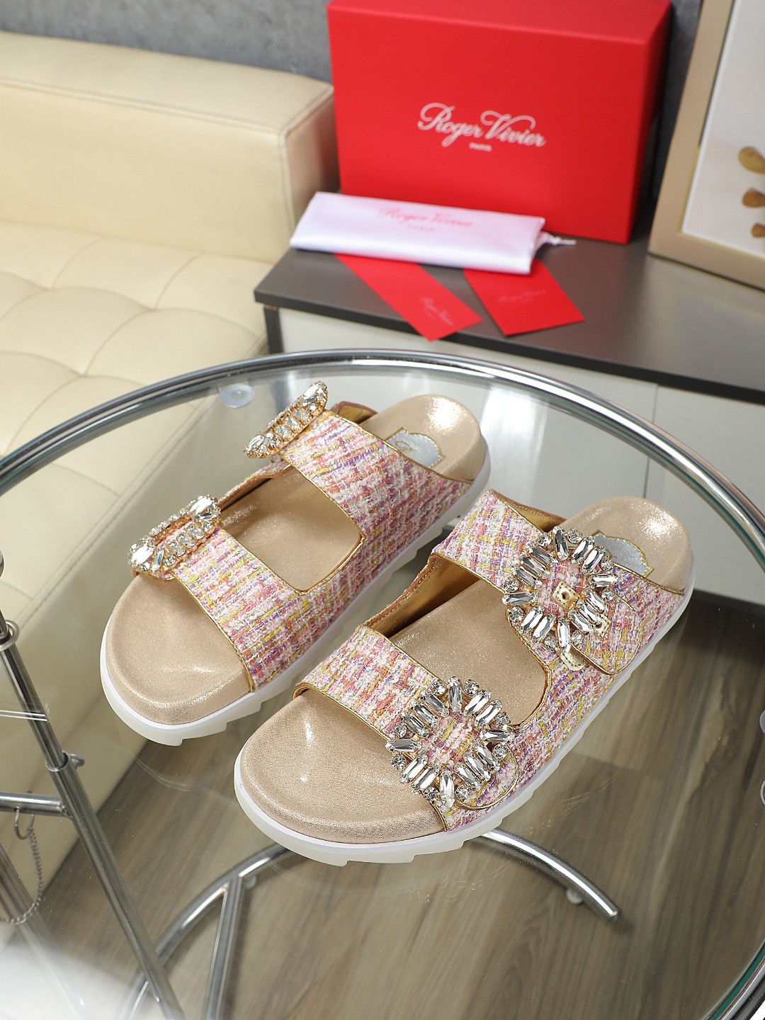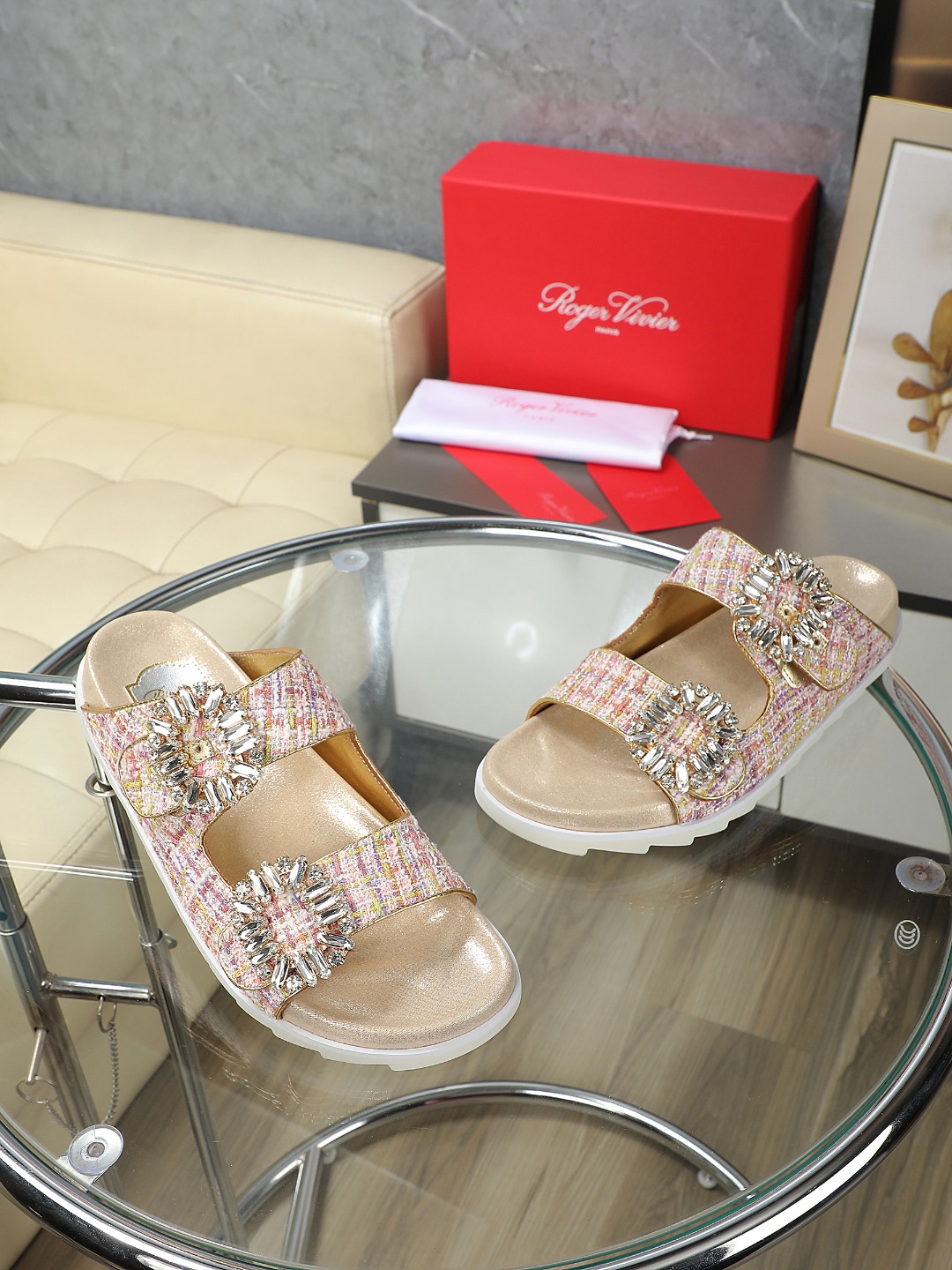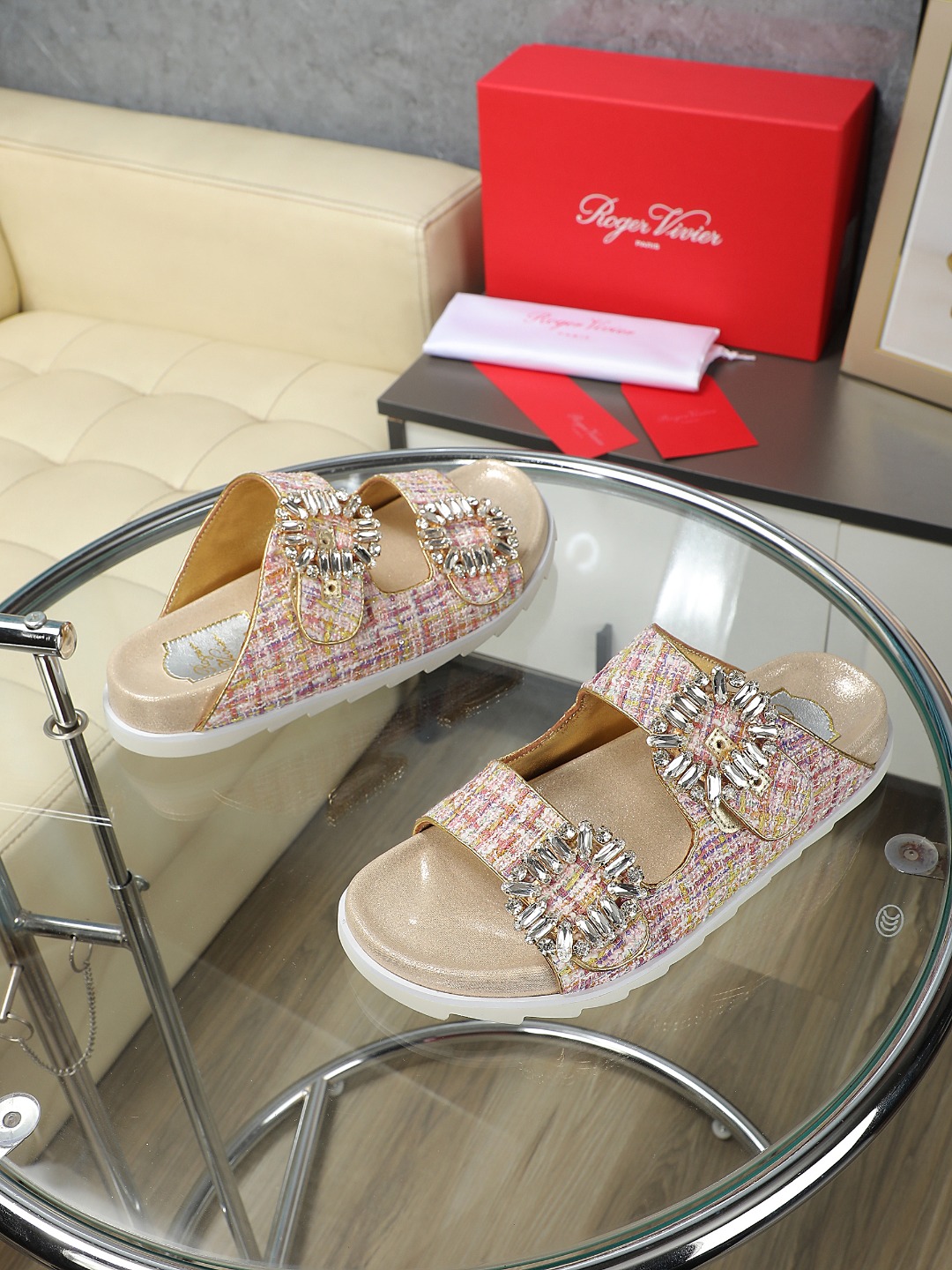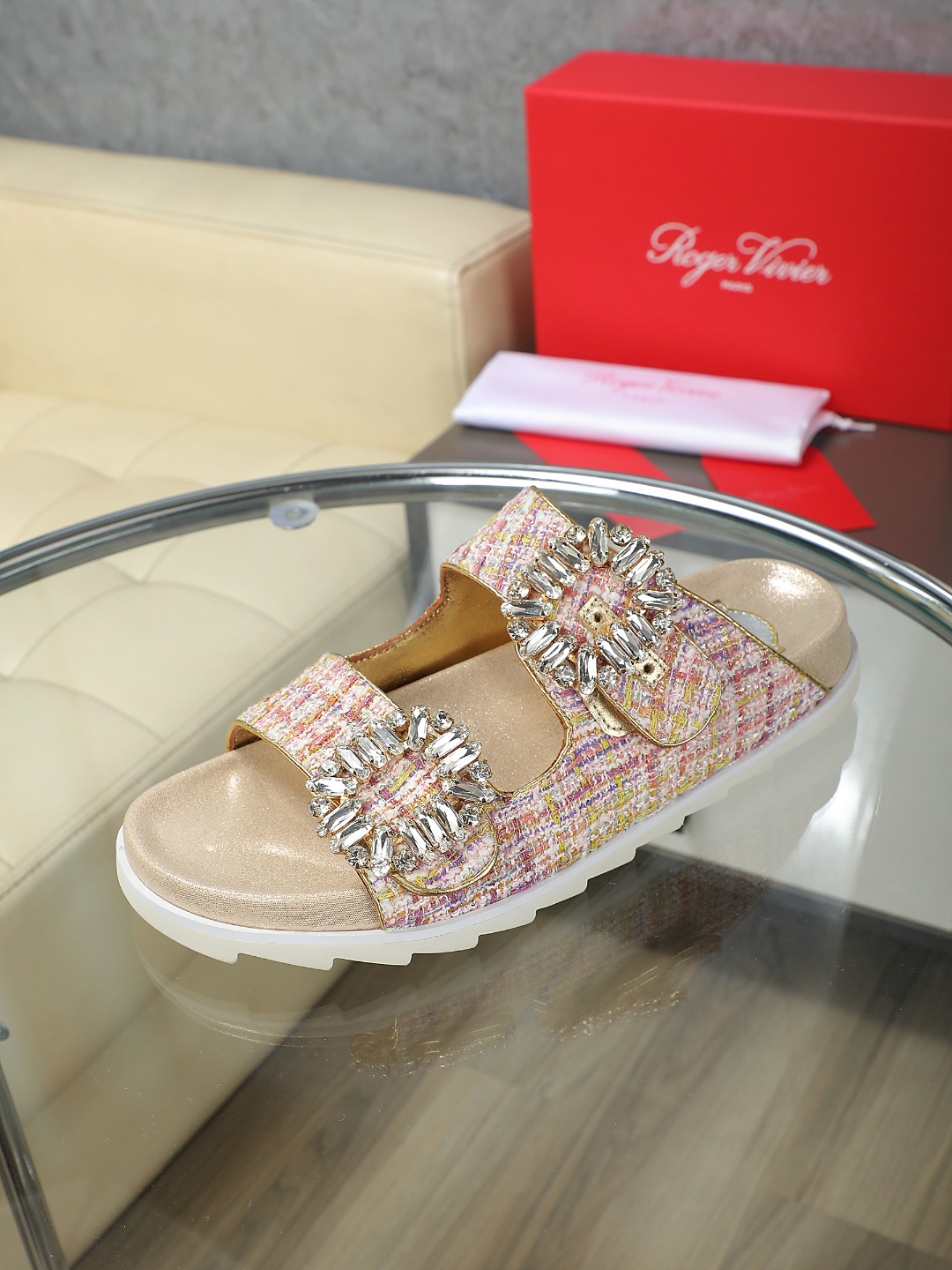 这款鞋子是AAAAA 1:1 质量 (非常棒). 使用了和原版一模一样的材料. 商标部分也保持了和罗杰维维耶/Roger Vivier一样. 图片拍摄是实物鞋子拍摄, 您所收到的实物保证和我们图片一模一样.