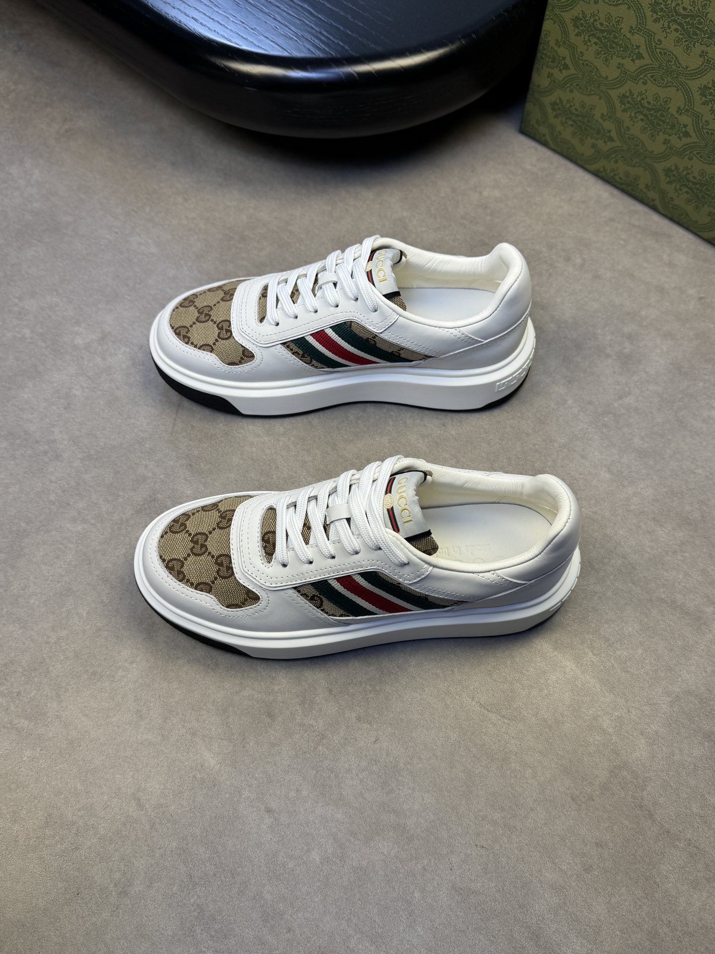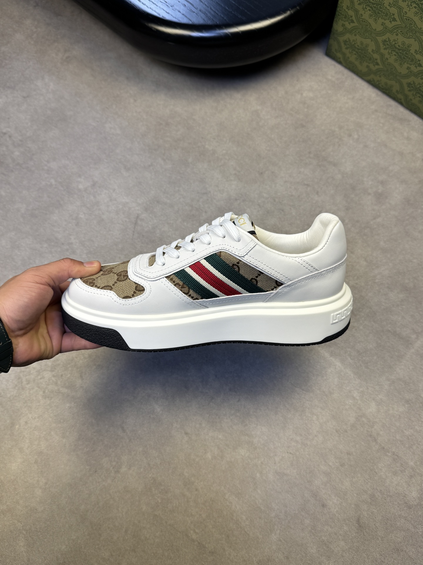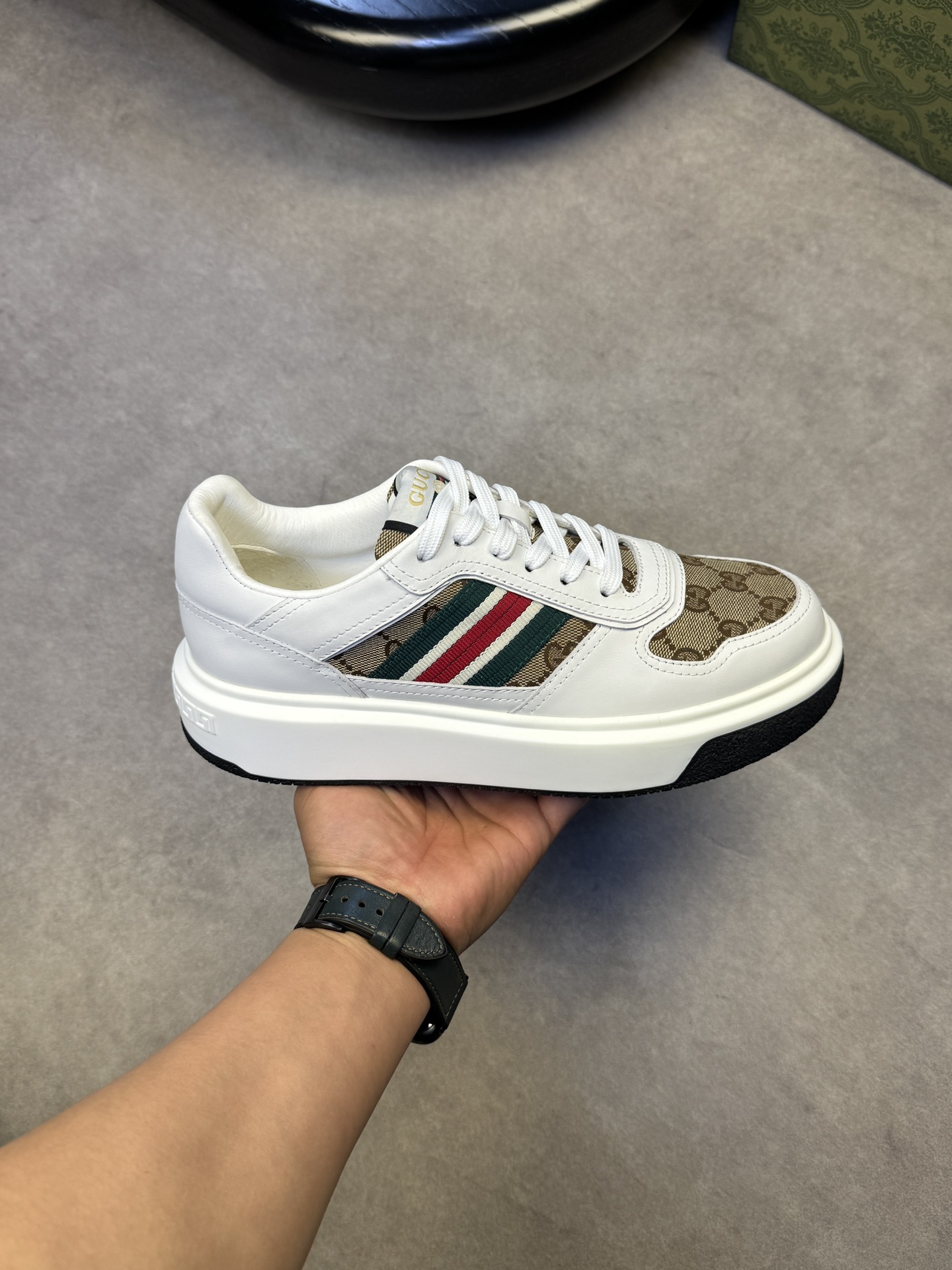 这款鞋子是AAAAA 1:1 质量 (非常棒). 使用了和原版一模一样的材料. 商标部分也保持了和古奇/Gucci一样. 图片拍摄是实物鞋子拍摄, 您所收到的实物保证和我们图片一模一样.