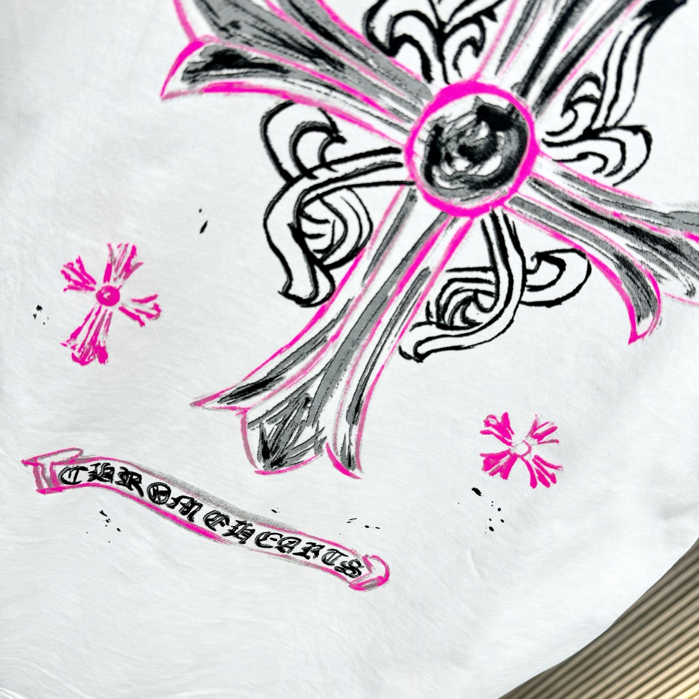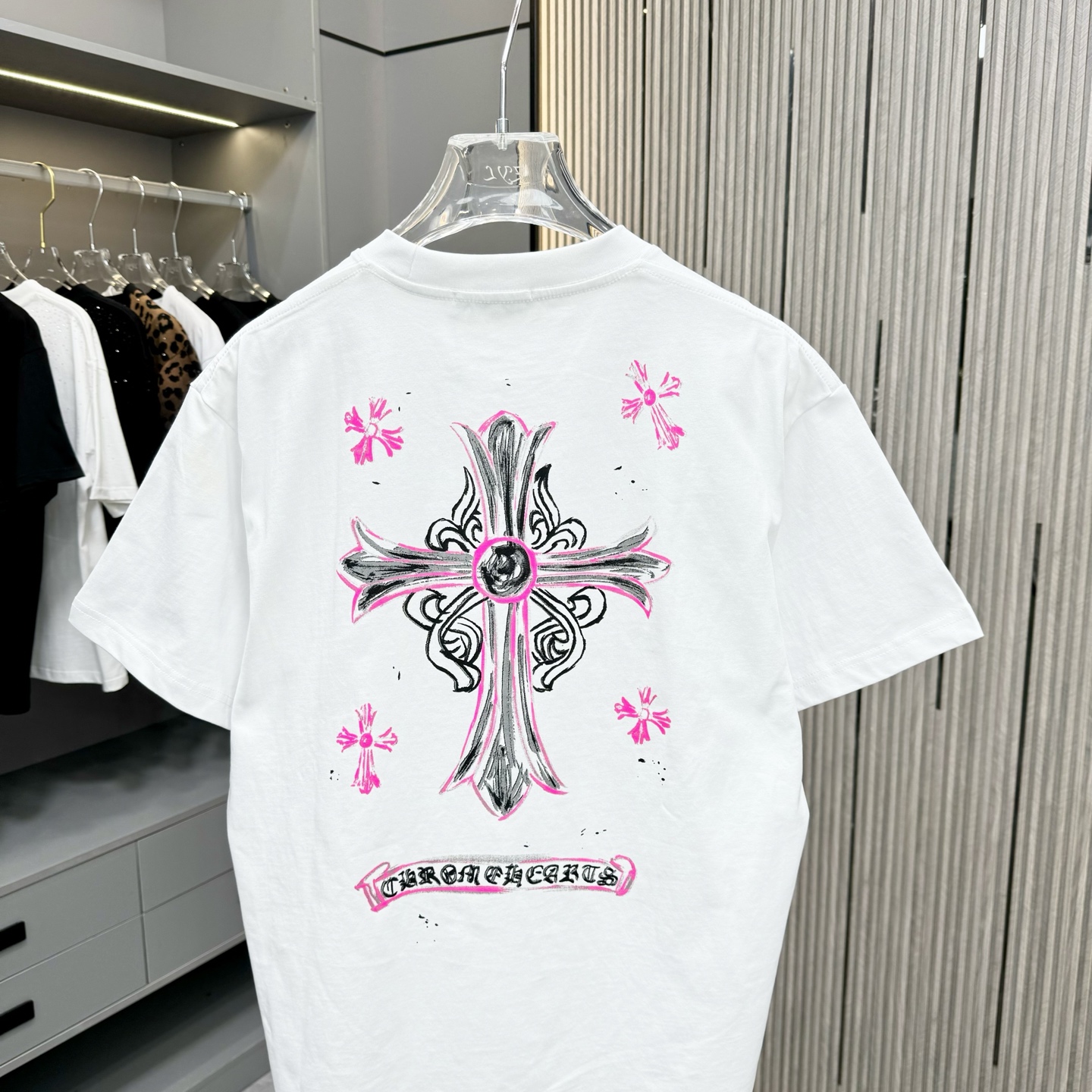 这款衣服是AAAAA 1:1 质量 (非常棒). 使用了和原版一模一样的材料. 商标部分也保持了和克罗心/Chrome Hearts一样. 图片拍摄是实物衣服拍摄, 您所收到的实物保证和我们图片一模一样.
