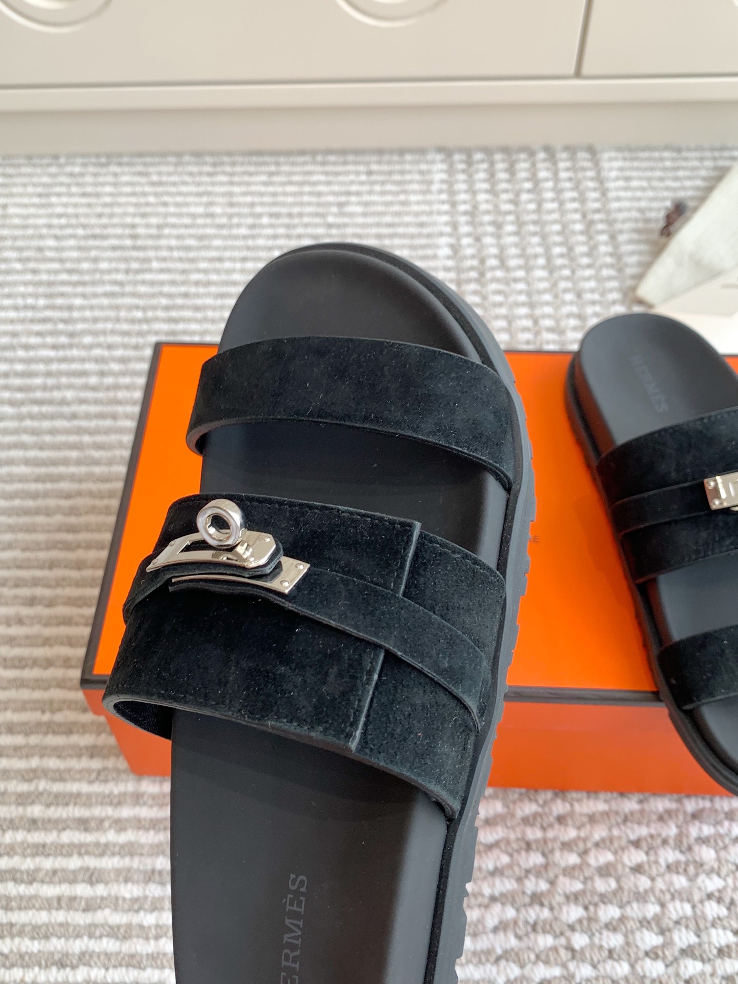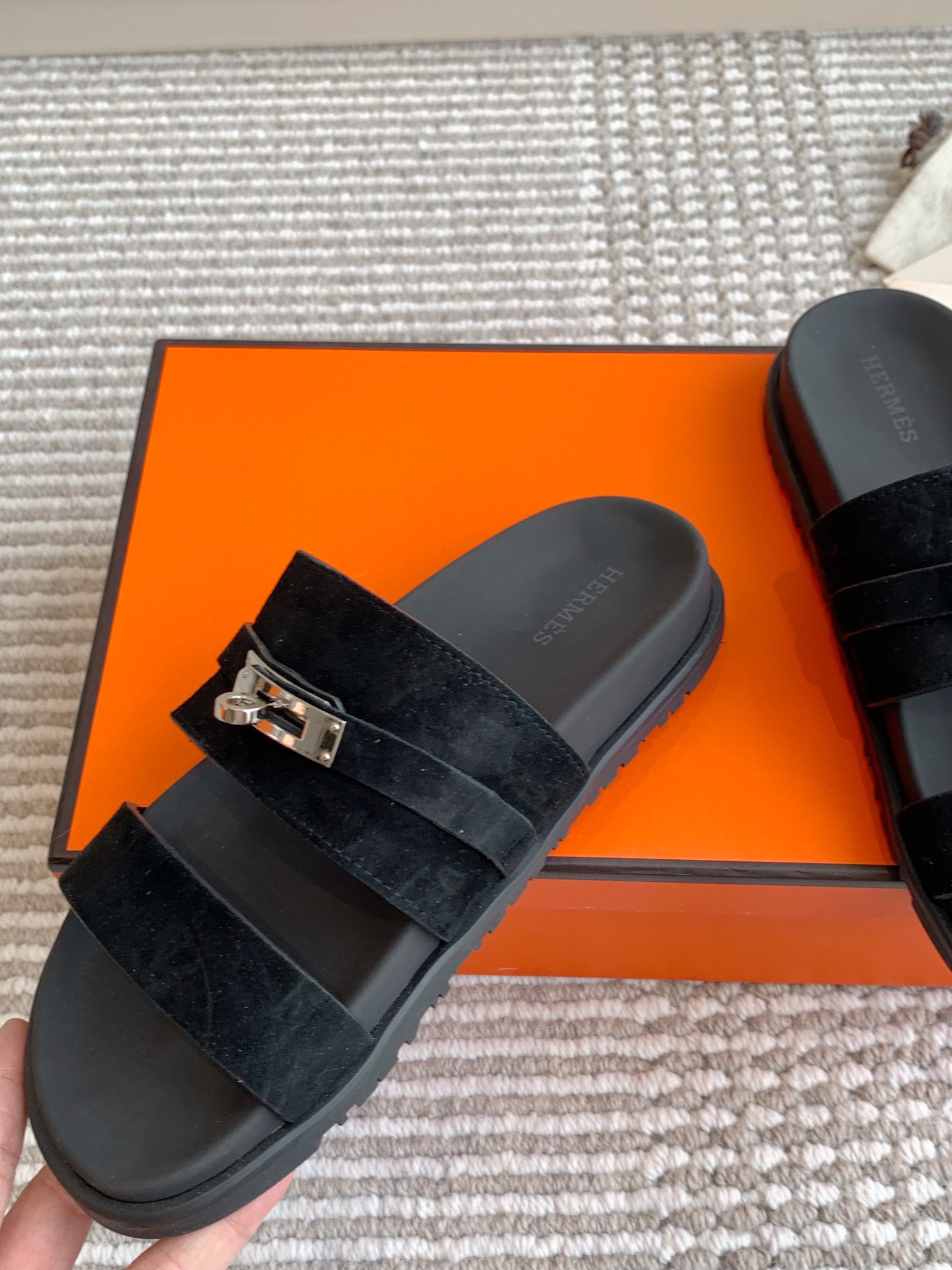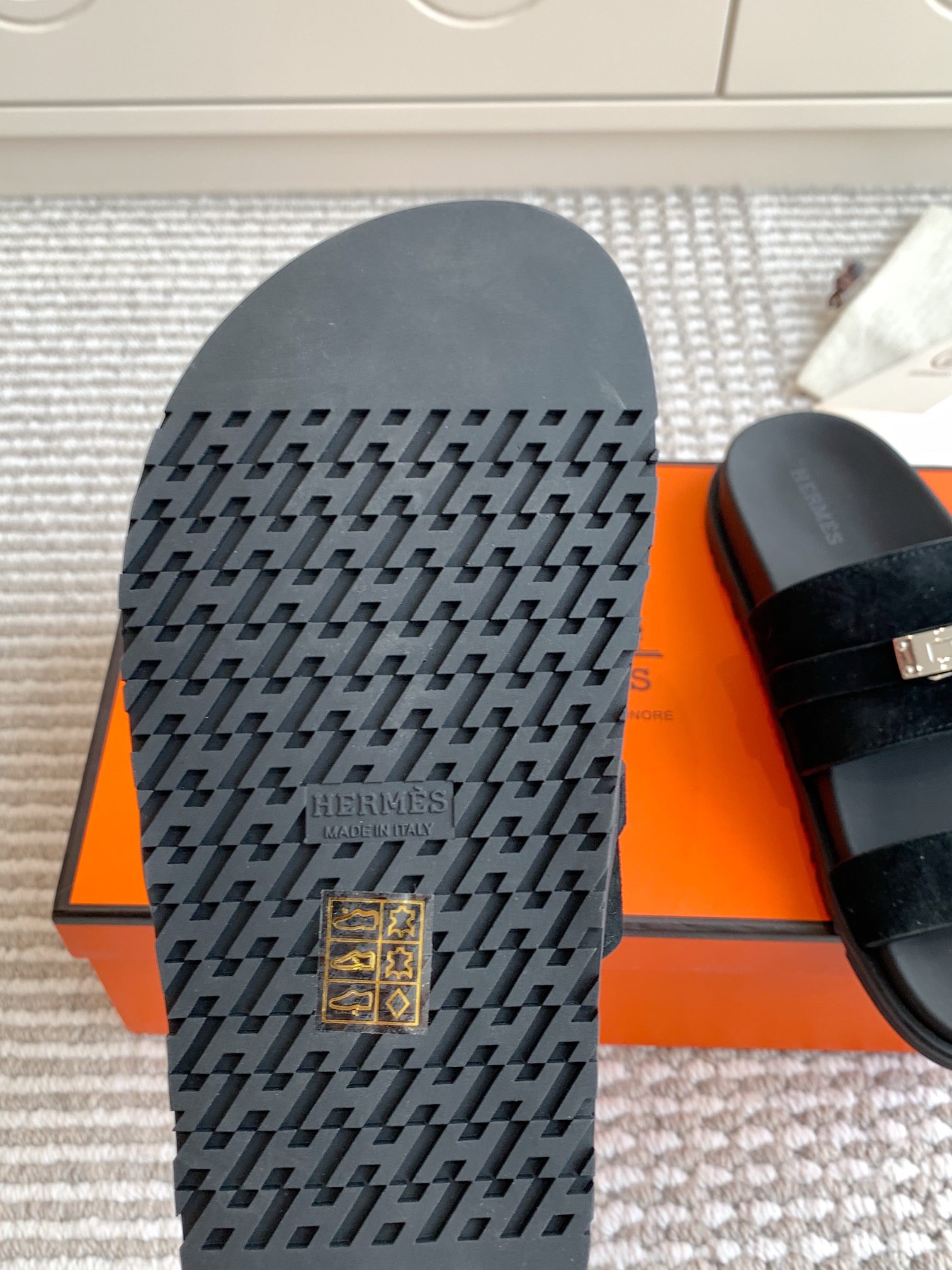 这款鞋子是AAAAA 1:1 质量 (非常棒). 使用了和原版一模一样的材料. 商标部分也保持了和爱马仕/Hermes一样. 图片拍摄是实物鞋子拍摄, 您所收到的实物保证和我们图片一模一样.