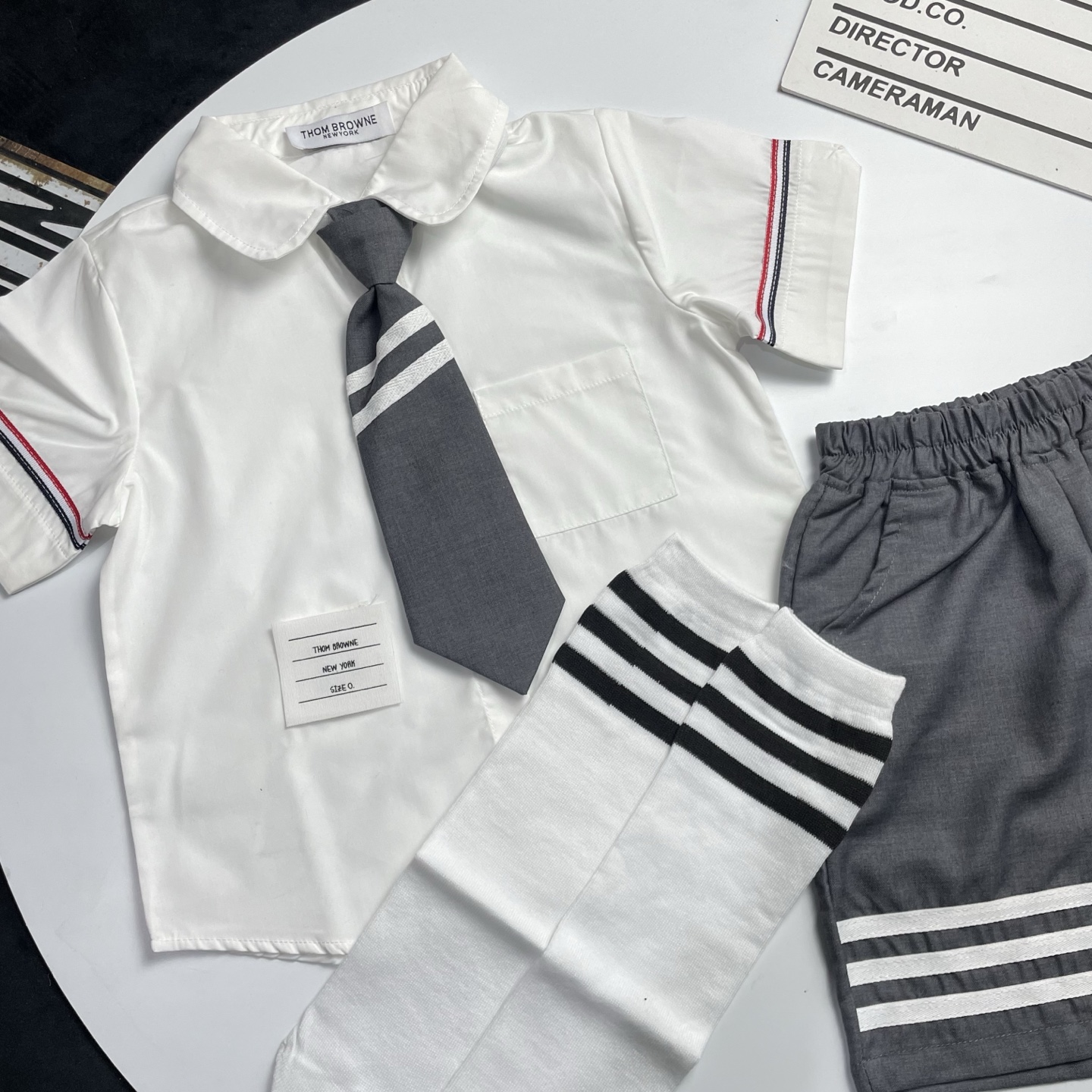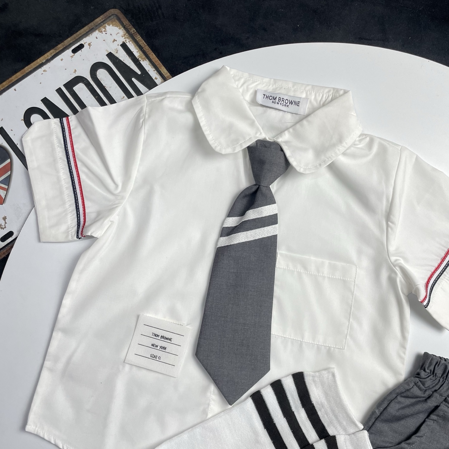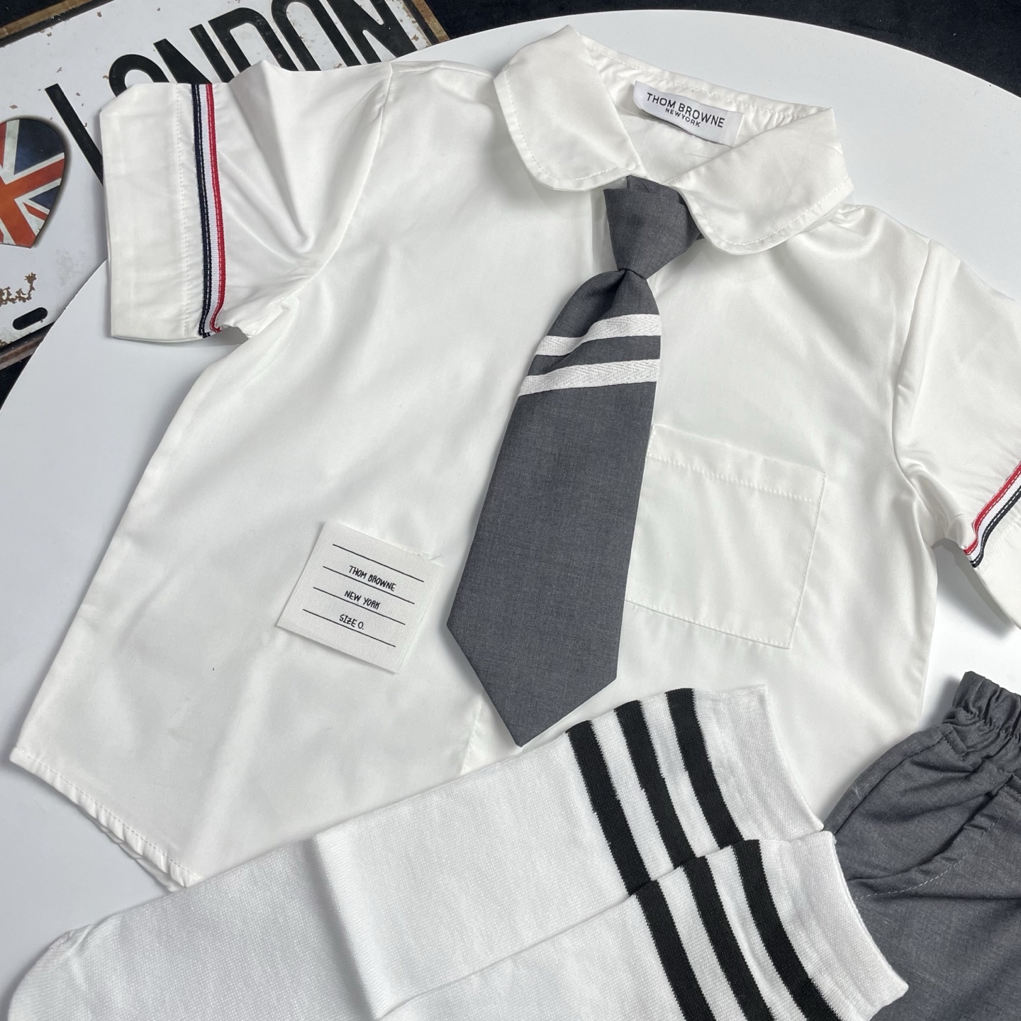 这款children's clothes是AAAAA 1:1 质量 (非常棒). 使用了和原版一模一样的材料. 商标部分也保持了和汤姆布朗/Thom Browne一样. 图片拍摄是实物children's clothes拍摄, 您所收到的实物保证和我们图片一模一样.