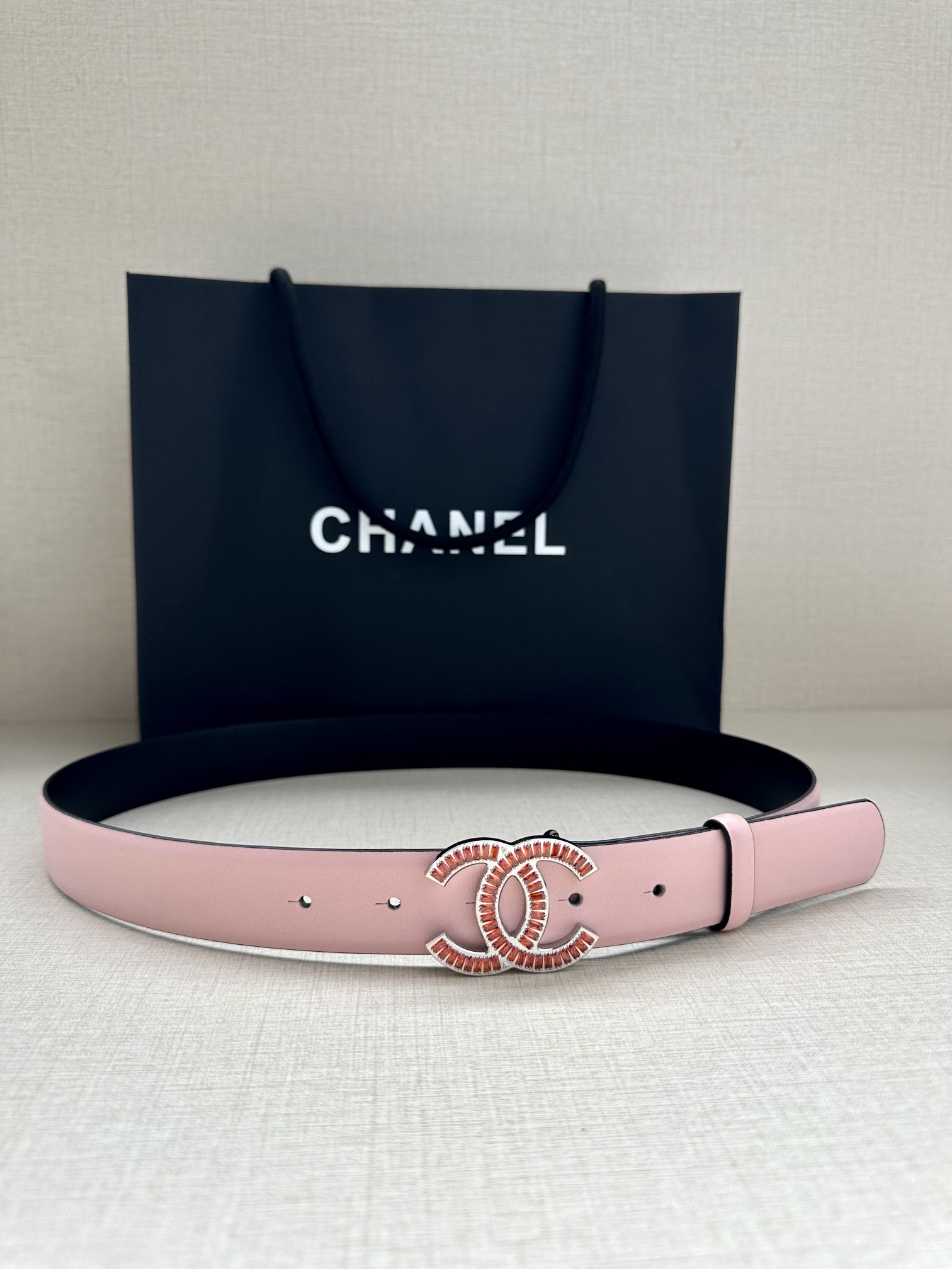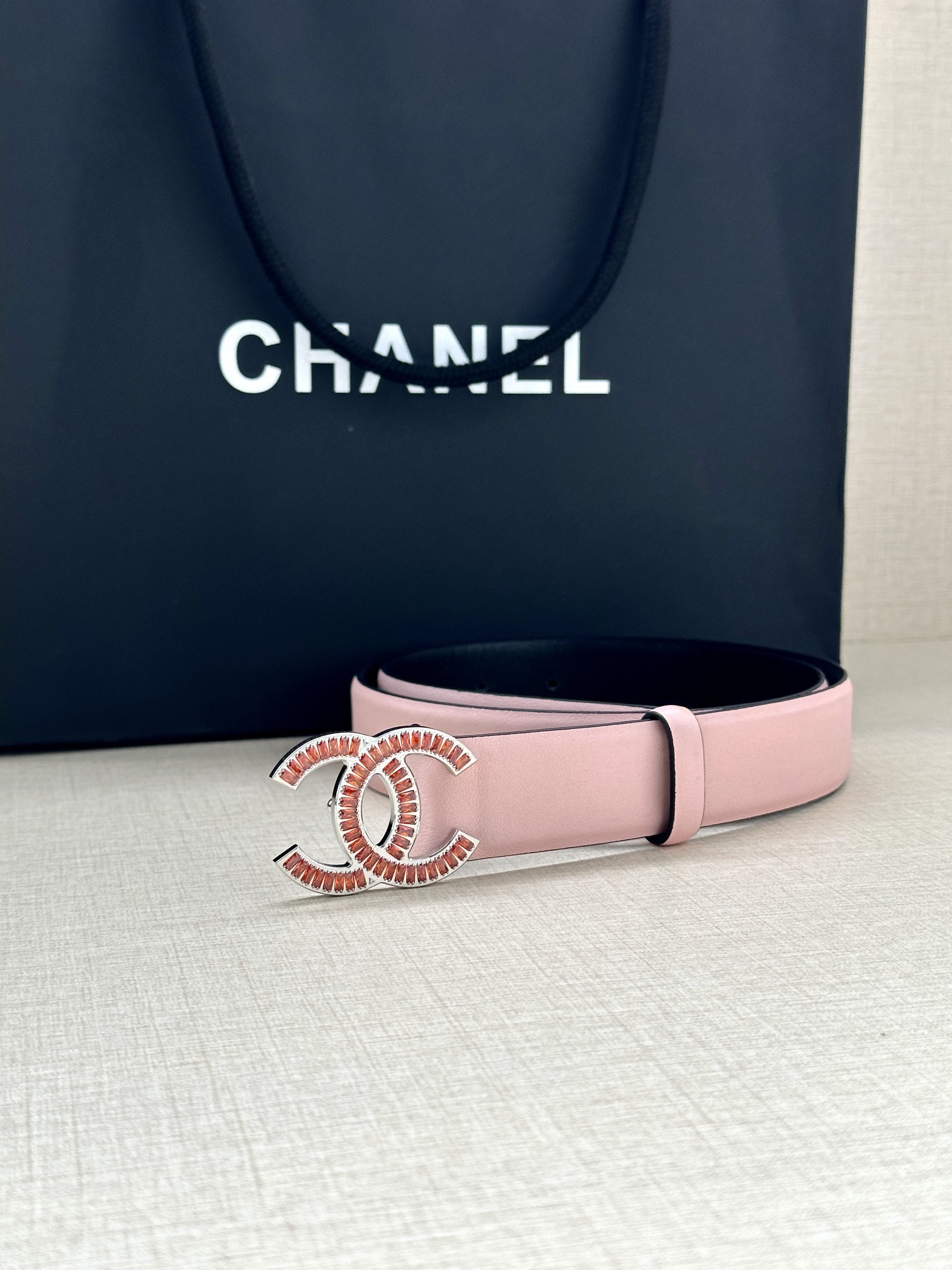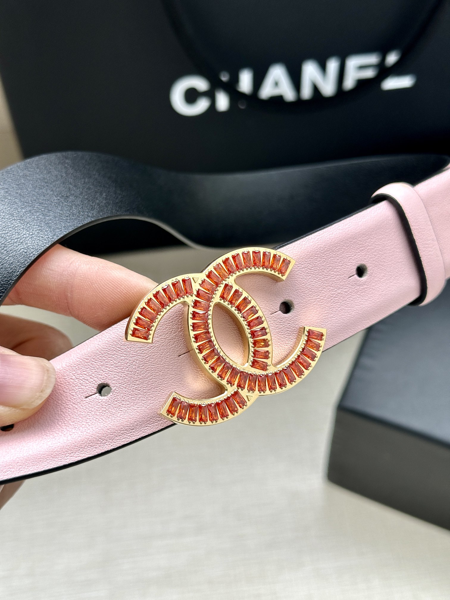 这款皮带是AAAAA 1:1 质量 (非常棒). 使用了和原版一模一样的材料. 商标部分也保持了和香奈儿/Chanel一样. 图片拍摄是实物皮带拍摄, 您所收到的实物保证和我们图片一模一样.