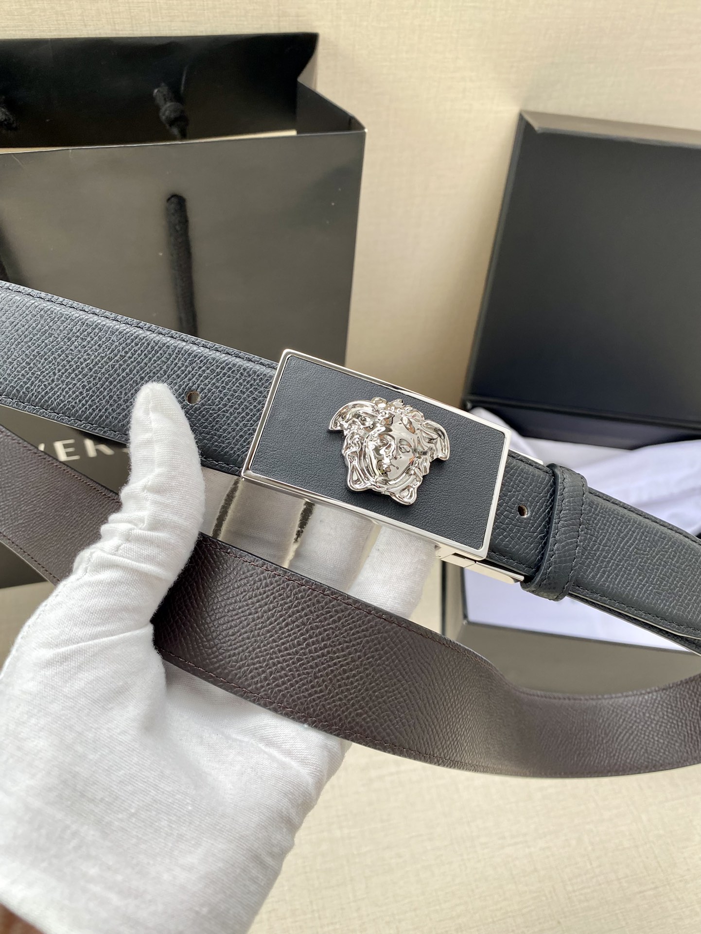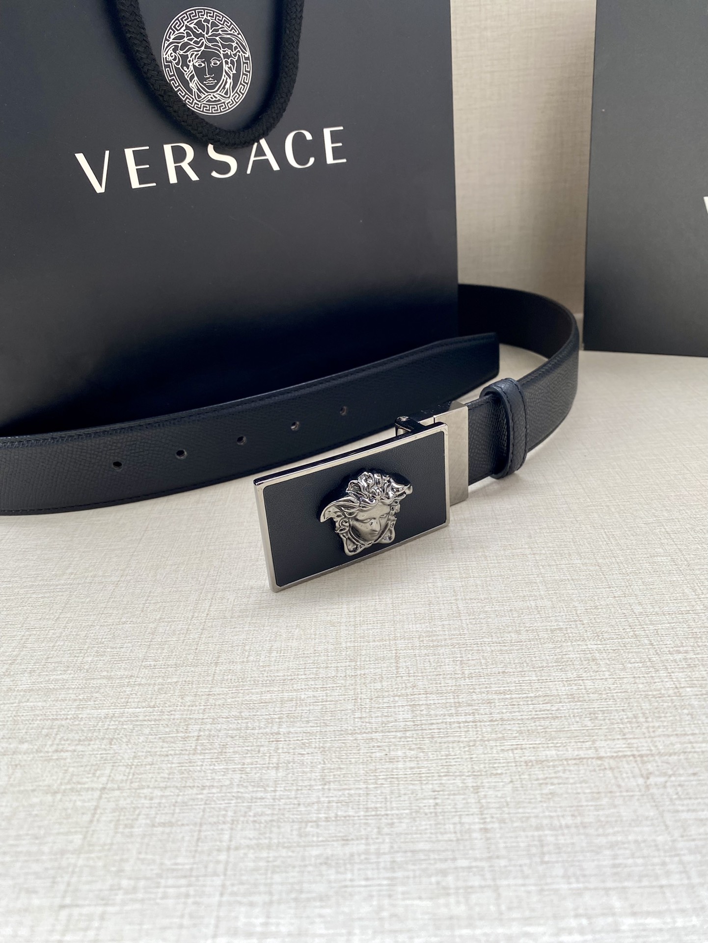 这款皮带是AAAAA 1:1 质量 (非常棒). 使用了和原版一模一样的材料. 商标部分也保持了和范思哲/Versace一样. 图片拍摄是实物皮带拍摄, 您所收到的实物保证和我们图片一模一样.