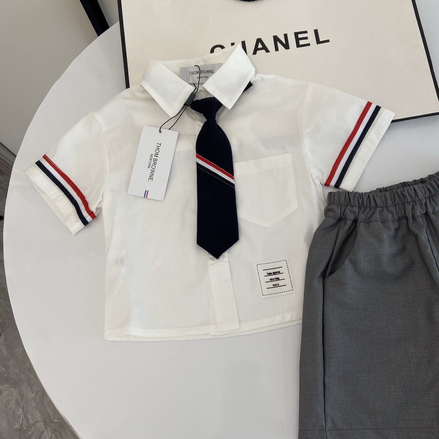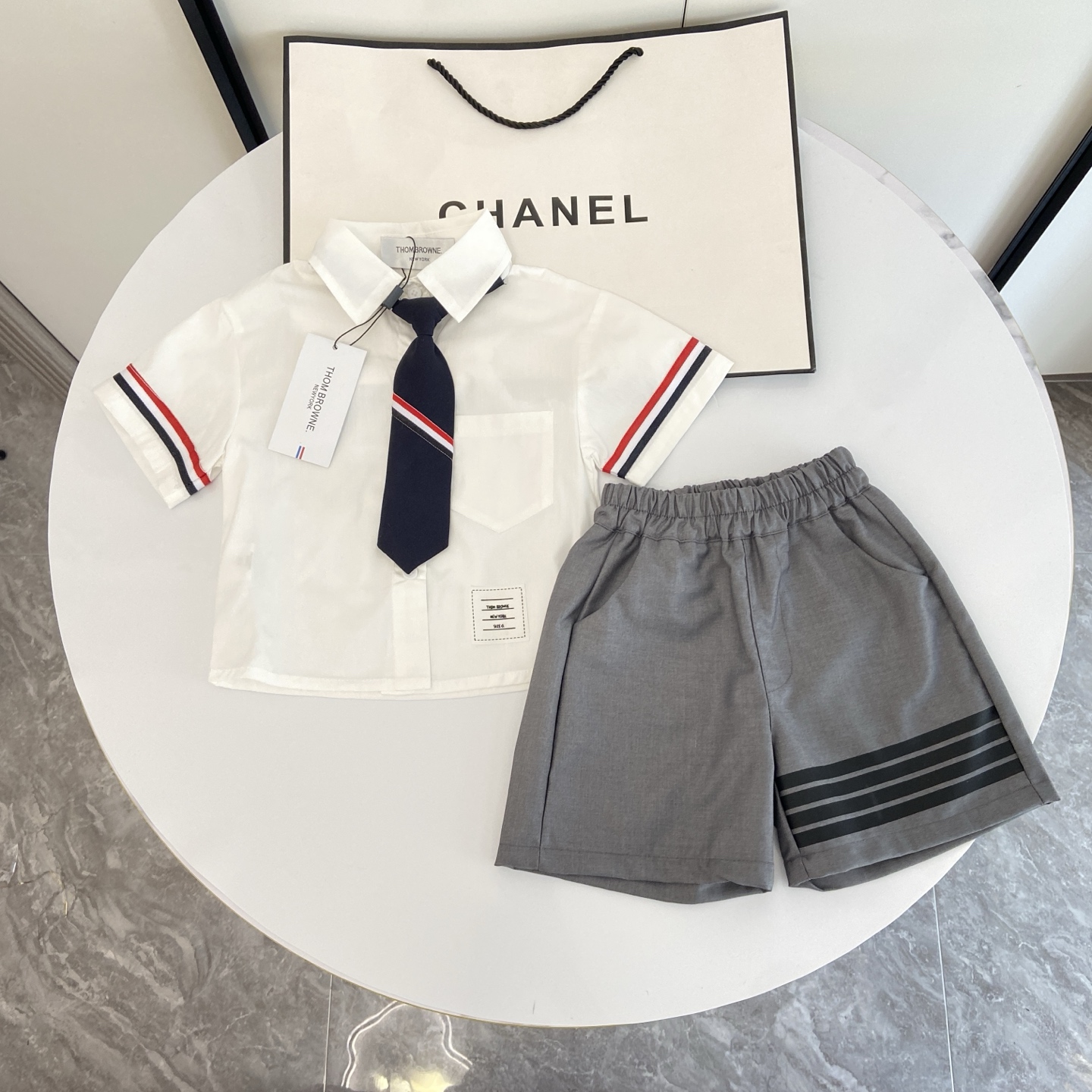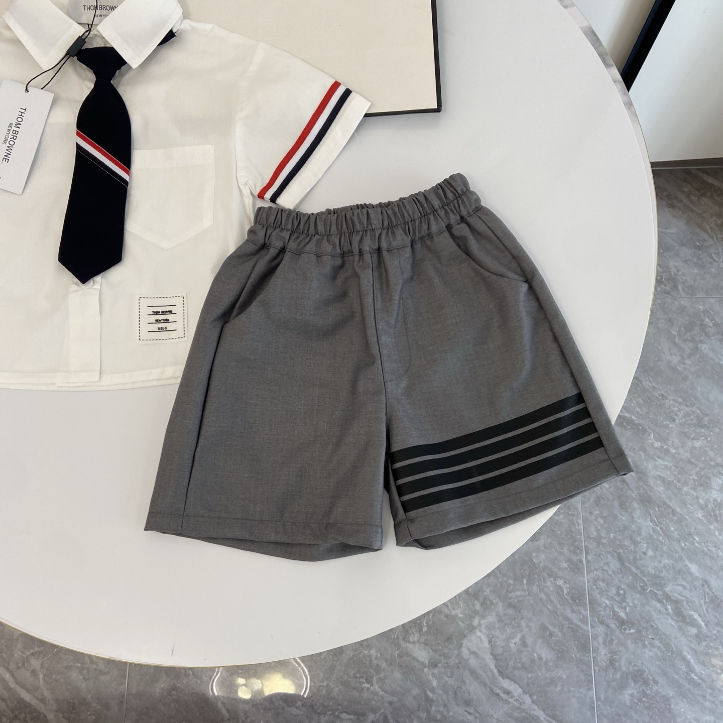 这款children's clothes是AAAAA 1:1 质量 (非常棒). 使用了和原版一模一样的材料. 商标部分也保持了和汤姆布朗/Thom Browne一样. 图片拍摄是实物children's clothes拍摄, 您所收到的实物保证和我们图片一模一样.