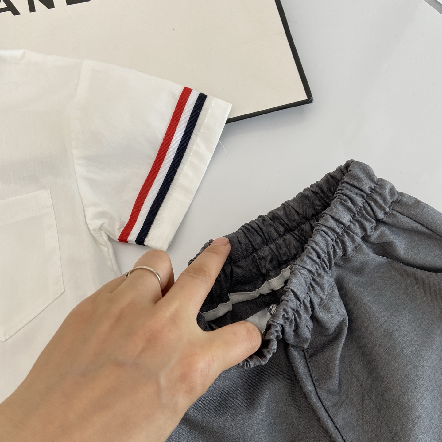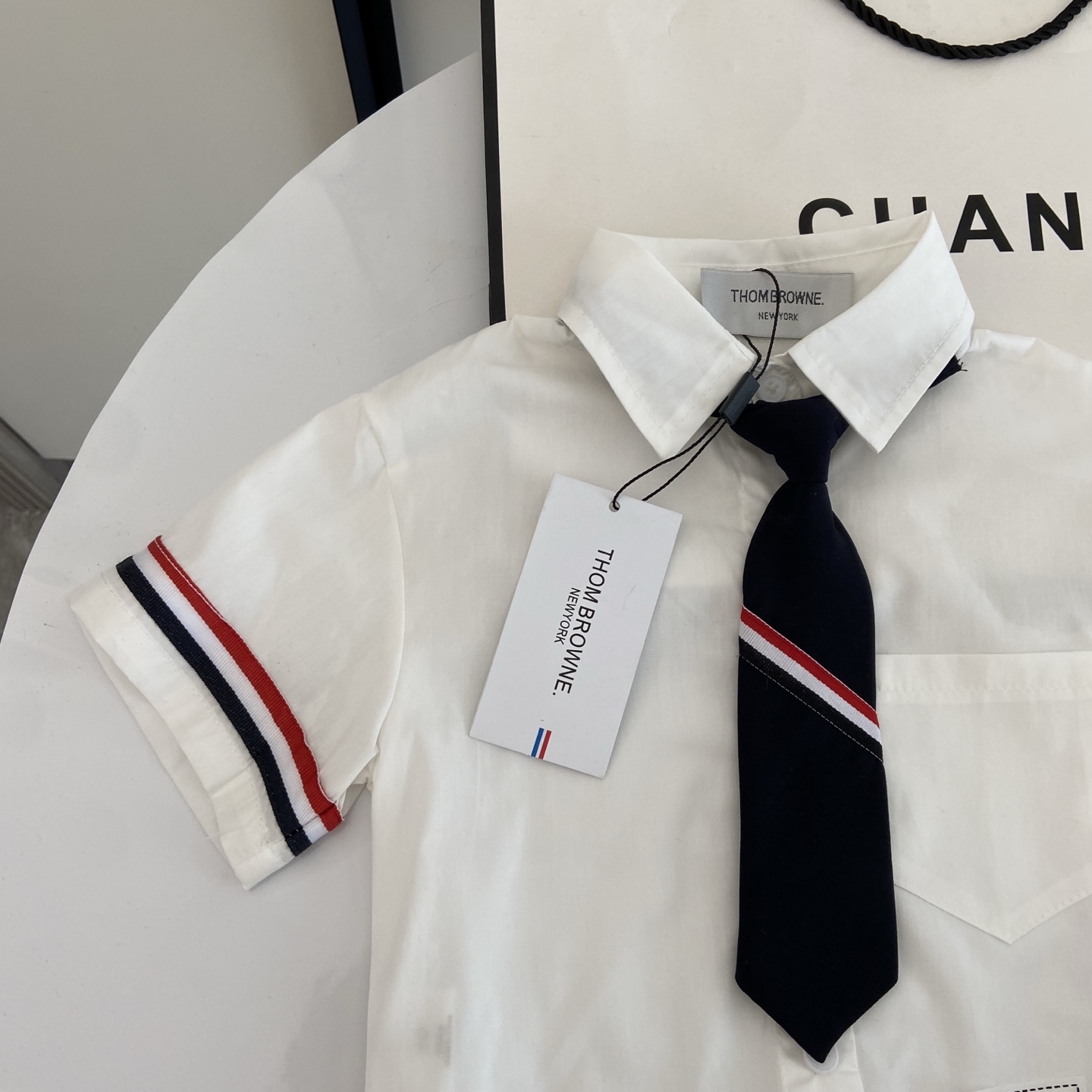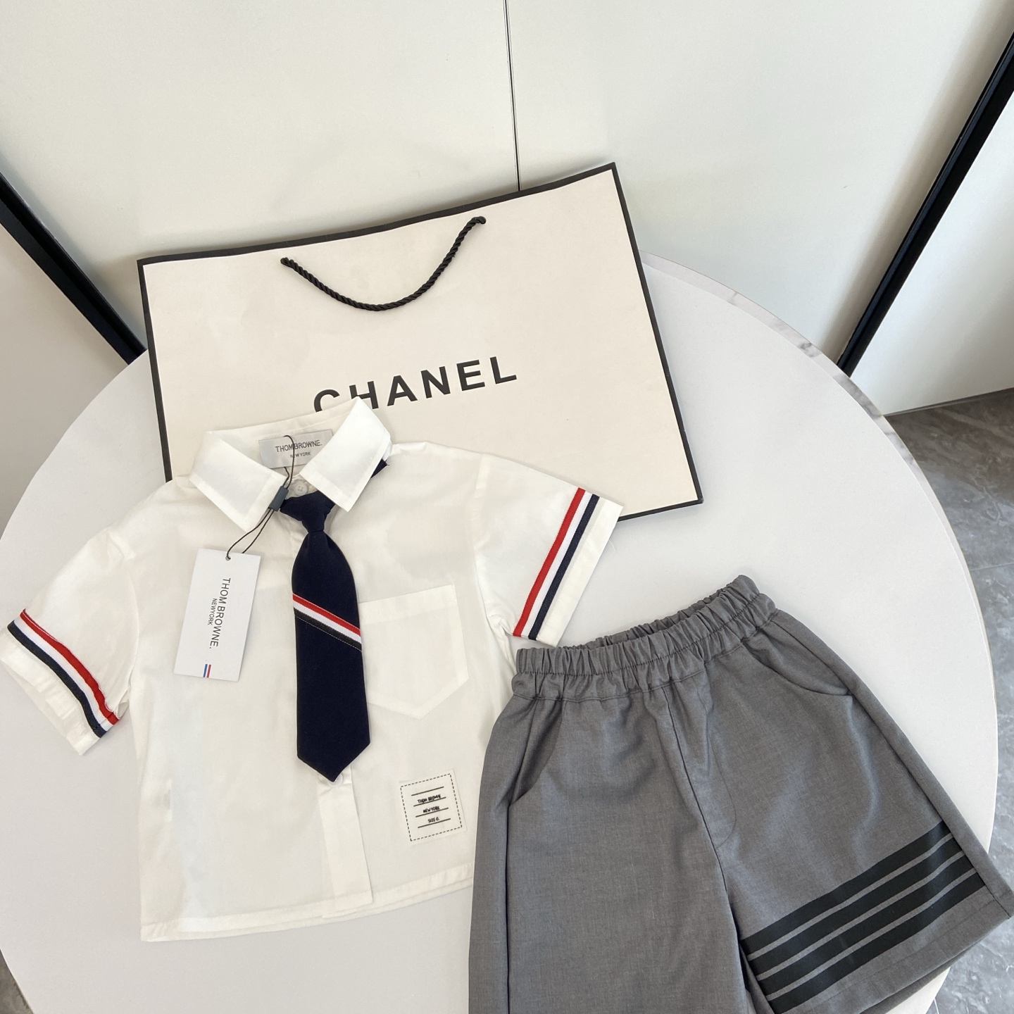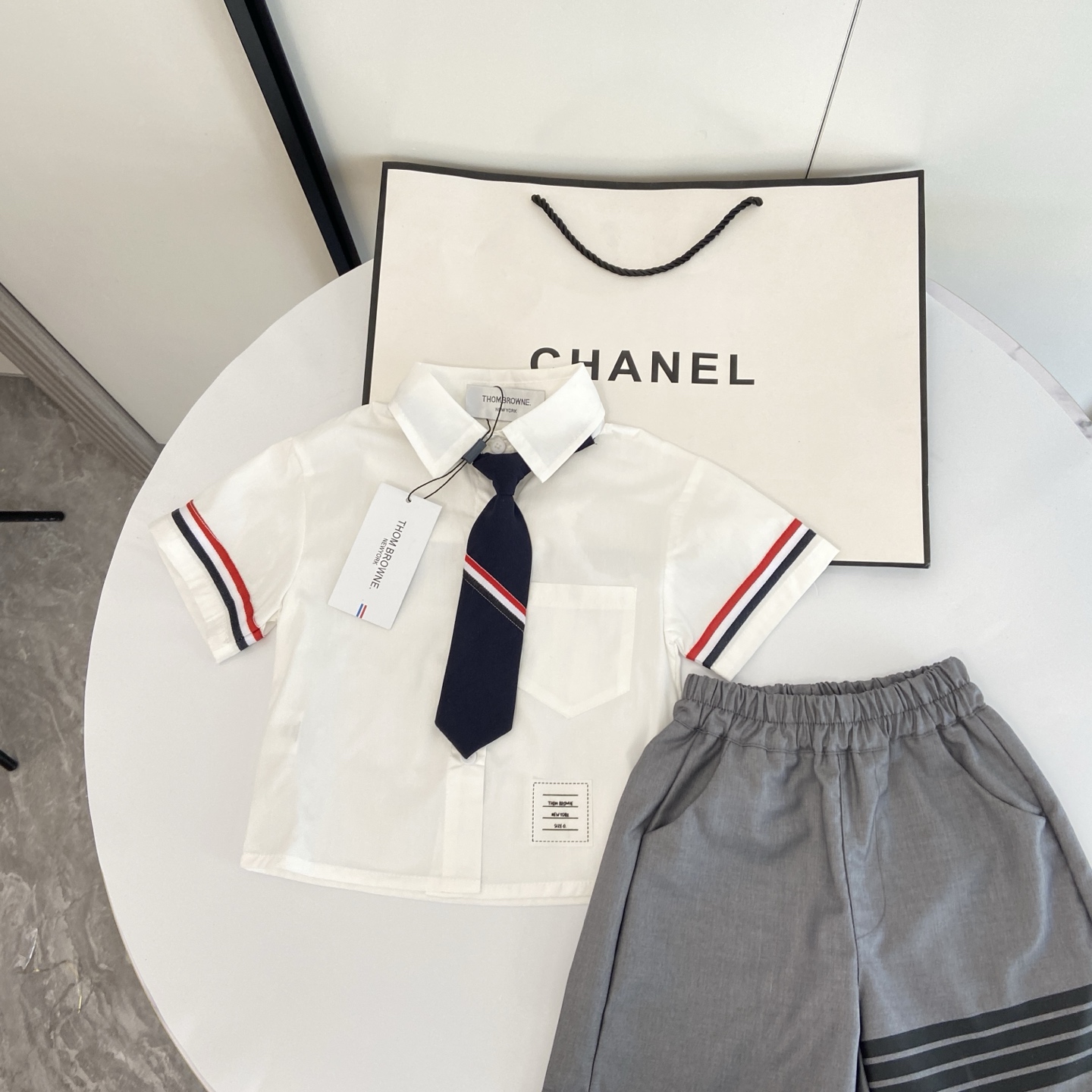 这款children's clothes是AAAAA 1:1 质量 (非常棒). 使用了和原版一模一样的材料. 商标部分也保持了和汤姆布朗/Thom Browne一样. 图片拍摄是实物children's clothes拍摄, 您所收到的实物保证和我们图片一模一样.