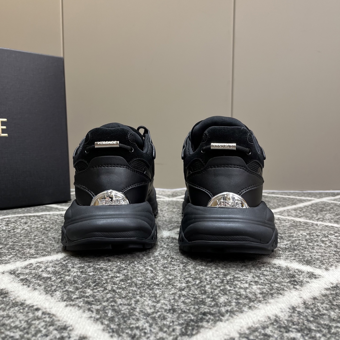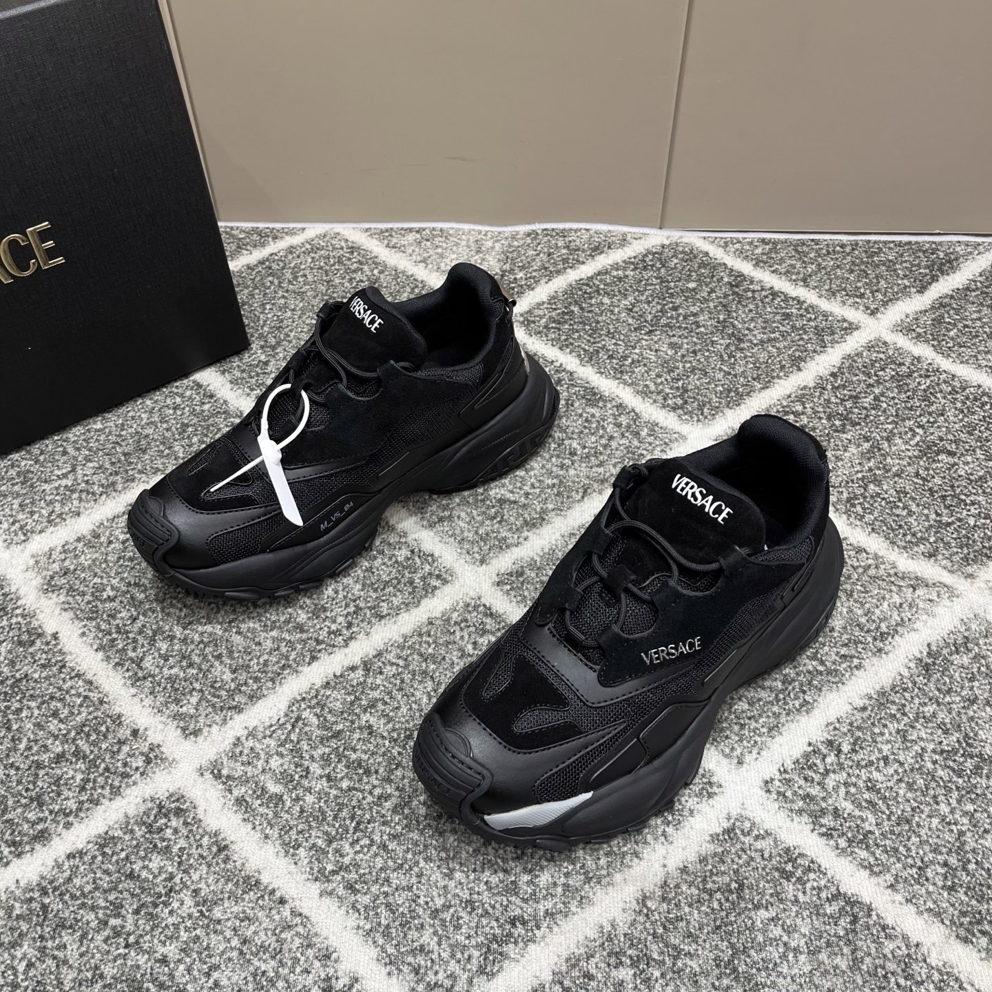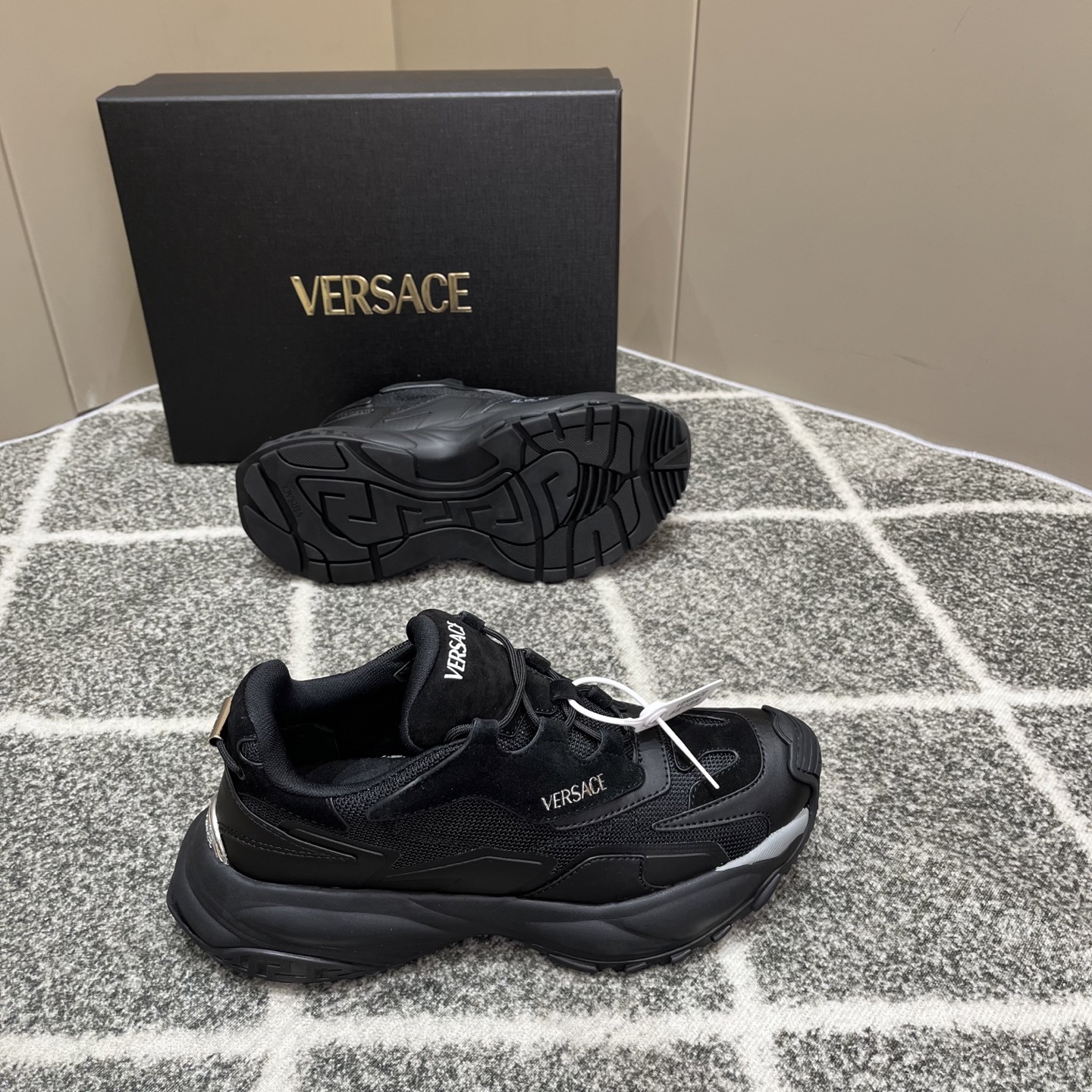 这款鞋子是AAAAA 1:1 质量 (非常棒). 使用了和原版一模一样的材料. 商标部分也保持了和范思哲/Versace一样. 图片拍摄是实物鞋子拍摄, 您所收到的实物保证和我们图片一模一样.