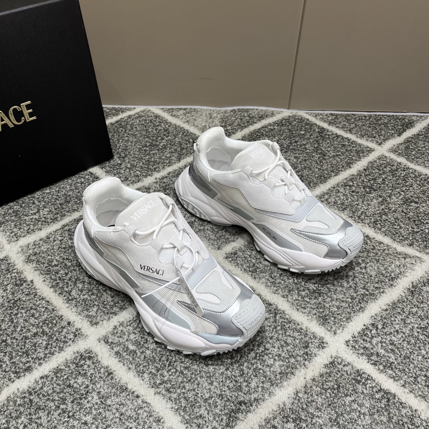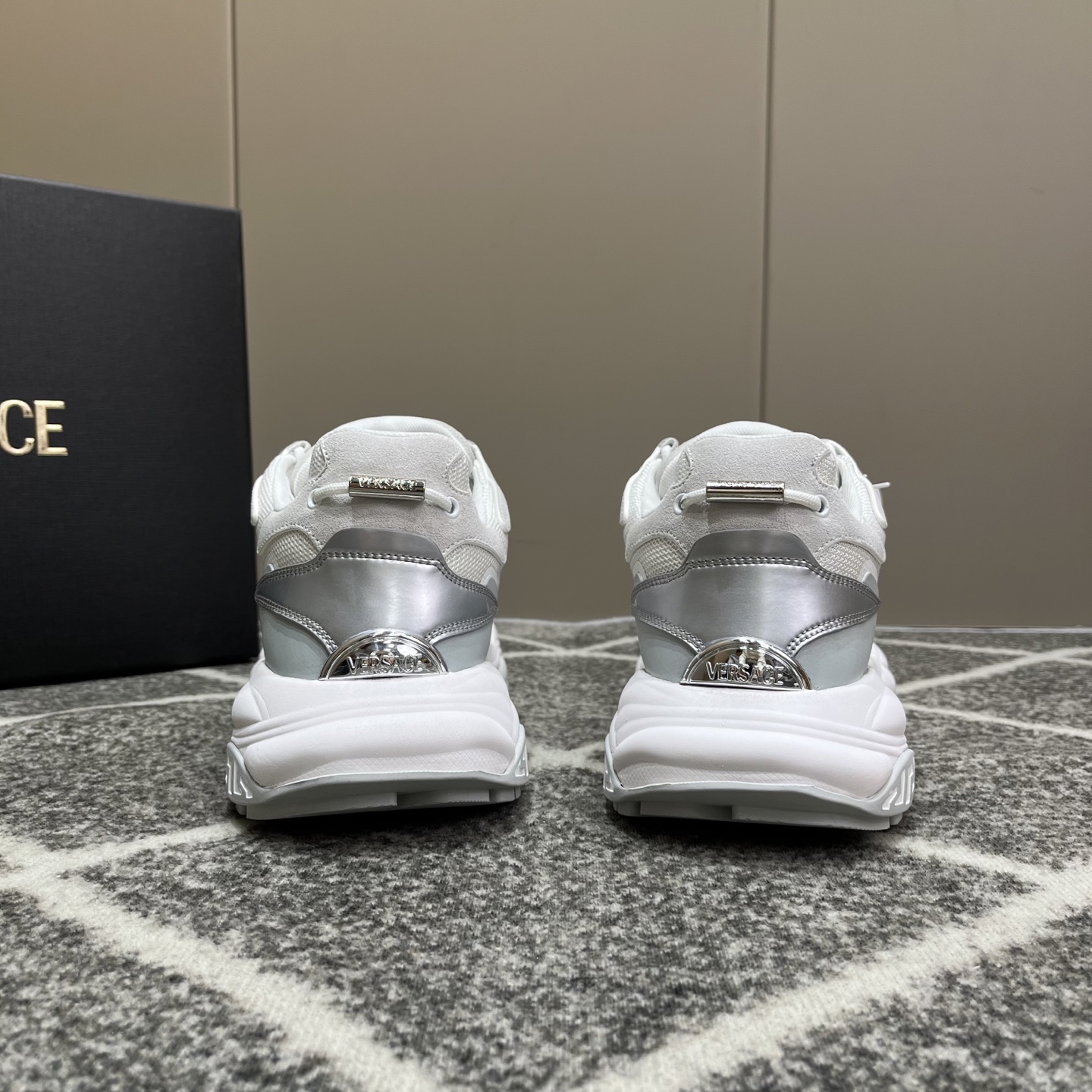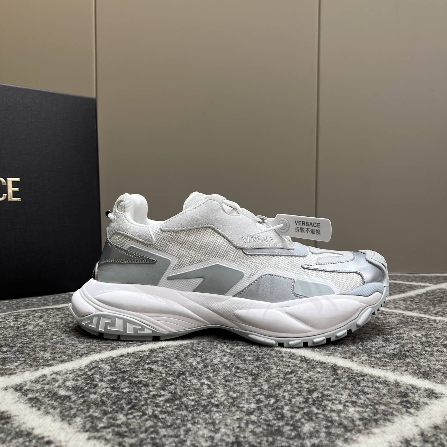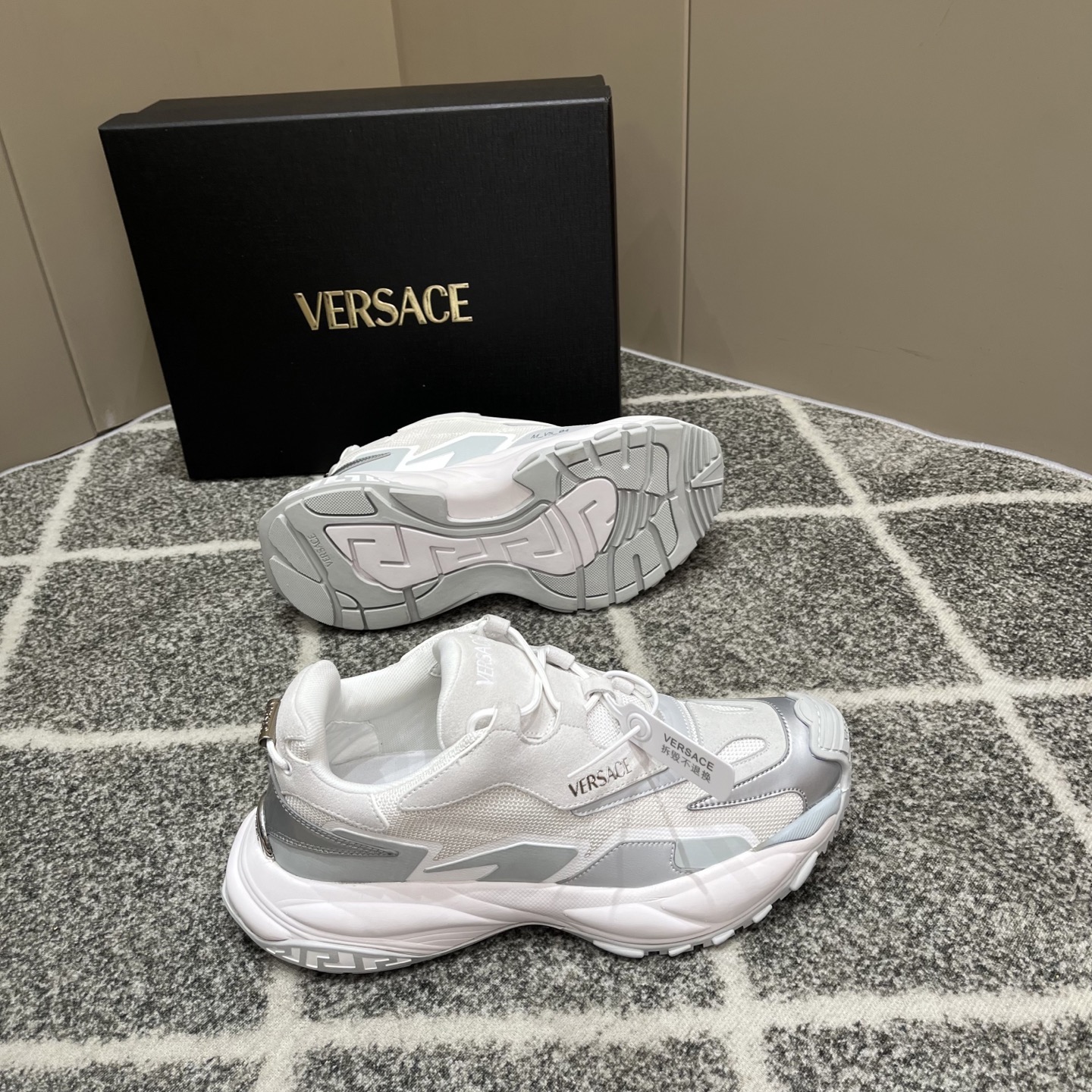 这款鞋子是AAAAA 1:1 质量 (非常棒). 使用了和原版一模一样的材料. 商标部分也保持了和范思哲/Versace一样. 图片拍摄是实物鞋子拍摄, 您所收到的实物保证和我们图片一模一样.